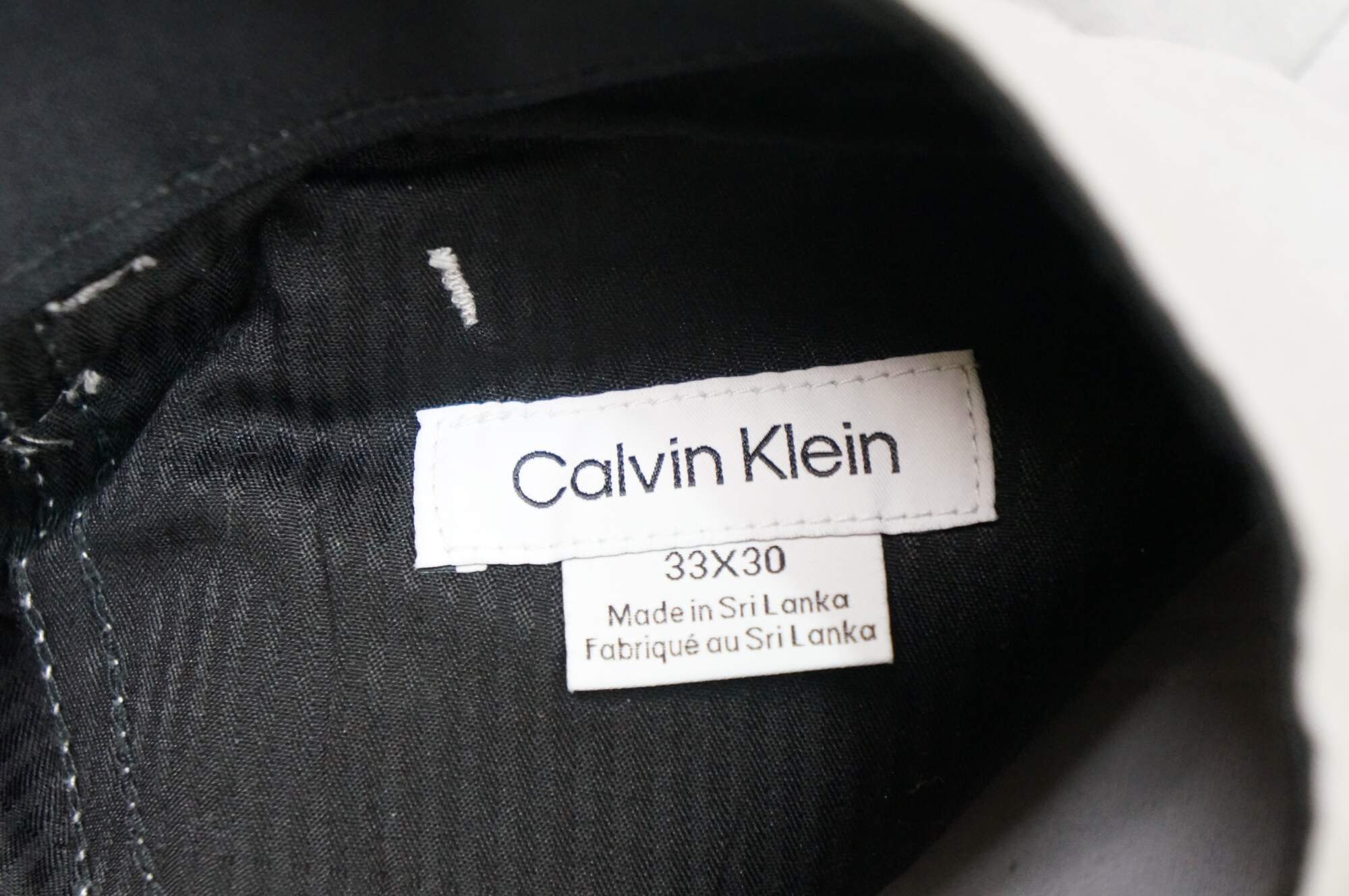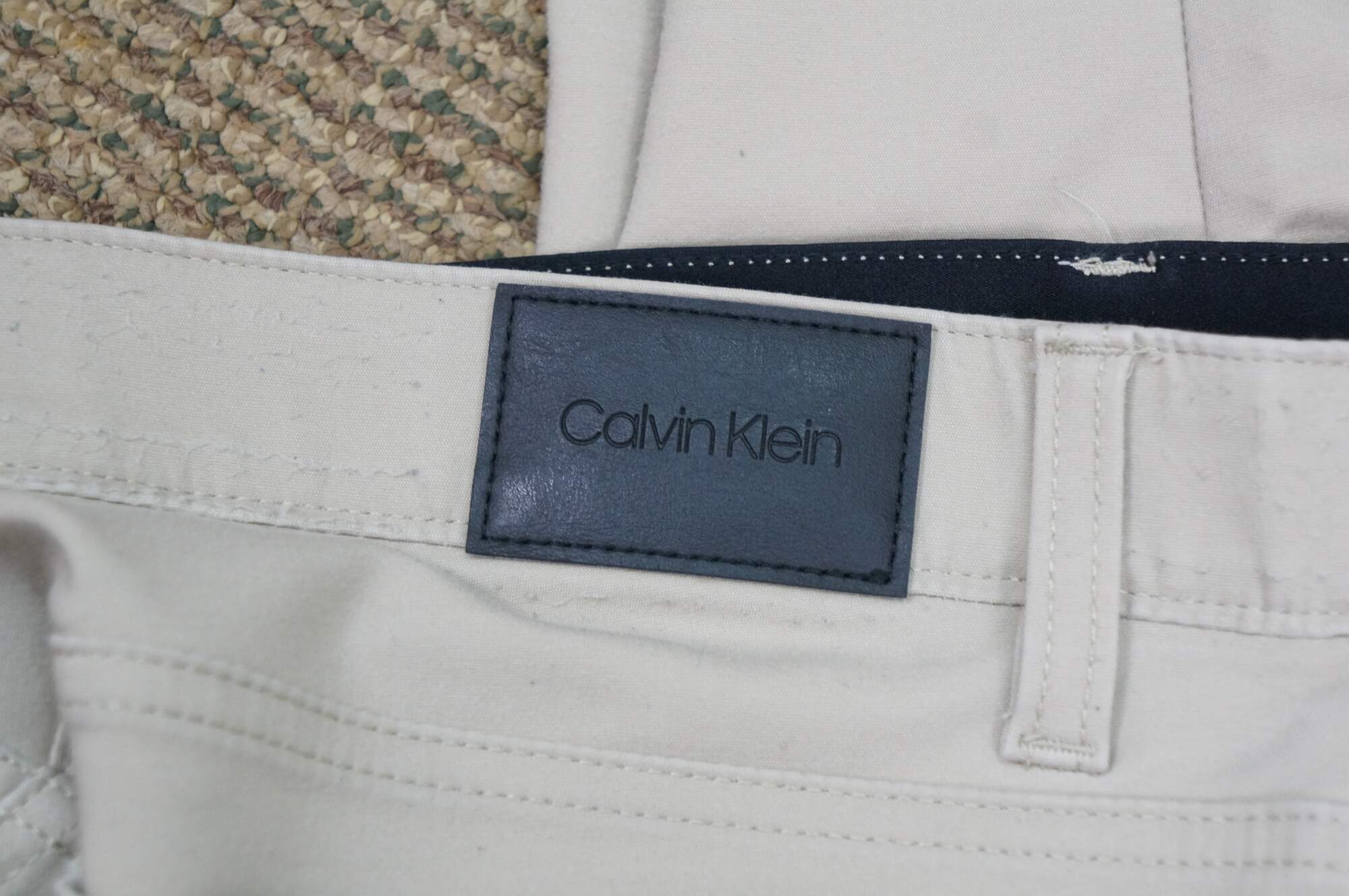 Set of 4 pairs of Calvin Klein Mens Slim Fit chinos / dress pants. Colors include light taupe, light beige, navy blue and black. Two front hand pockets; coin pocket at right front hand pocket; two back patch pockets. Zipper fly with button closure. Flat front; fabric provides slight stretch. 53% Cotton / 43% Polyester / 4% Elastane. Made in Sri Lanka.