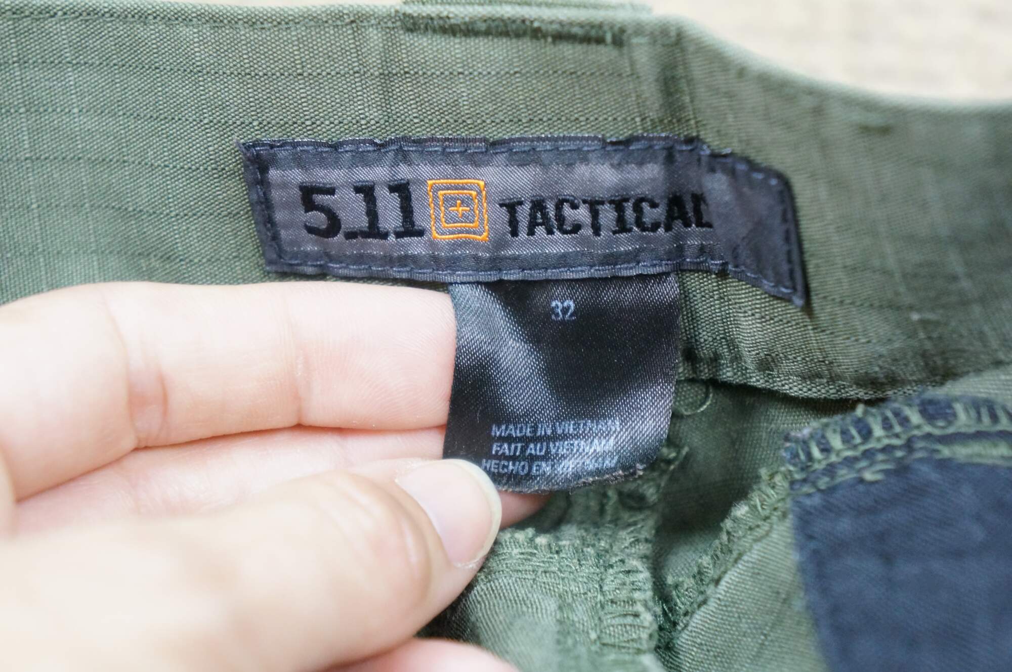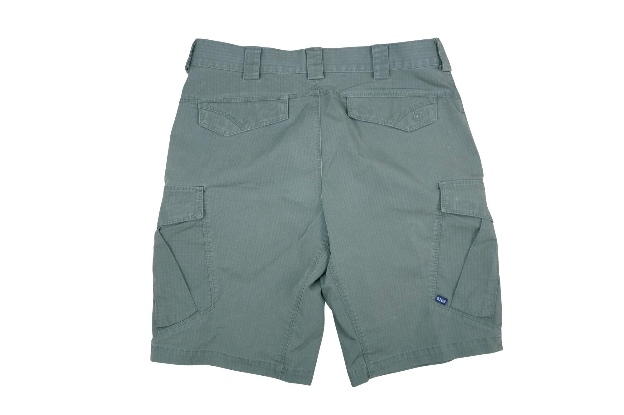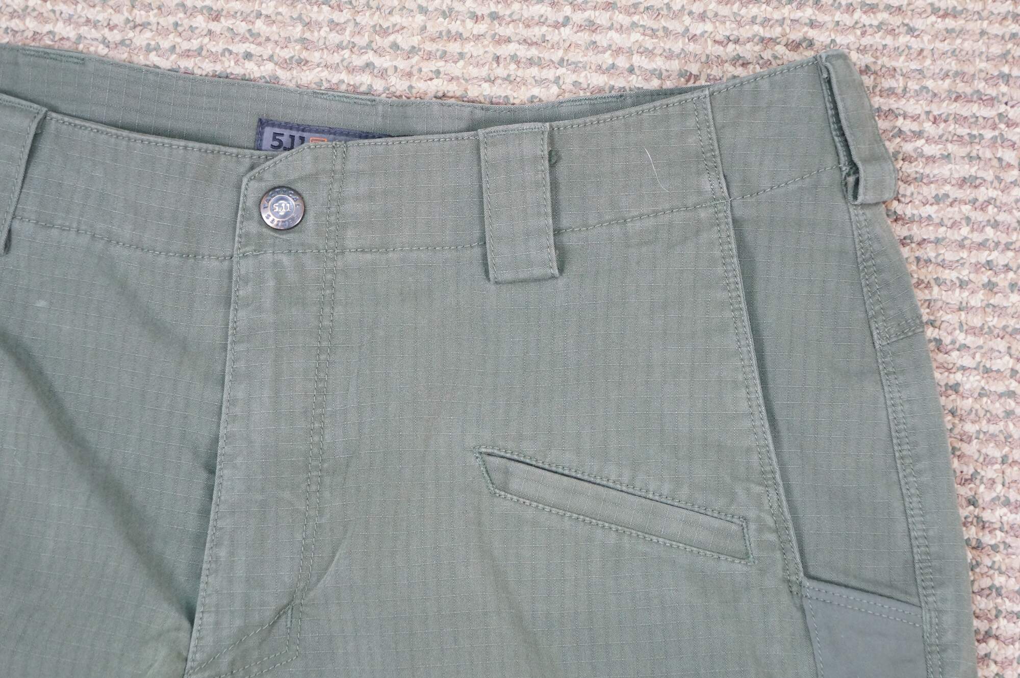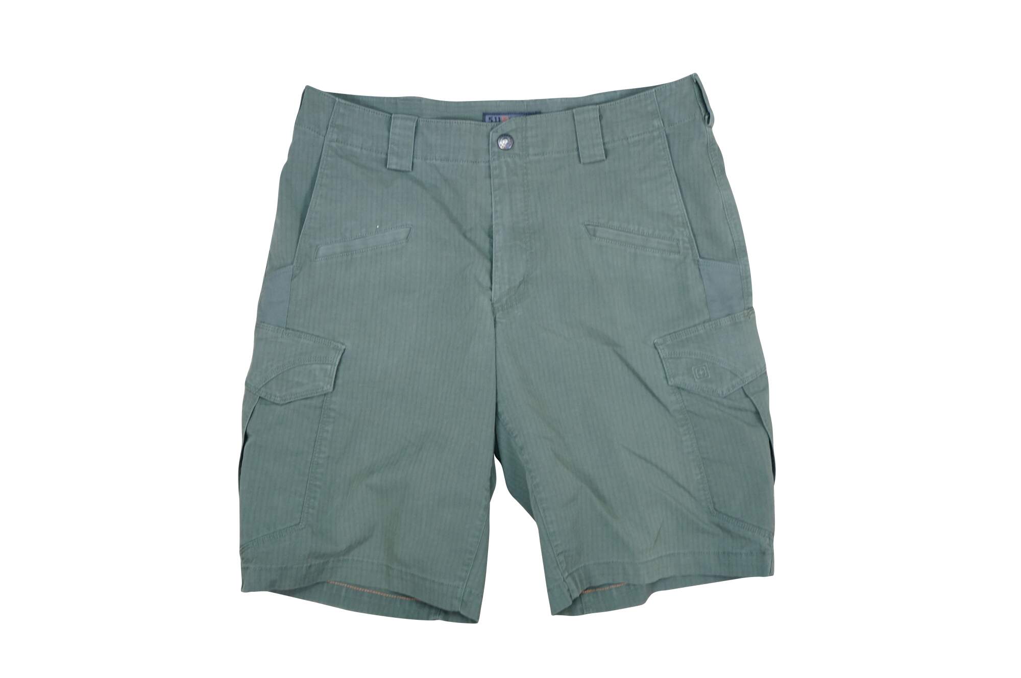 Vintage 5.11 Tactical Icon men's cargo shorts. Olive Green. Zipper fly, button closure. Two front side pockets, two side narrow knife / tool pockets; two front watch pockets; two side thigh flap pockets. Two back flap pockets. 65% Polyester / 35% Cotton. Made in Vietnam.