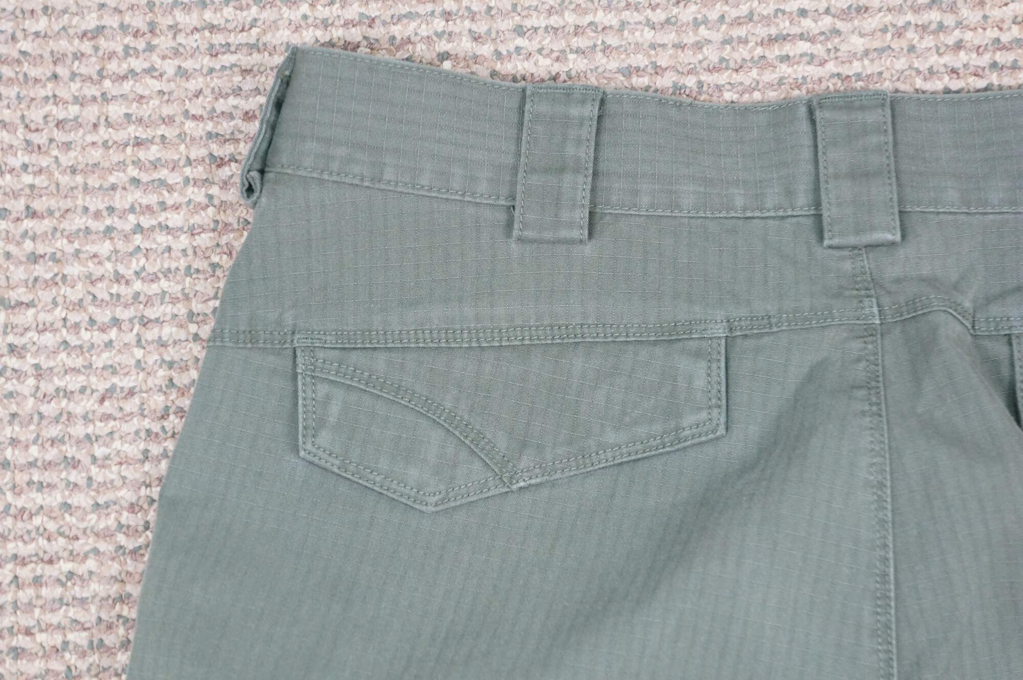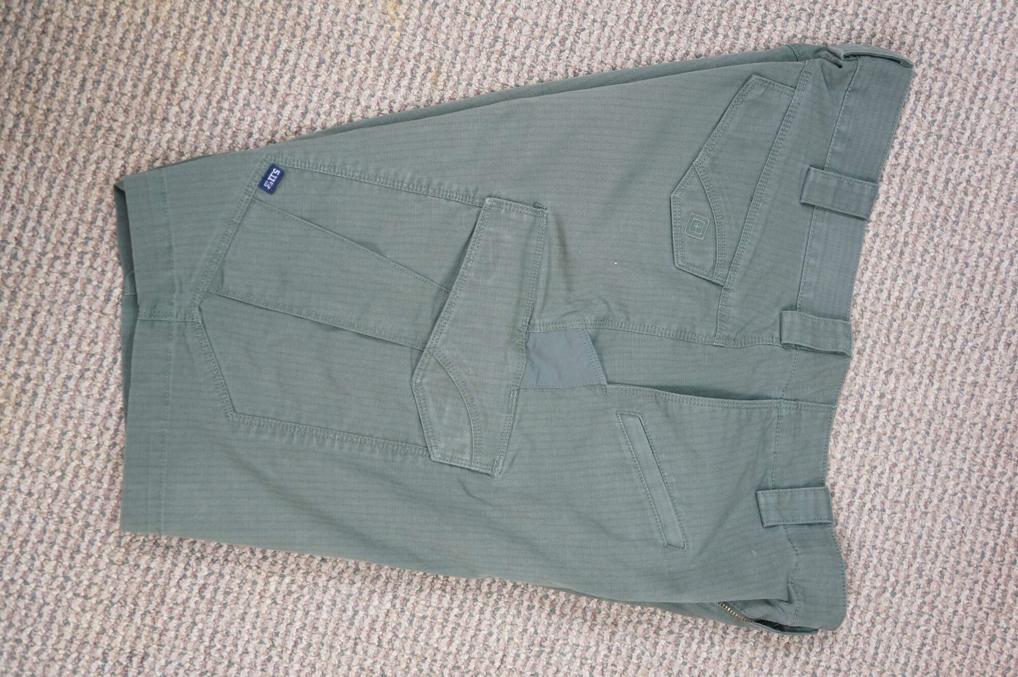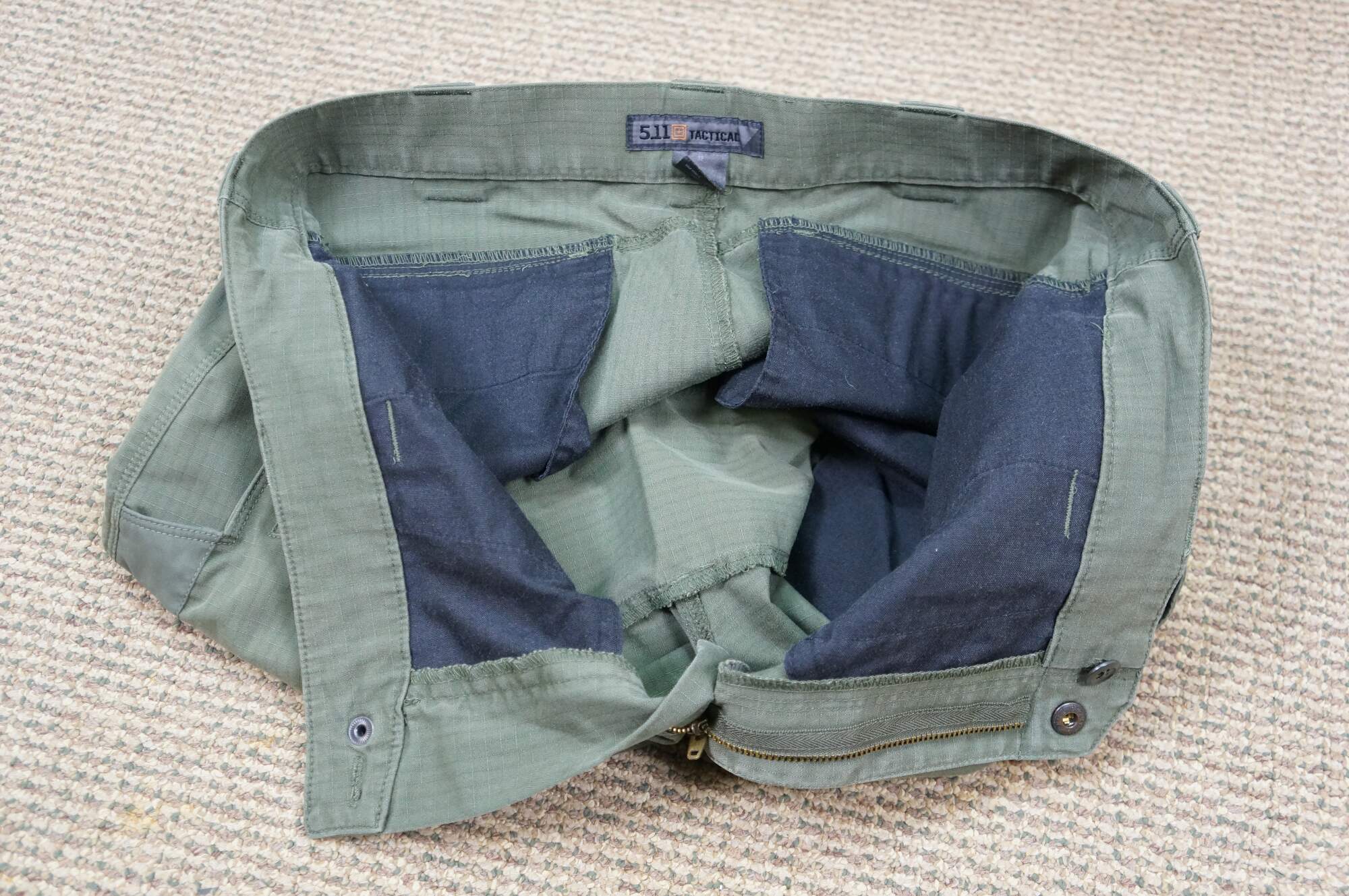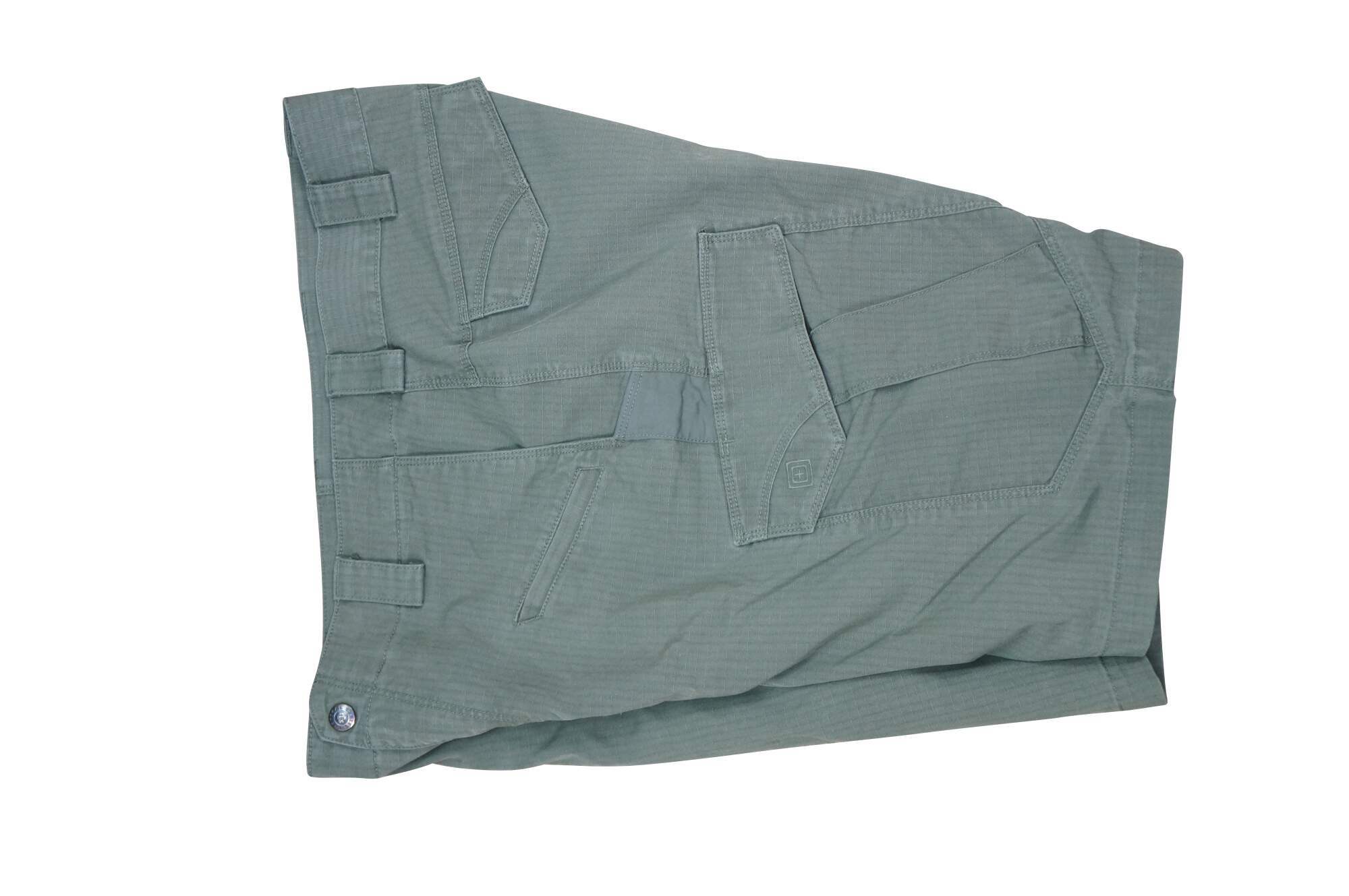 Vintage 5.11 Tactical Icon men's cargo shorts. Olive Green. Zipper fly, button closure. Two front side pockets, two side narrow knife / tool pockets; two front watch pockets; two side thigh flap pockets. Two back flap pockets. 65% Polyester / 35% Cotton. Made in Vietnam.