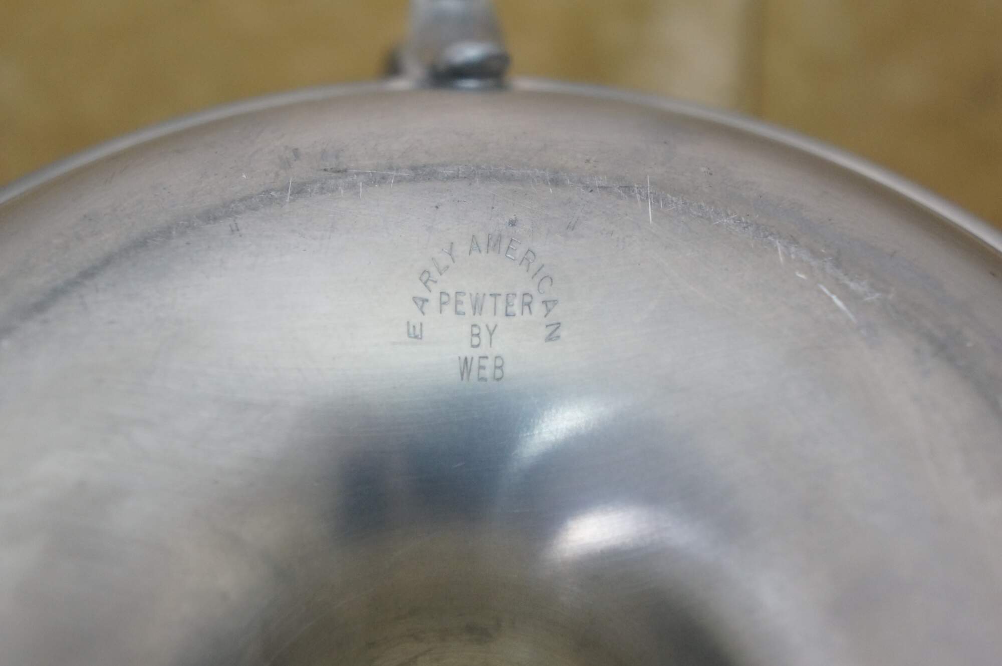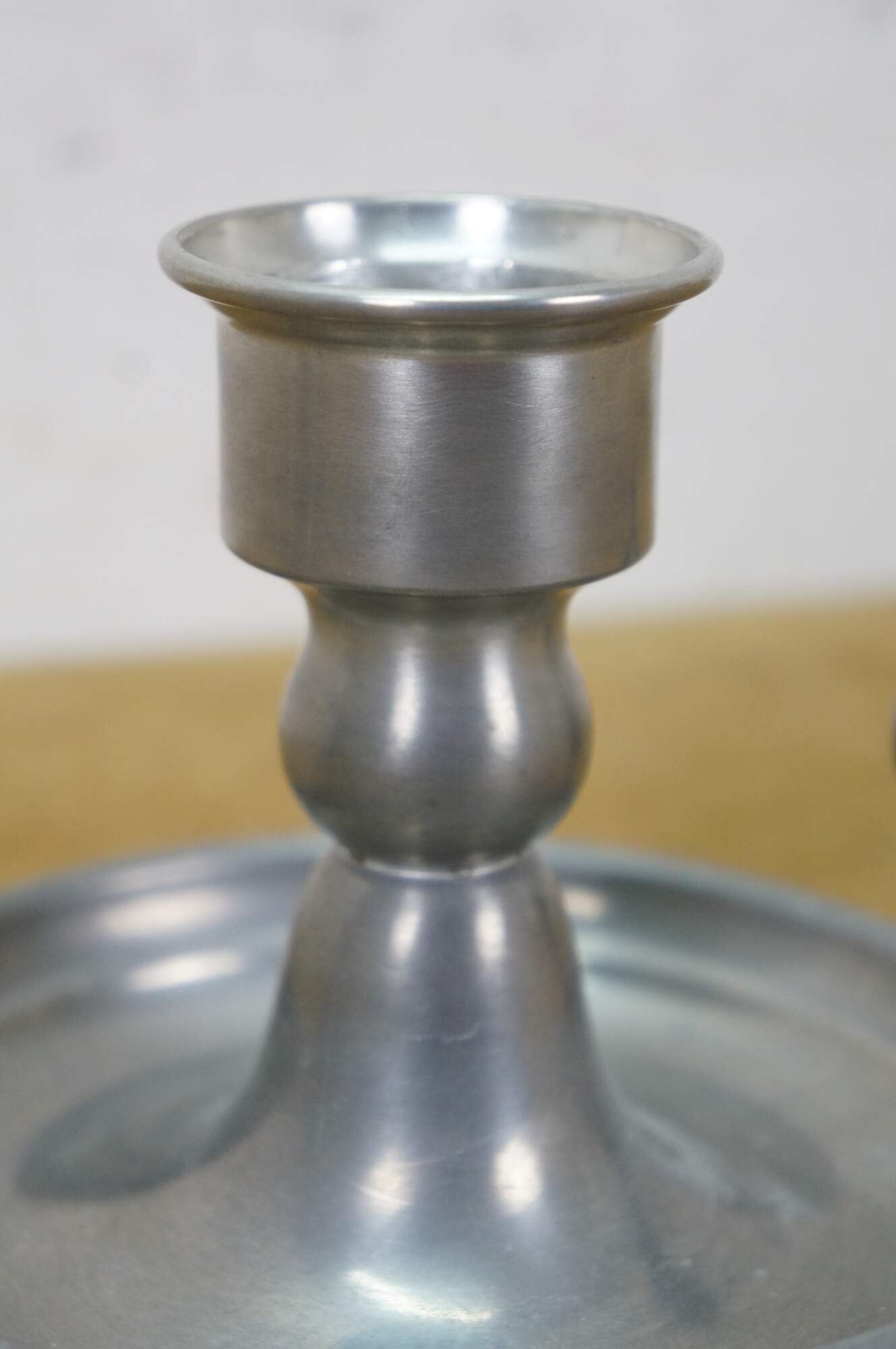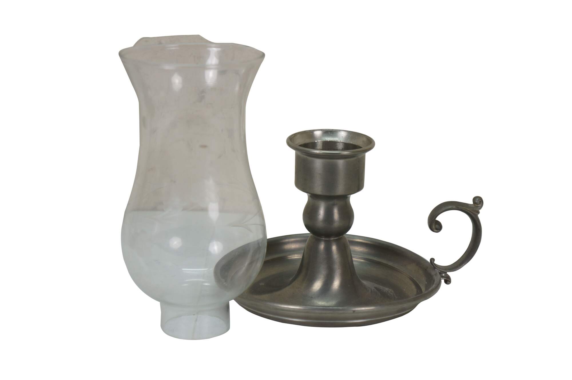 Pair of vintage Early American Pewter by Web chamberstick style candle holders with scrolled handles and clear glass hurricanes witched with flowers.