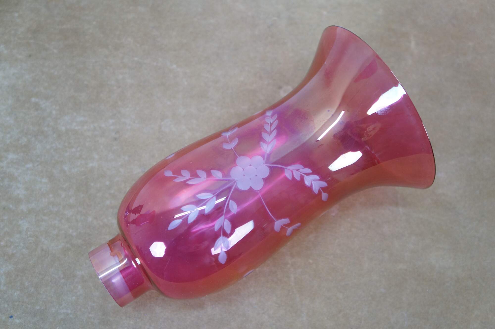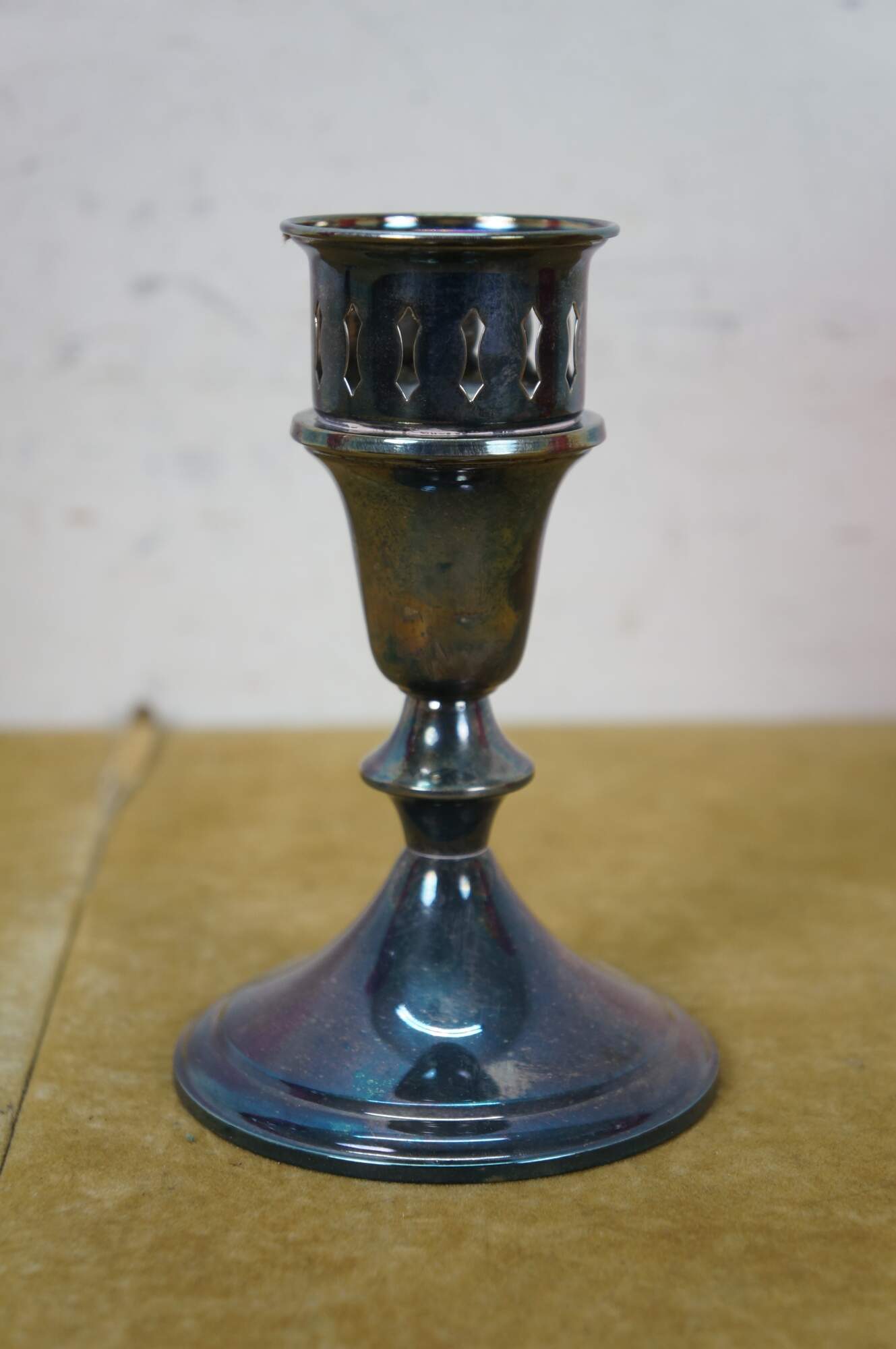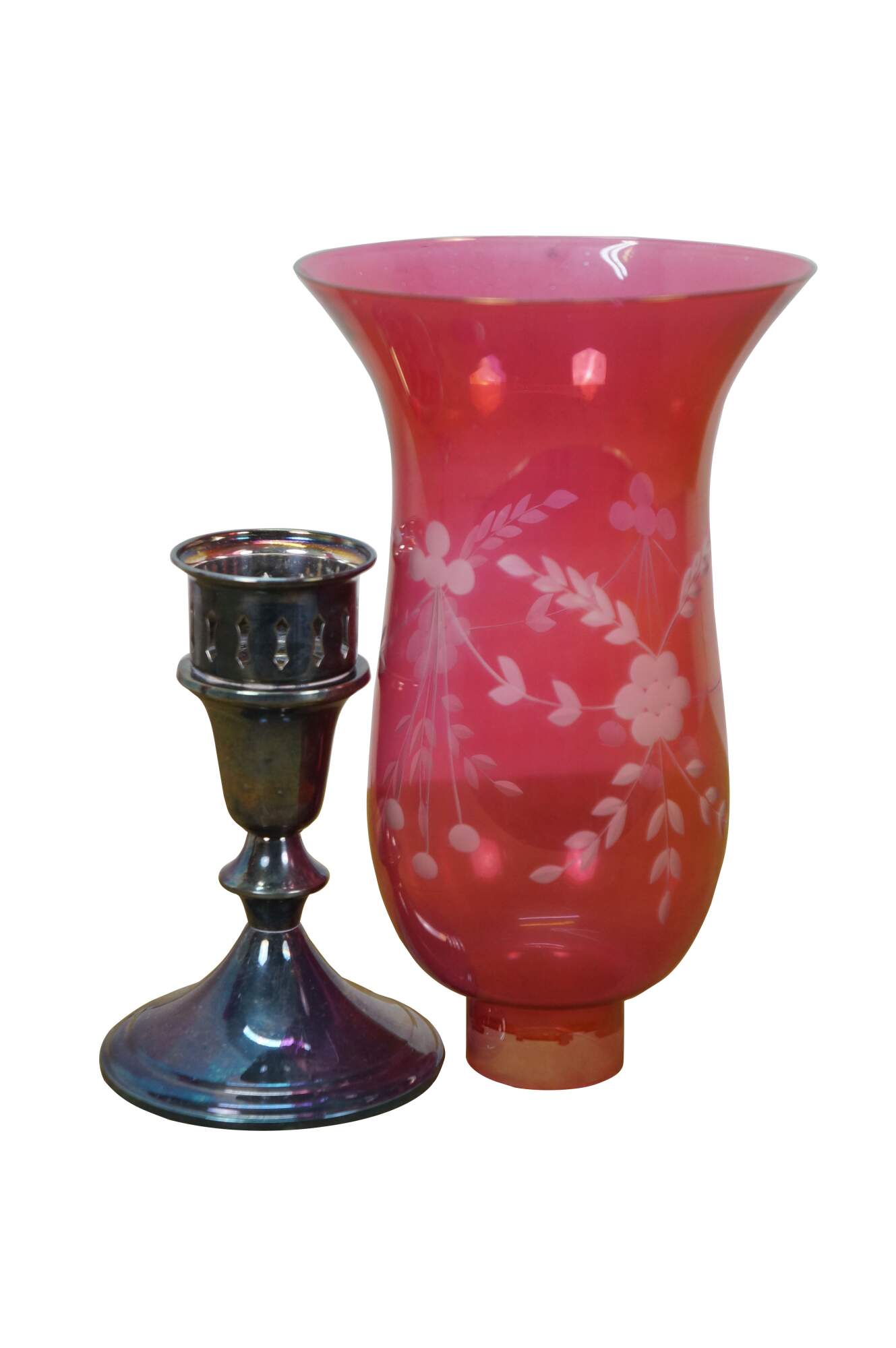Pair of vintage Towle number 3180 silverplate candlestick holders with pierced candle cup and floral patterned, cut to clear cranberry glass hurricanes.