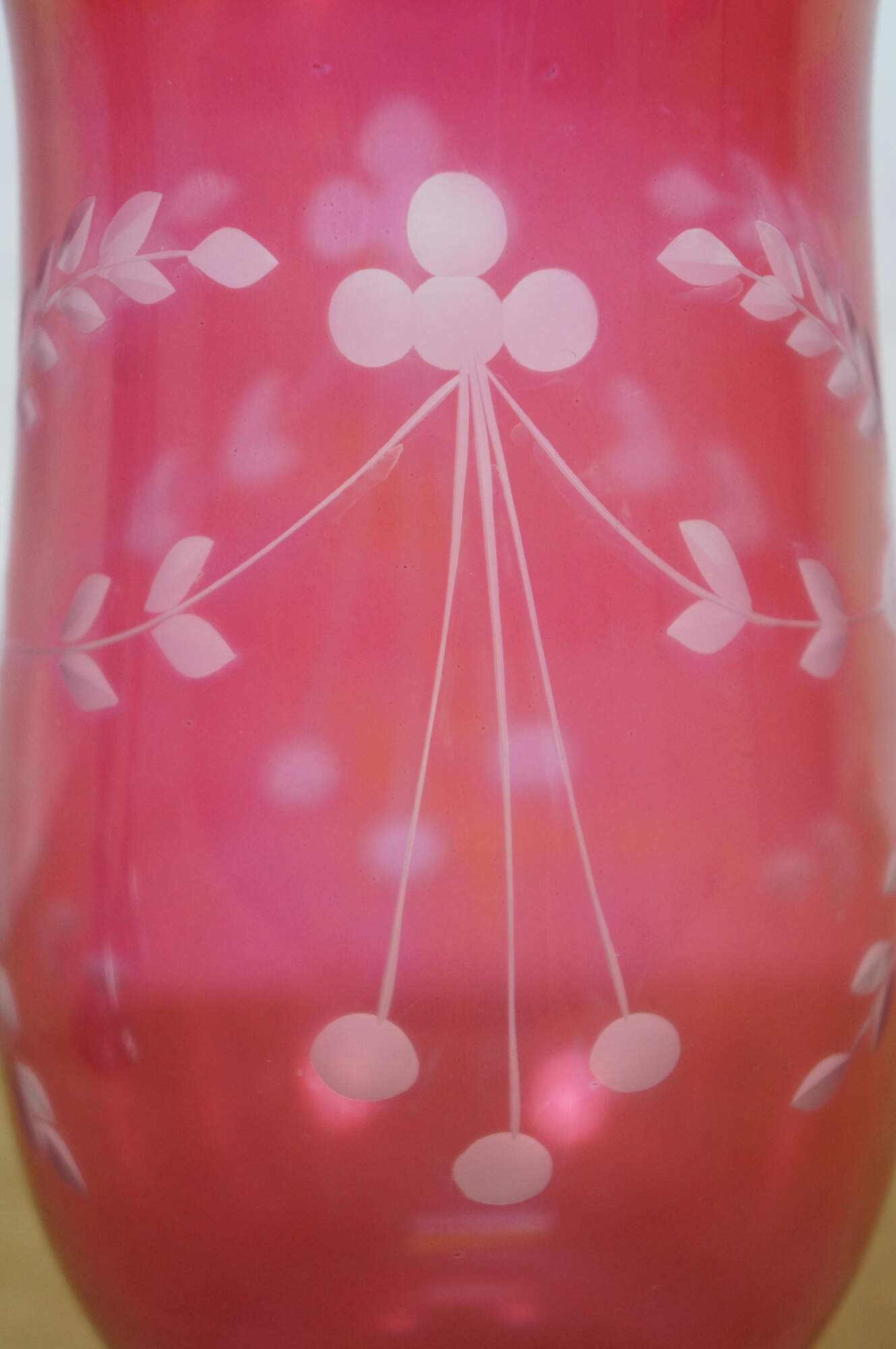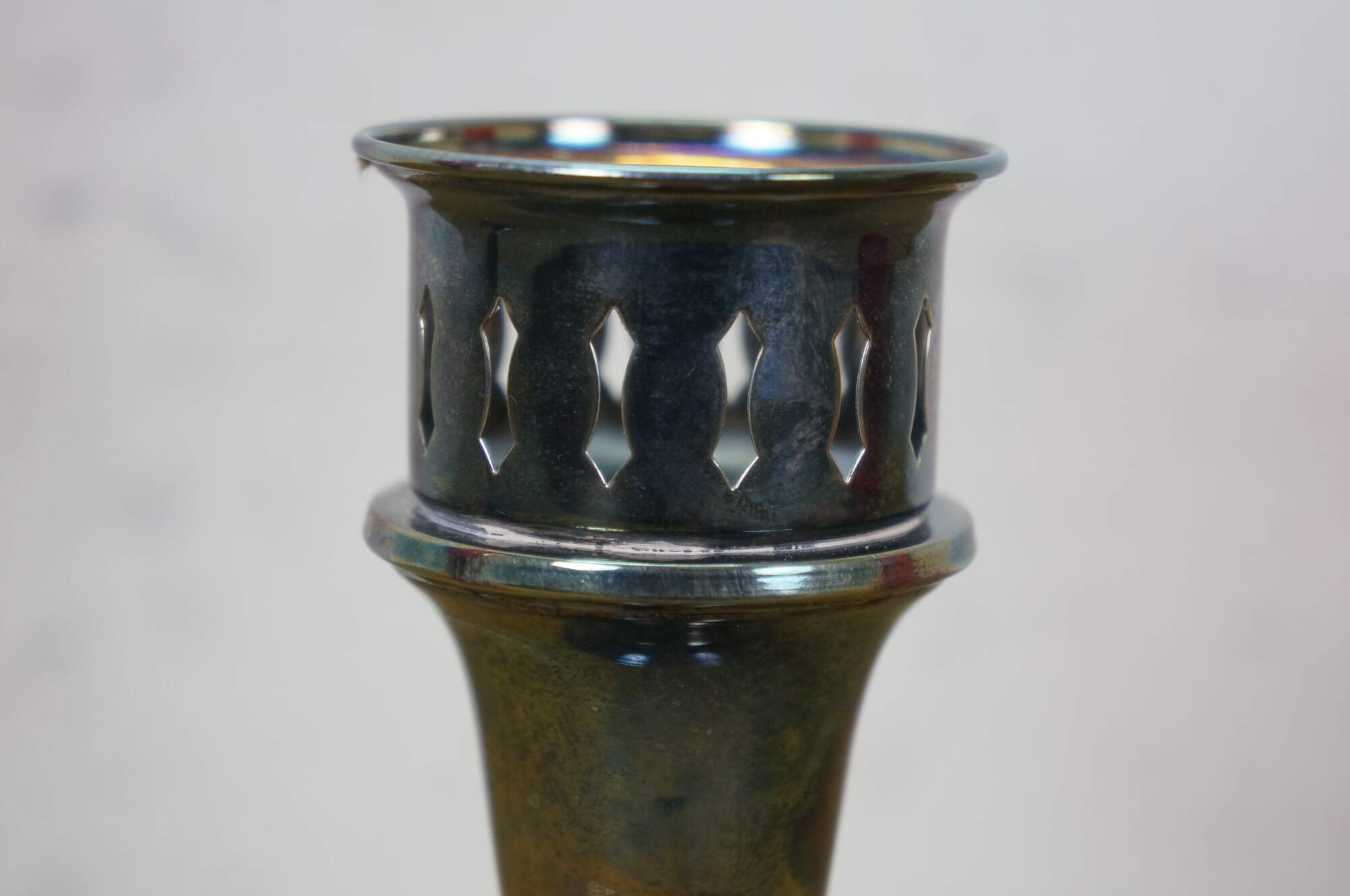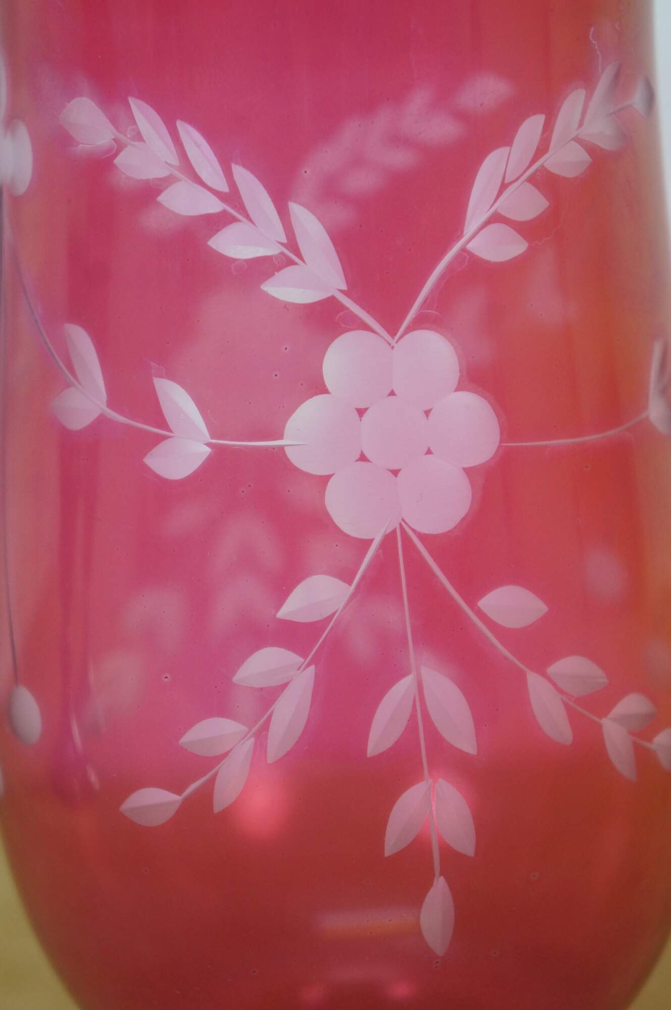 Pair of vintage Towle number 3180 silverplate candlestick holders with pierced candle cup and floral patterned, cut to clear cranberry glass hurricanes.