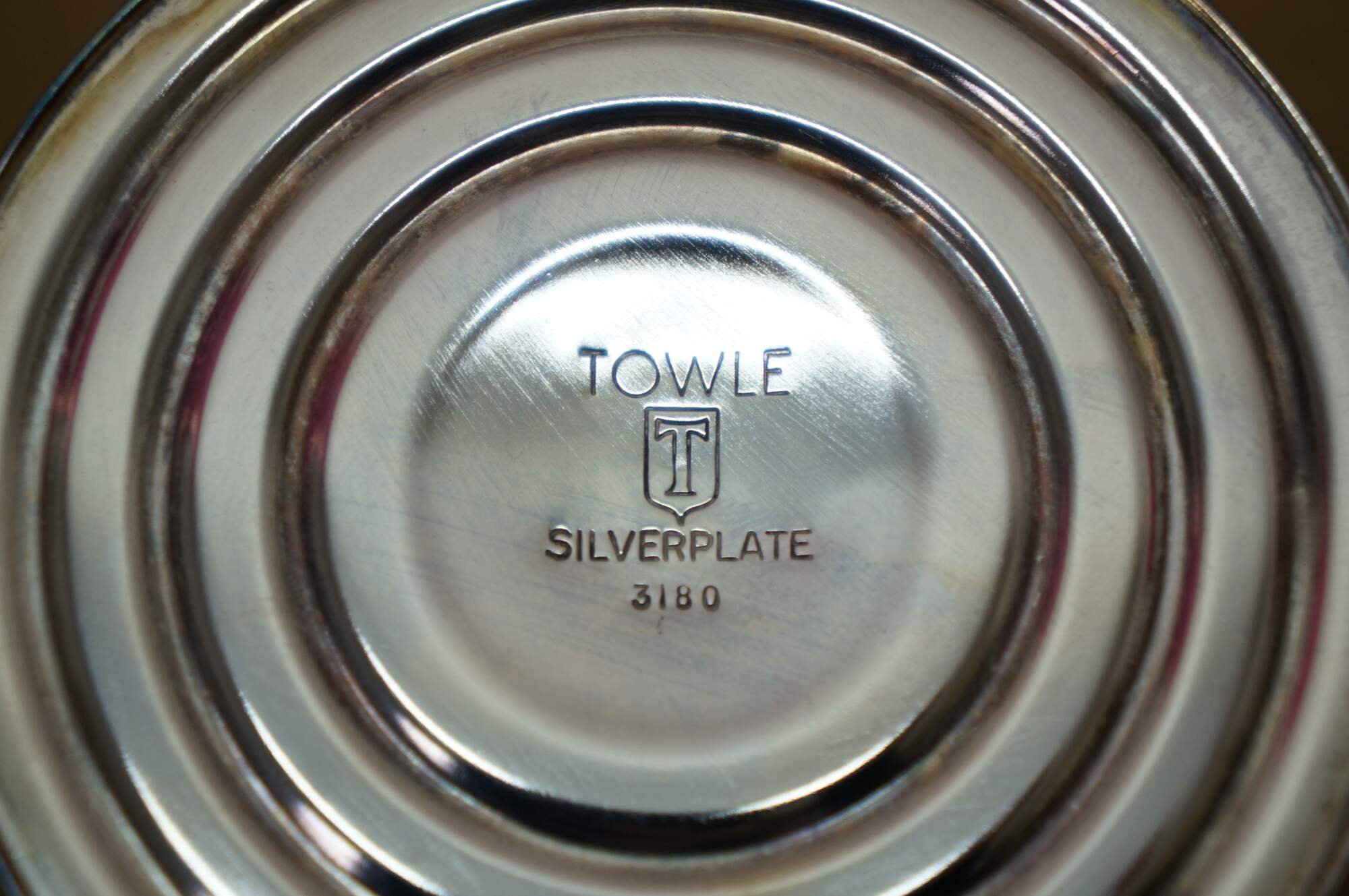 "Towle Silversmiths is an American silver manufacturer. The company that would become Towle Silversmiths was founded in 1690 by William Moulton II, the first silversmith in Newbury, Mass. He was succeeded by William Moulton III (1720-1793). He worked from 1742 to 1762 as a silversmith in Newburyport, and from 1762 to 1788 in Hampstead, New Hampshire. He then moved in a covered wagon to Marietta, Ohio, carrying his silversmith's tools with him. His son, Joseph Moulton worked from about 1764 to 1810 as a silversmith in Newburyport. He had four sons that were silversmiths. 1) Ebenezer moved to Boston. 2) Enoch moved to Portland, Maine, each of them continuing their crafts in their respective places. 3) Abel inherited his father's business in Newburyport. His son William Moulton IV (1772-1861) was the fifth in line of the Moulton chain. He established his own shop in the same place. William had two apprentices, Anthony Francis Towle and William P. Jones. He worked from 1795 to 1845 as a silversmith in Newburyport, Massachusetts. In addition to supplying well-crafted church silver and other vessels, he made jewelry in his shop on Merrimack Street. His son, Joseph Moulton (1814-1903), the sixth and final in line, was the one that sold the silver business he inherited, to his father’s two apprentices, Anthony Francis Towle and William P. Jones (who were also his apprentices), in 1857 to form Towle & Jones, Co. In 1873, the son of Anthony Francis Towle, Edward Bass Towle, was added to the business, and the name was changed to A.F. Towle & Son. It was in business through 1902, at which point their dies were purchased by Rogers, Lunt and Bowlen, who were later to become Lunt Silversmiths. In 1882, Anthony Francis Towle, while still owning A.F. Towle & Son, established the Towle Manufacturing Co. In 1890, the company adopted the trademark of a large script "T" enclosed by a lion. Richard Dimes, an English silversmith who had immigrated to the U.S. in 1881, started Towle's hollowware line. Dimes, who also worked for the Frank W. Smith Silver Co., would eventually establish his own company, Richard Dimes Co., in Boston. Eventually the company's name was changed to Towle Silversmiths. Over the years, Towle has created numerous sterling silver flatware patterns in the United States: including the "Candlelight" in 1934, the "Marie Louise" in 1939 which became the official sterling silver pattern for U.S. embassies worldwide, "Old Master" in 1942, now considered by some to be the company’s flagship pattern, and the "Contour" in 1950 (designed by Robert J. King, patented by John Van Koert) which was the first American sterling pattern to manifest post-World War II organic modernist design and the only production-line American flatware included in the Museum of Modern Art's Good Design exhibitions. The company expanded after a series of acquisitions in the late 1970s and early 1980s. In 1986, due to problems with inventory and distribution and a weak retail market, Towle filed for Chapter 11 bankruptcy protection. In 1990, Towle Silversmiths was acquired by the holding company Syratech Inc., which also owned Wallace Silversmiths and the International Silver Company. In 2006, Lifetime Brands Inc. purchased Syratech Inc., acquiring all three brands." (Wikipedia / Sterling Towle)