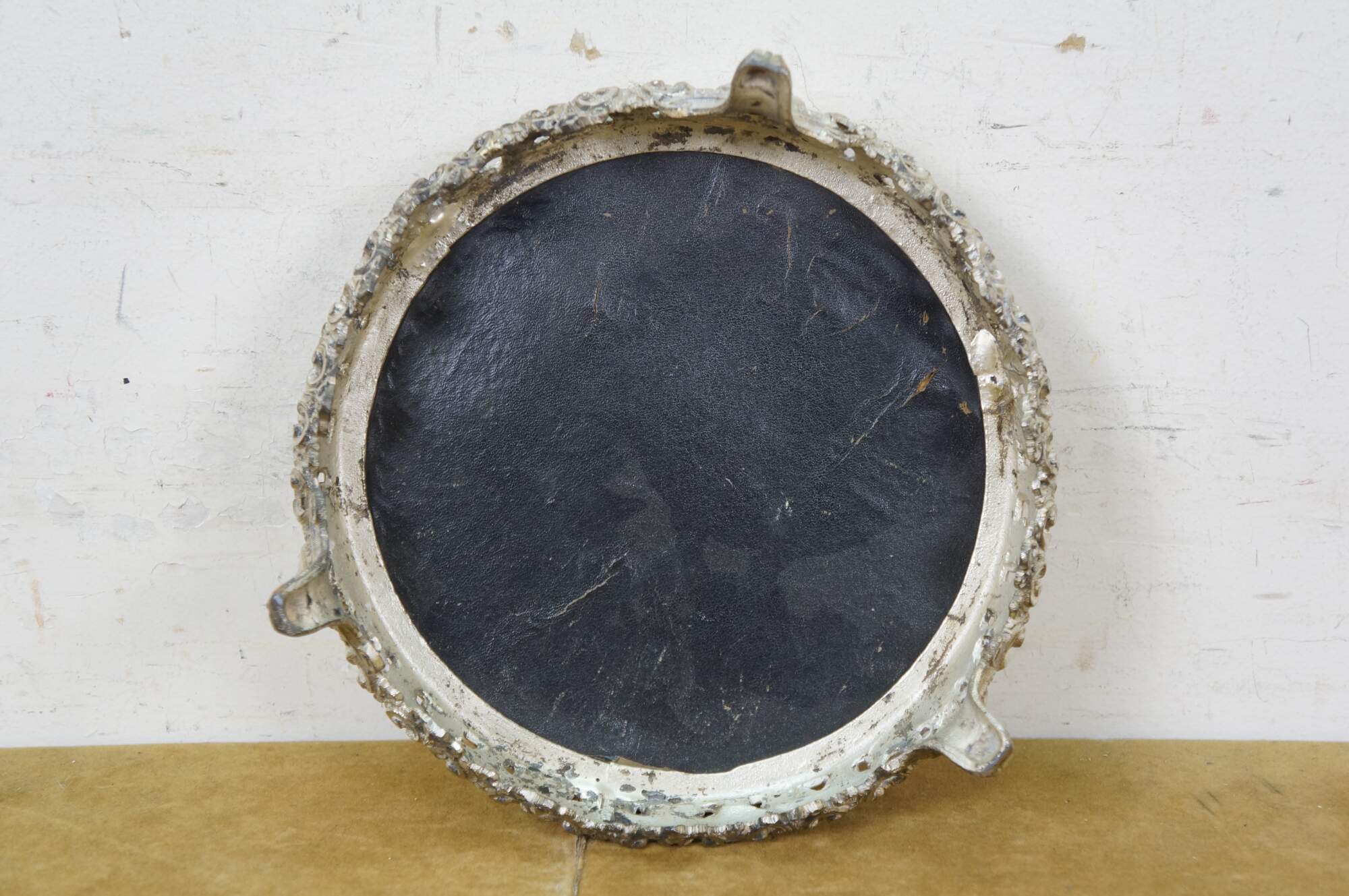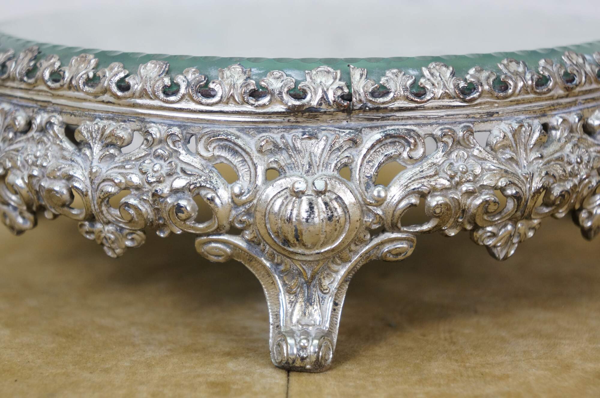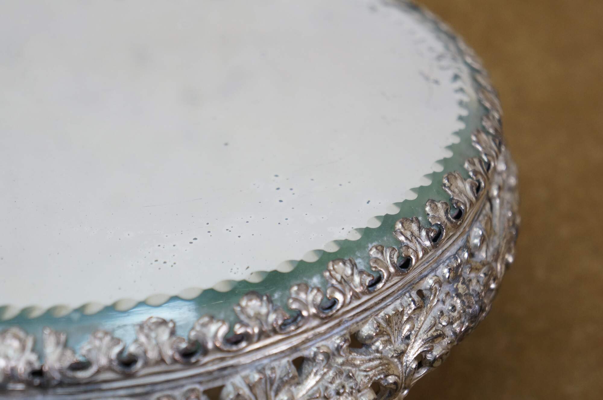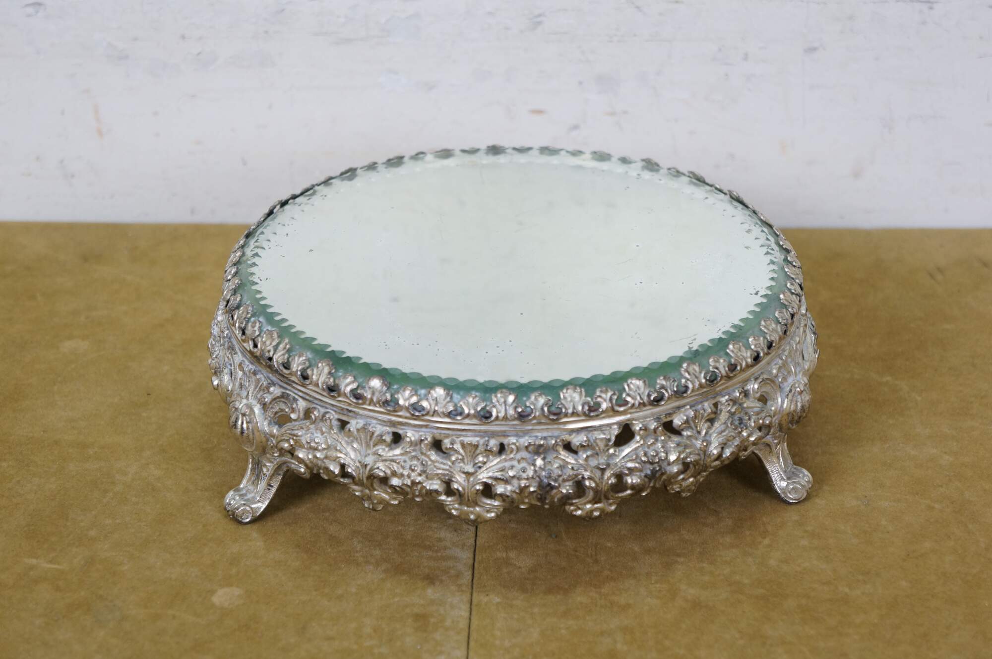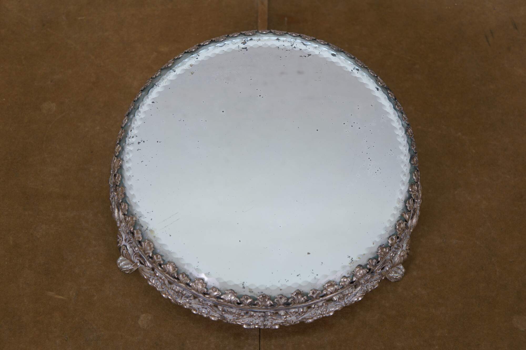 Late 19th to early 20th century tabletop mirror / plateau - features a round thick glass mirror with beveled and cut edge, framed in an art nouveau silverplate stand with three scrolled feet and floral and foliate patterns.