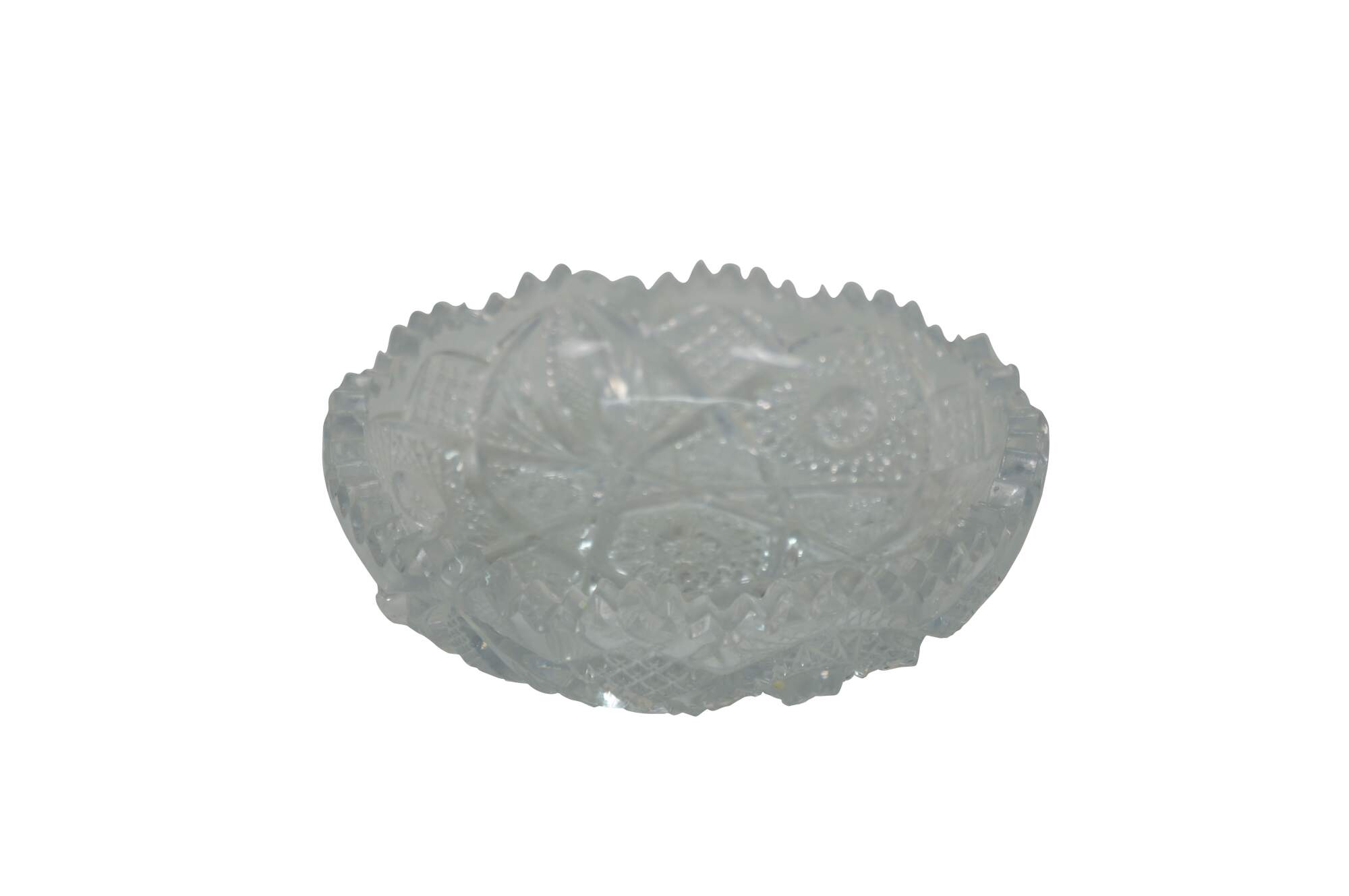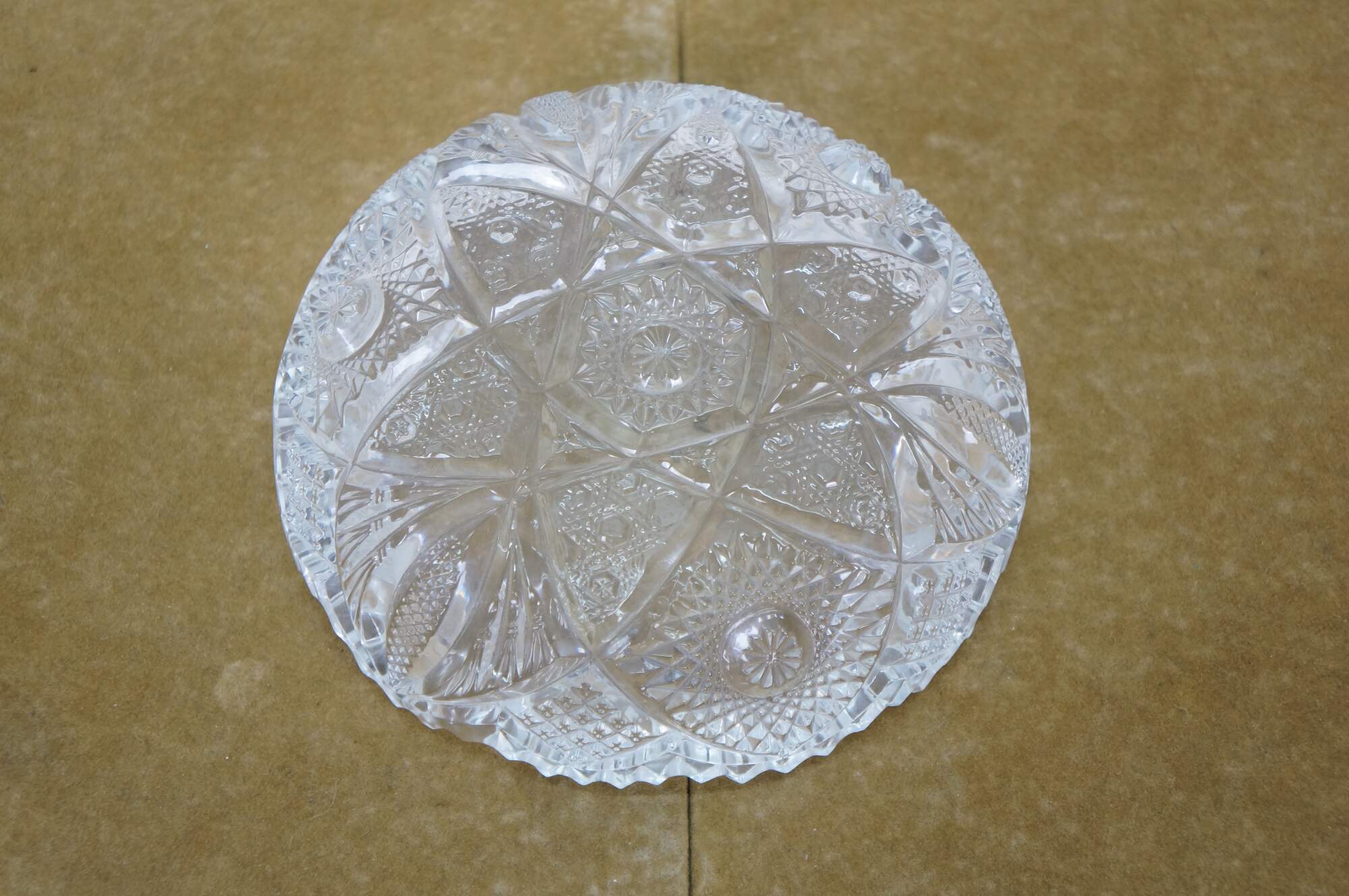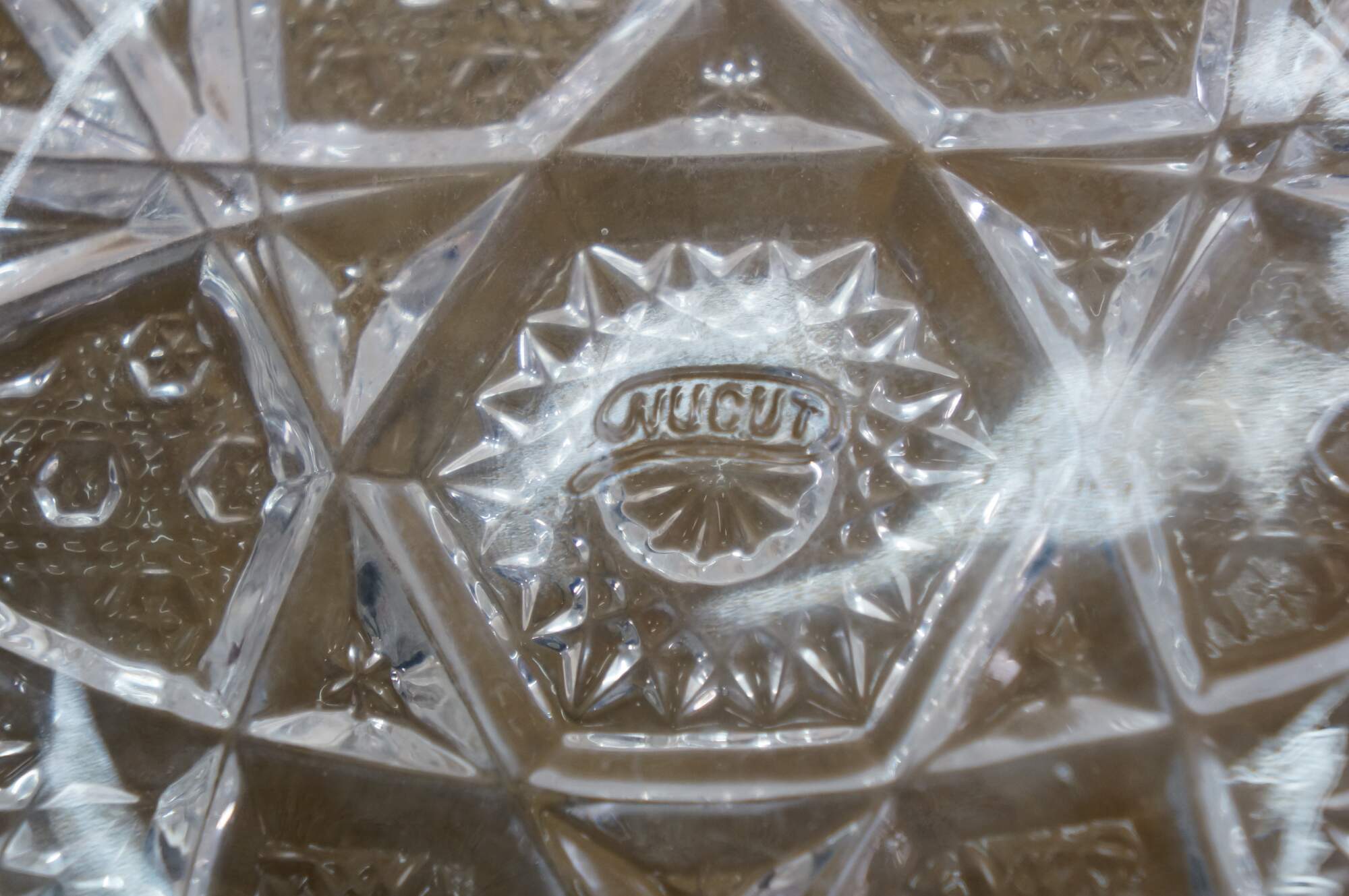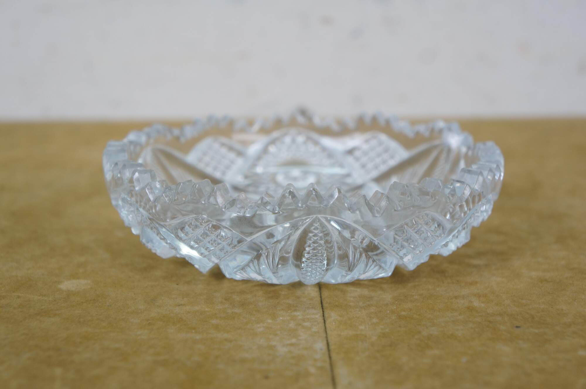 Early 20th century Imperial glass Nucut cut glass / crystal nut / candy dish. Round shape with low sawtooth edge, intricately cut with leaf fronds, corn cobs, and stars nestled in an overlapping lobed pattern.