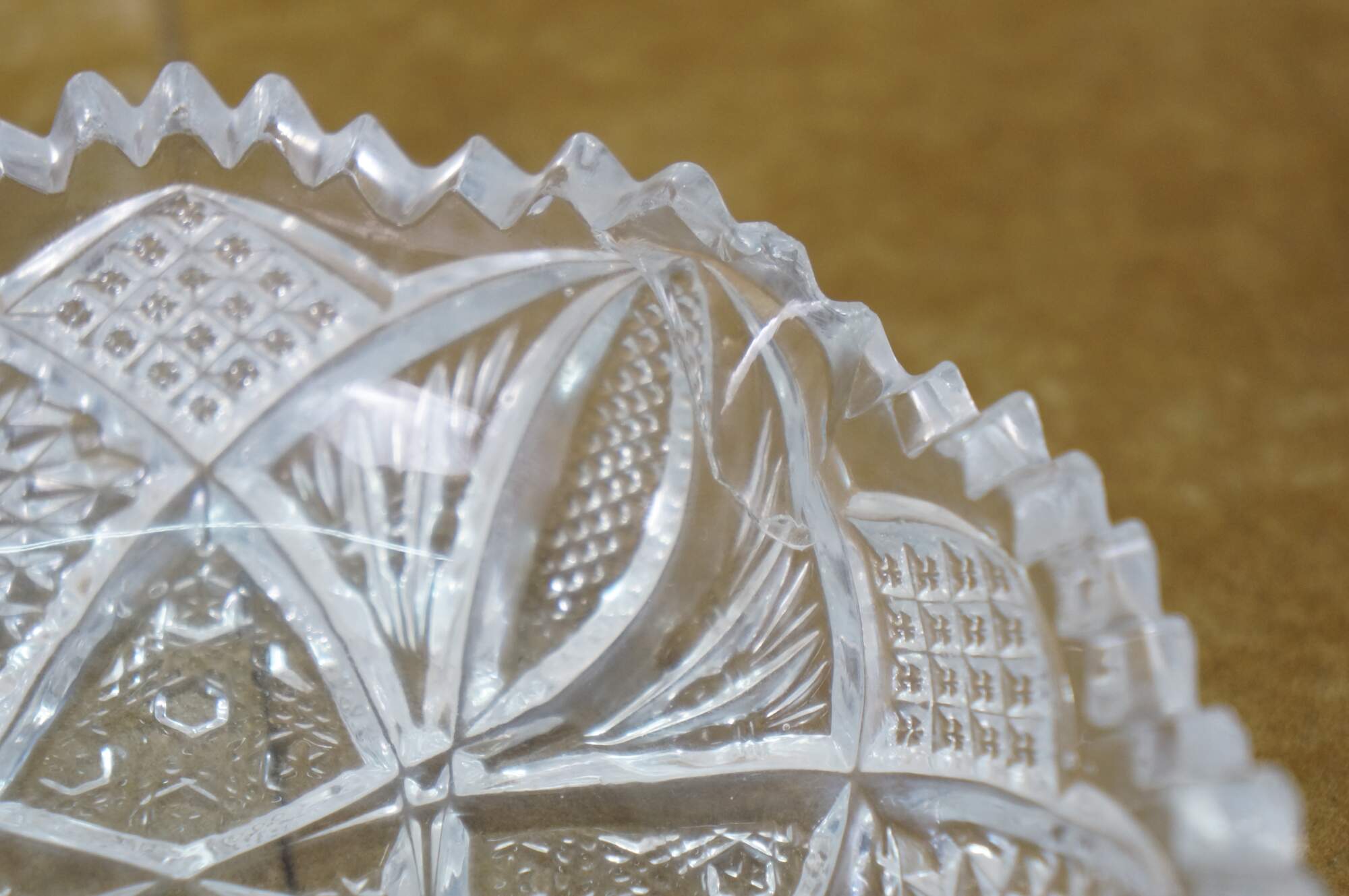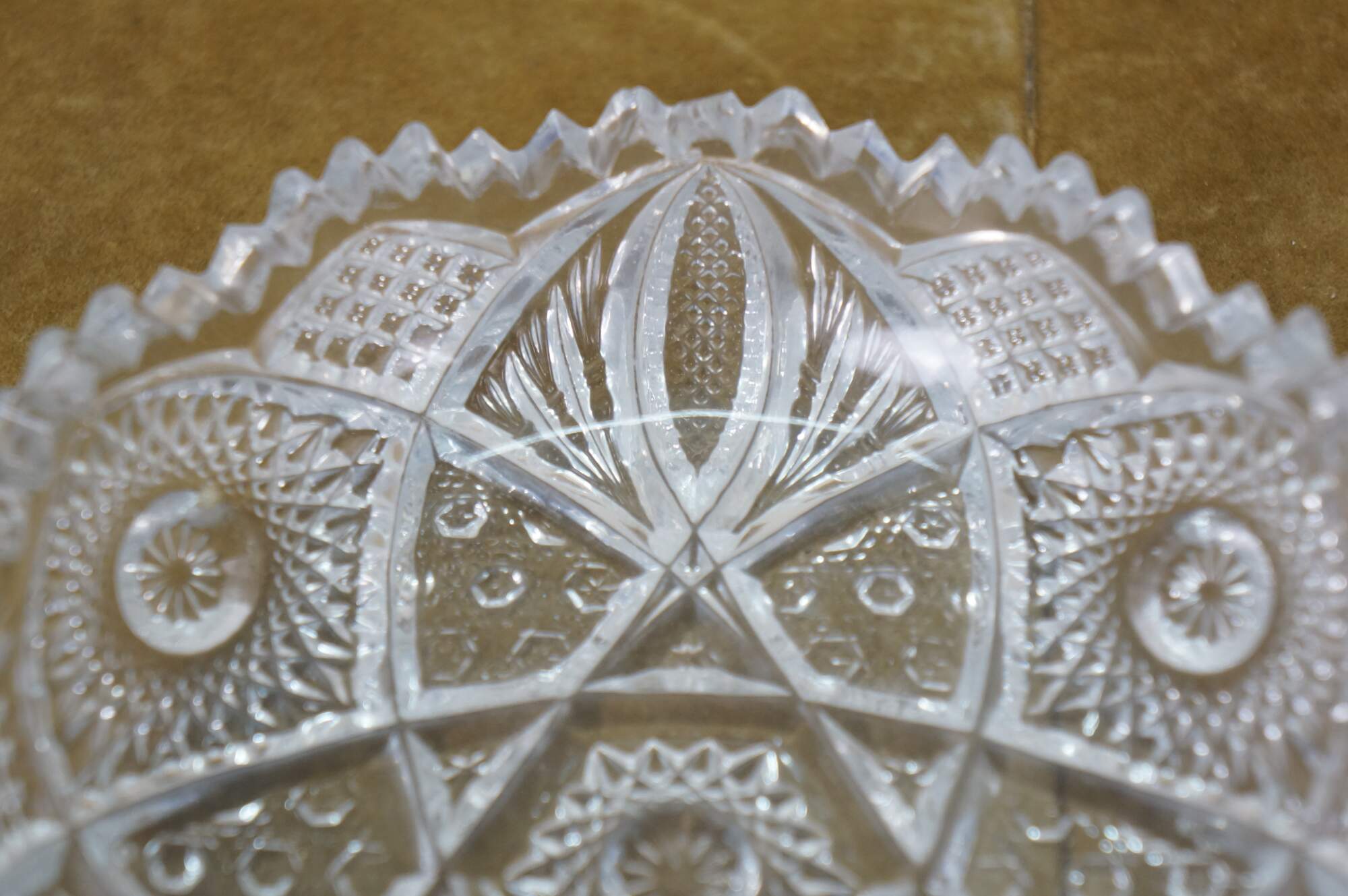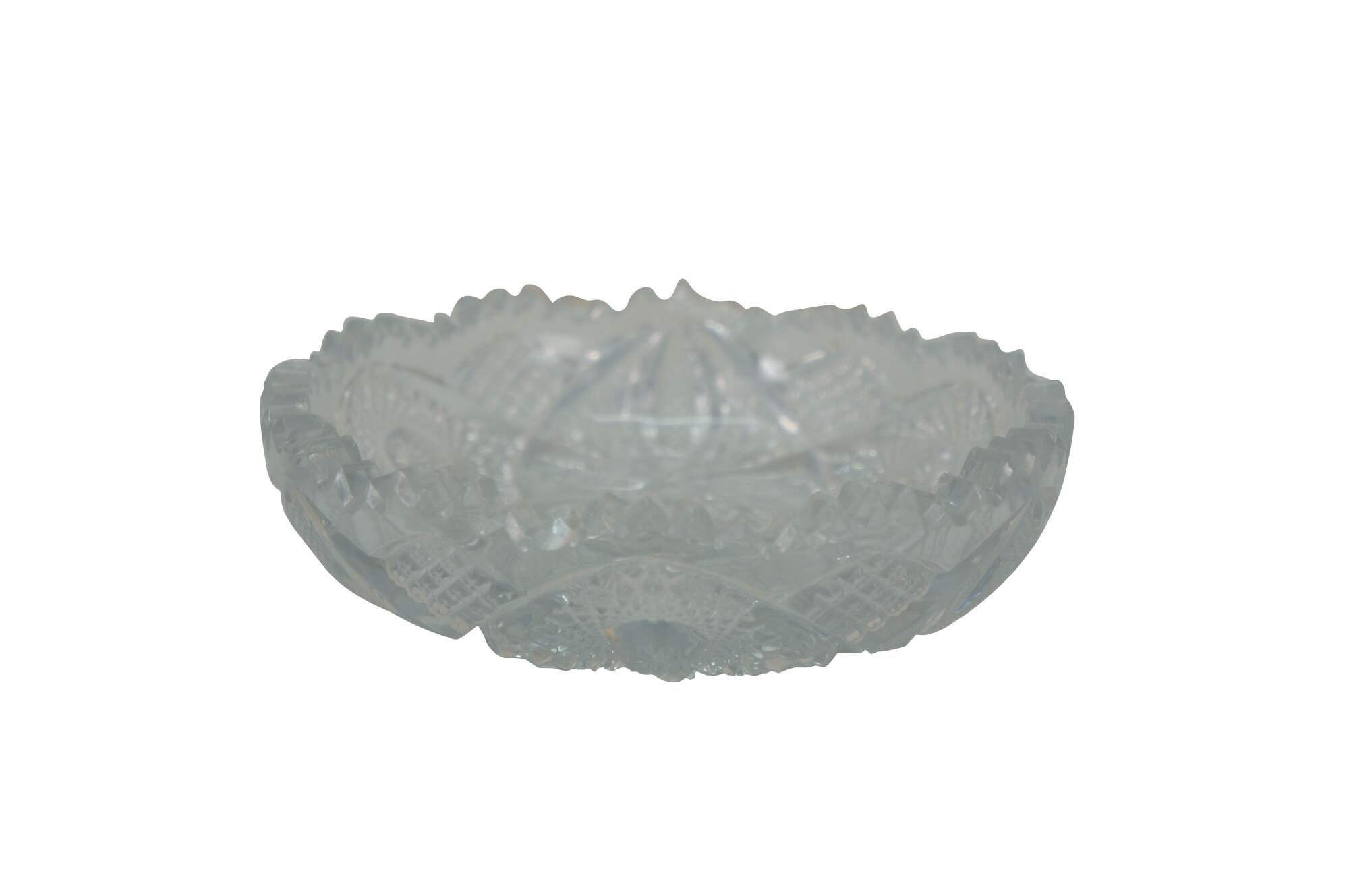 Early 20th century Imperial glass Nucut cut glass / crystal nut / candy dish. Round shape with low sawtooth edge, intricately cut with leaf fronds, corn cobs, and stars nestled in an overlapping lobed pattern.