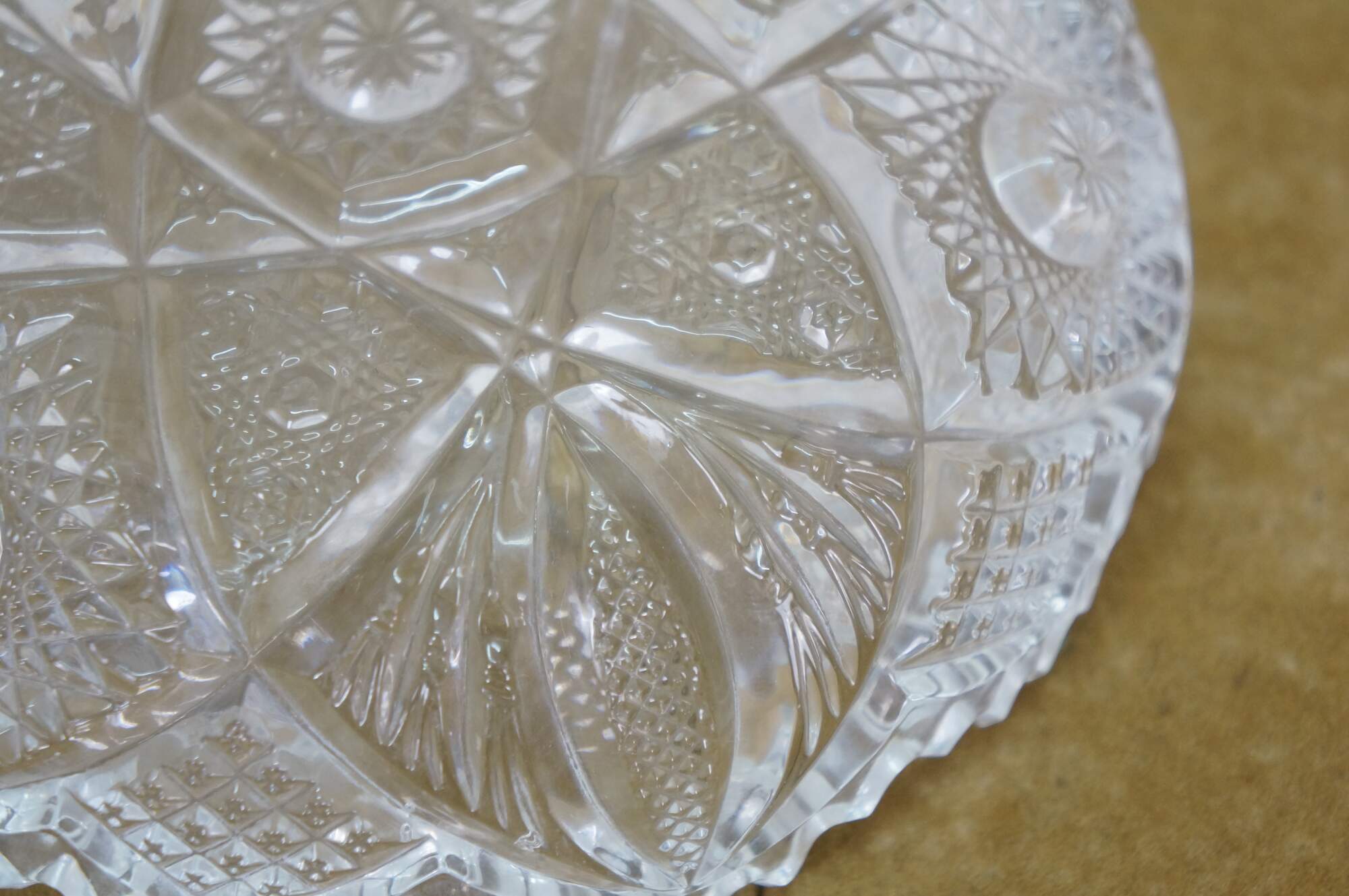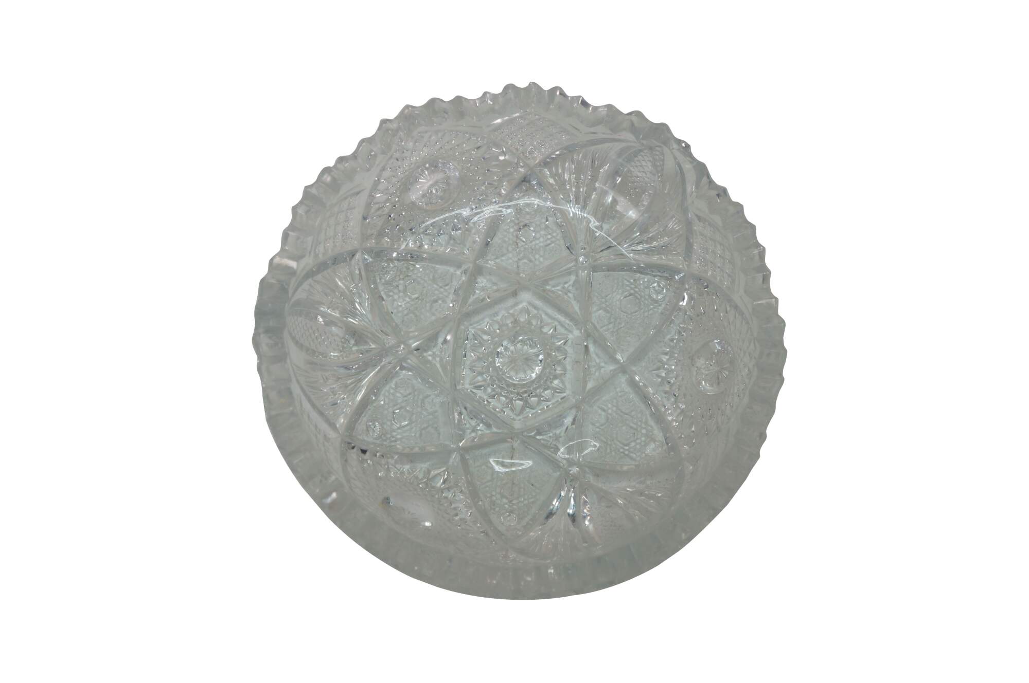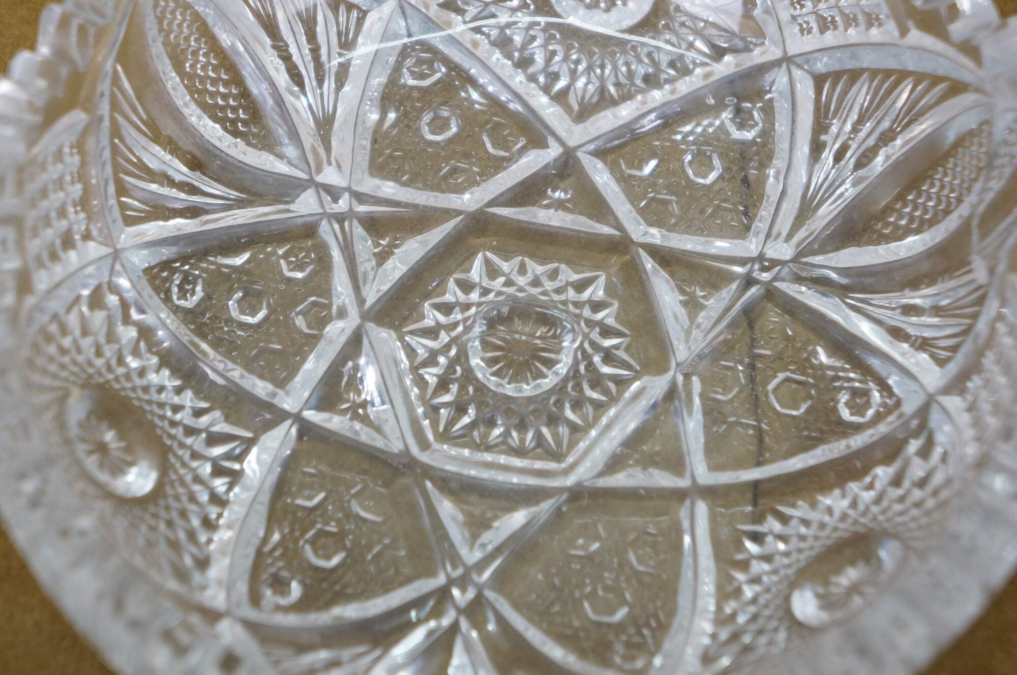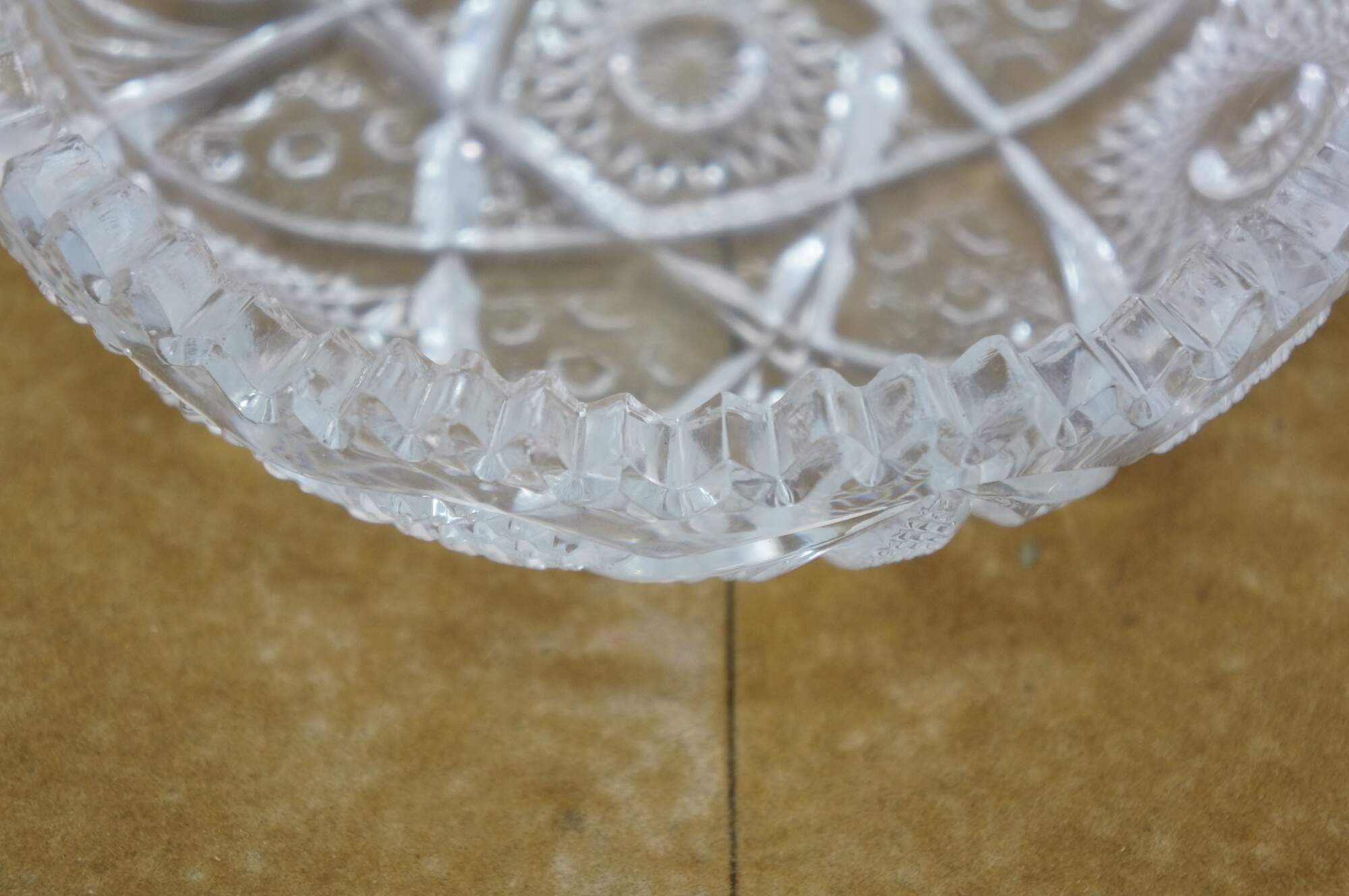 Early 20th century Imperial glass Nucut cut glass / crystal nut / candy dish. Round shape with low sawtooth edge, intricately cut with leaf fronds, corn cobs, and stars nestled in an overlapping lobed pattern.