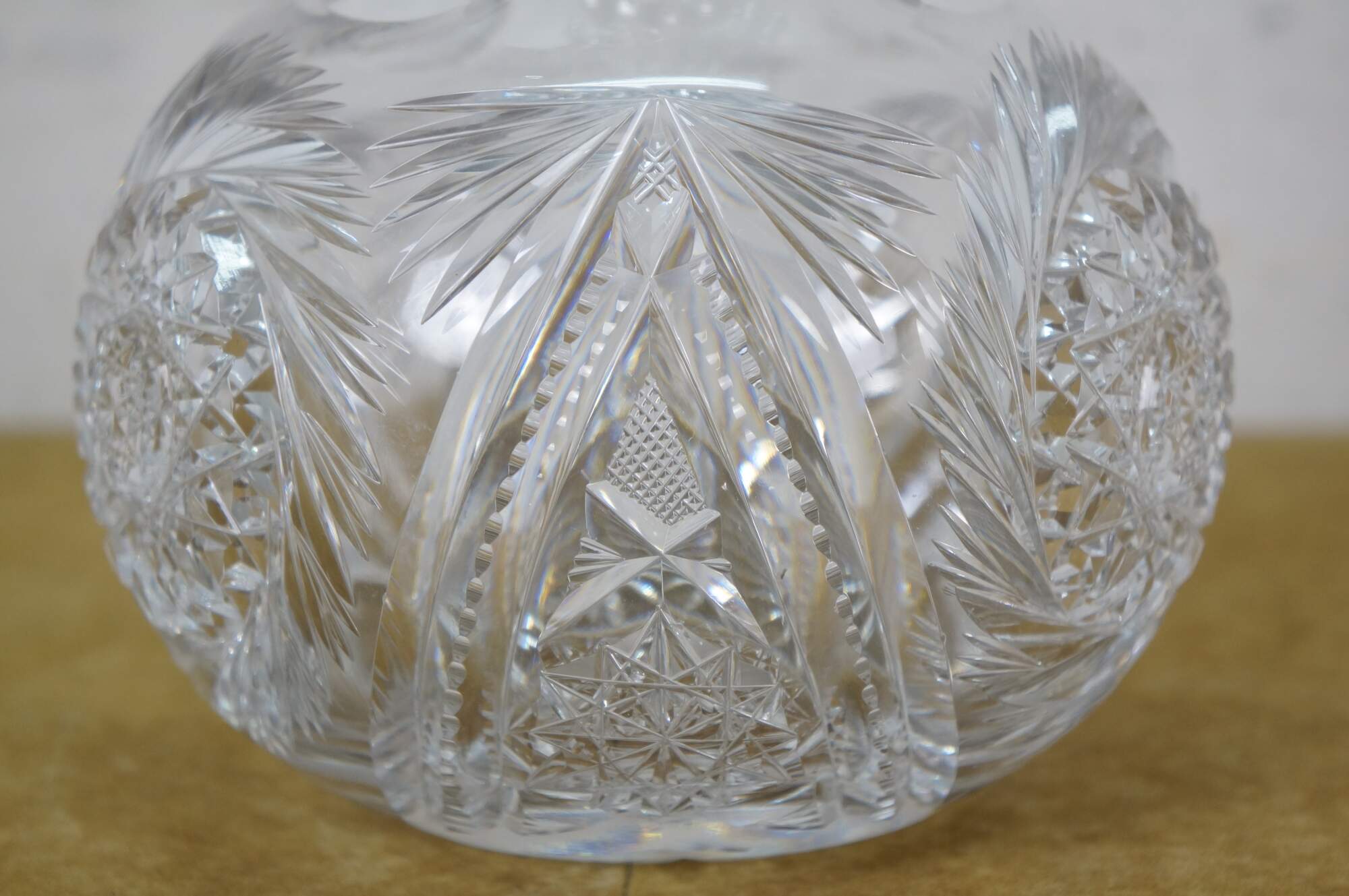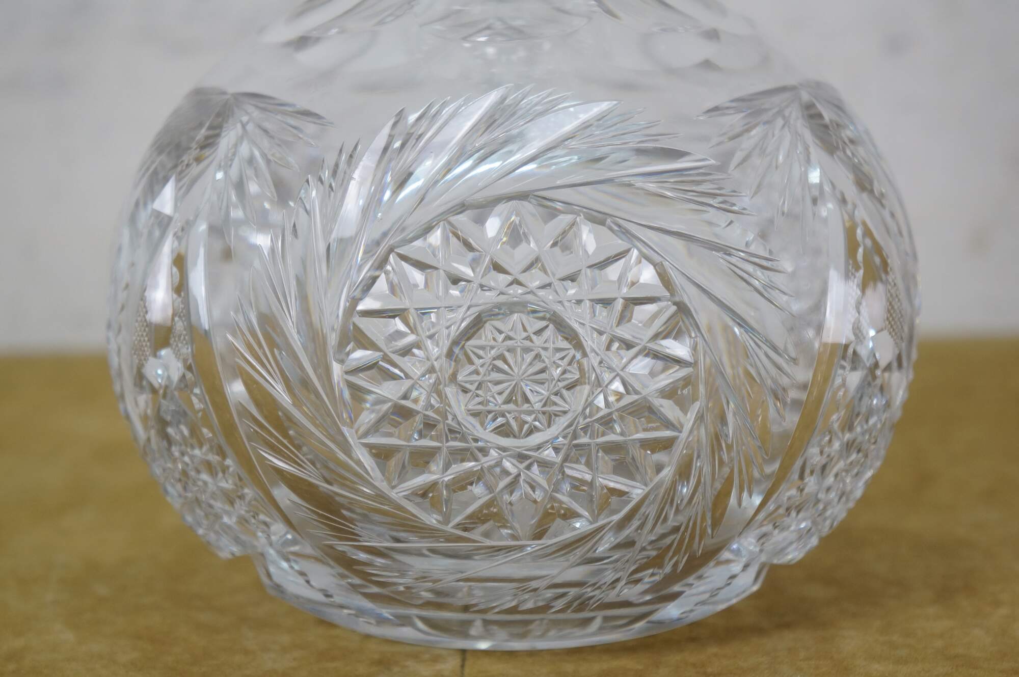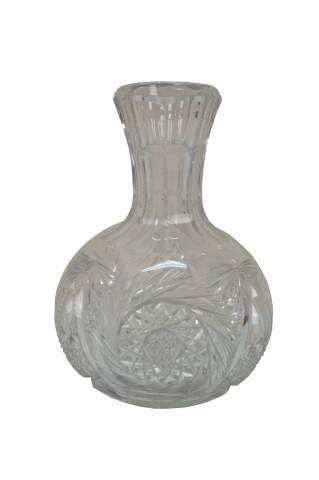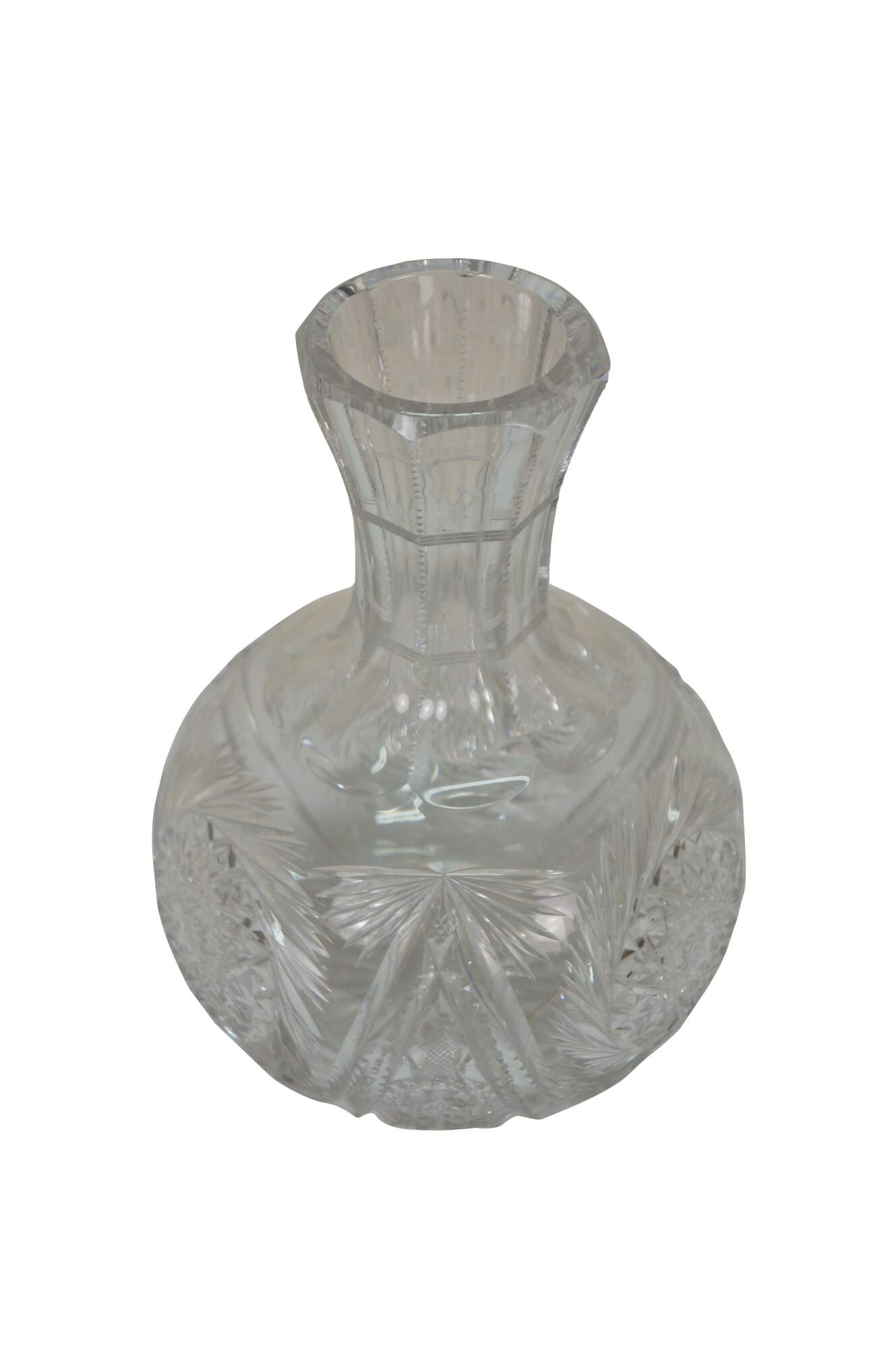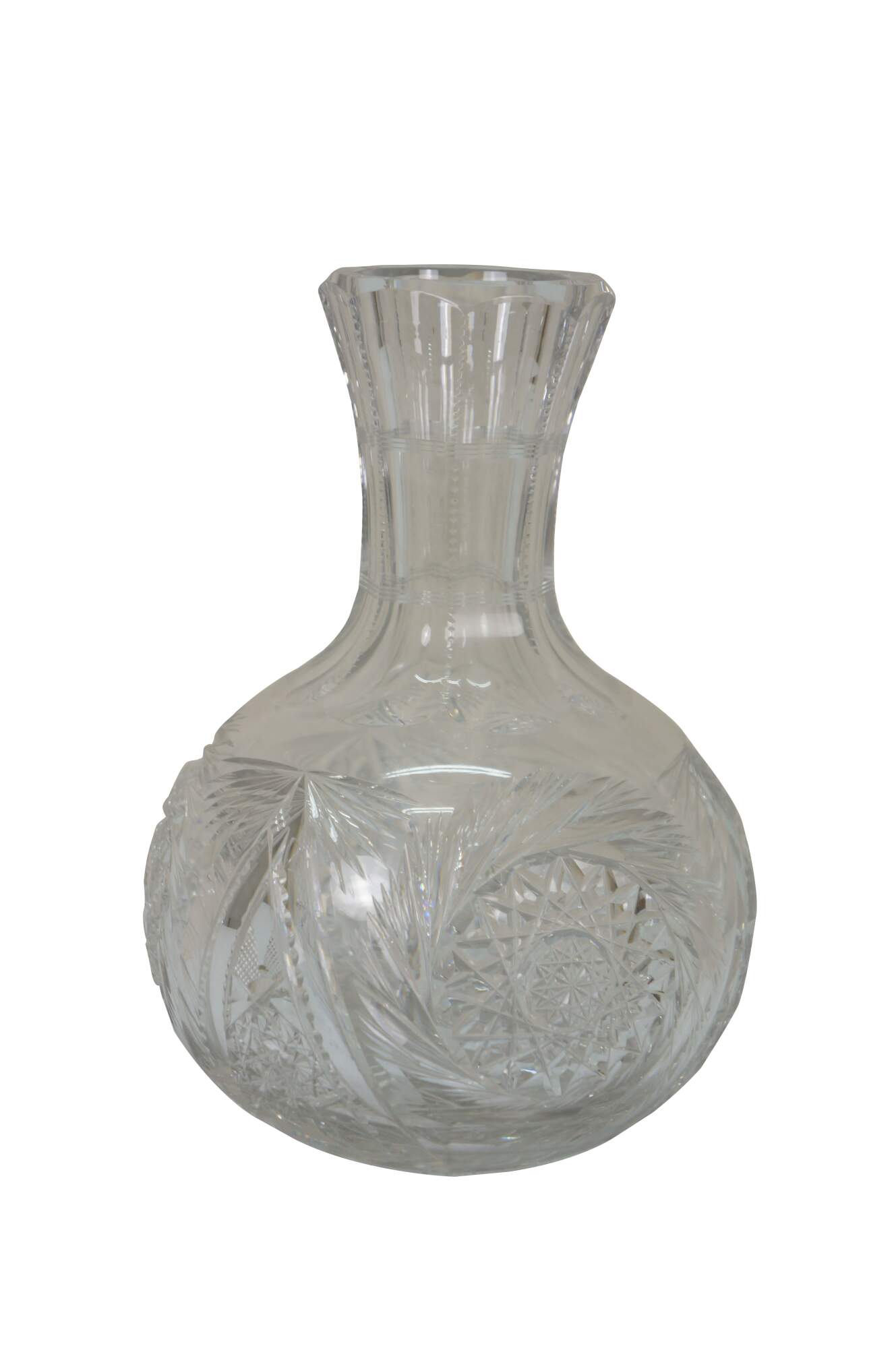 Early 20th century American Brilliant clear cut crystal / glass wine decanter / open carafe. Ballon shaped base and flared neck, cut with many pointed stars and pinwheels, triangular panels and fan shaped leaves.