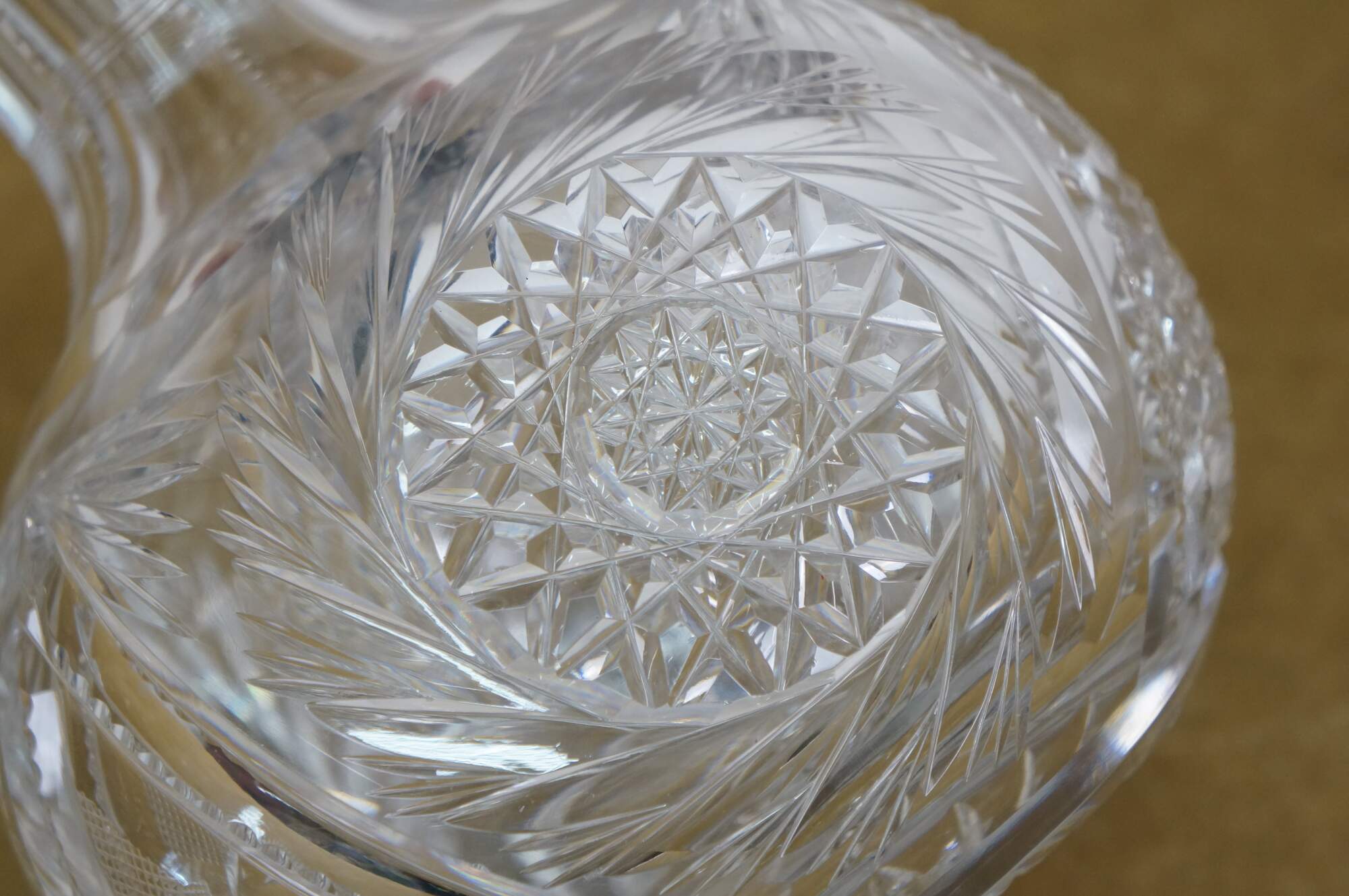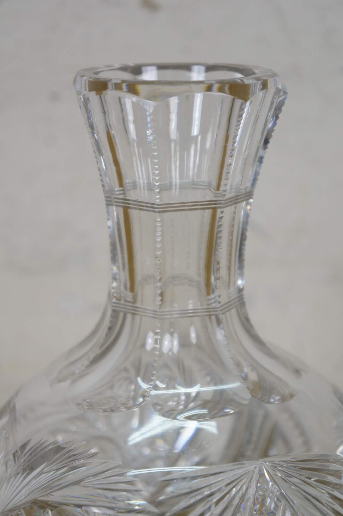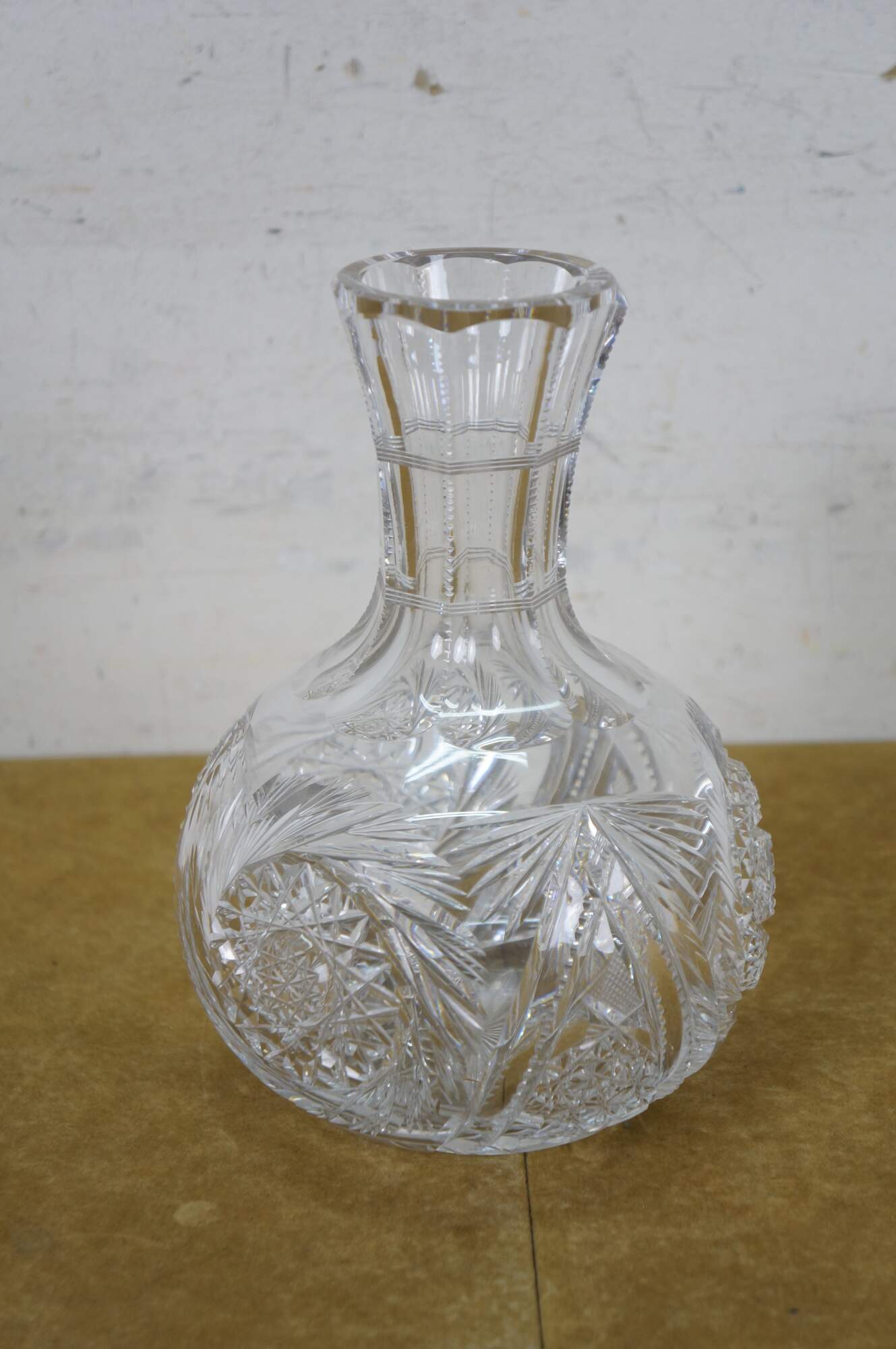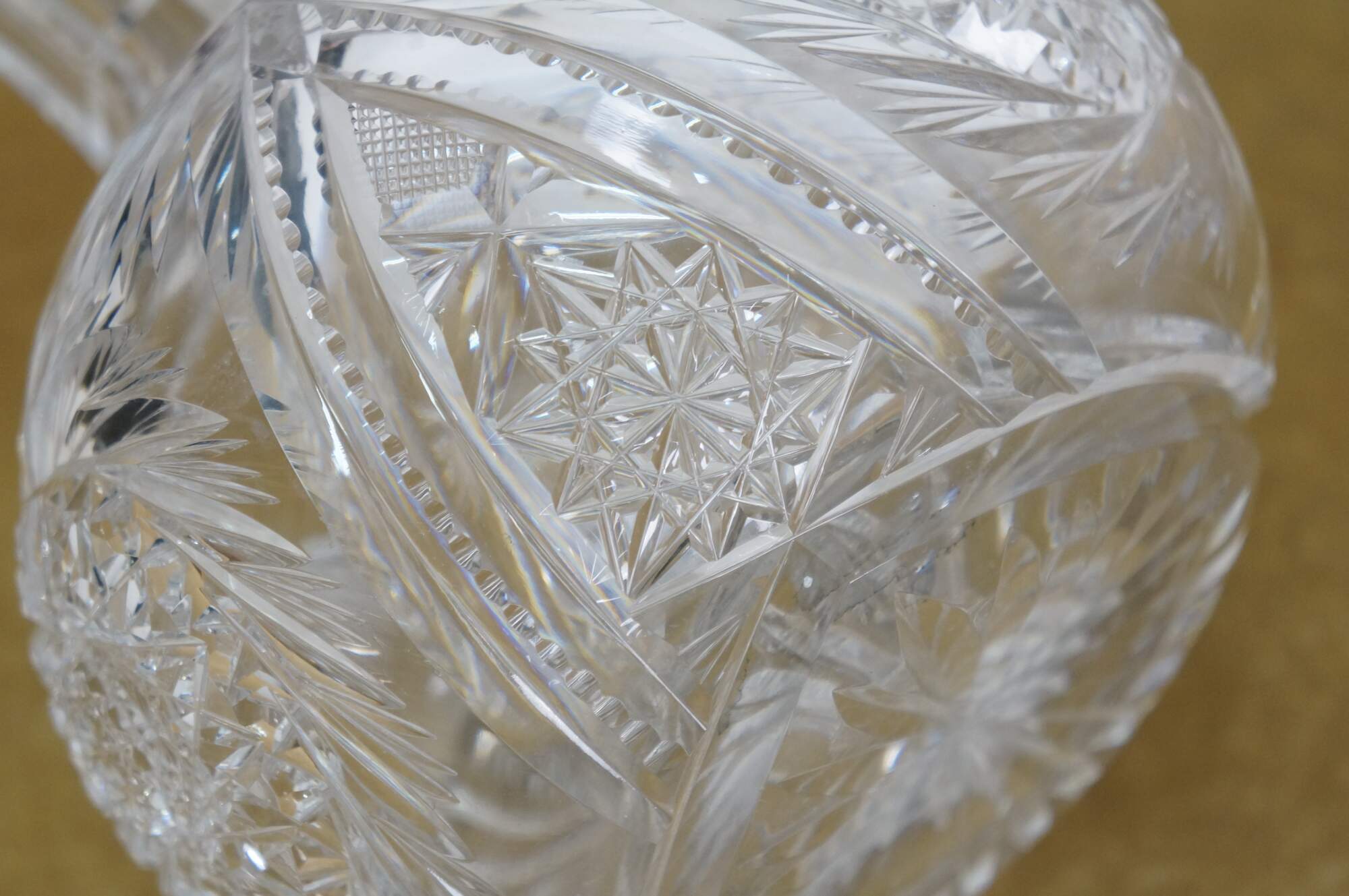 Early 20th century American Brilliant clear cut crystal / glass wine decanter / open carafe. Ballon shaped base and flared neck, cut with many pointed stars and pinwheels, triangular panels and fan shaped leaves.