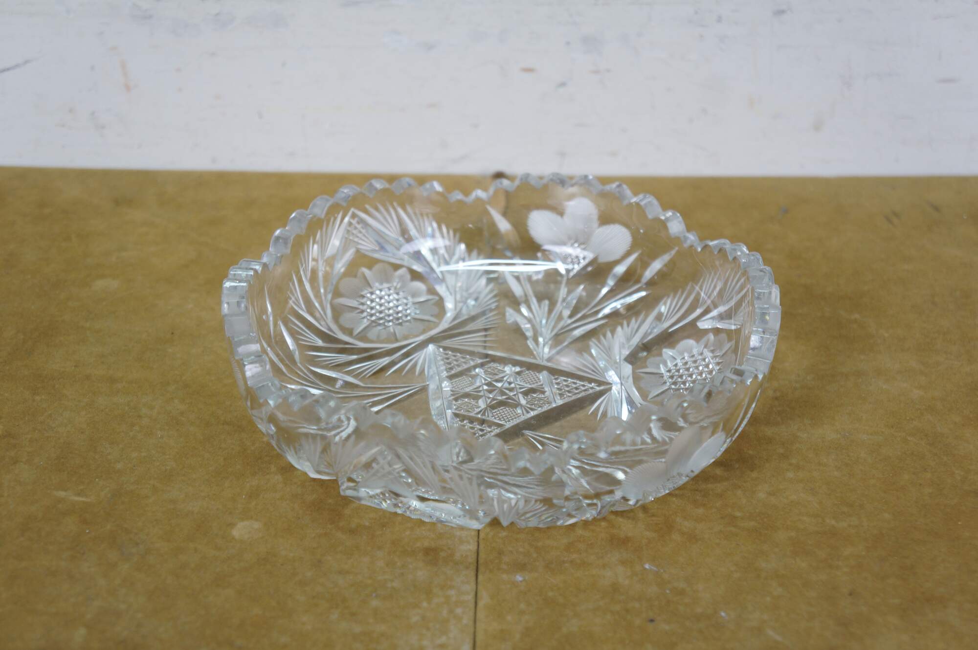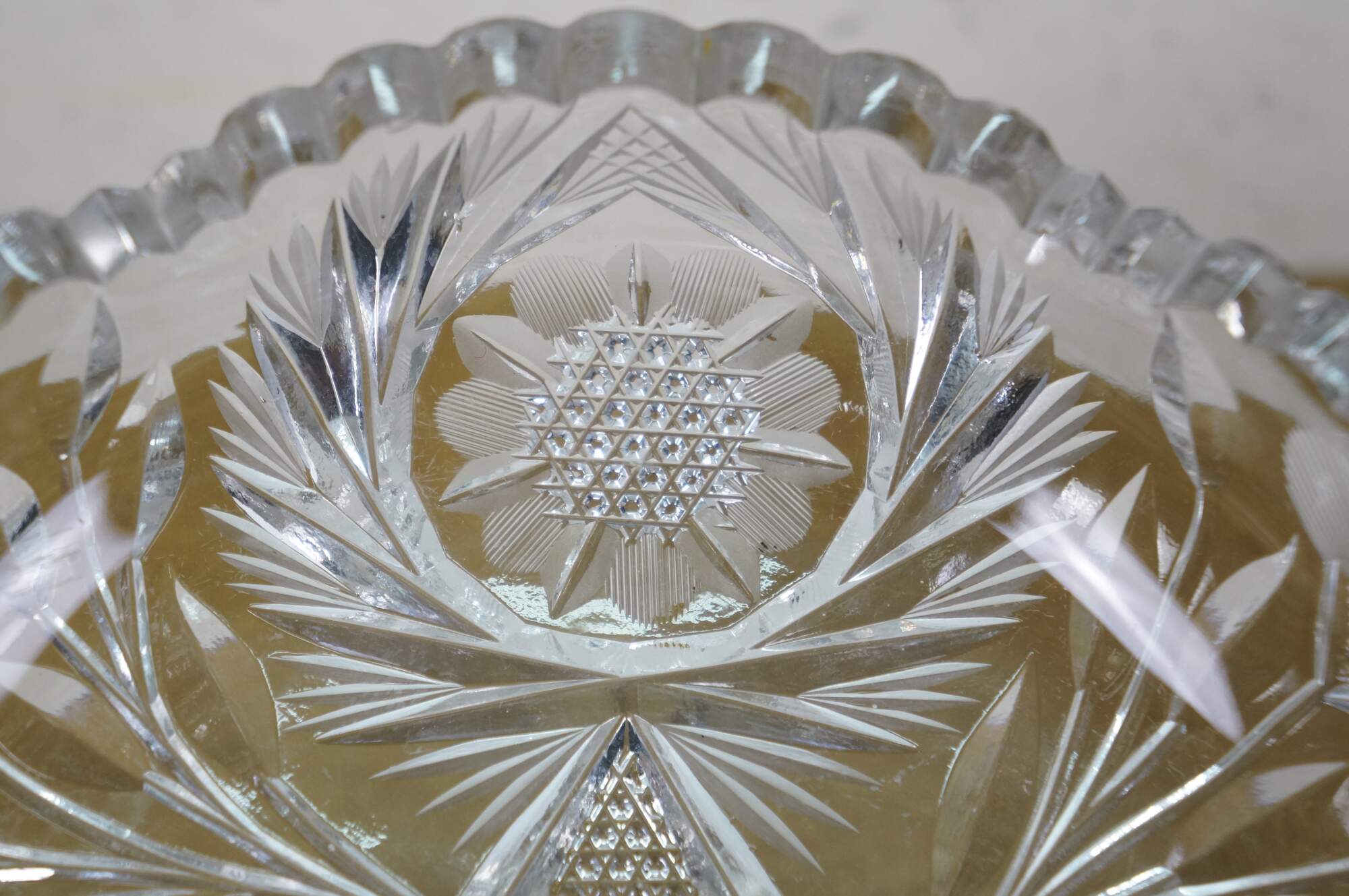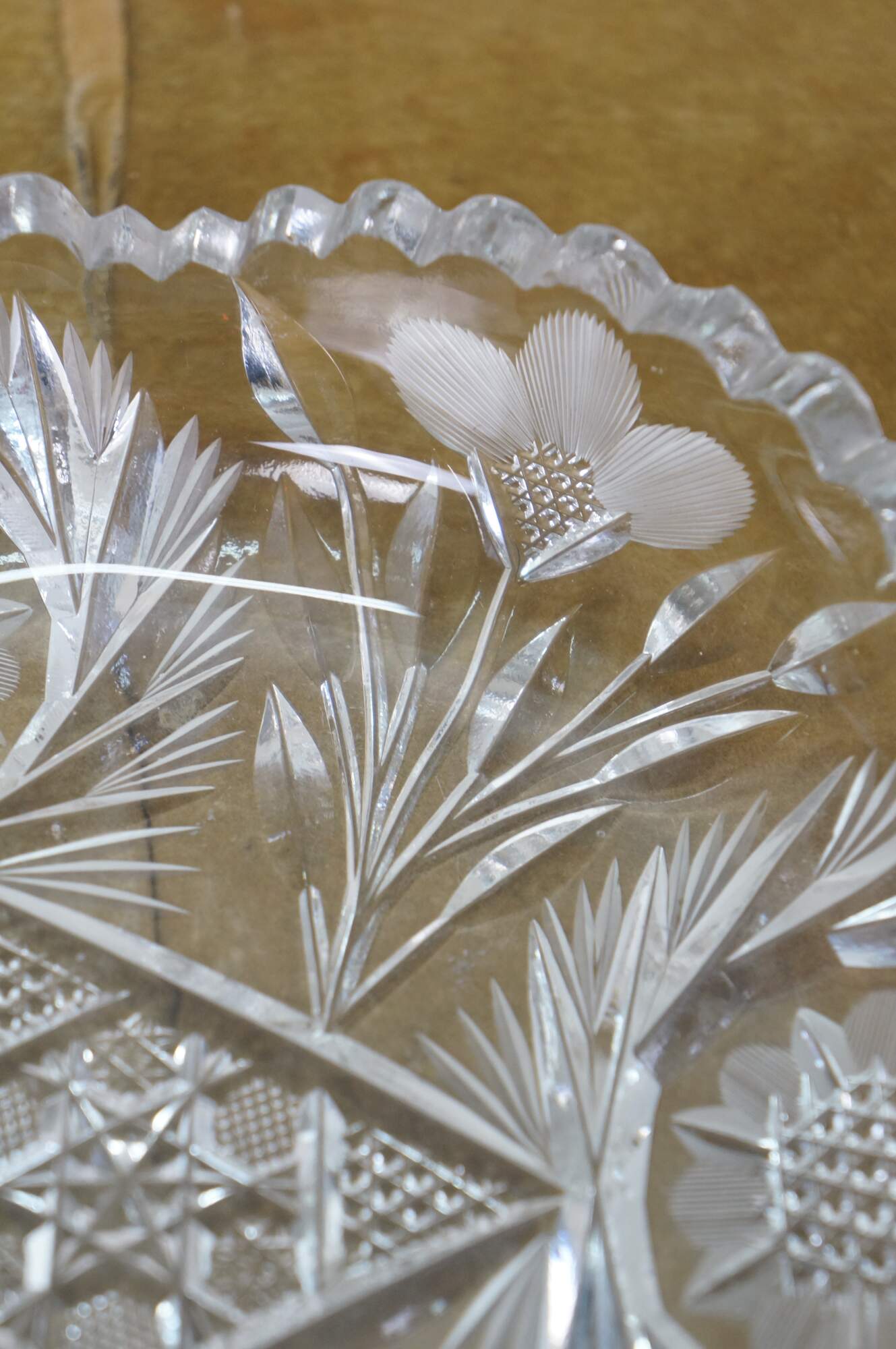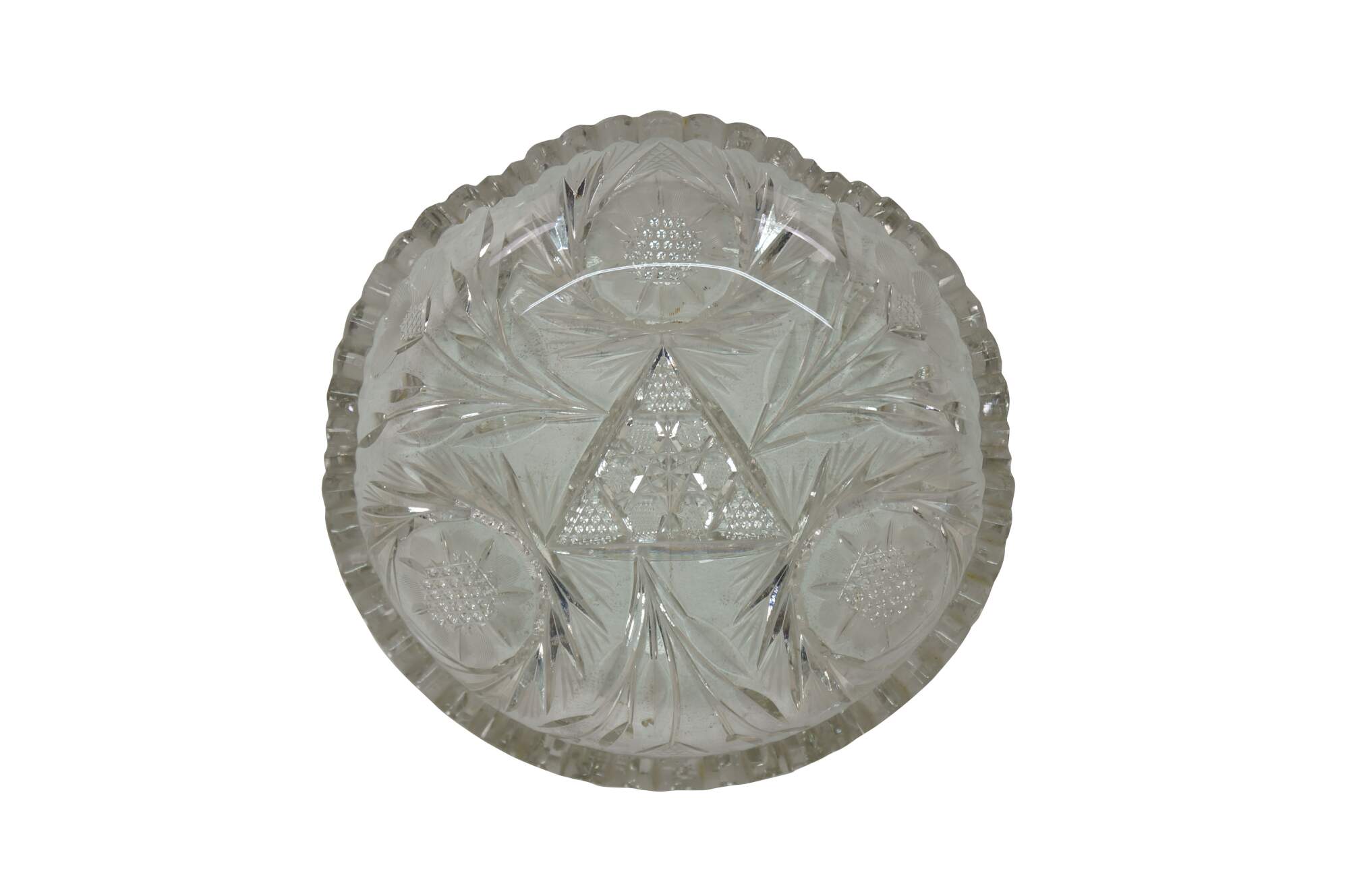Early 20th century American Brilliant Period cut crystal / glass nut / candy dish - low, round shape with sawtooth edge, cut with a triangular patterned center riinged with leafy stems and etched flower blossoms.