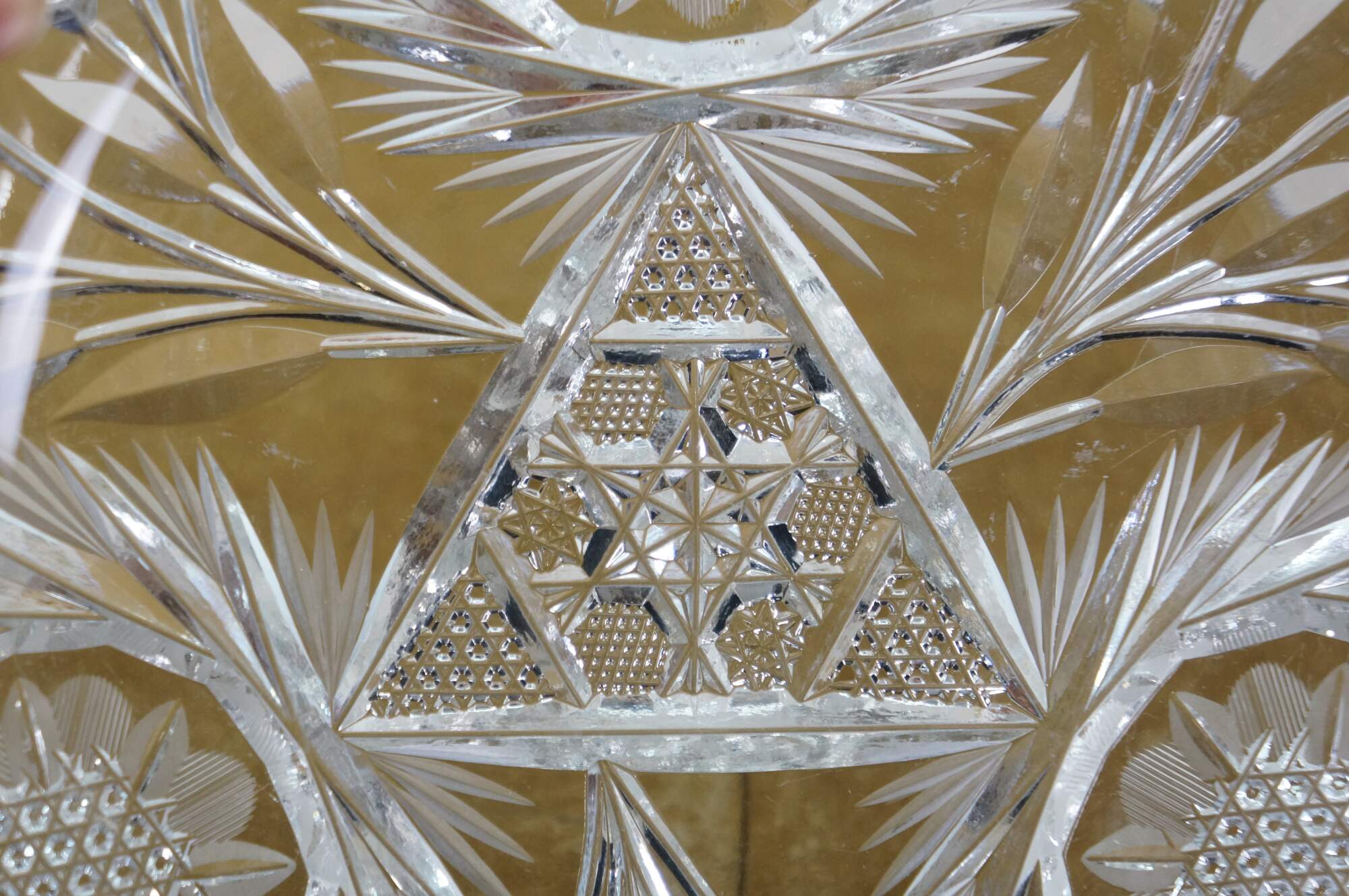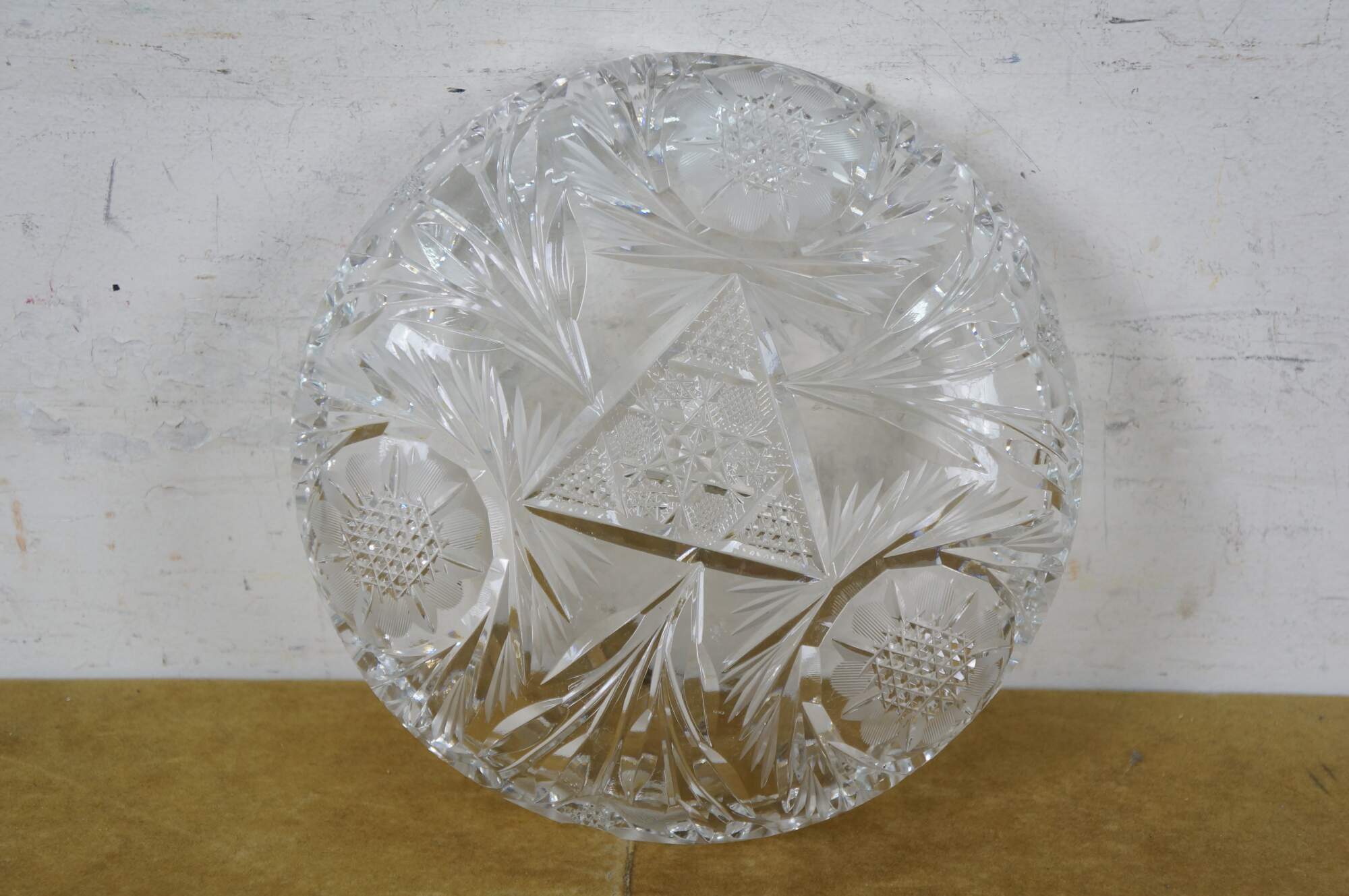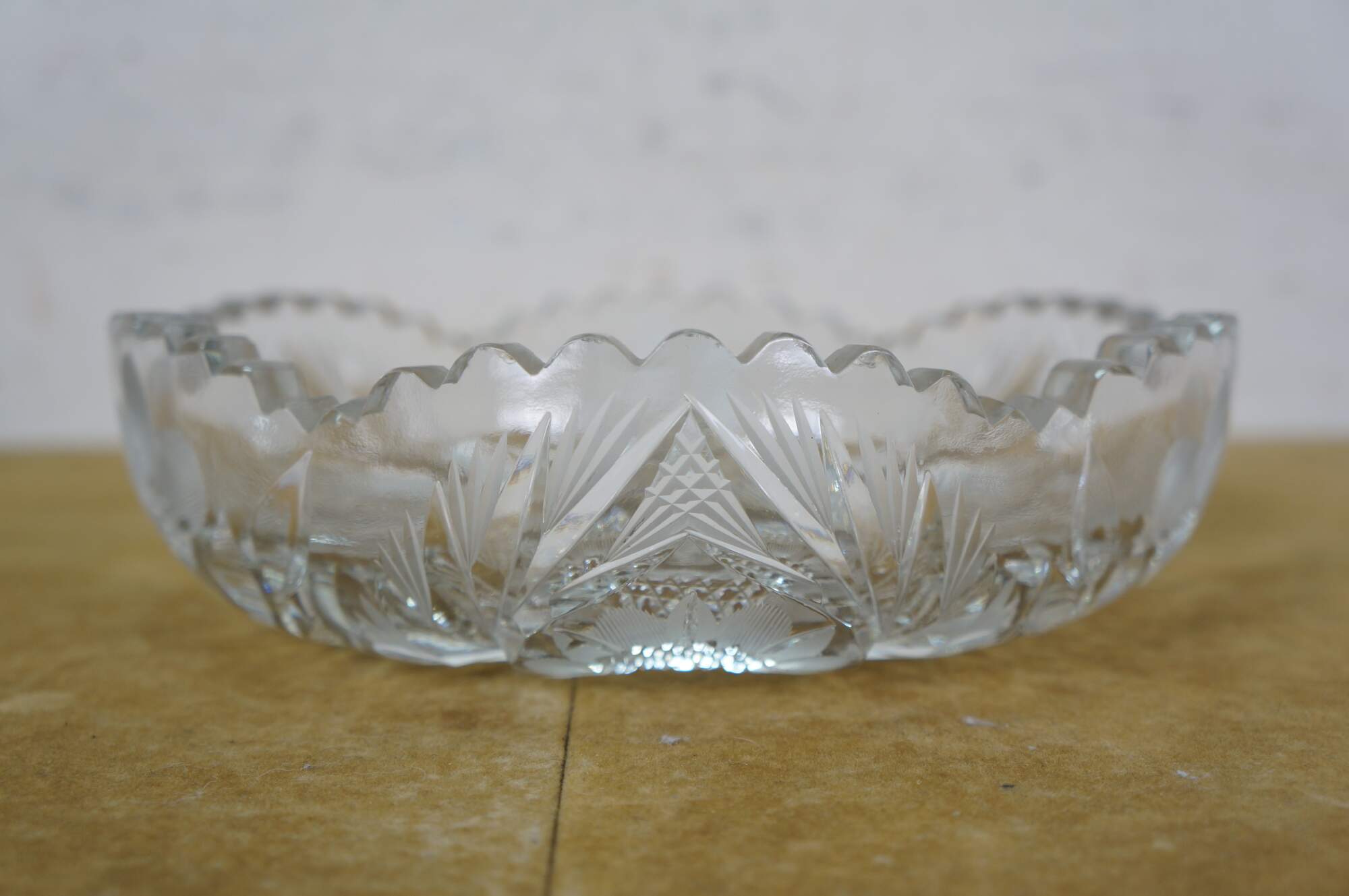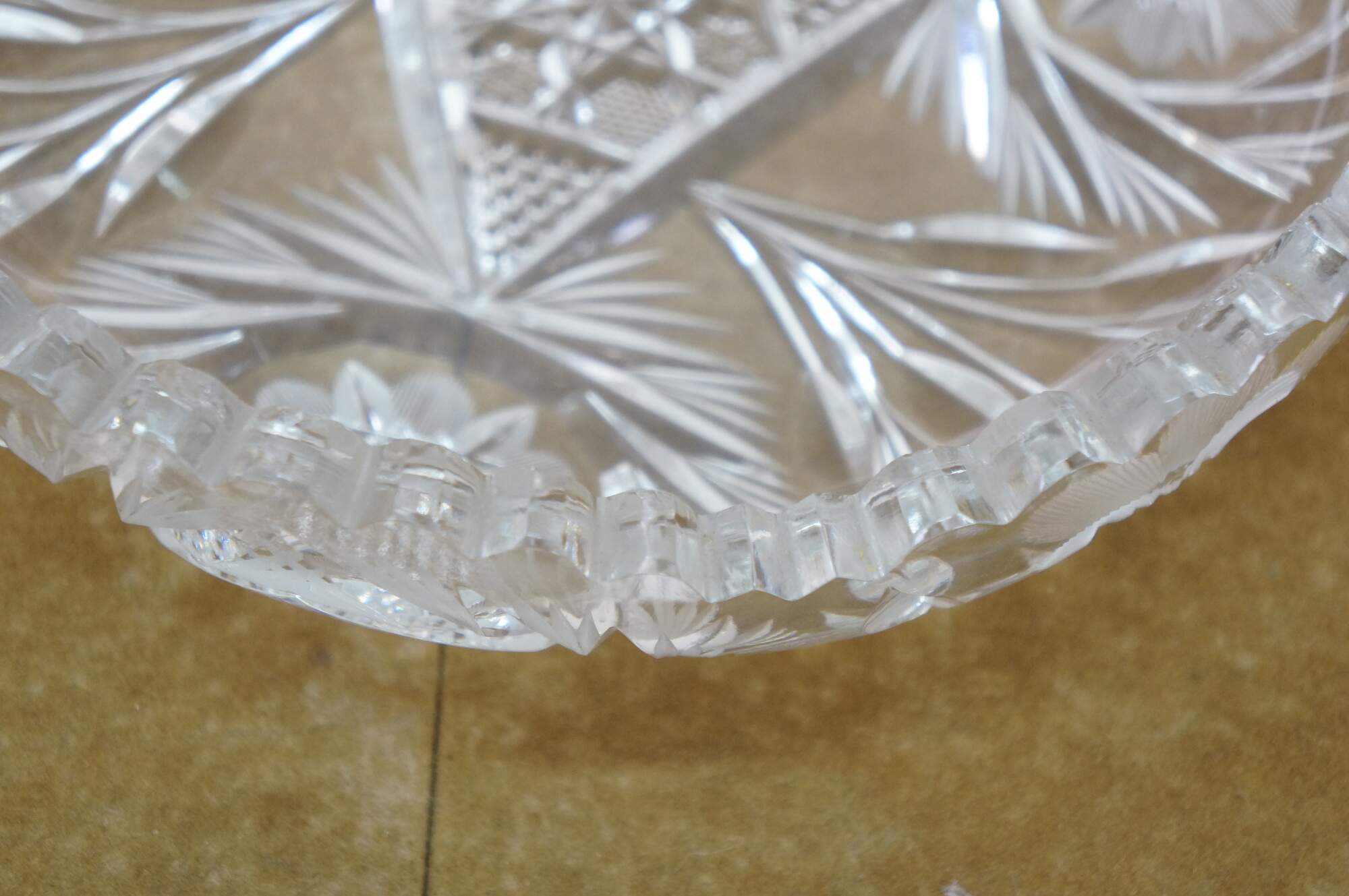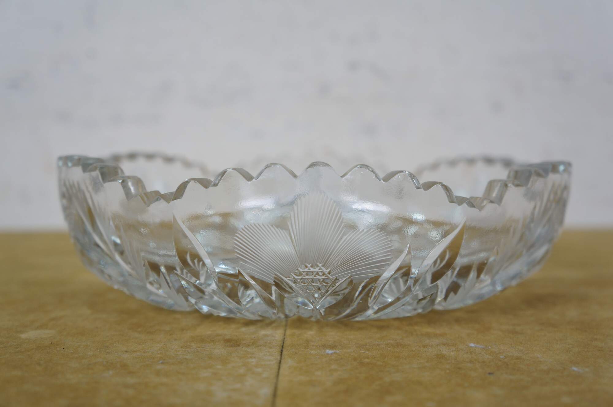 Early 20th century American Brilliant Period cut crystal / glass nut / candy dish - low, round shape with sawtooth edge, cut with a triangular patterned center riinged with leafy stems and etched flower blossoms.