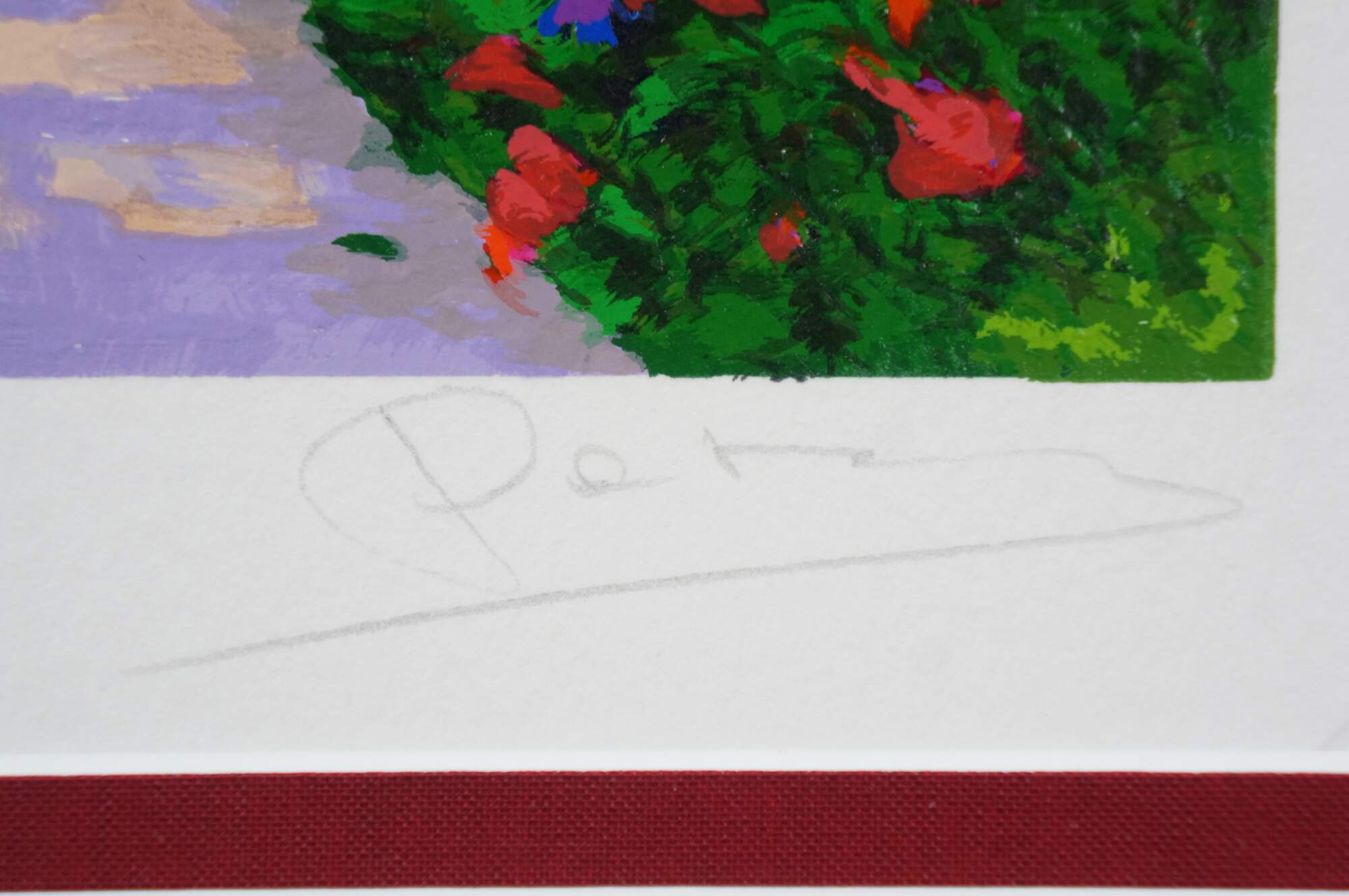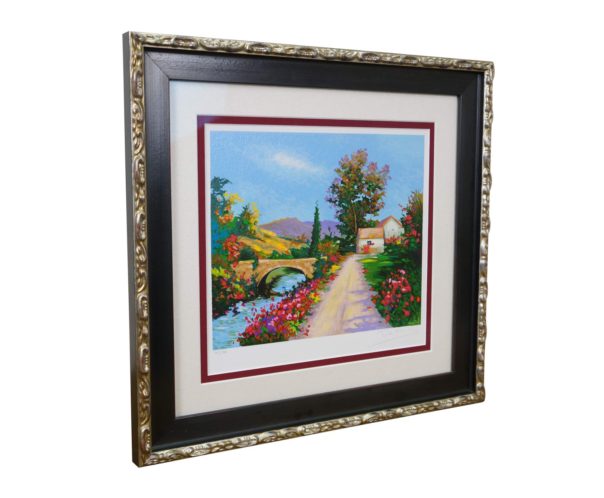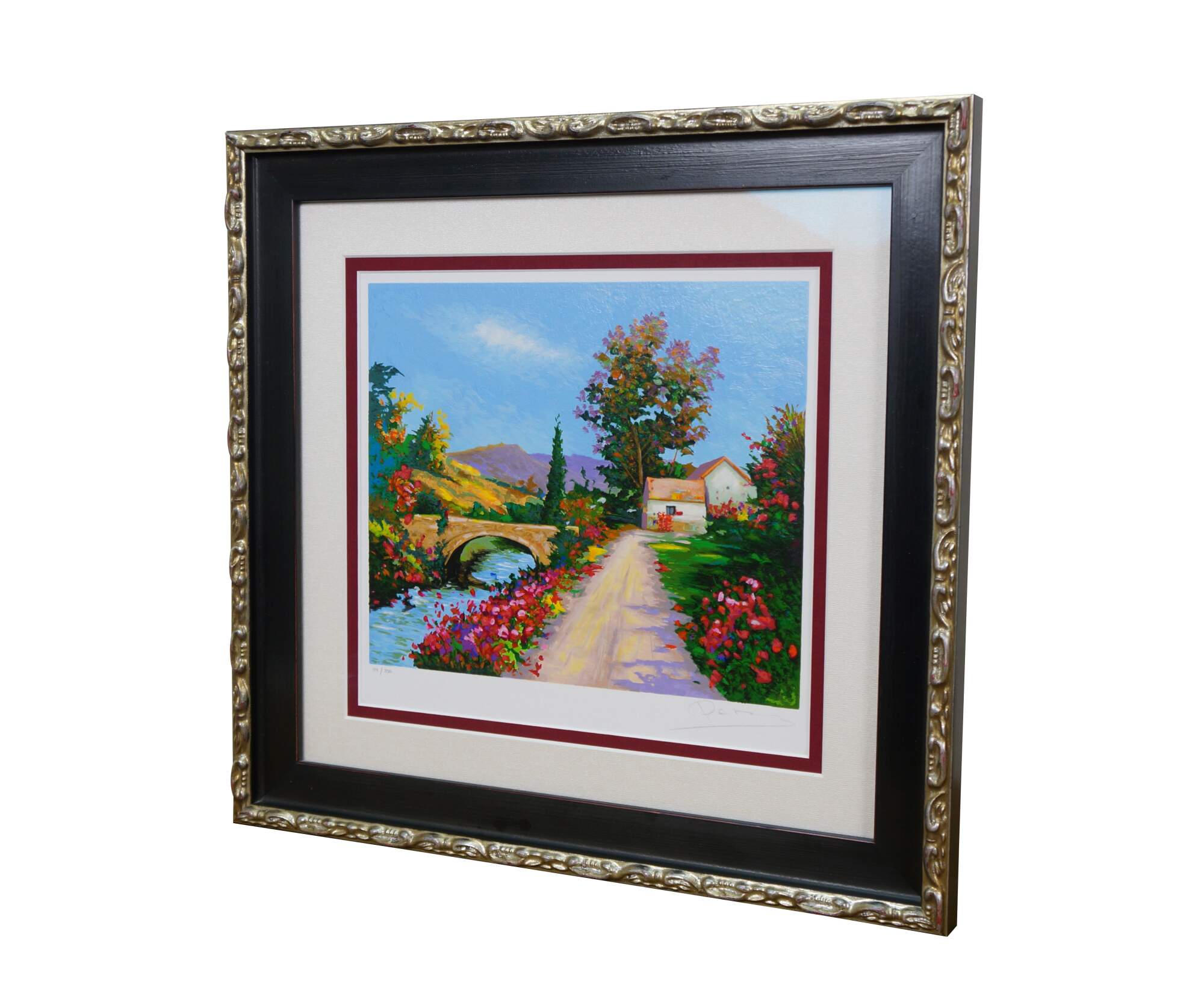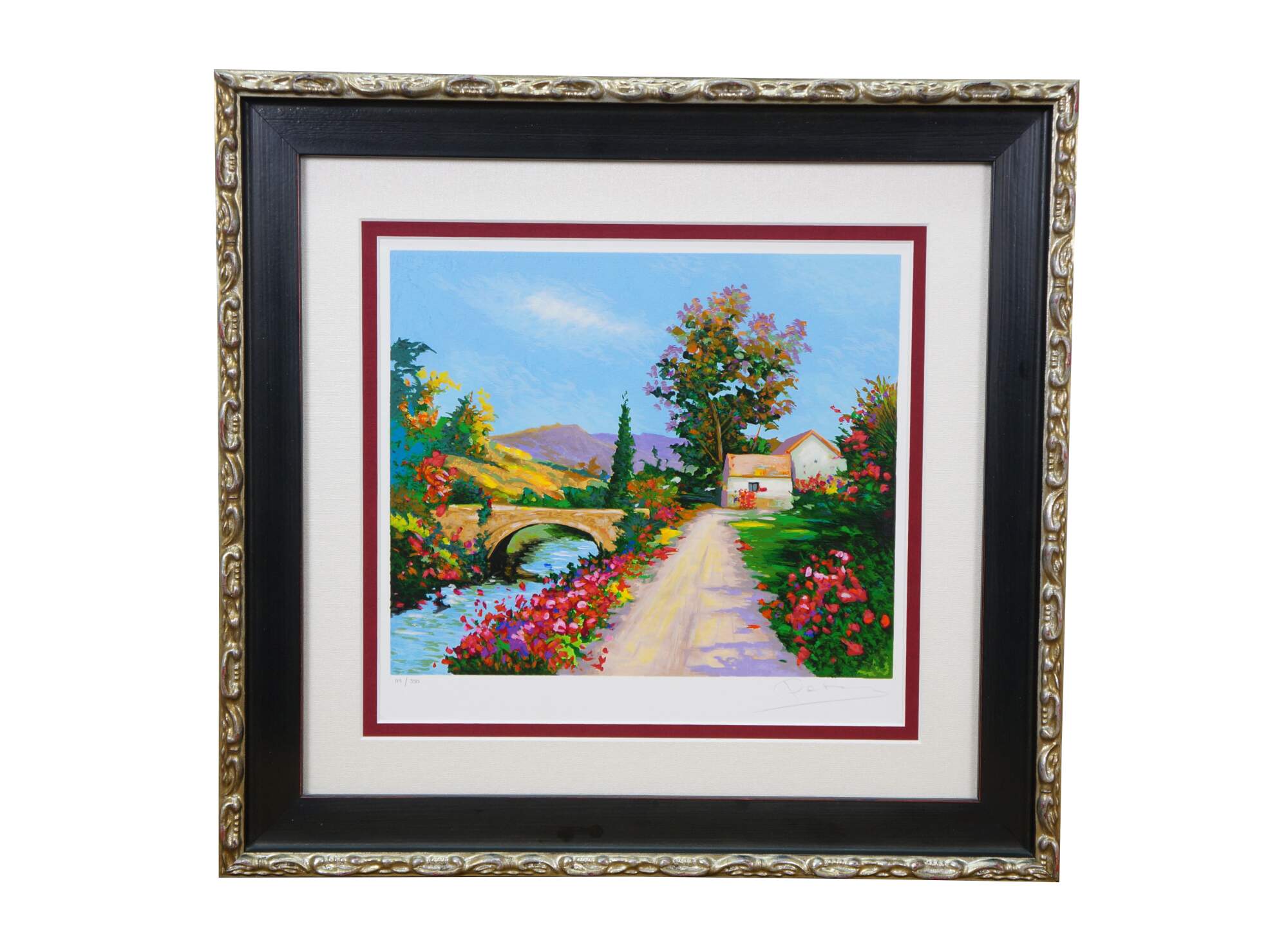 2004 limited edition serigraph on paper titled "The Bridge to Her Old Town" by Alex Perez. Impressionist landscape of a bright country road along a canal or river, with a stone bridge, red roofed cottage and mountains in the background. Pencil signed, lower right. Numbered 119/350, lower left. Black beveled wood frame with gilt foliate edge; white and red layered mat. Includes Certificate of Authenticity.