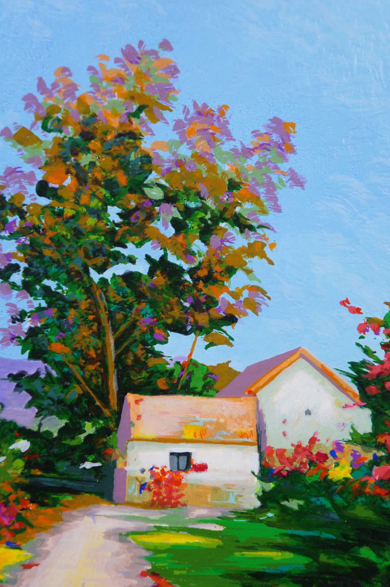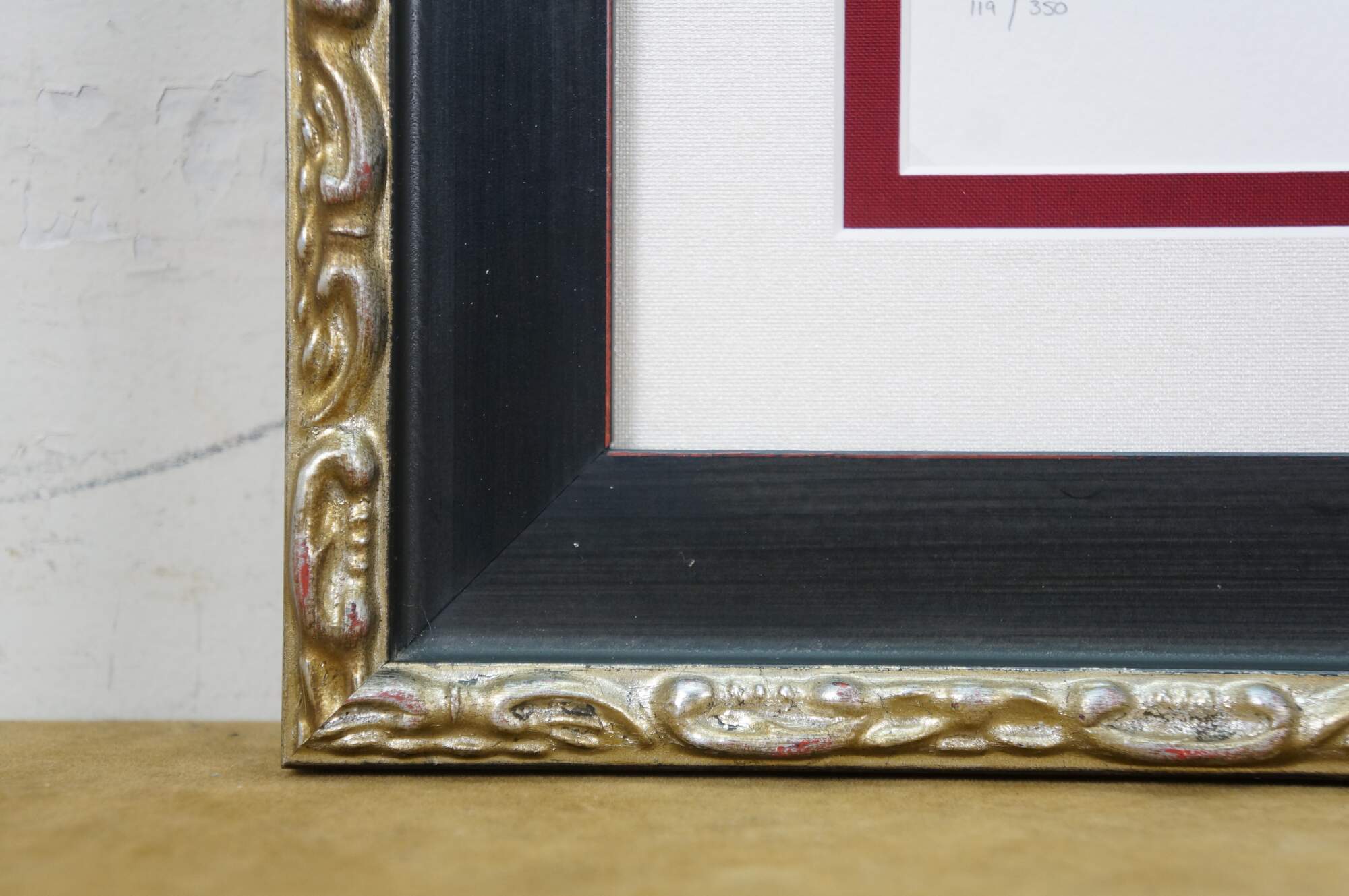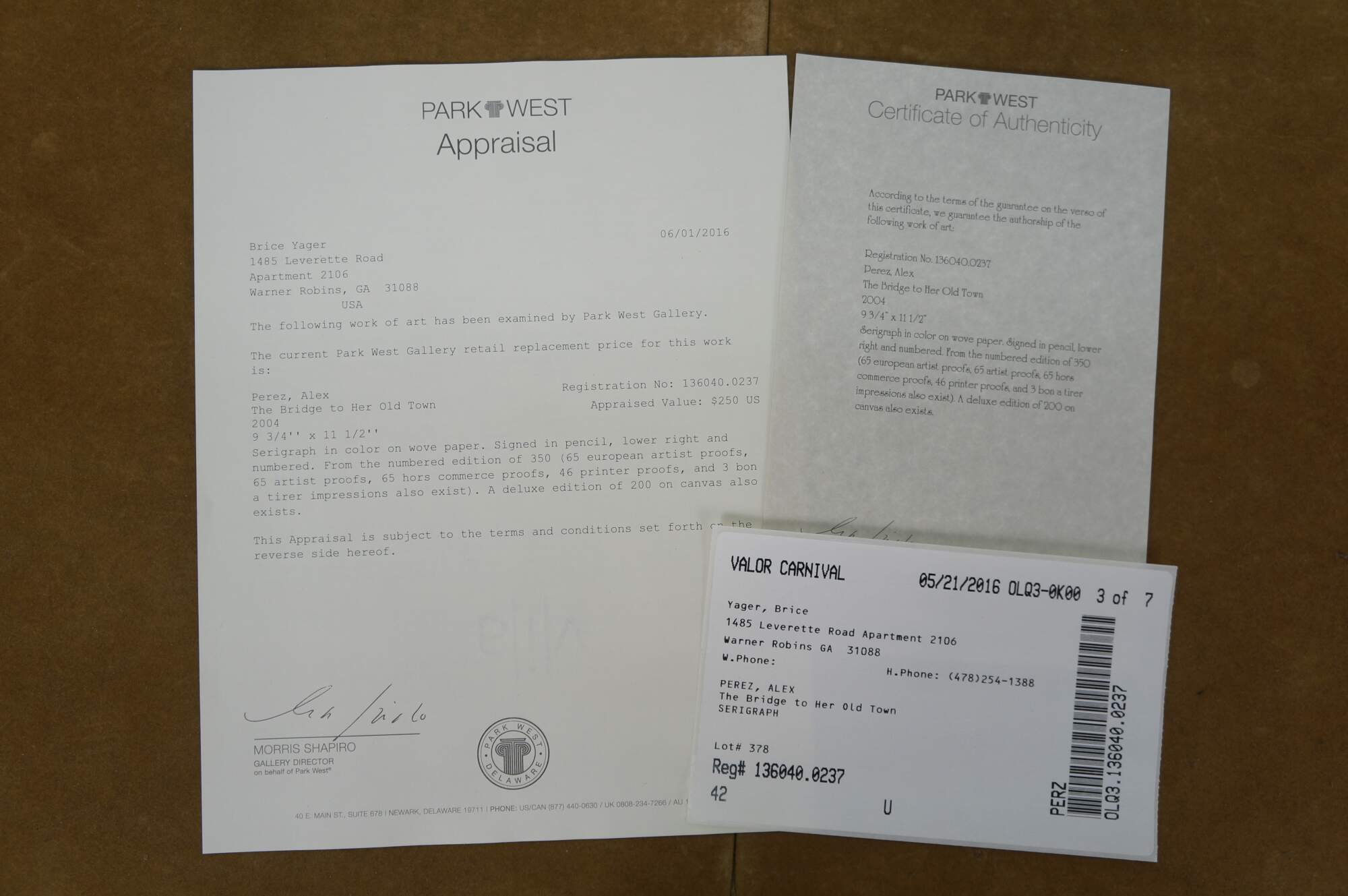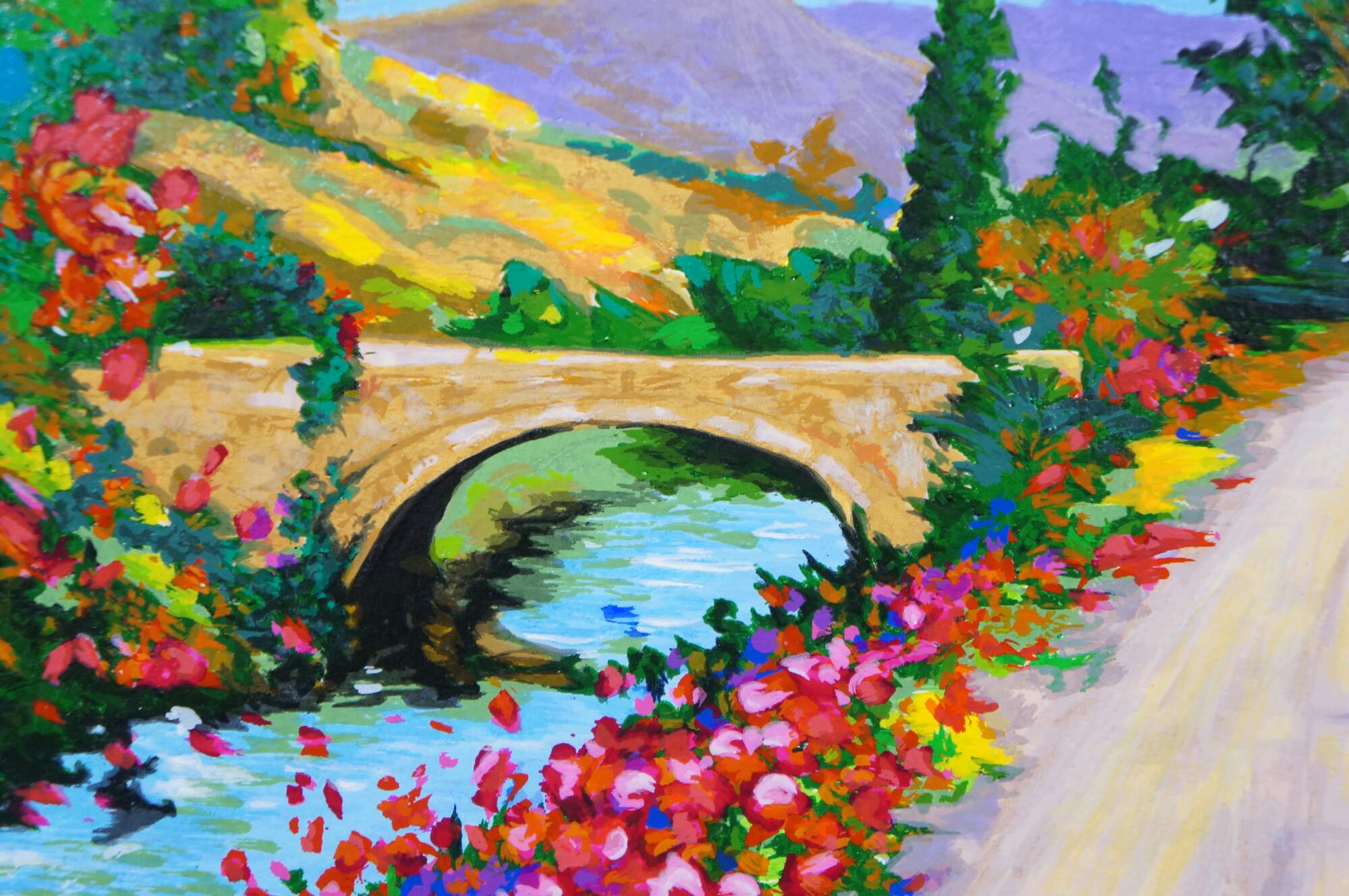 2004 limited edition serigraph on paper titled "The Bridge to Her Old Town" by Alex Perez. Impressionist landscape of a bright country road along a canal or river, with a stone bridge, red roofed cottage and mountains in the background. Pencil signed, lower right. Numbered 119/350, lower left. Black beveled wood frame with gilt foliate edge; white and red layered mat. Includes Certificate of Authenticity.