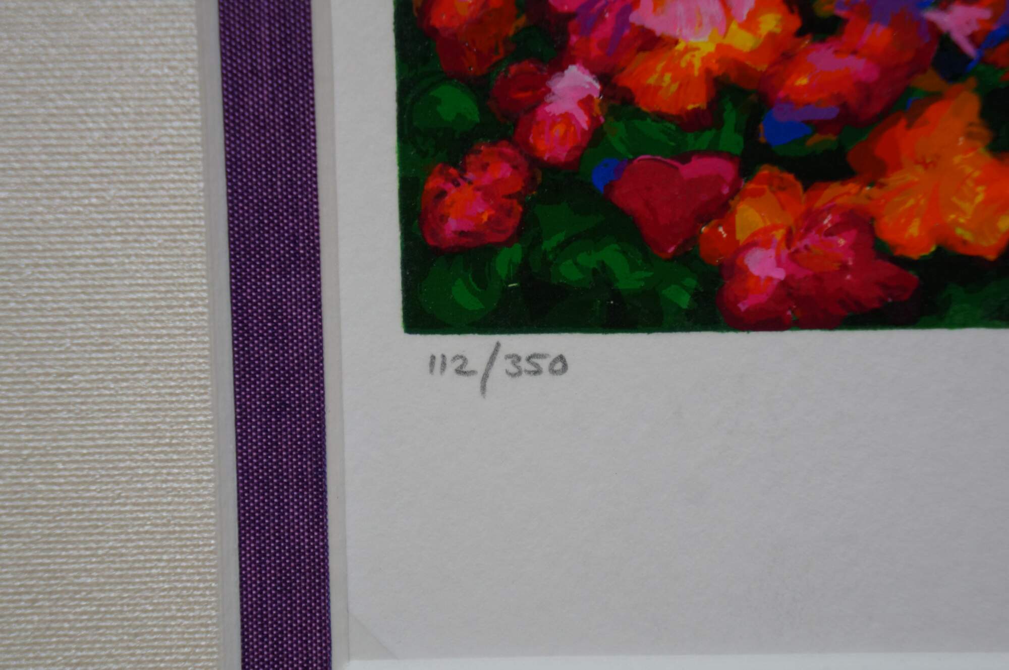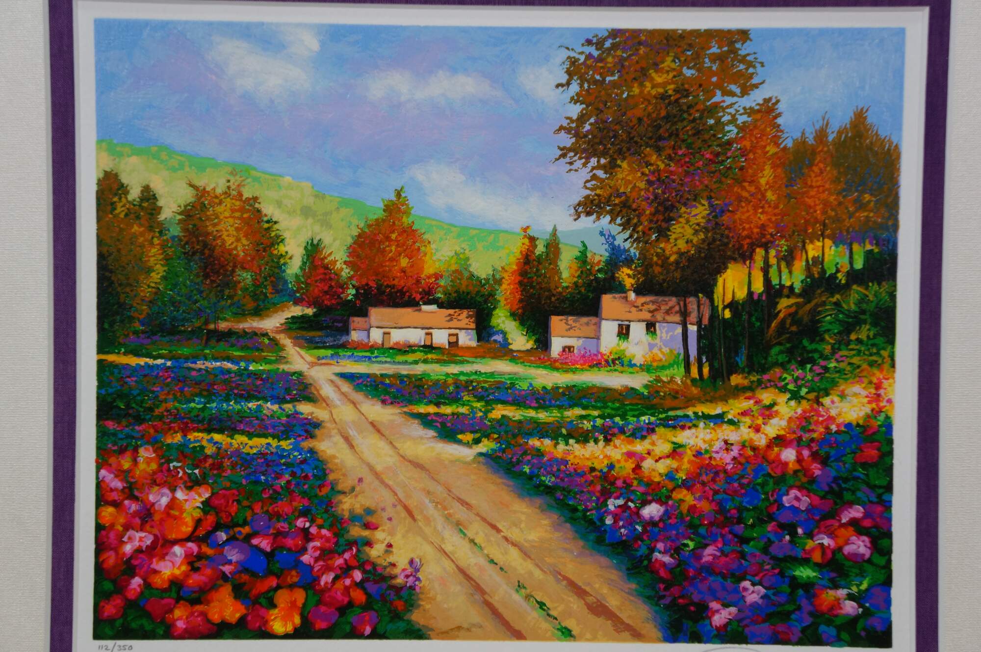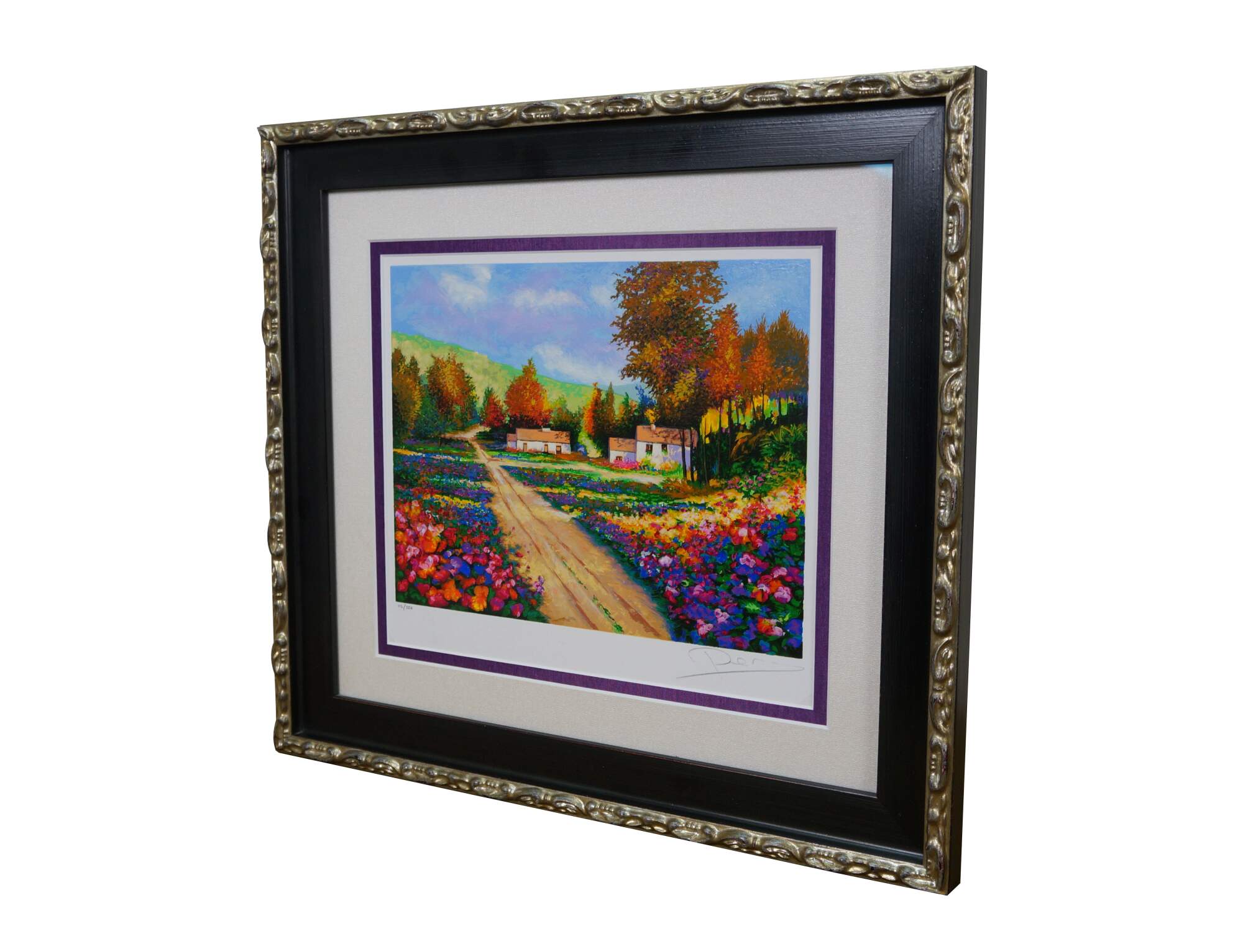 2004 limited edition serigraph on paper titled "End of the Road" by Alex Perez. An impressionist style country road lined with carpets of brightly colored flowers and cluster of red roofed cottages. Pencil signed, lower right. Numbered 112/350, lower left. Black beveled wood frame with gilt foliate edge; white and purple layered mat. Includes Certificate of Authenticity.