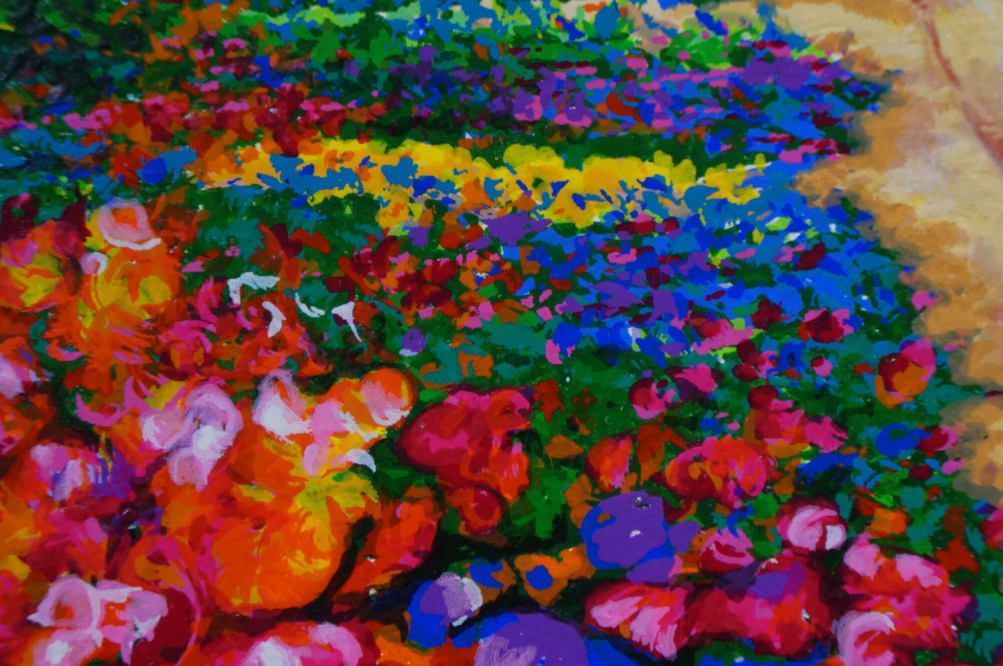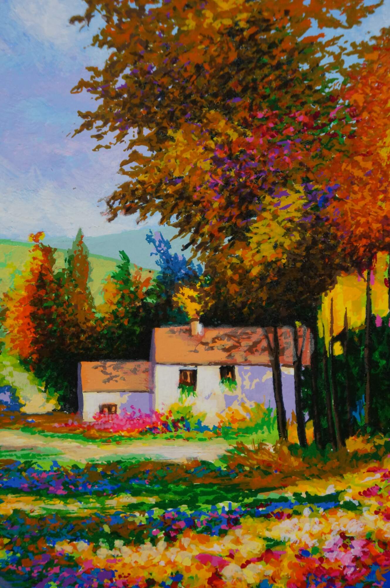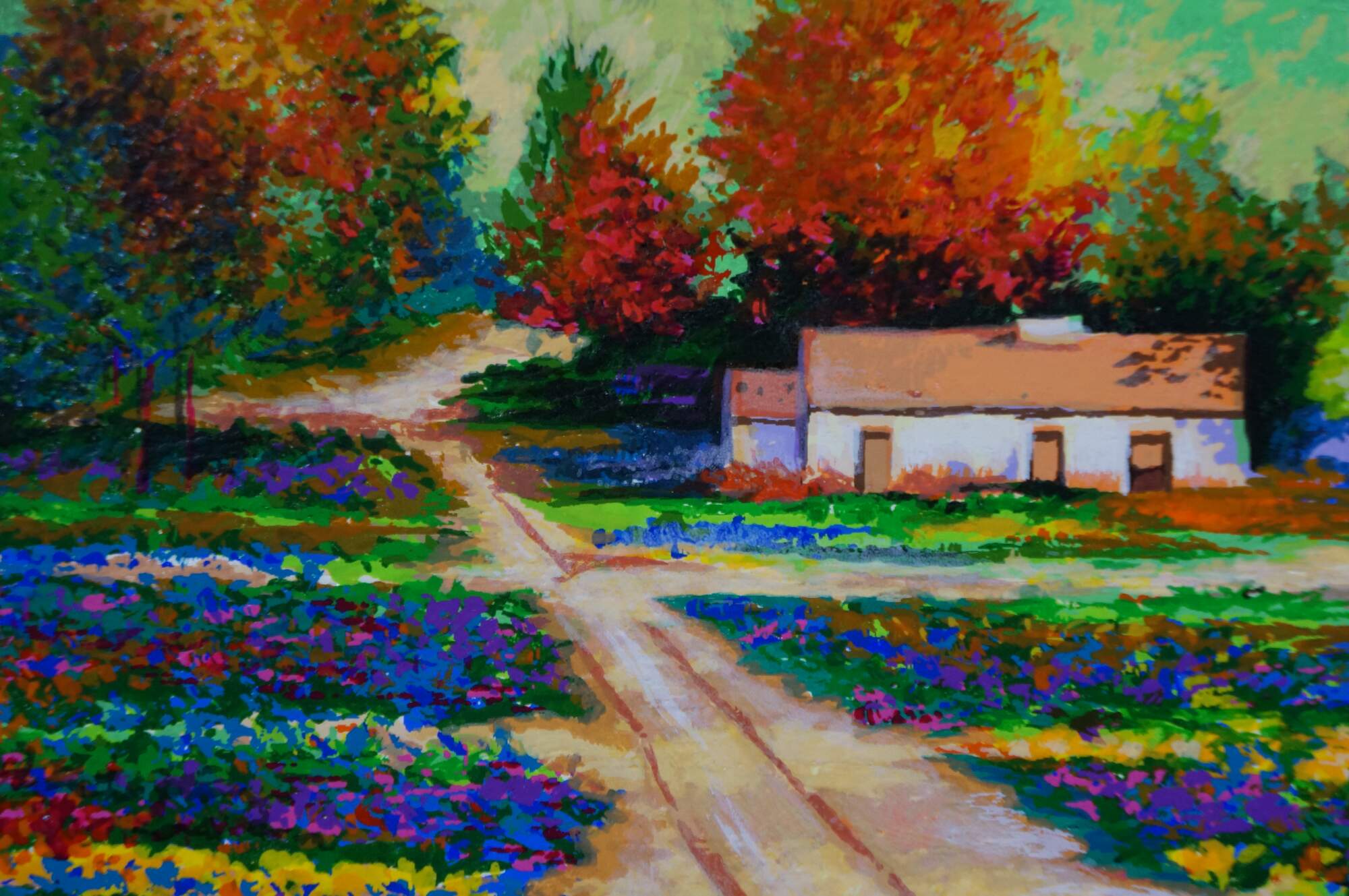 2004 limited edition serigraph on paper titled "End of the Road" by Alex Perez. An impressionist style country road lined with carpets of brightly colored flowers and cluster of red roofed cottages. Pencil signed, lower right. Numbered 112/350, lower left. Black beveled wood frame with gilt foliate edge; white and purple layered mat. Includes Certificate of Authenticity.