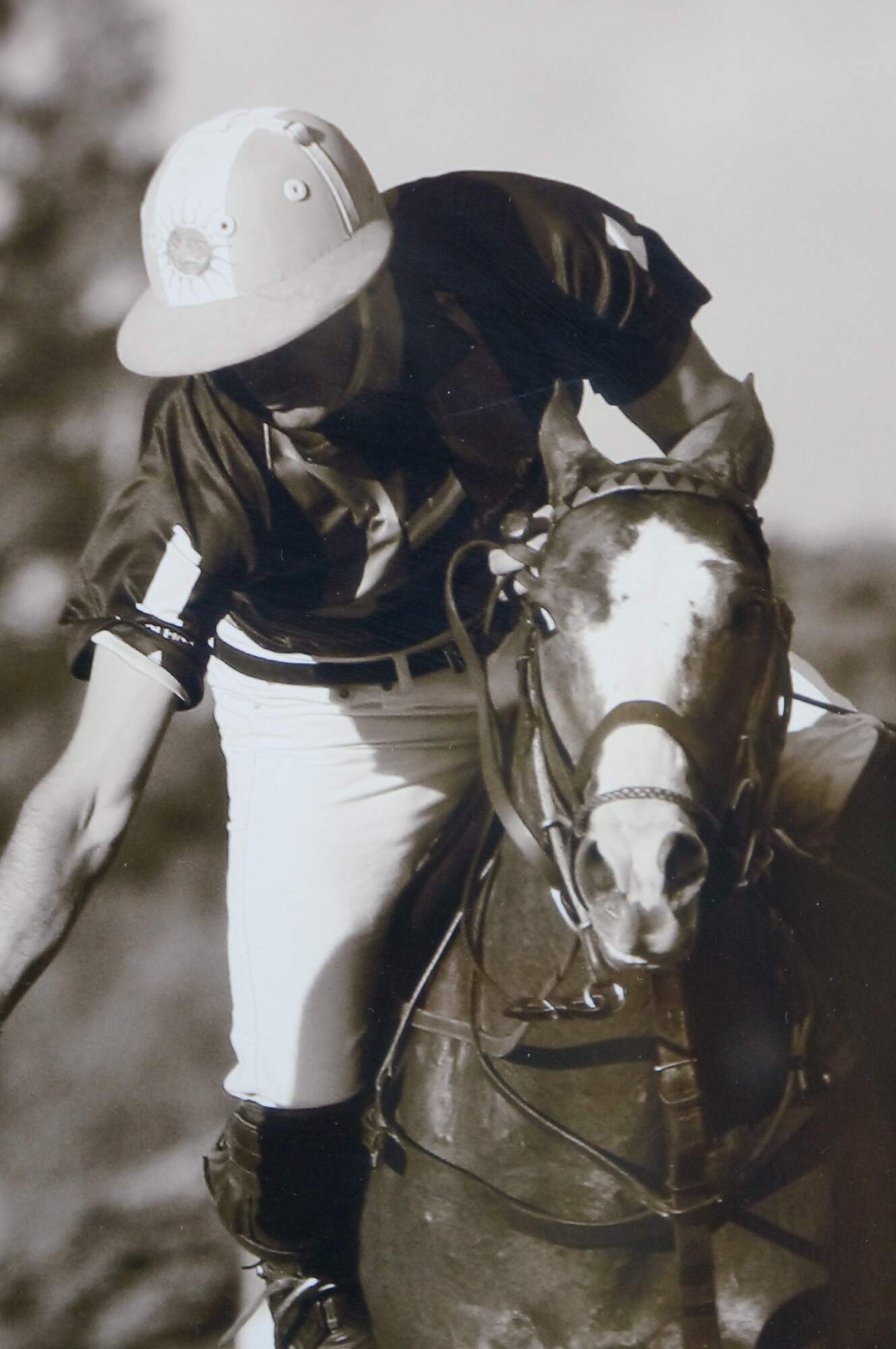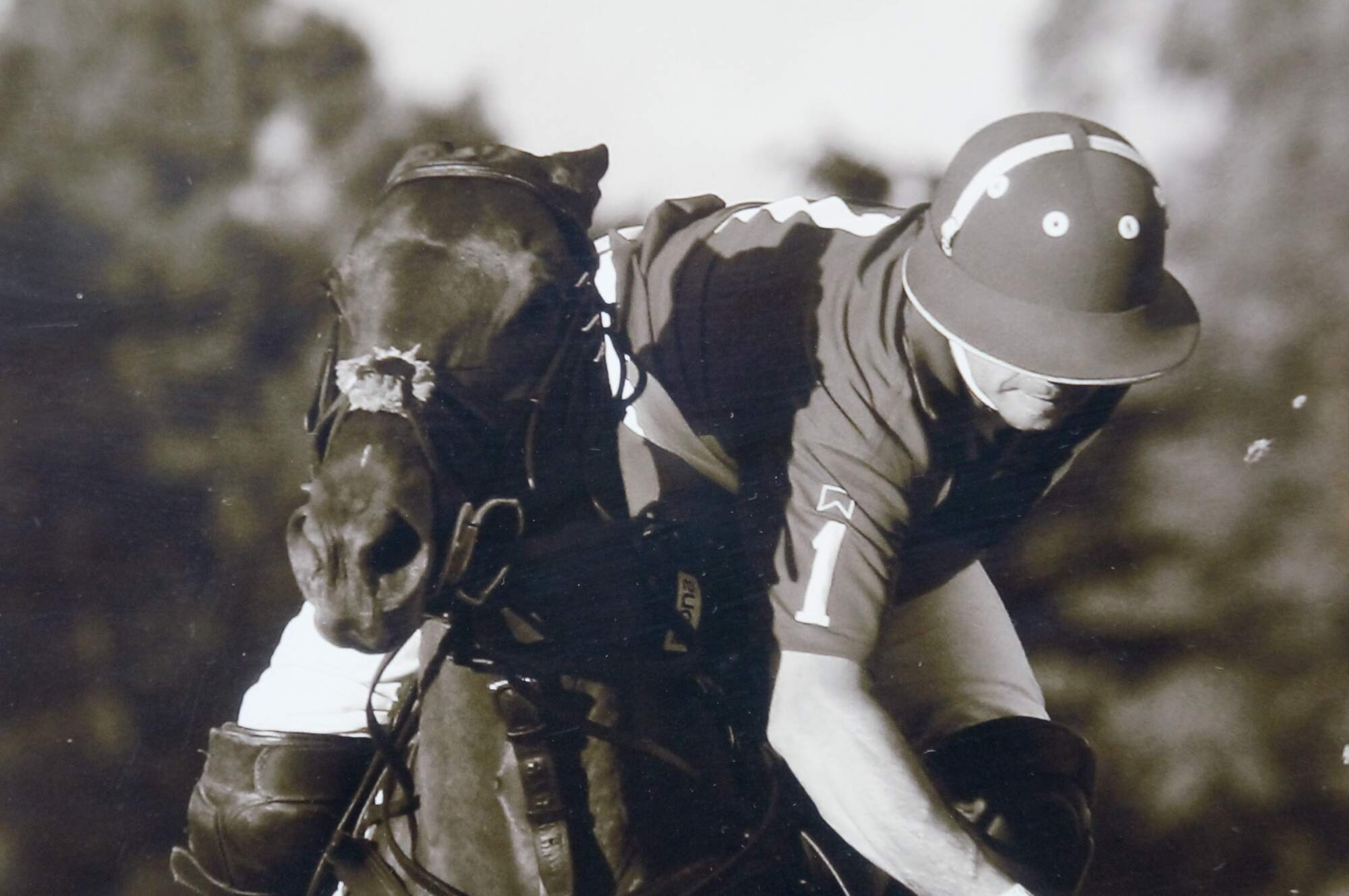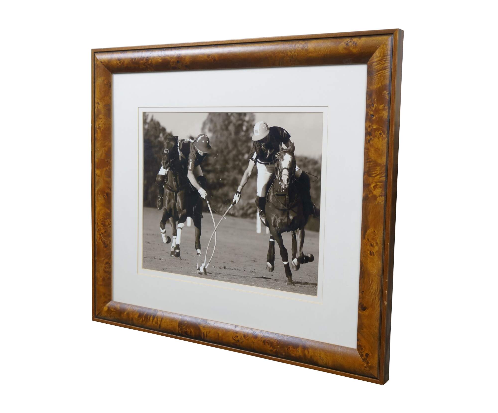 Vintage 20th century sepia photograph showing a pair of polo players on horses. Burl wood frame by Trowbridge; white mat.