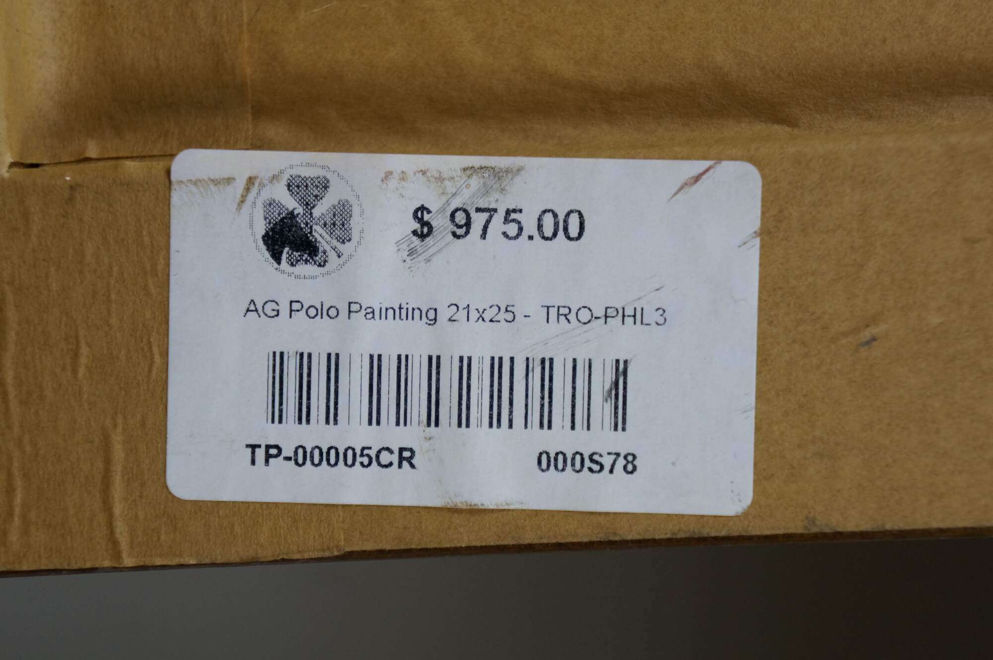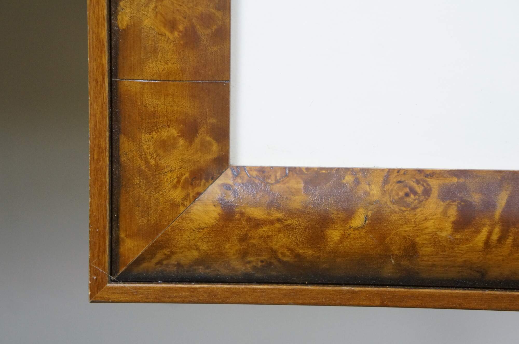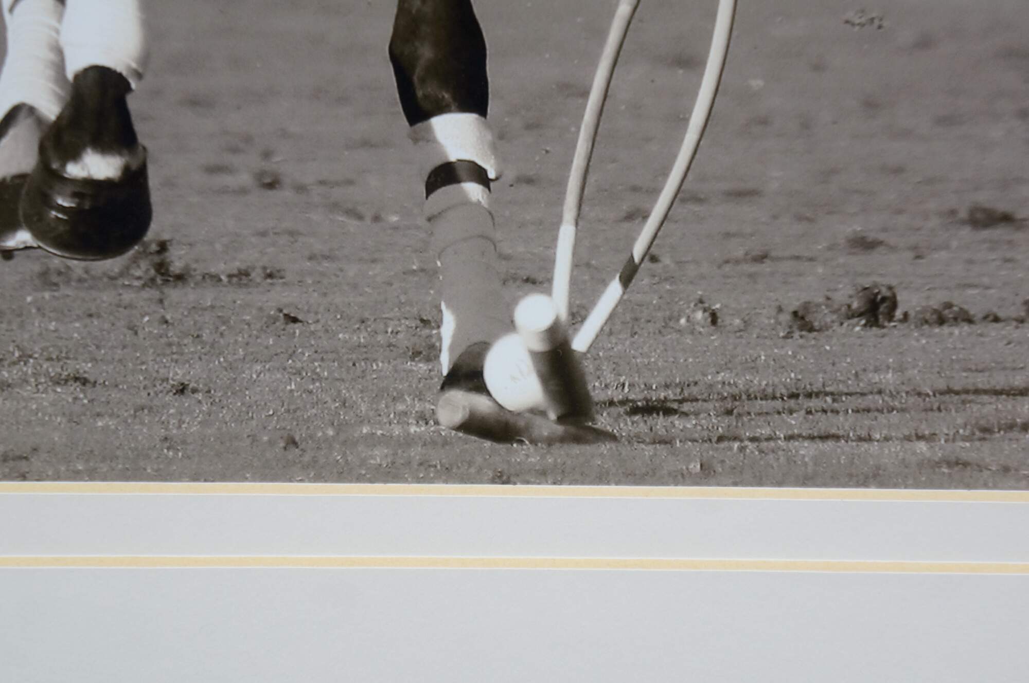 Vintage 20th century sepia photograph showing a pair of polo players on horses. Burl wood frame by Trowbridge; white mat.