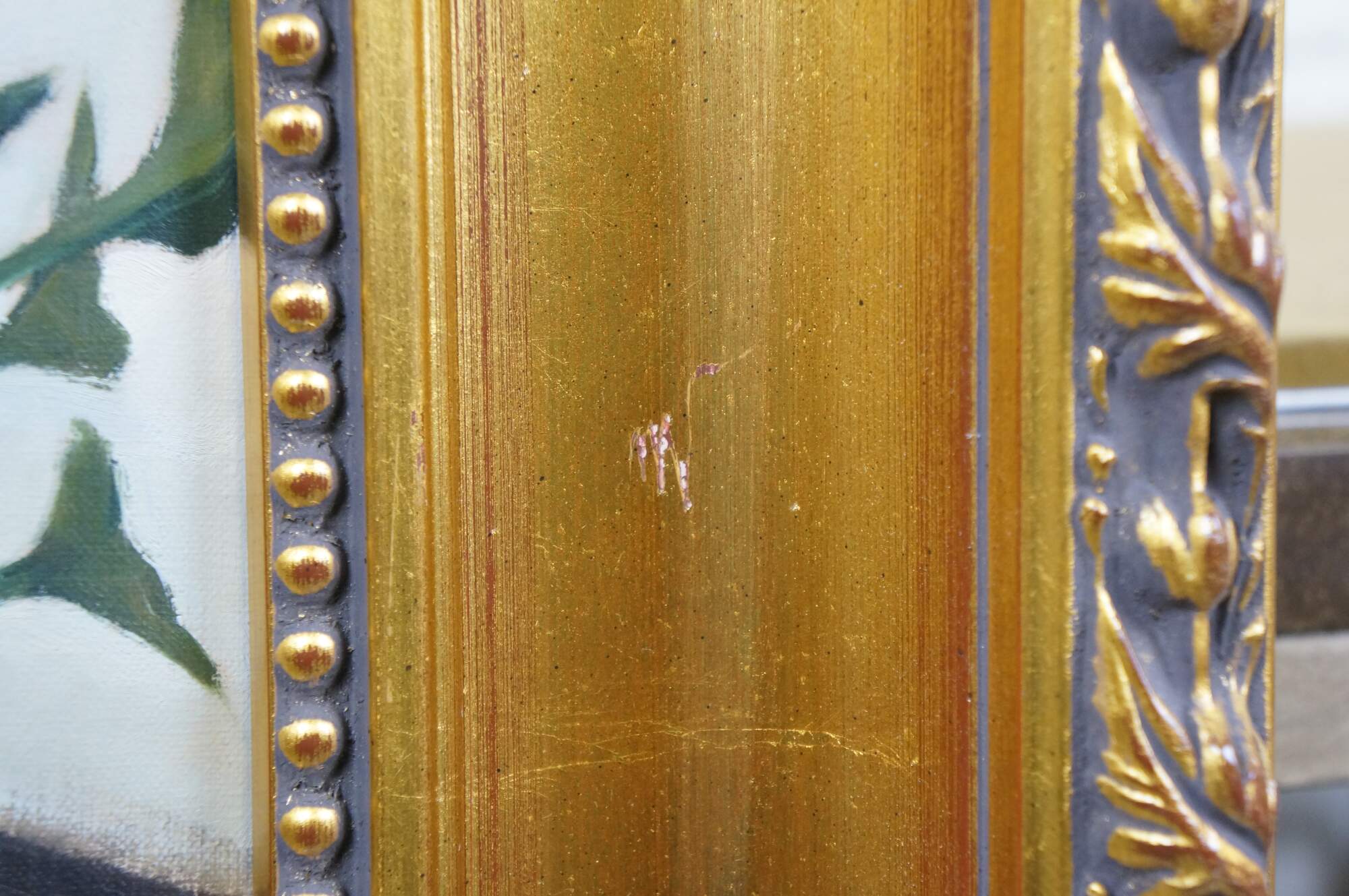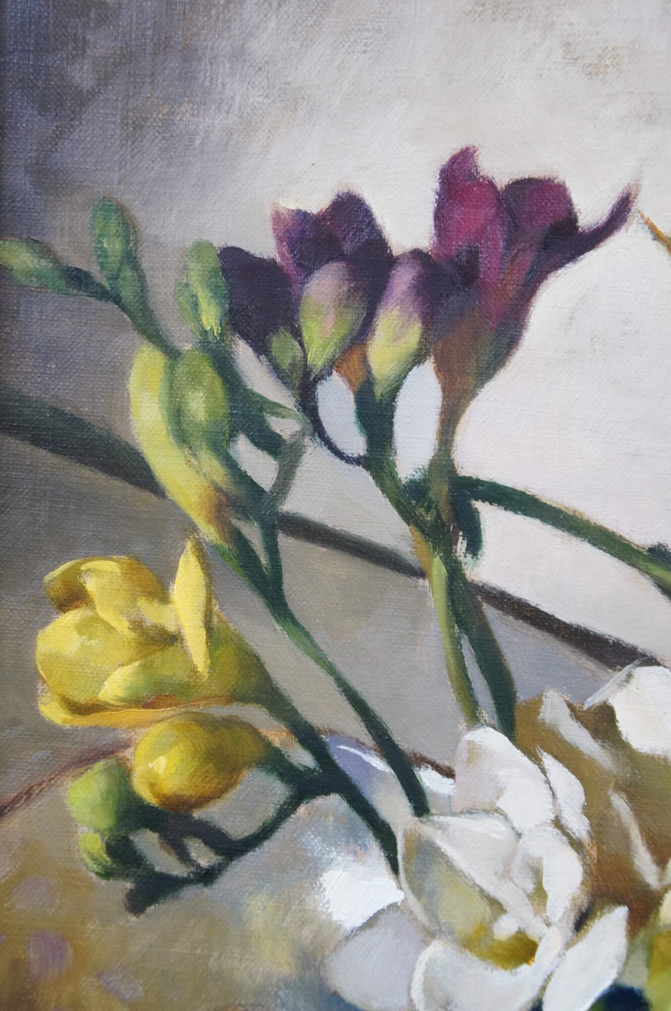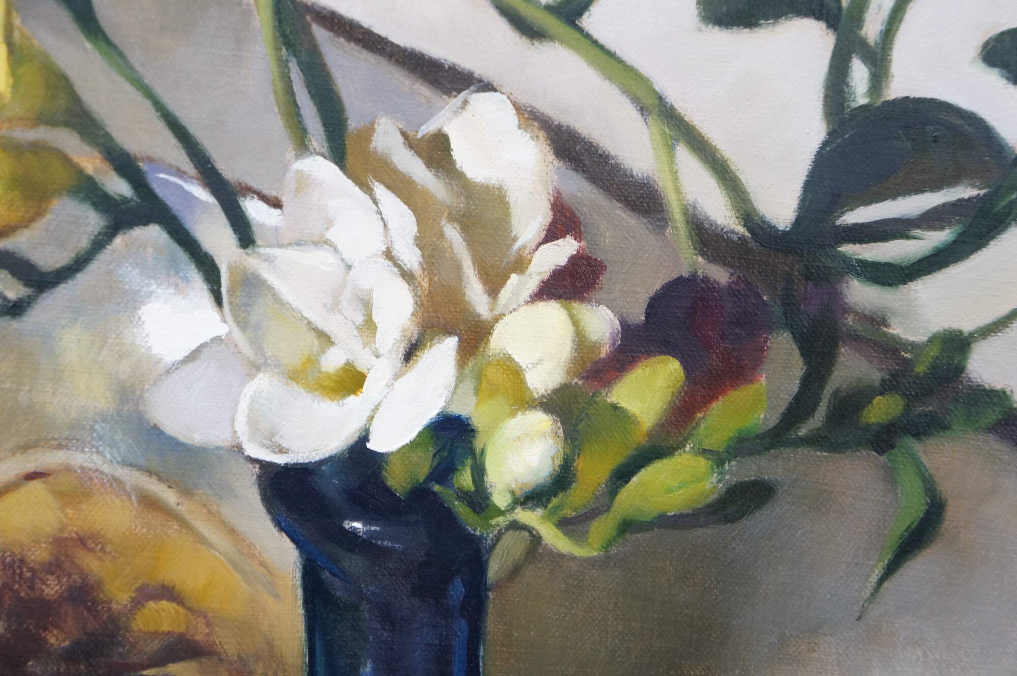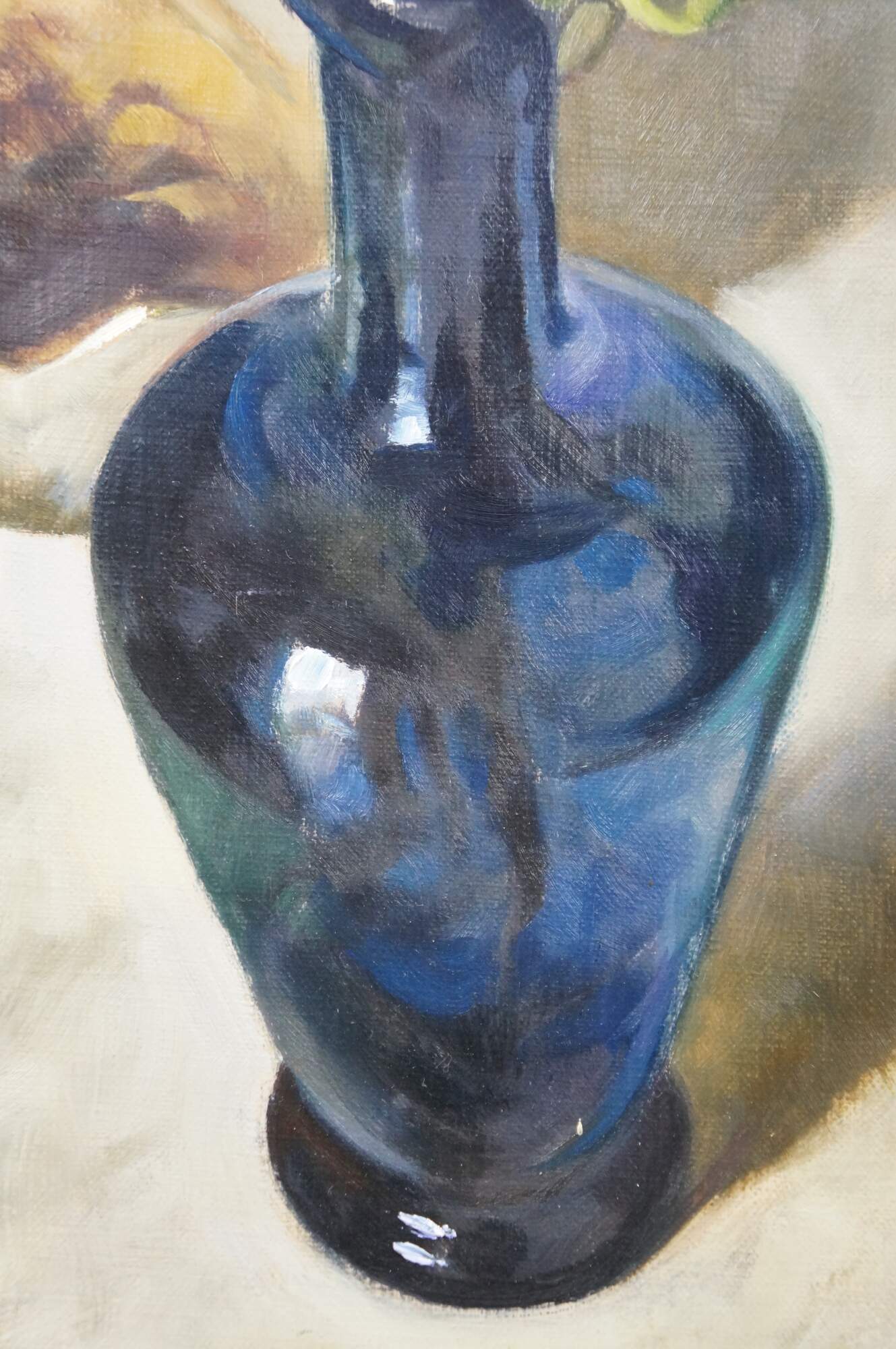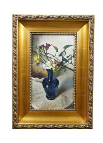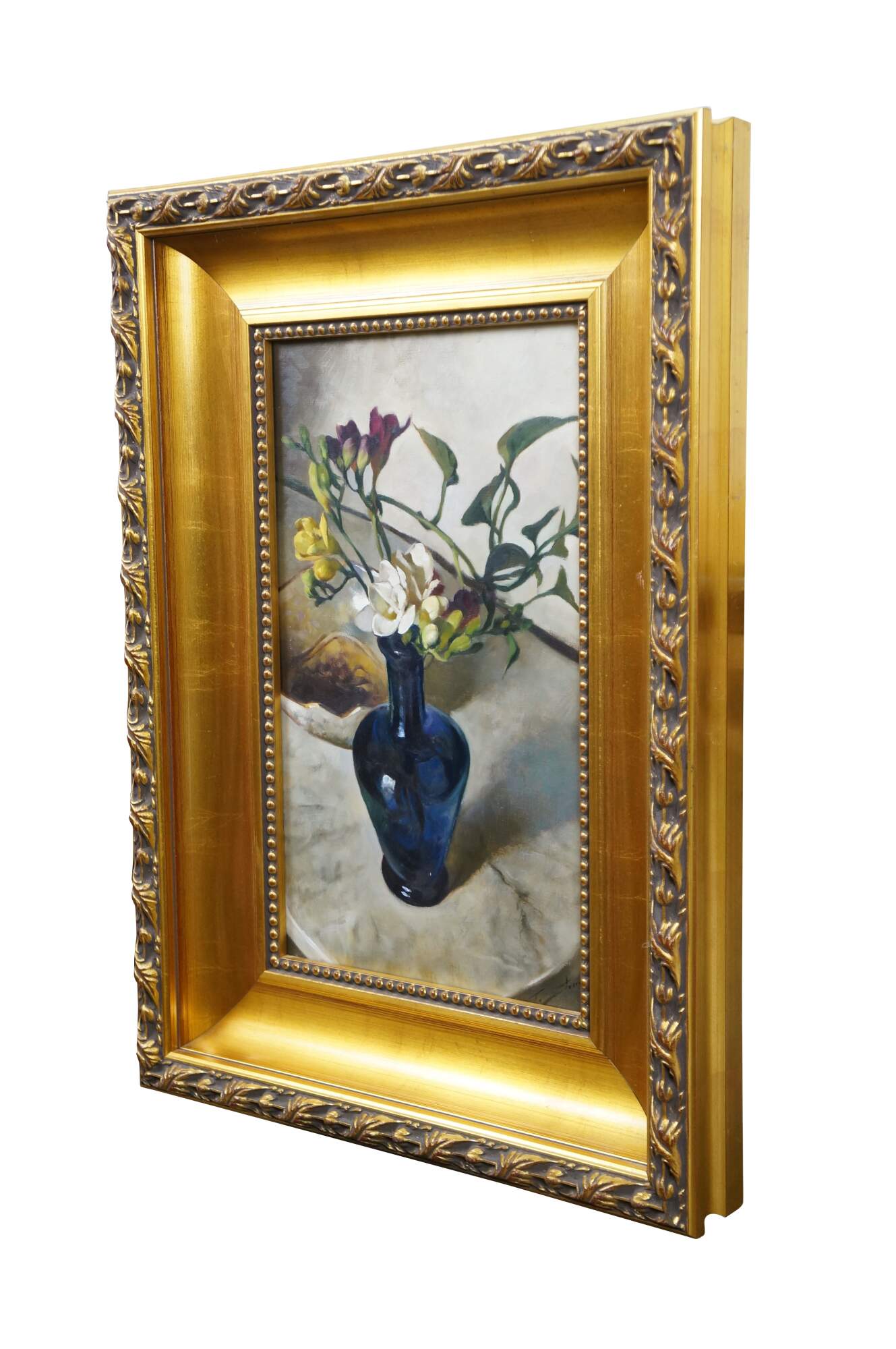 Late 20th century oil on canvas still life painting titled "Vasetto con Fioria (Vase with Flowers)" by Gianni Strino. Depicts a blue glass vase yellow, white, and purple flowers, viewed from above on a white marble table. Signed, lower right corner. Beveled gilt composite frame with beaded inner edge and foliate border. Includes Certificate of Authenticity.