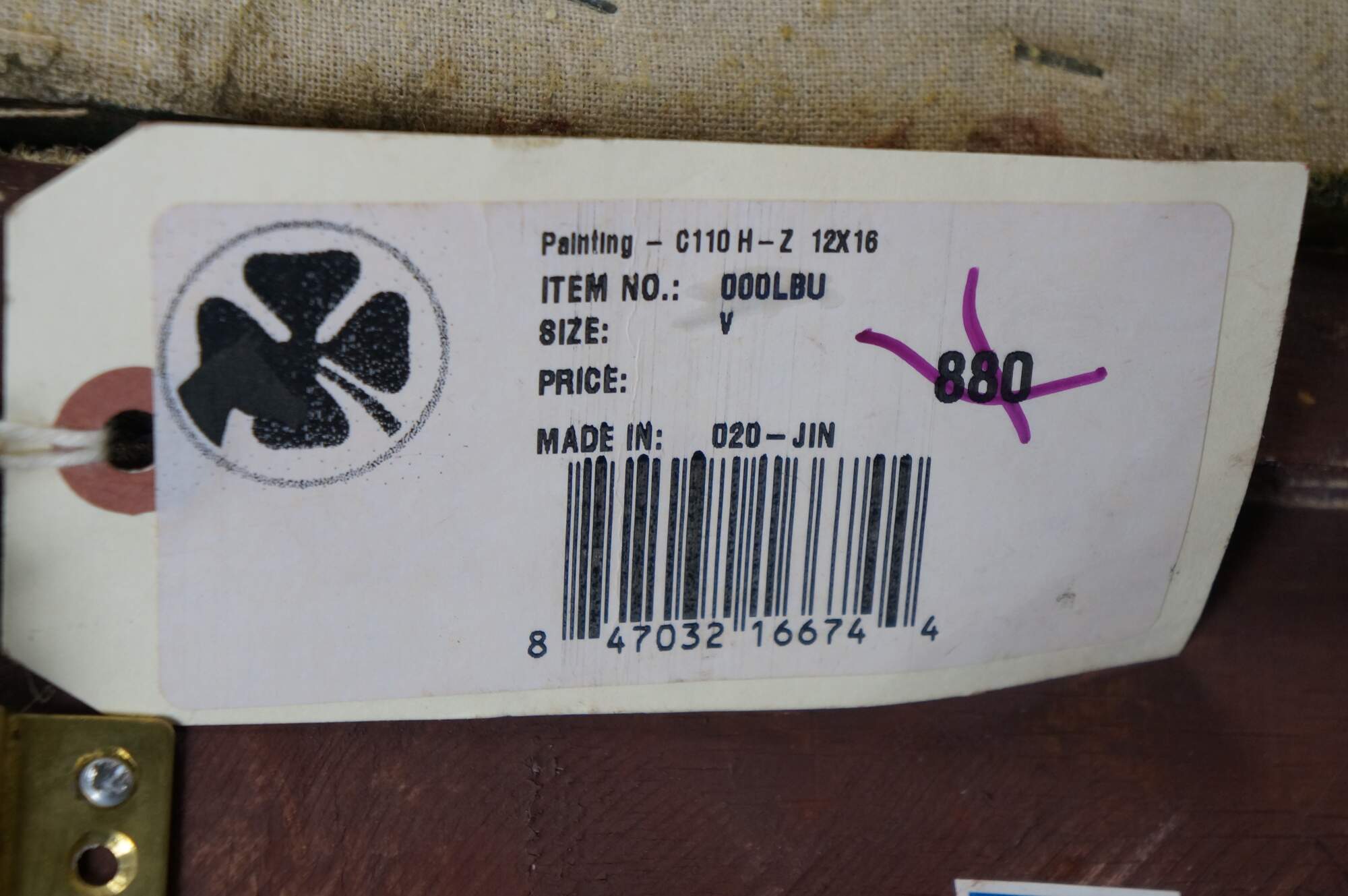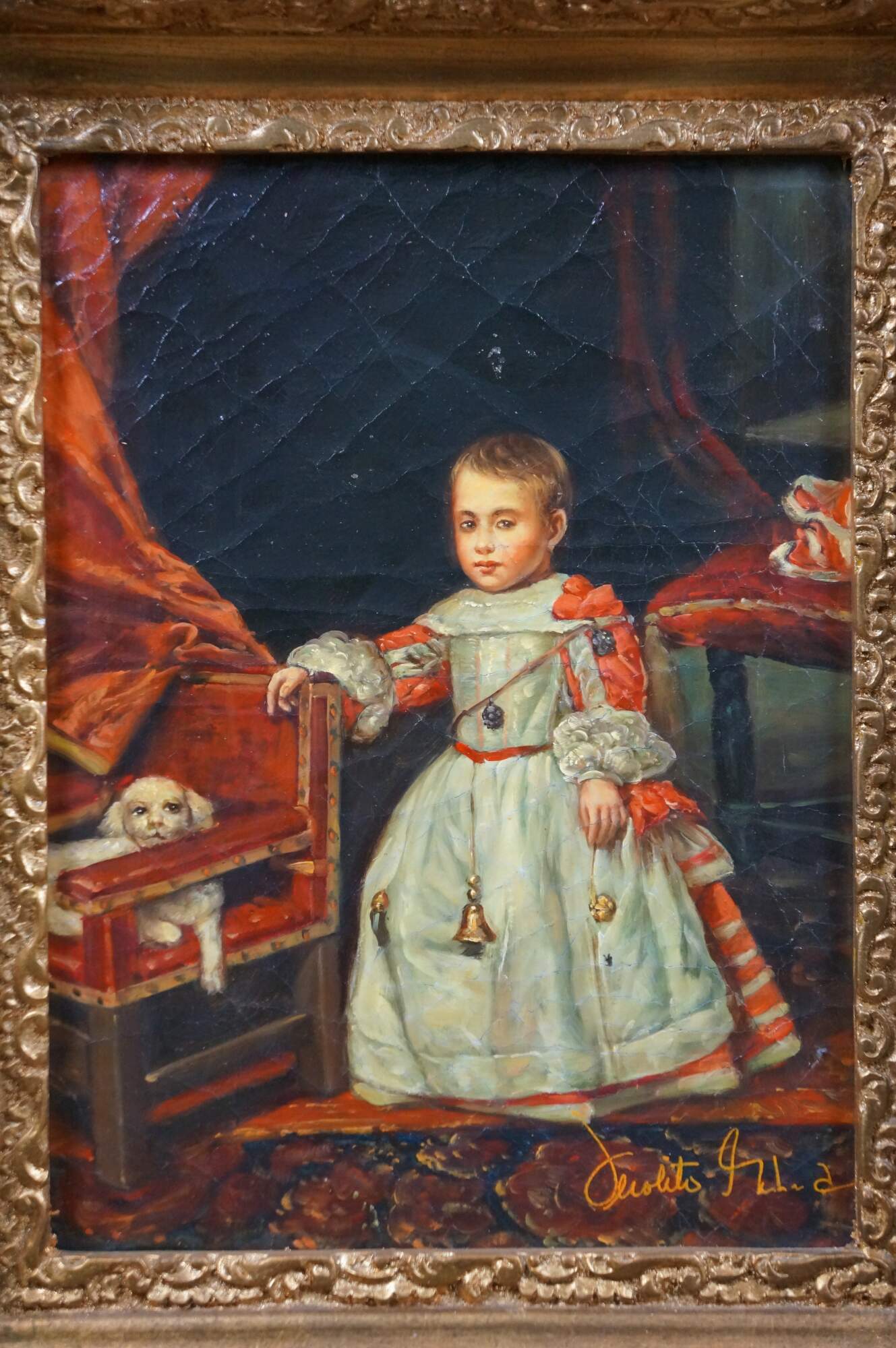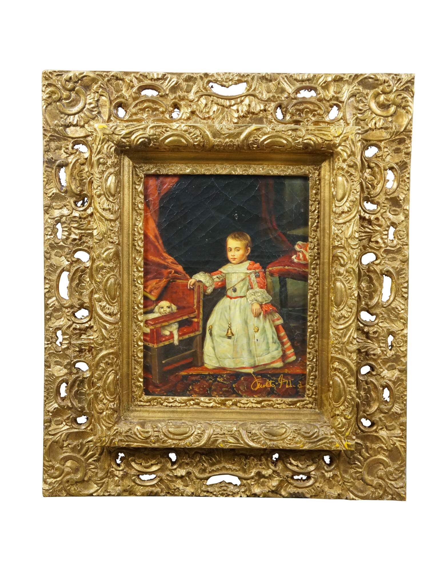 Late 20th century oil on canvas portrait painting after a work depicting the infant Prince Philip Prospero, originally painted in 1659 by Diego Velazquez. "The painting depicts Philip Prospero, Prince of Asturias (Madrid, November 20, 1657 - Madrid, November 1, 1661), the short lived heir to the Spanish crown, who died aged only 3 years old. He was the third son and the first from the marriage of Philip IV of Spain and Mariana of Austria. In this portrait, the child is standing, he wears a dress typical of toddlers, while he rests his right arm on an armchair, which seems to grant him more compassion than majesty, since his health was precarious as evidenced by the amulets that he carries. On the chair, at the left, there is a lapdog, whose watery look accentuates the melancholy of the scene. The subject of the painting is located in a room, and in the background there is an open door through which light enters. To the right there is a stool with a cushion on which a hat is placed. Red tones predominate in the work and the dark tones of the background increase the contrast between the colors." (Wikipedia) Signed, lower right. Heavy, ornate, gilt foliate composite frame.