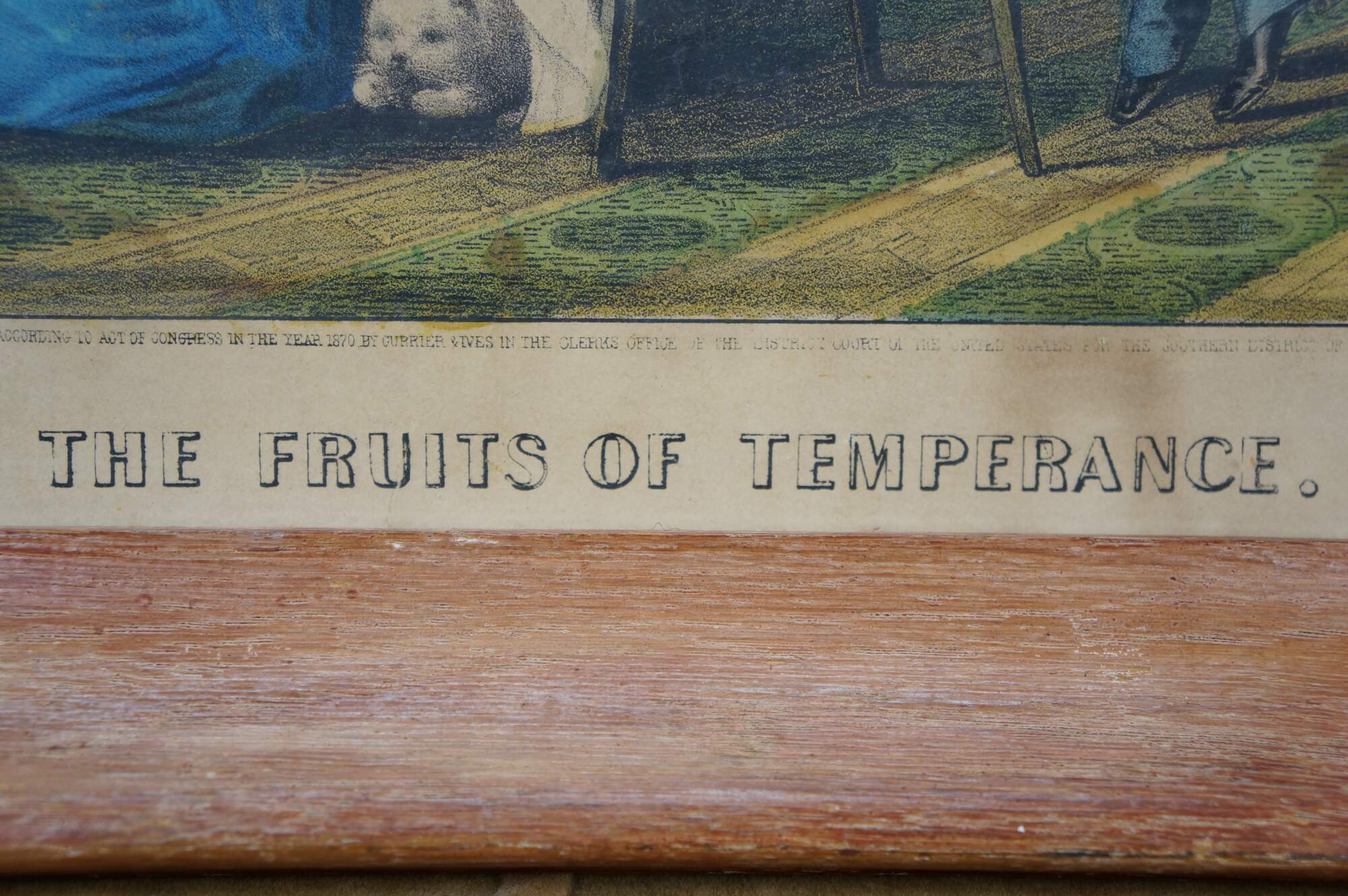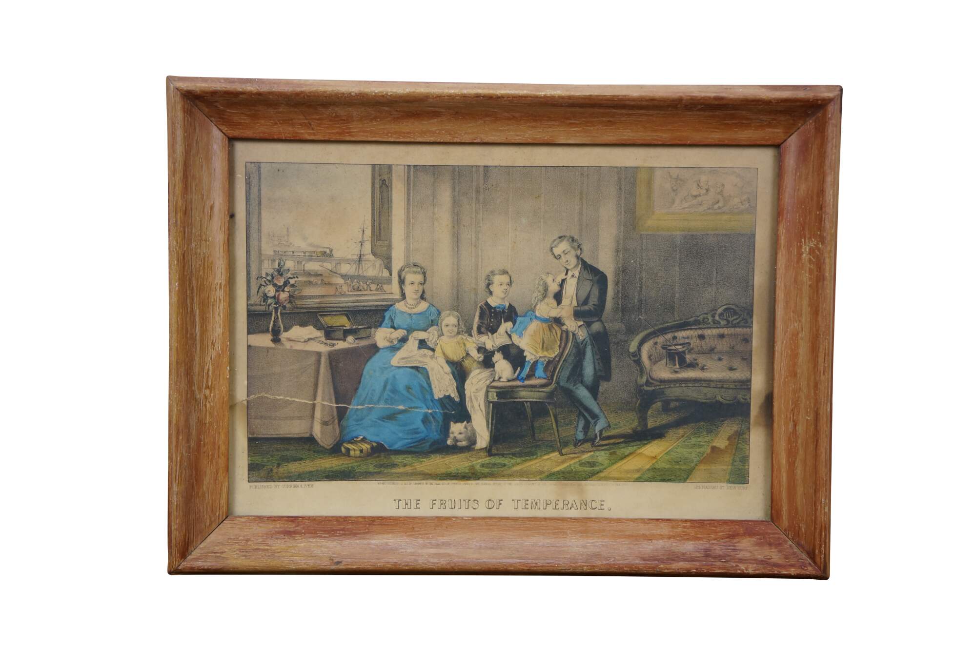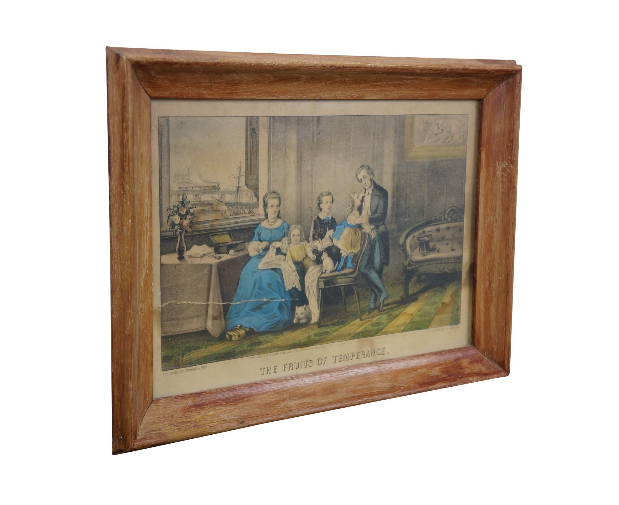 Late 19th century hand colored llithograph print titled "The Fruits of Temperance," published by Currier & Ives "Family (Husband, wife, three children) with a dog and cat sitting in a living room/parlor next to a window with a scene outside of a train crossing over a bridge and a ship in the water. Currier & Ives produced a series of prints that encouraged pious living and moderation. In this work, which celebrates the positive effects of temperance, a wealthy family is shown together in their comfortable home. This image, a companion to The Fruits of Intemperance, was also published under the name The Good Husband." (Springfield Museums) Entered According to Act of Congress in the Year 1870 by currier & Ives in the Clerks Office of the District Court of the united States for the Southern district of New York. Beveled wood frame.
