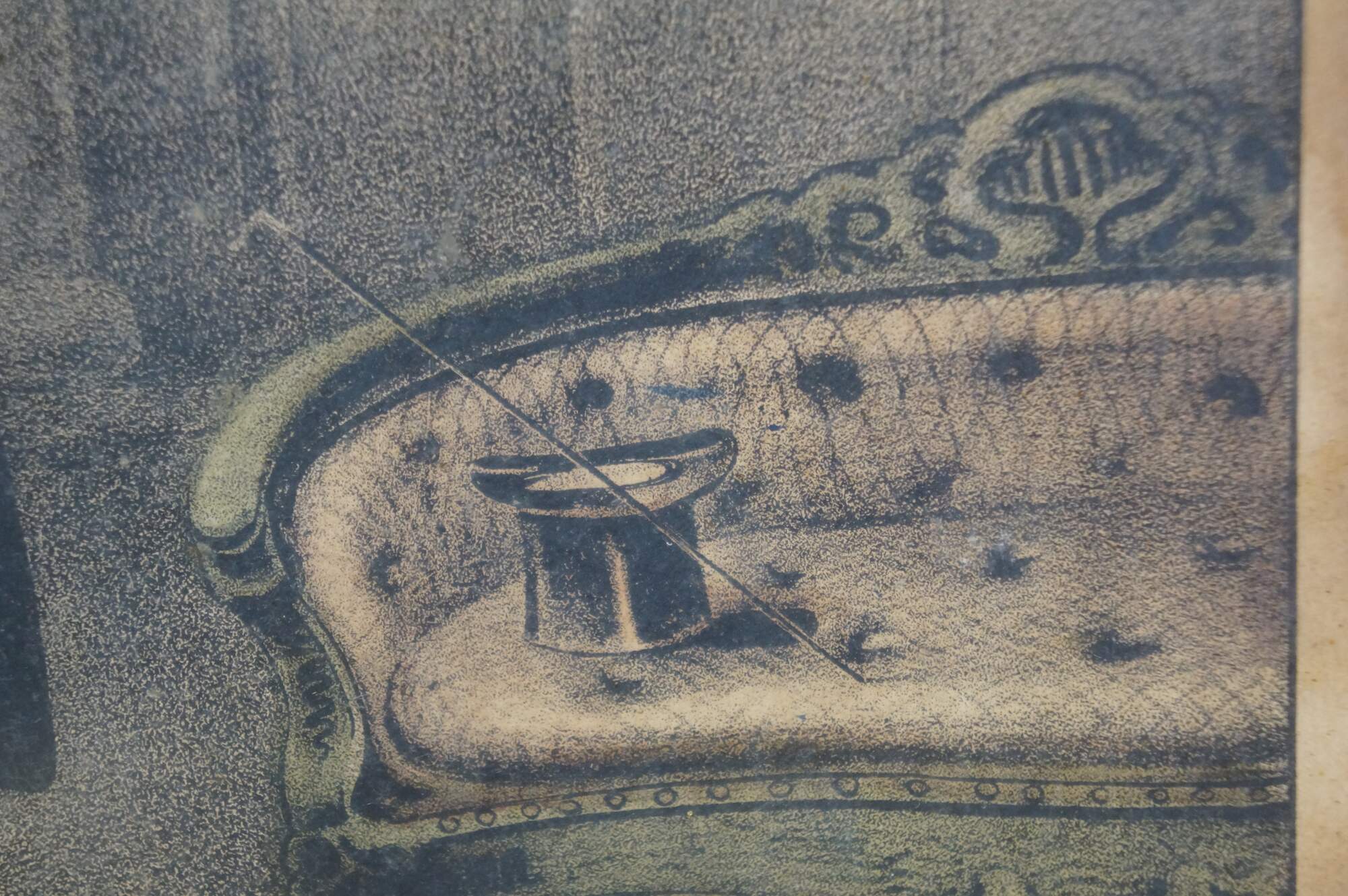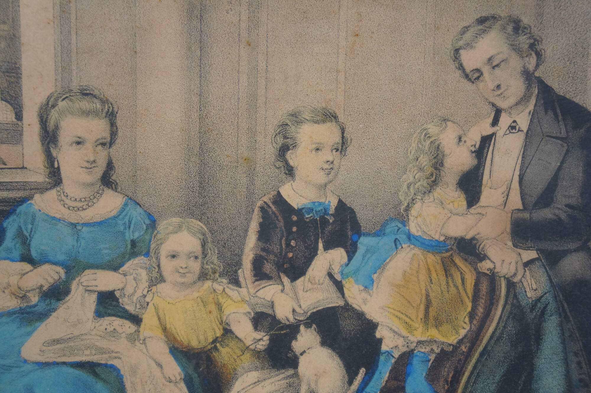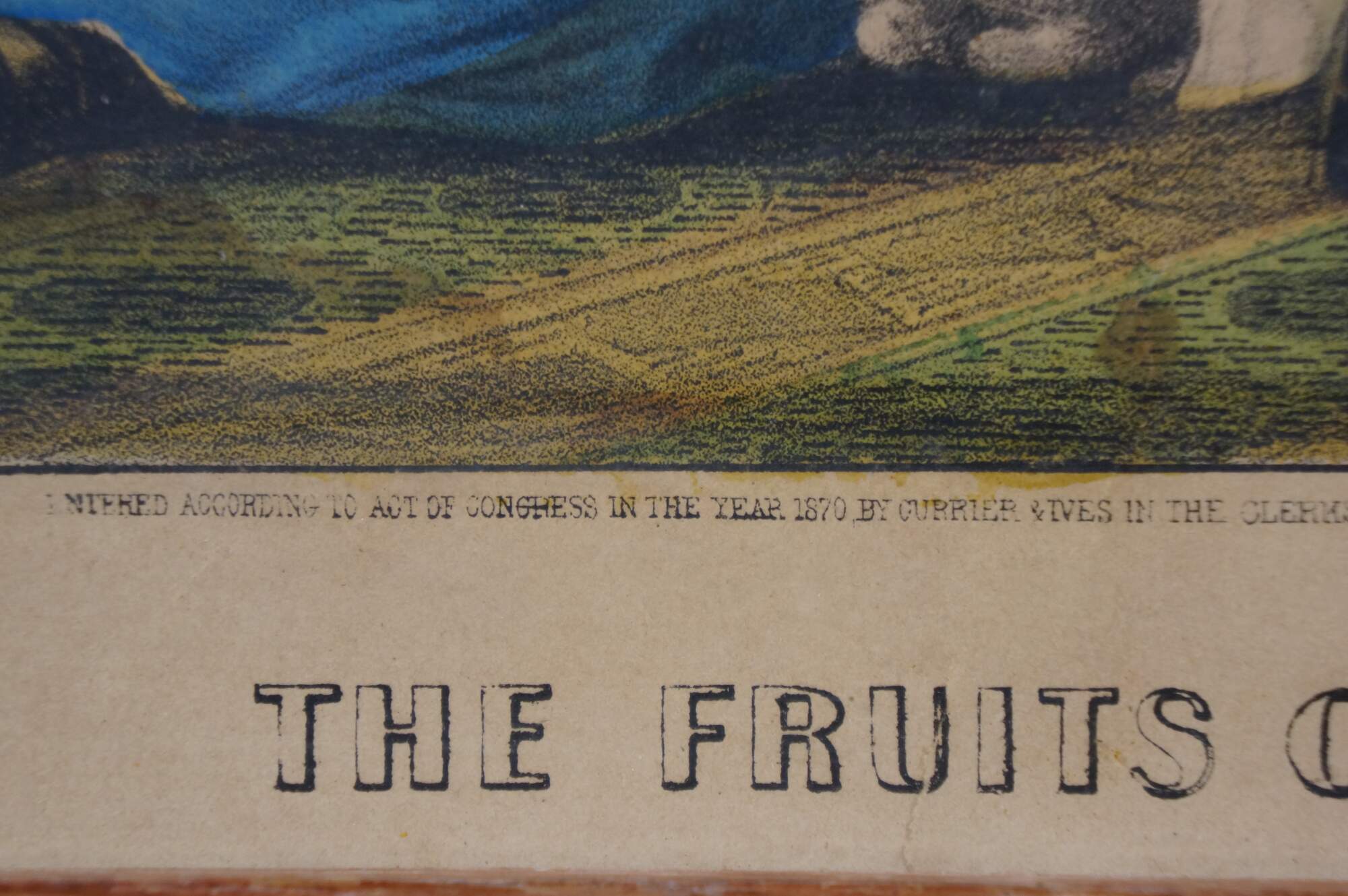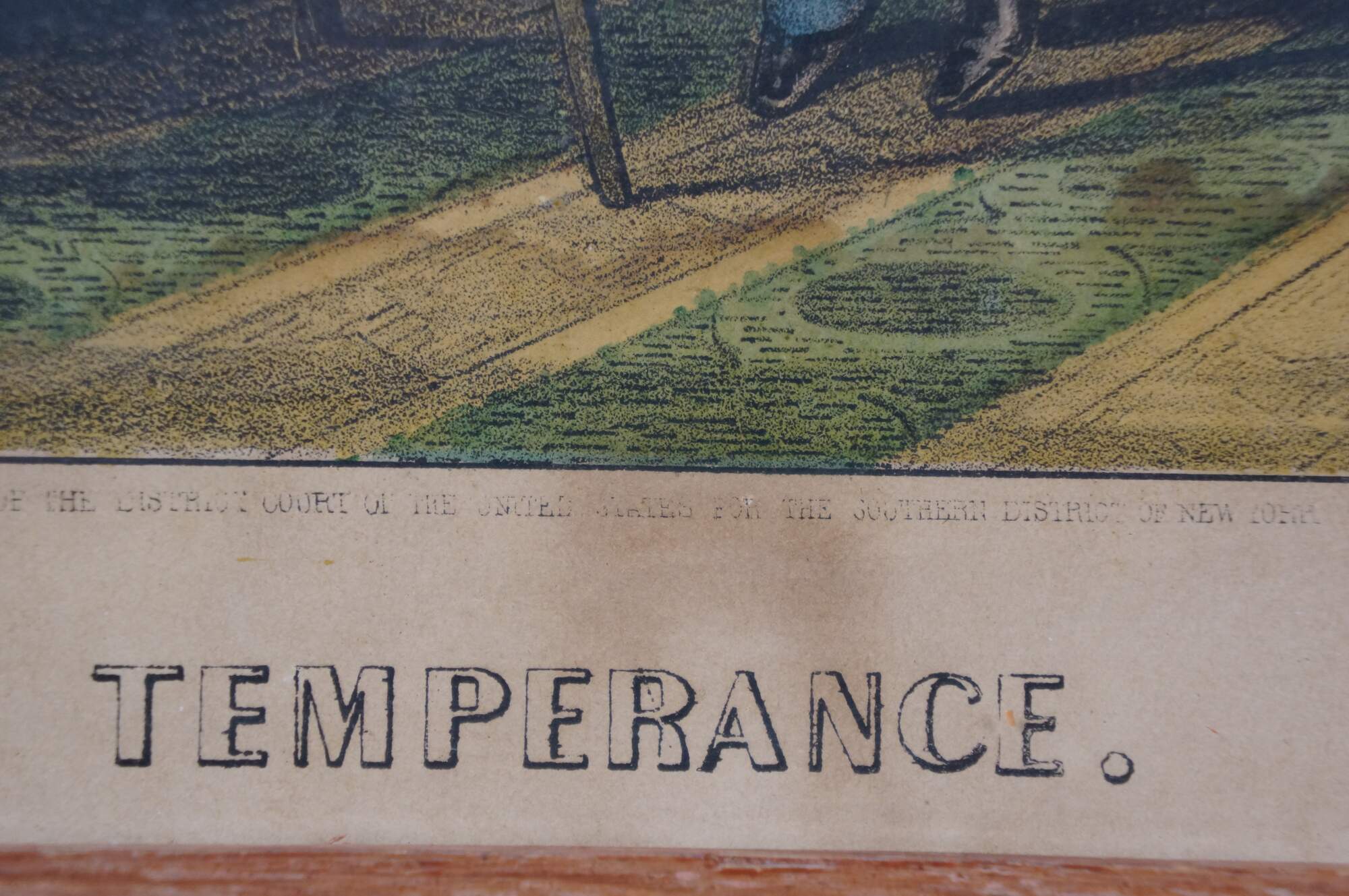 Late 19th century hand colored llithograph print titled "The Fruits of Temperance," published by Currier & Ives "Family (Husband, wife, three children) with a dog and cat sitting in a living room/parlor next to a window with a scene outside of a train crossing over a bridge and a ship in the water. Currier & Ives produced a series of prints that encouraged pious living and moderation. In this work, which celebrates the positive effects of temperance, a wealthy family is shown together in their comfortable home. This image, a companion to The Fruits of Intemperance, was also published under the name The Good Husband." (Springfield Museums) Entered According to Act of Congress in the Year 1870 by currier & Ives in the Clerks Office of the District Court of the united States for the Southern district of New York. Beveled wood frame.