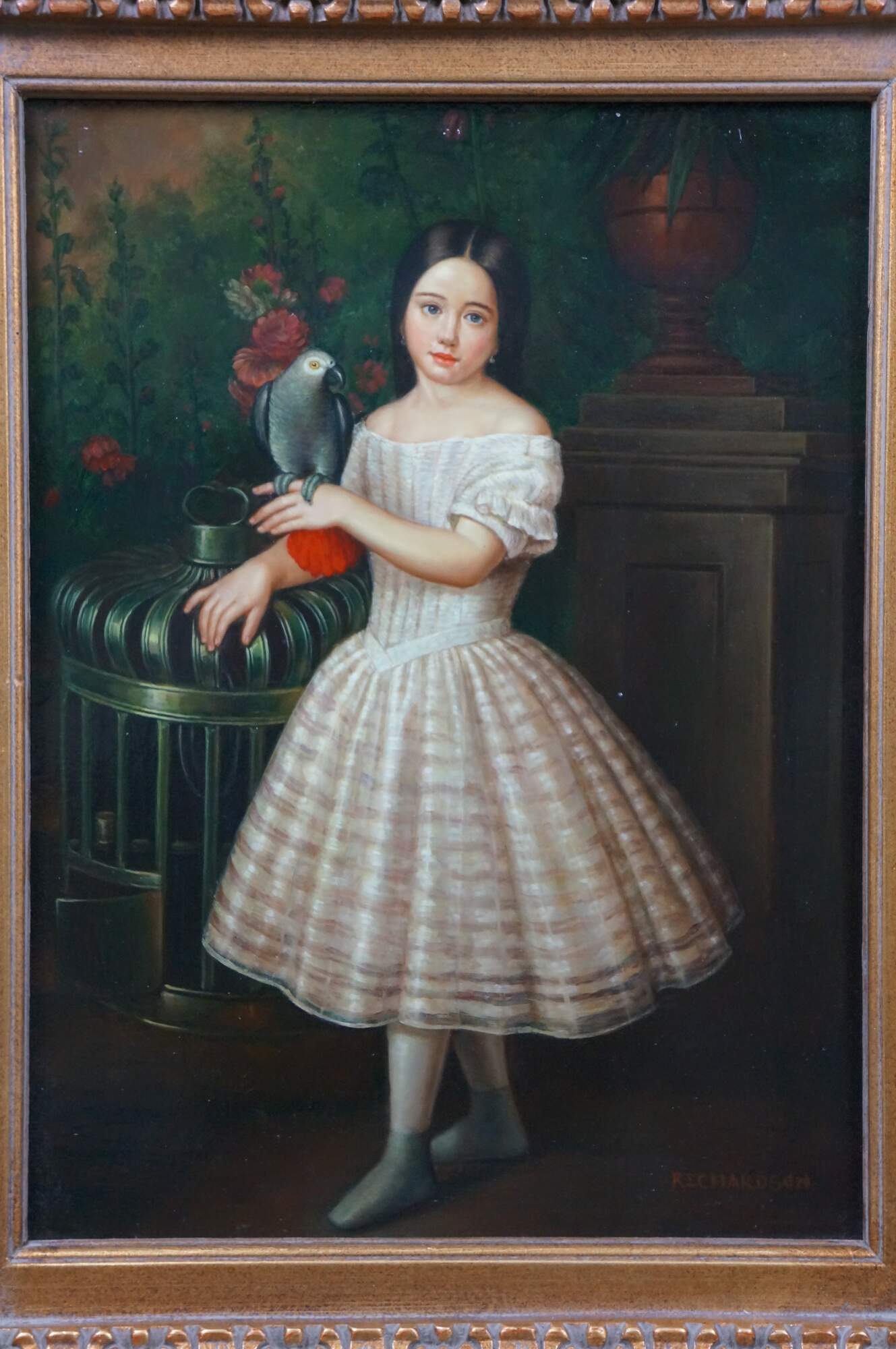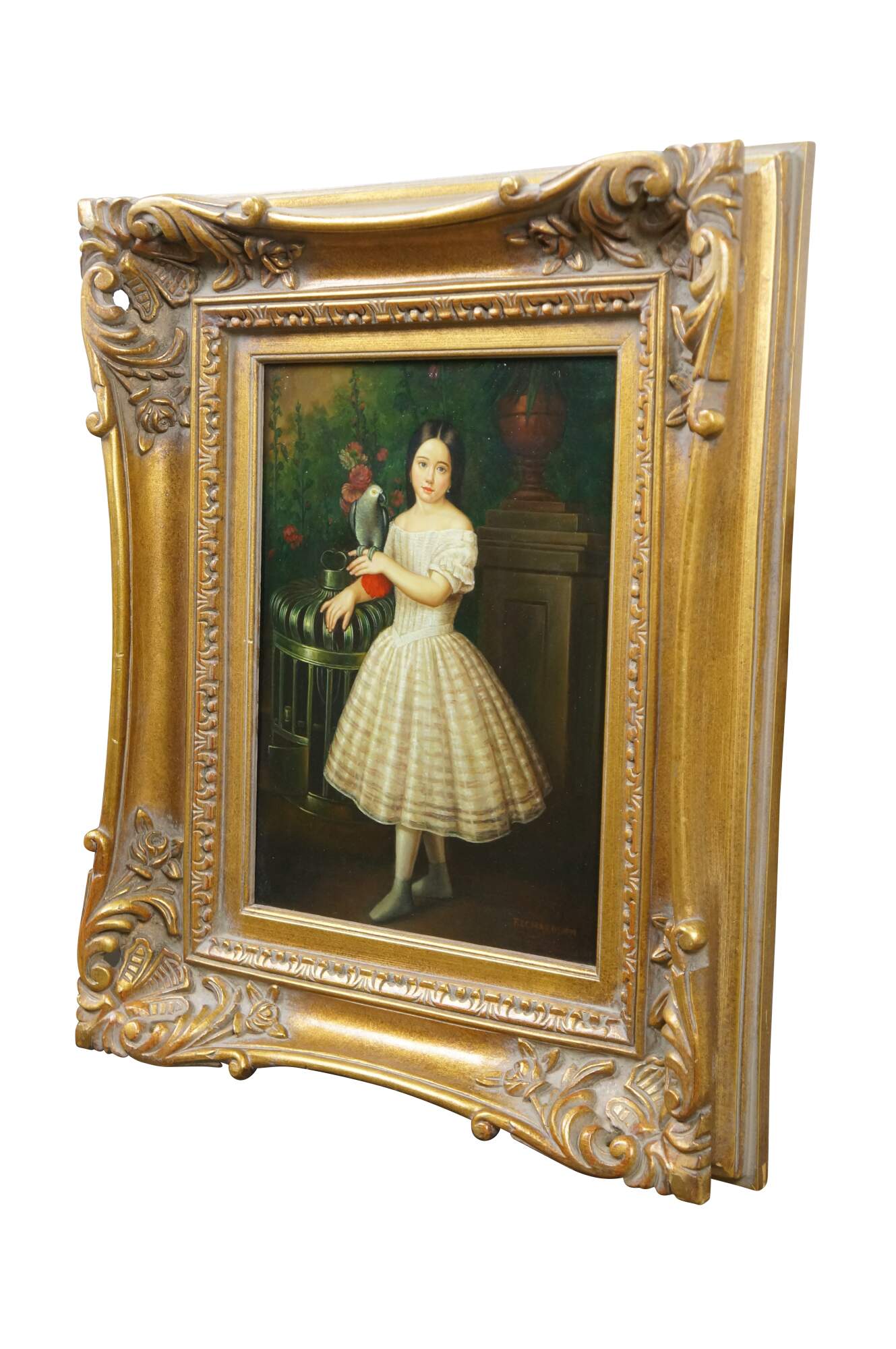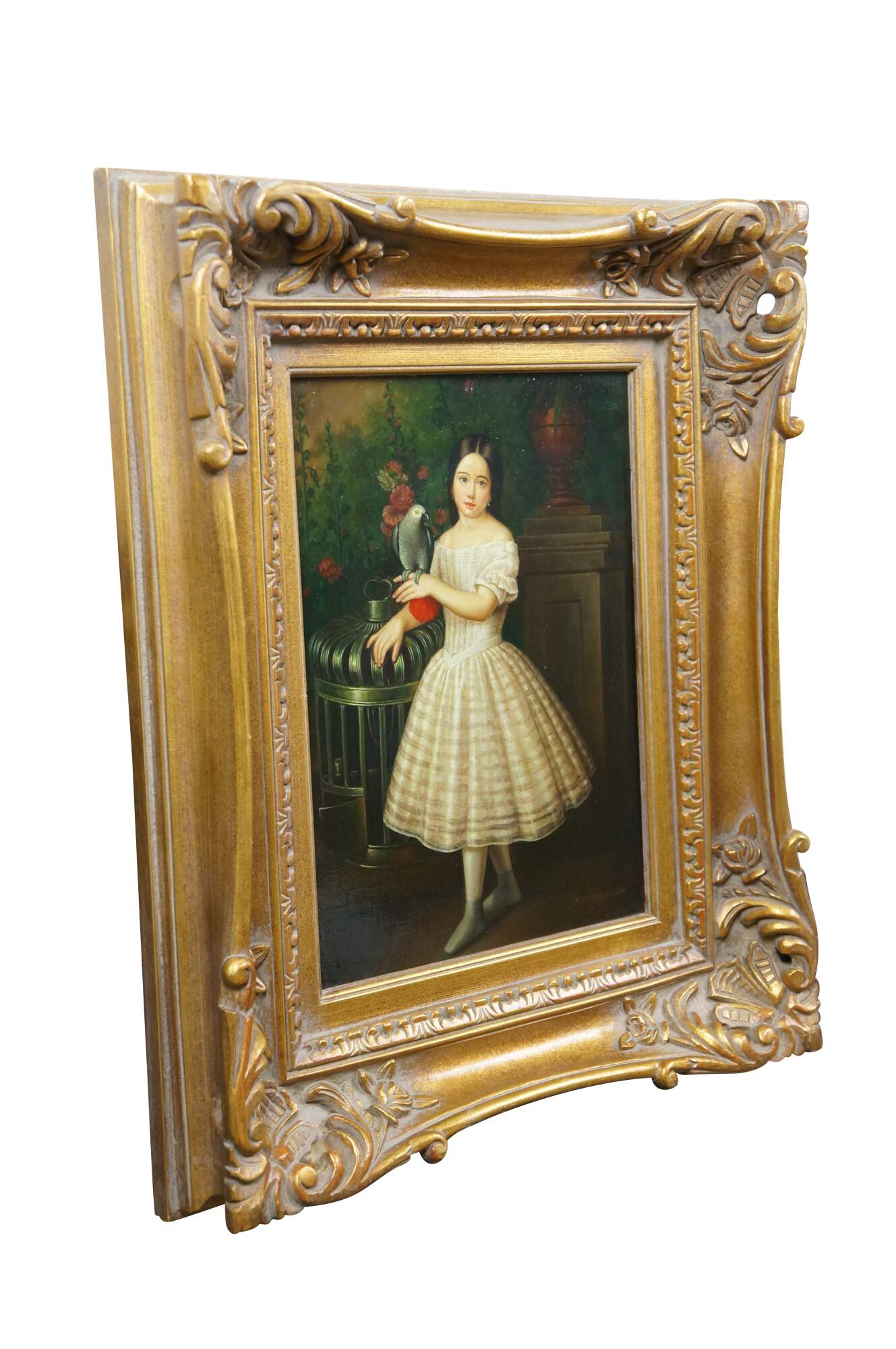 Late 20th century oil on board portrait painting after a work depicting "Rafaela Flores Calderon," originally painted circa 1842 by Antonio Maria Esquivel. Depicts a child of Lorenzo Flores Calderon (1804 - 1865) and Isabel Cipriana García Del Busto Alonso De Viado (1811 - 1859) in s triped white dress, standing near a vase topped pedestal in a garden, one arm leaning on an open bird cage, and the other supporting a gray parrot. Signed richardson, lower right. Gilt composite frame with simple foliate border and foliate and rose patterned corners.