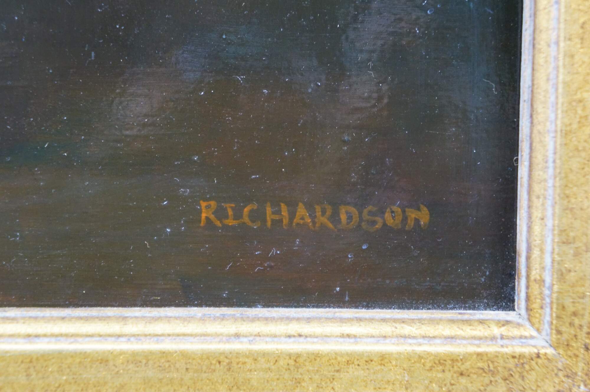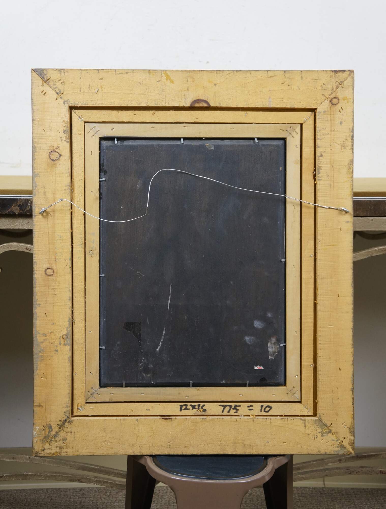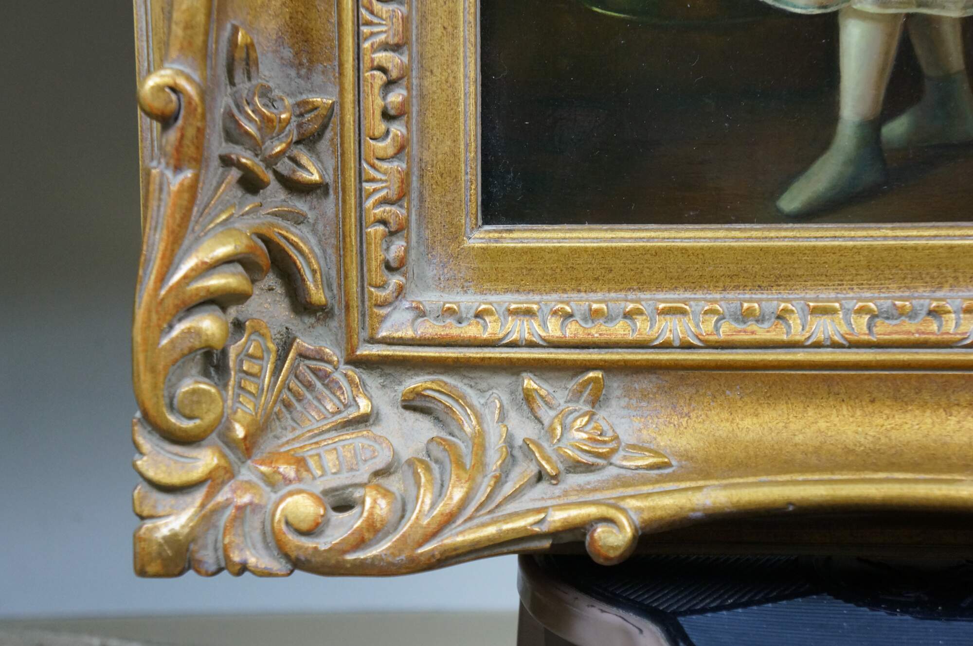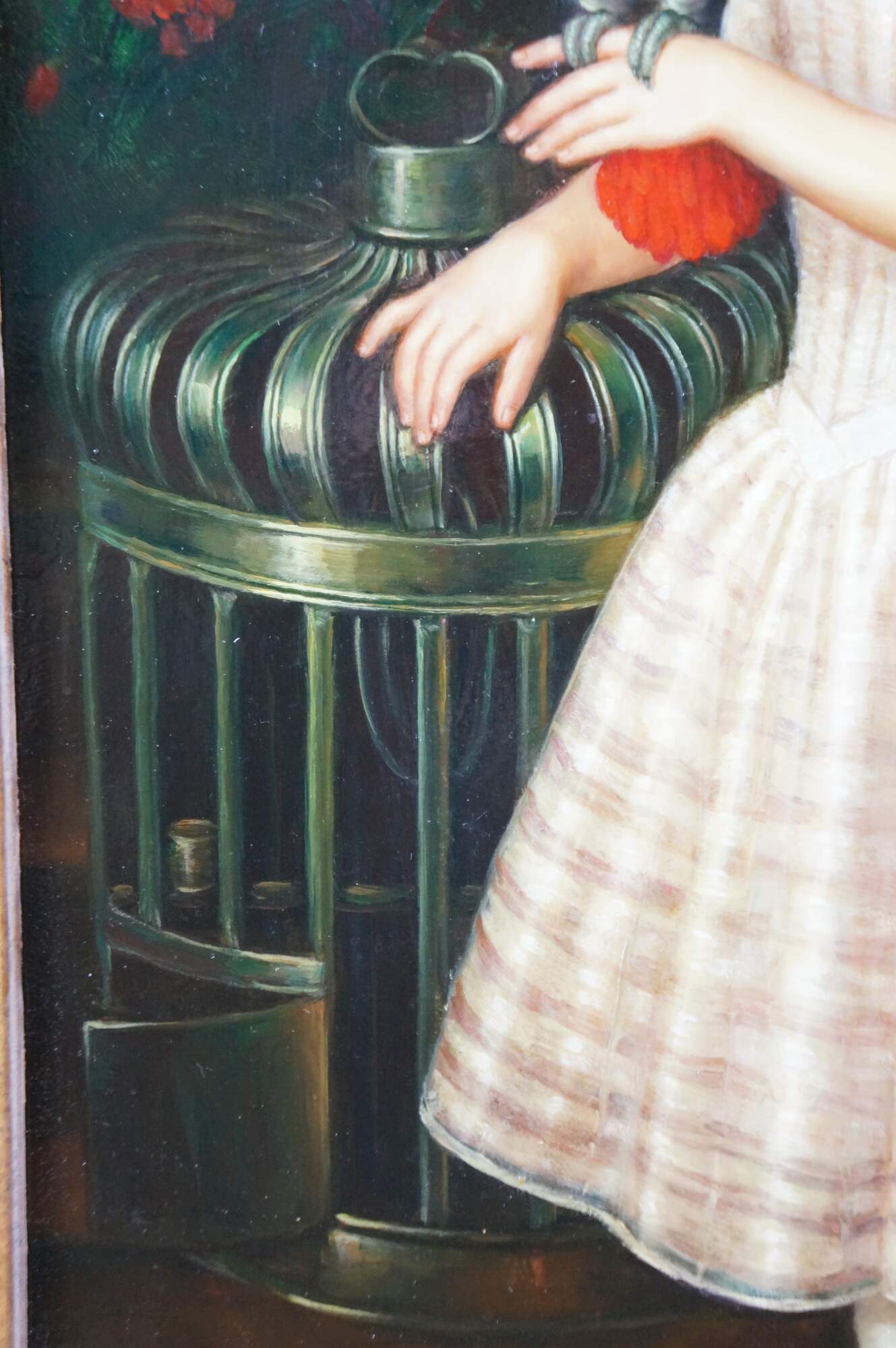 Late 20th century oil on board portrait painting after a work depicting "Rafaela Flores Calderon," originally painted circa 1842 by Antonio Maria Esquivel. Depicts a child of Lorenzo Flores Calderon (1804 - 1865) and Isabel Cipriana García Del Busto Alonso De Viado (1811 - 1859) in s triped white dress, standing near a vase topped pedestal in a garden, one arm leaning on an open bird cage, and the other supporting a gray parrot. Signed richardson, lower right. Gilt composite frame with simple foliate border and foliate and rose patterned corners.