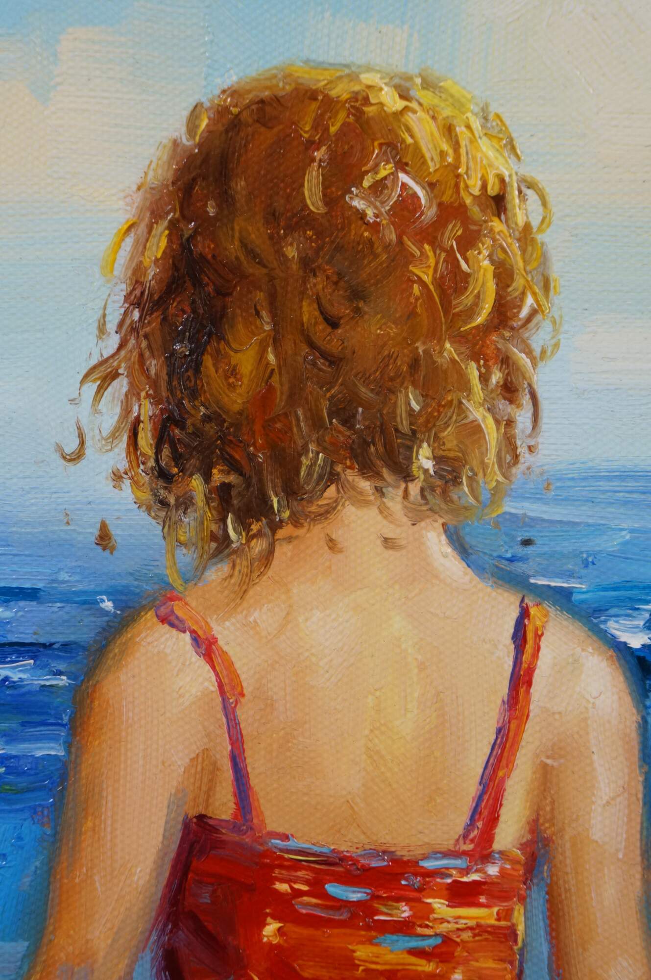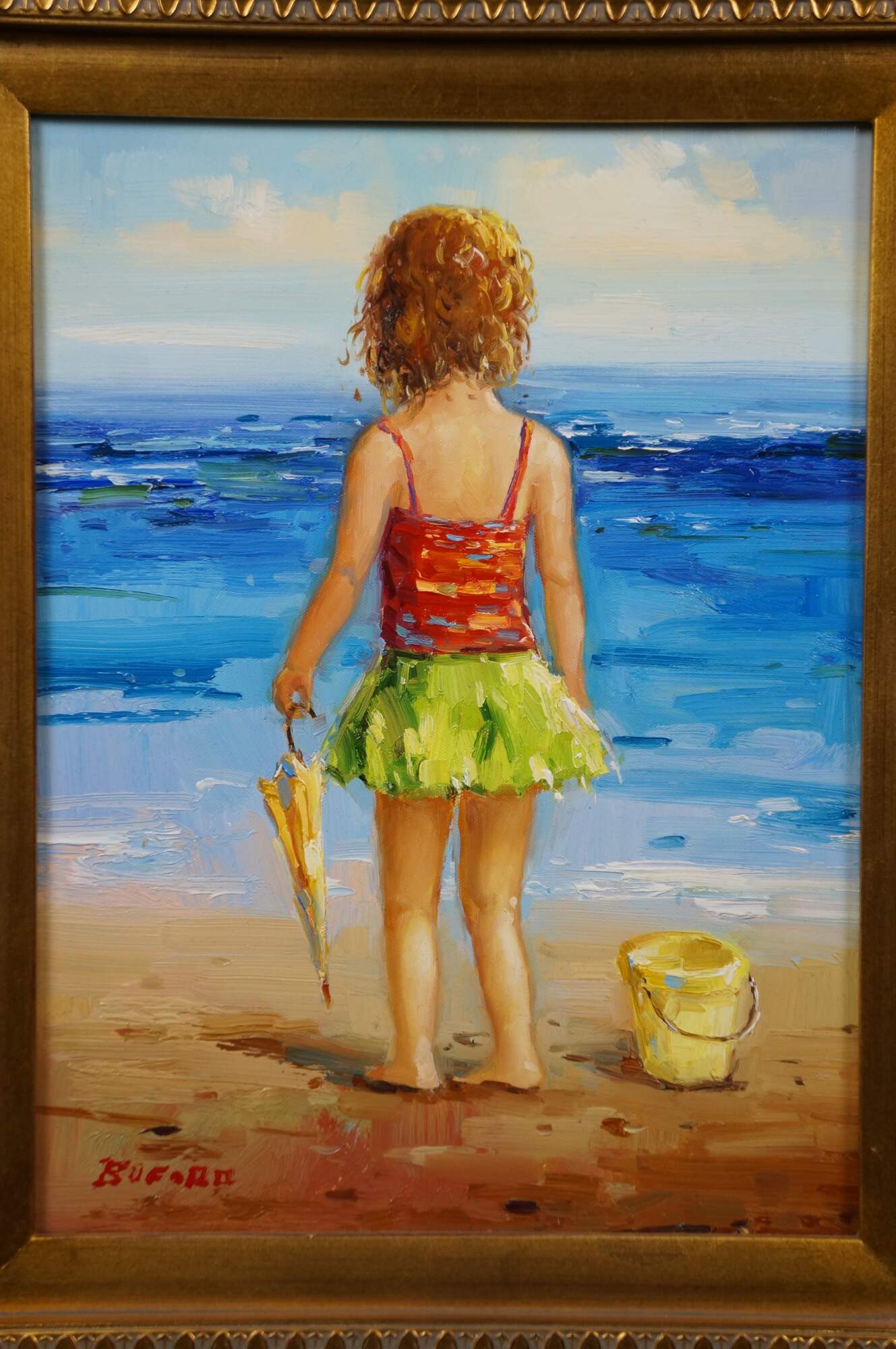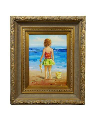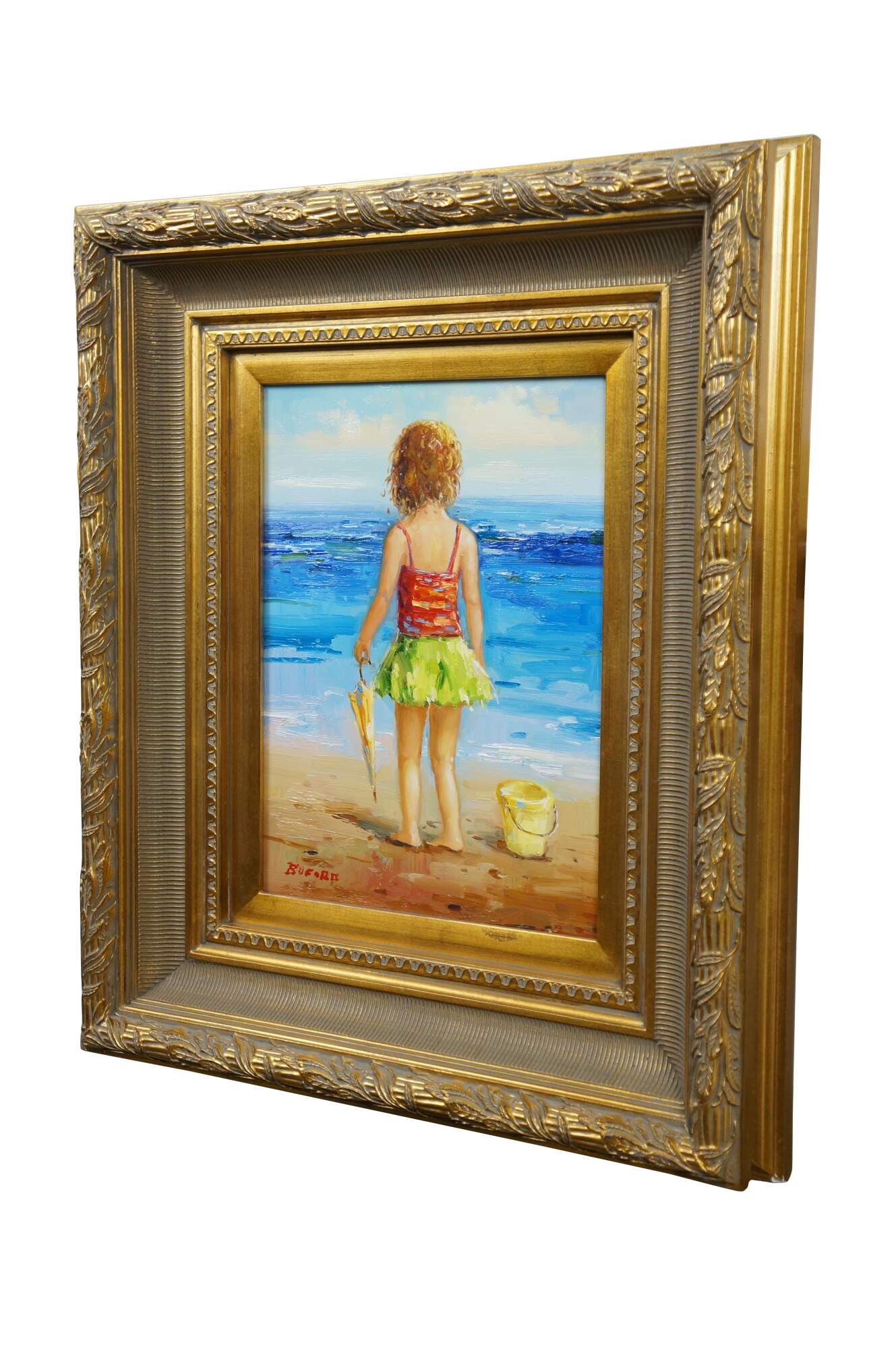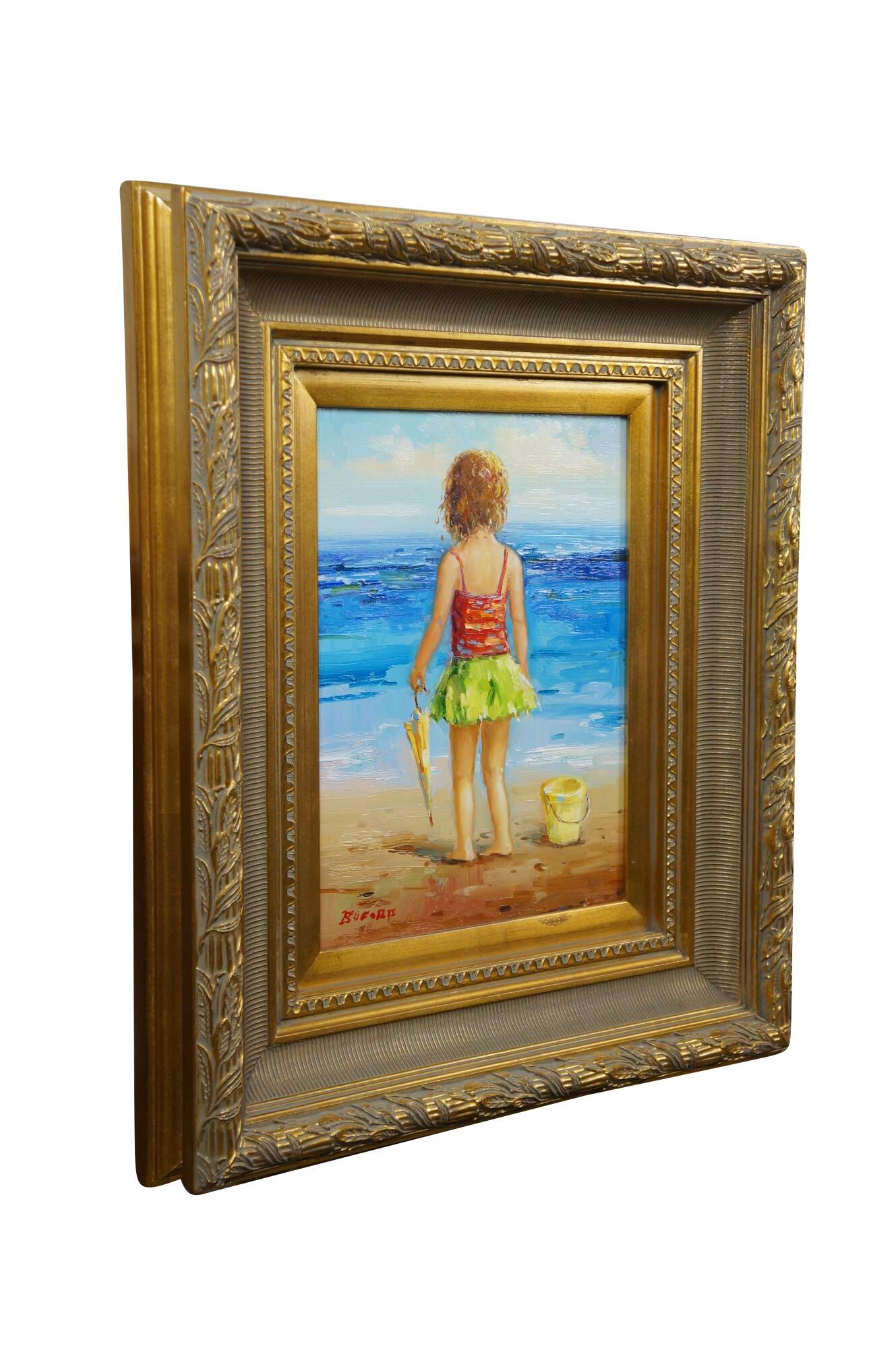 Late 20th century oil on canvas painting produced for Timeless Treasures. Impressionist style coastal painting depicting a young child standing on a beach with bucket and umbrella, staring into the surf. Signed Buford, lower left. Gilt wood and geso frame, molded with neoclassically inspired patternes and vines. Certificate of Authenticity Number AFD164464.