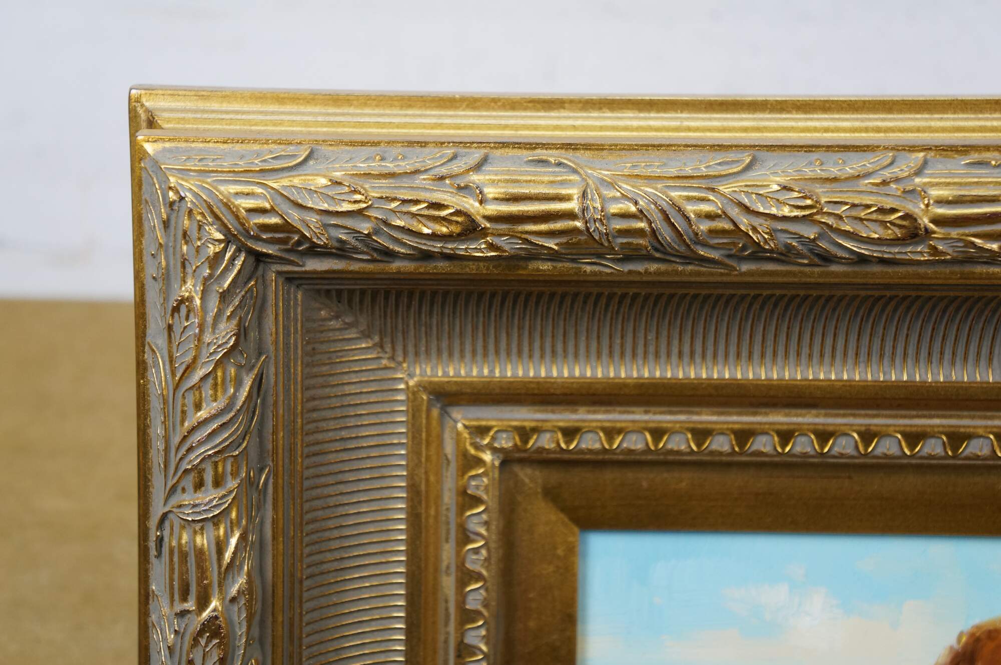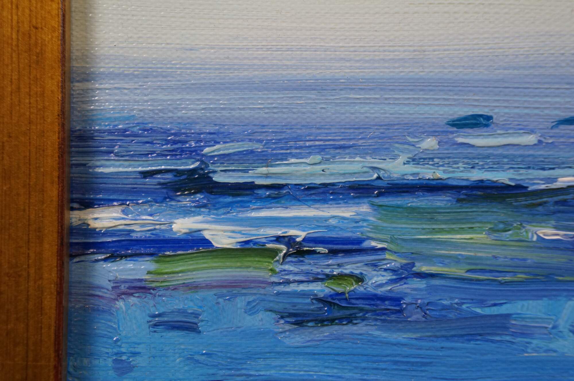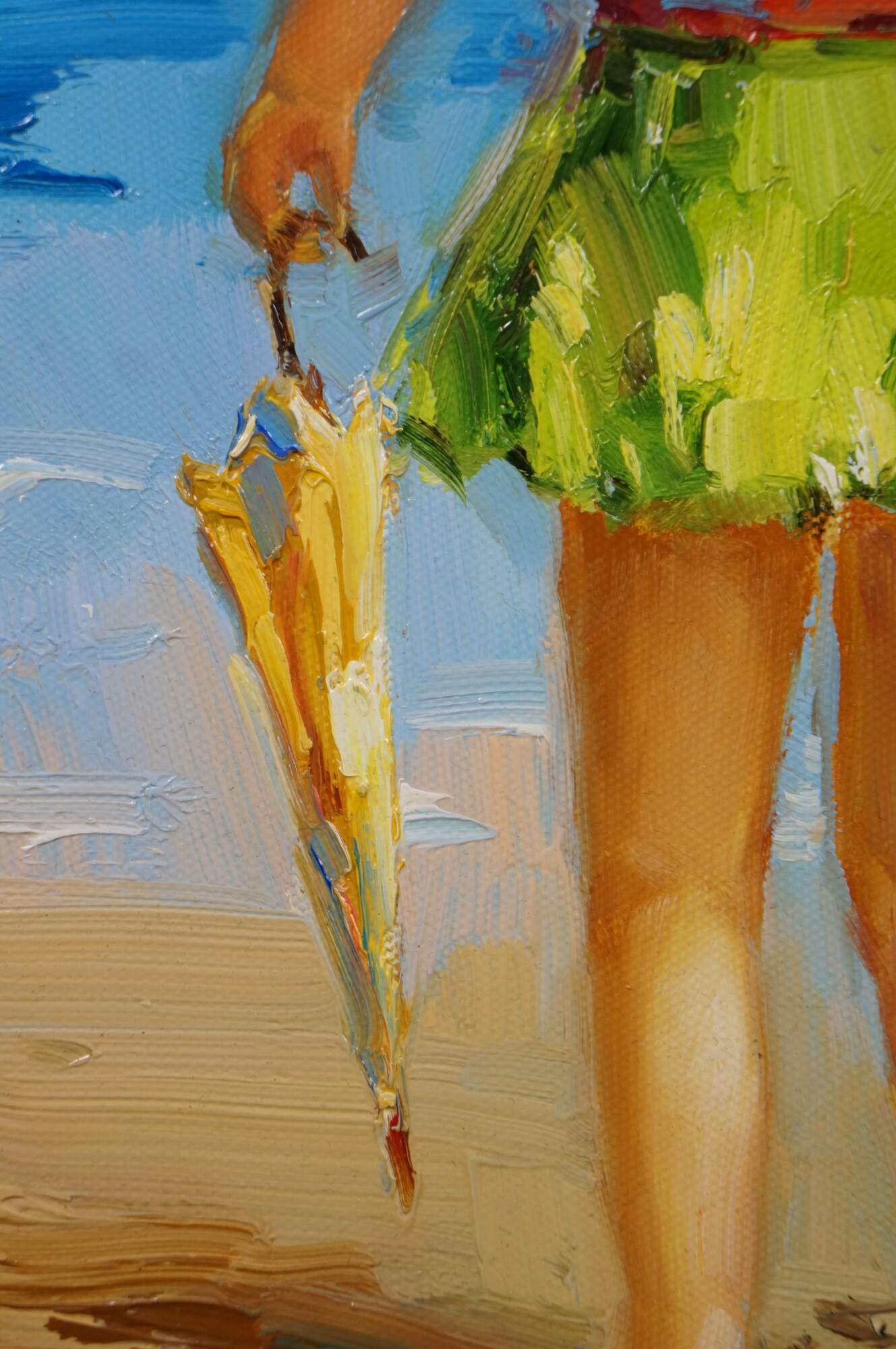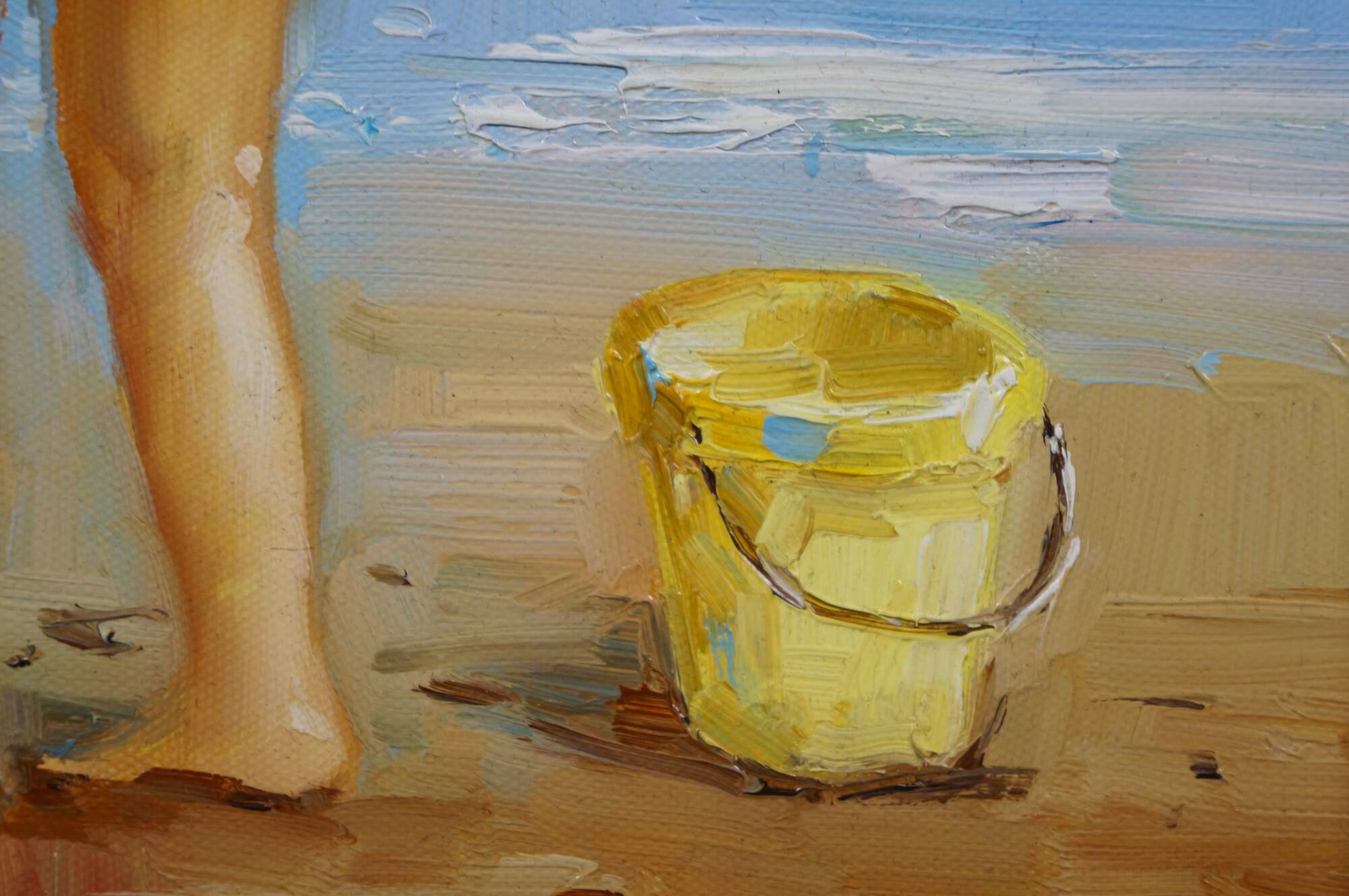 Late 20th century oil on canvas painting produced for Timeless Treasures. Impressionist style coastal painting depicting a young child standing on a beach with bucket and umbrella, staring into the surf. Signed Buford, lower left. Gilt wood and geso frame, molded with neoclassically inspired patternes and vines. Certificate of Authenticity Number AFD164464.