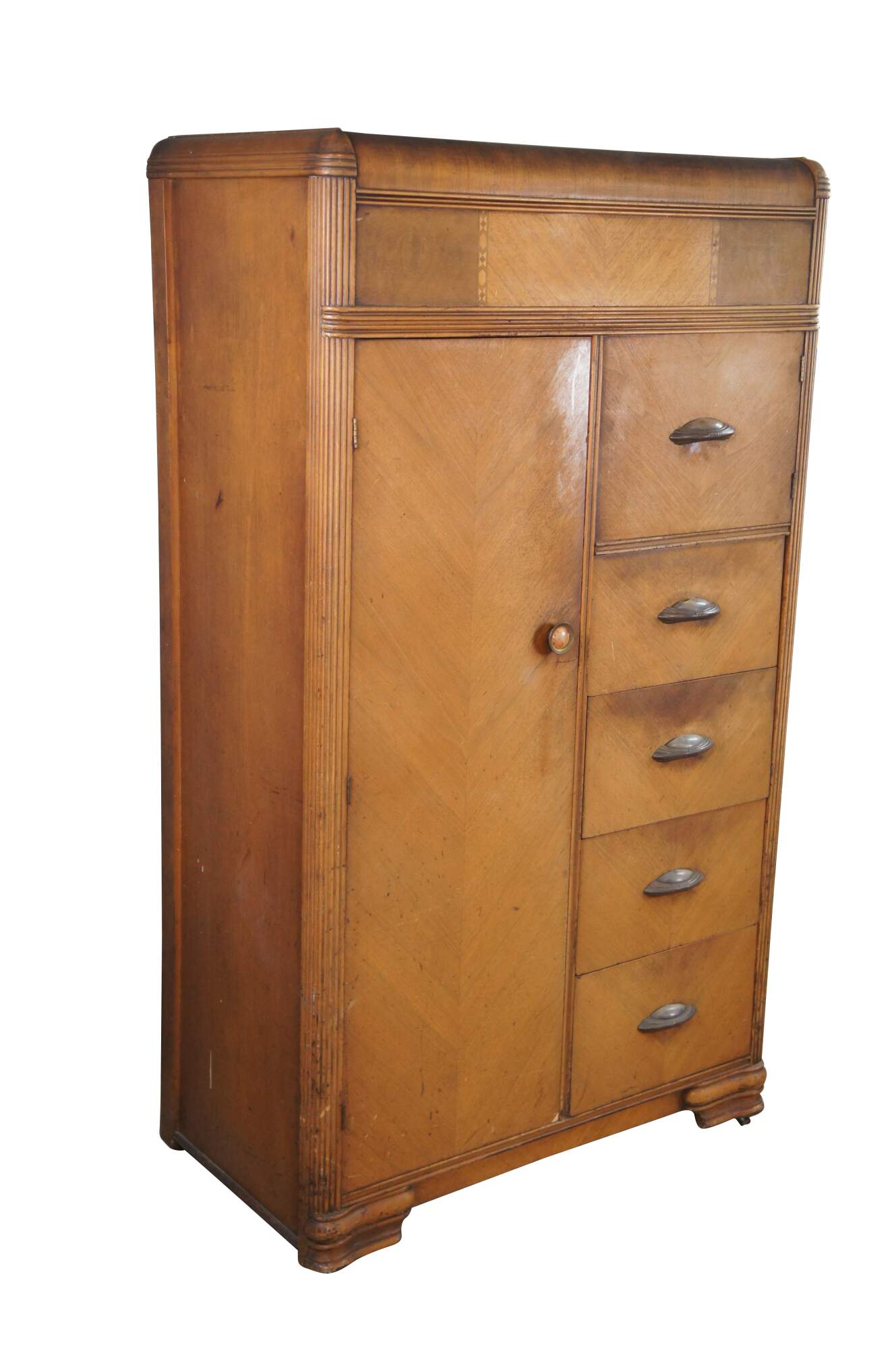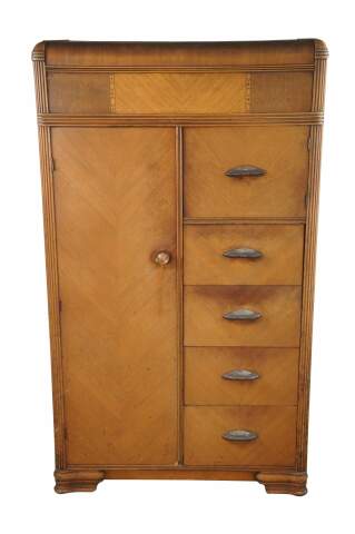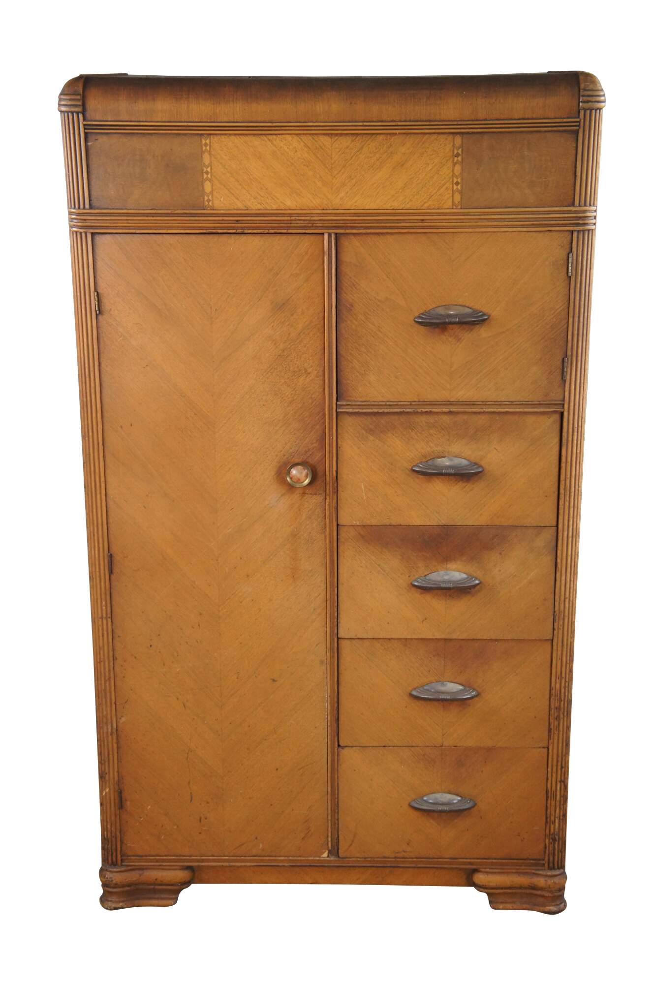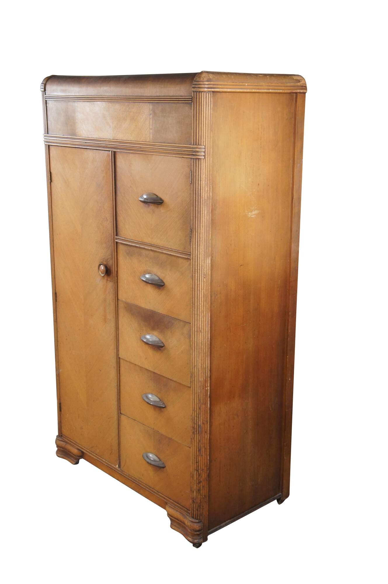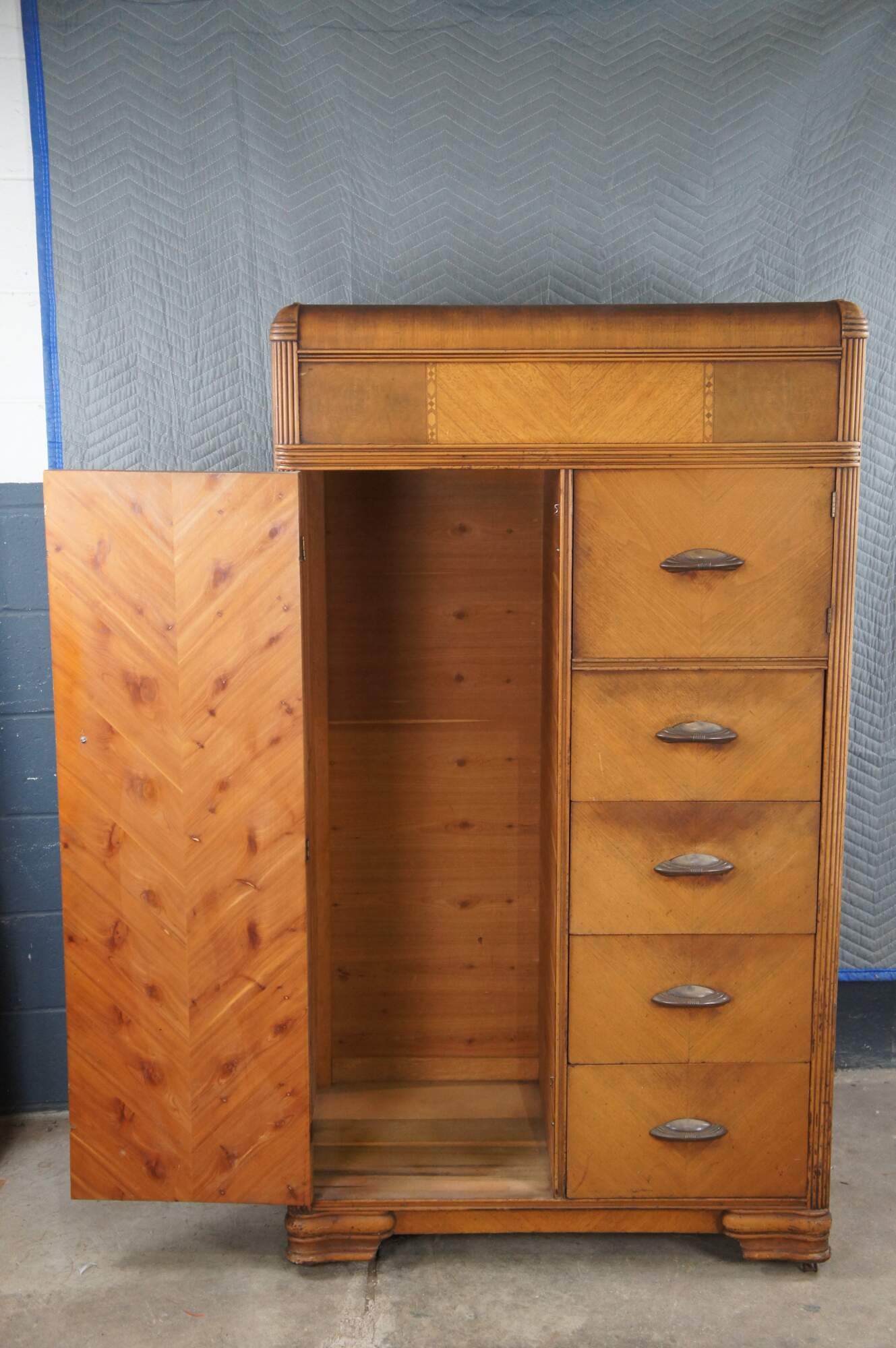 Antique Art Deco chifferobe cabinet. Made from walnut with a waterfall design and matchbook veneer drawer fronts. Includes a full length cabinet to the left for hanging garments and four drawers and upper cubby / cabinet.