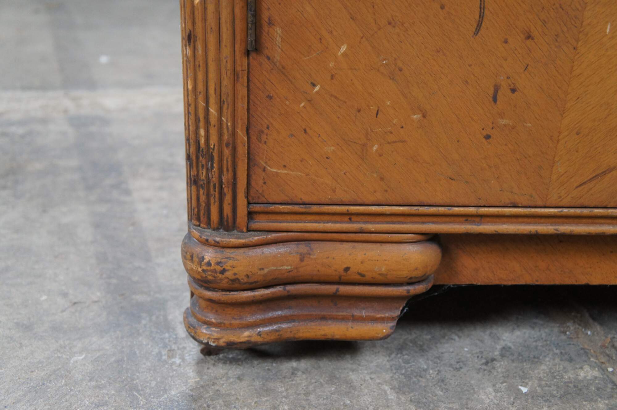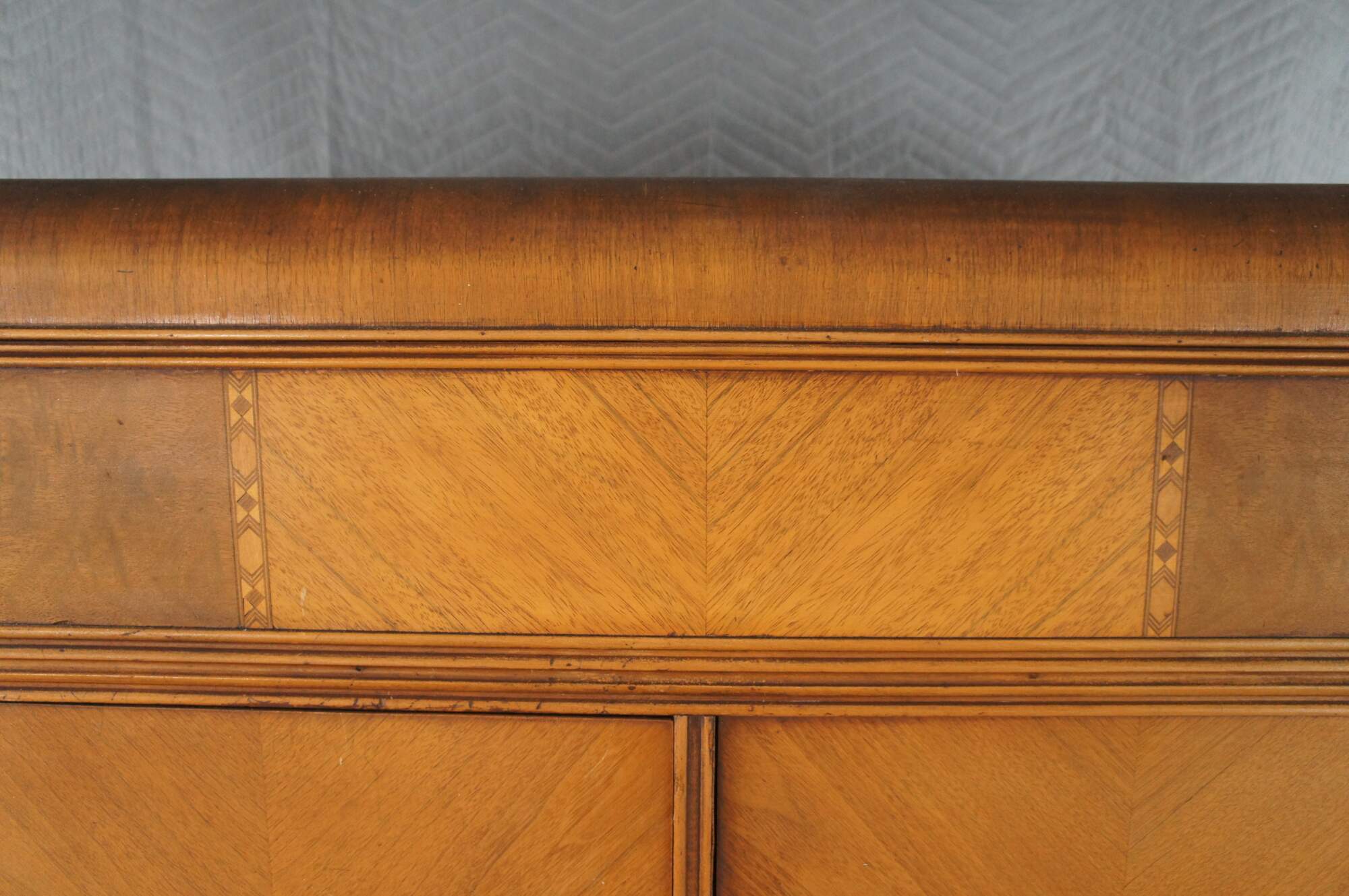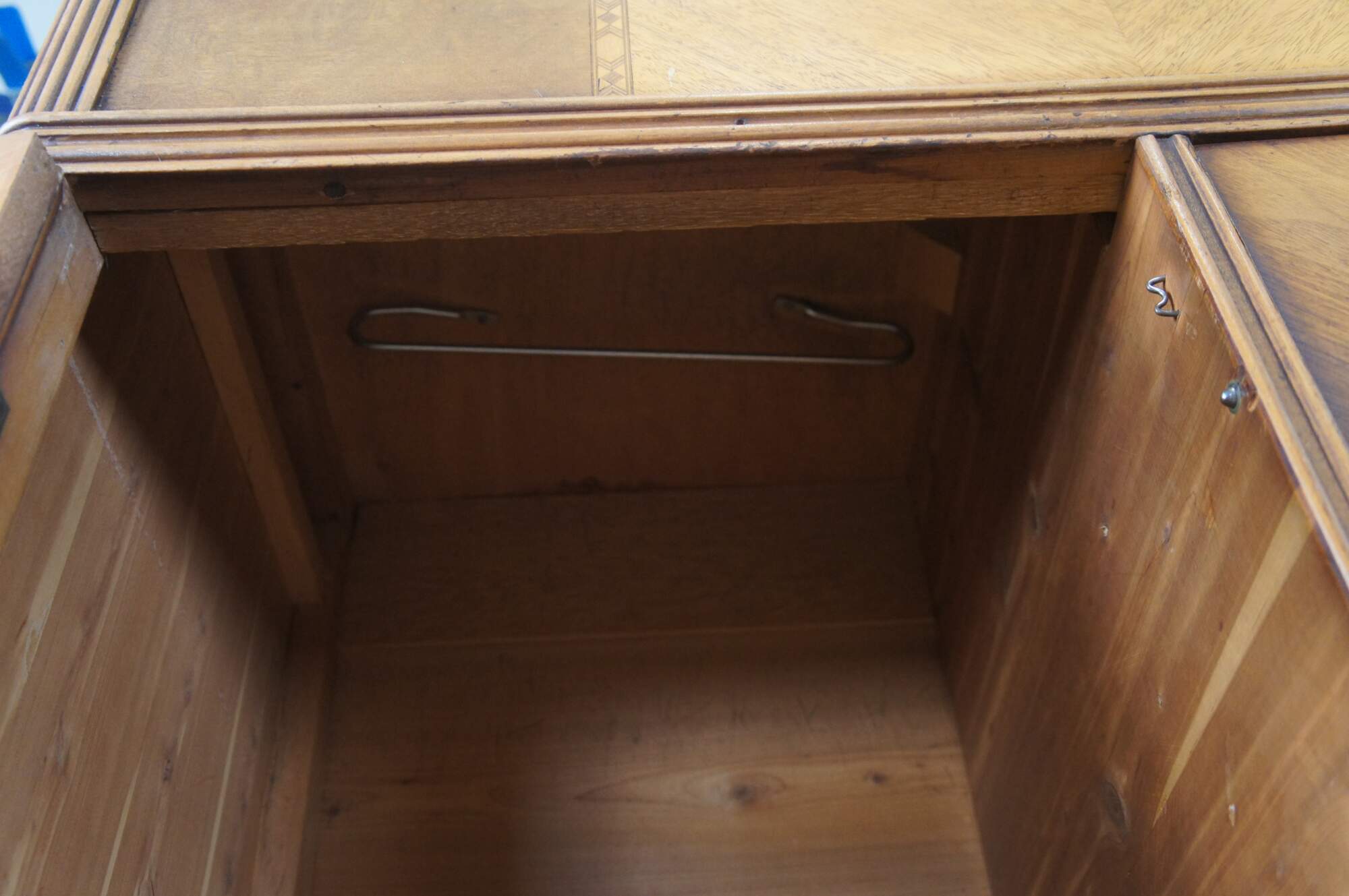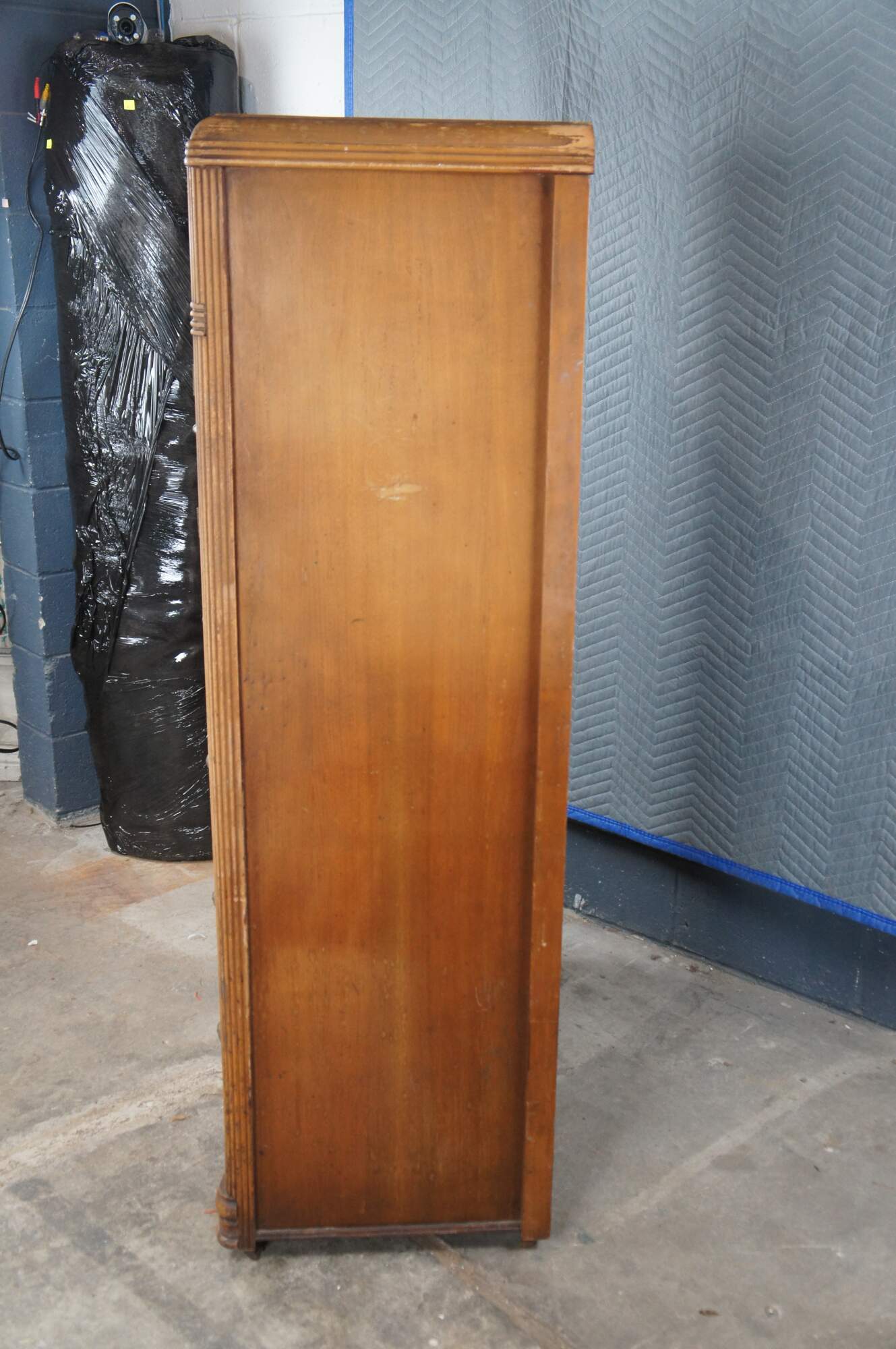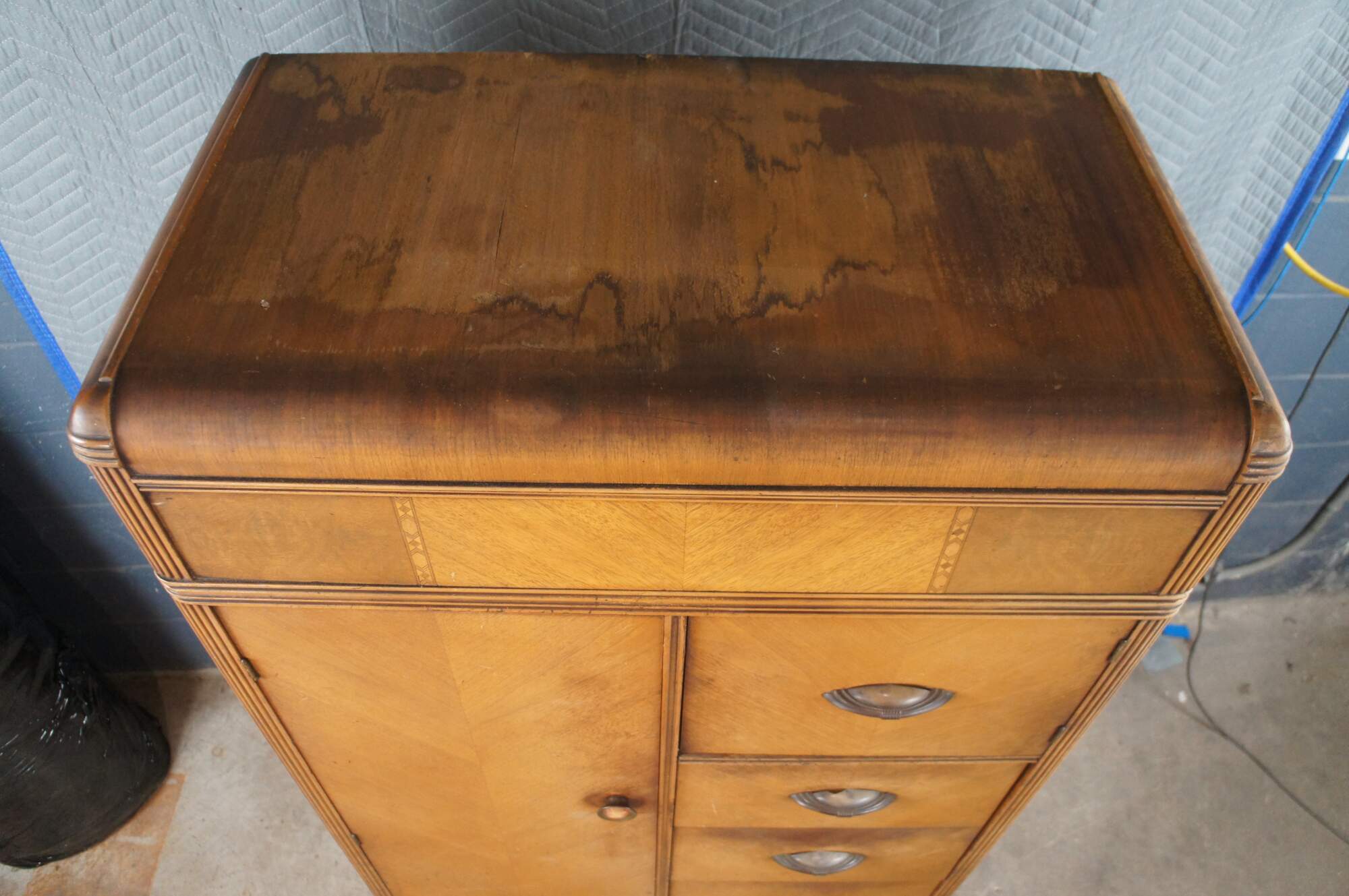 Antique Art Deco chifferobe cabinet. Made from walnut with a waterfall design and matchbook veneer drawer fronts. Includes a full length cabinet to the left for hanging garments and four drawers and upper cubby / cabinet.