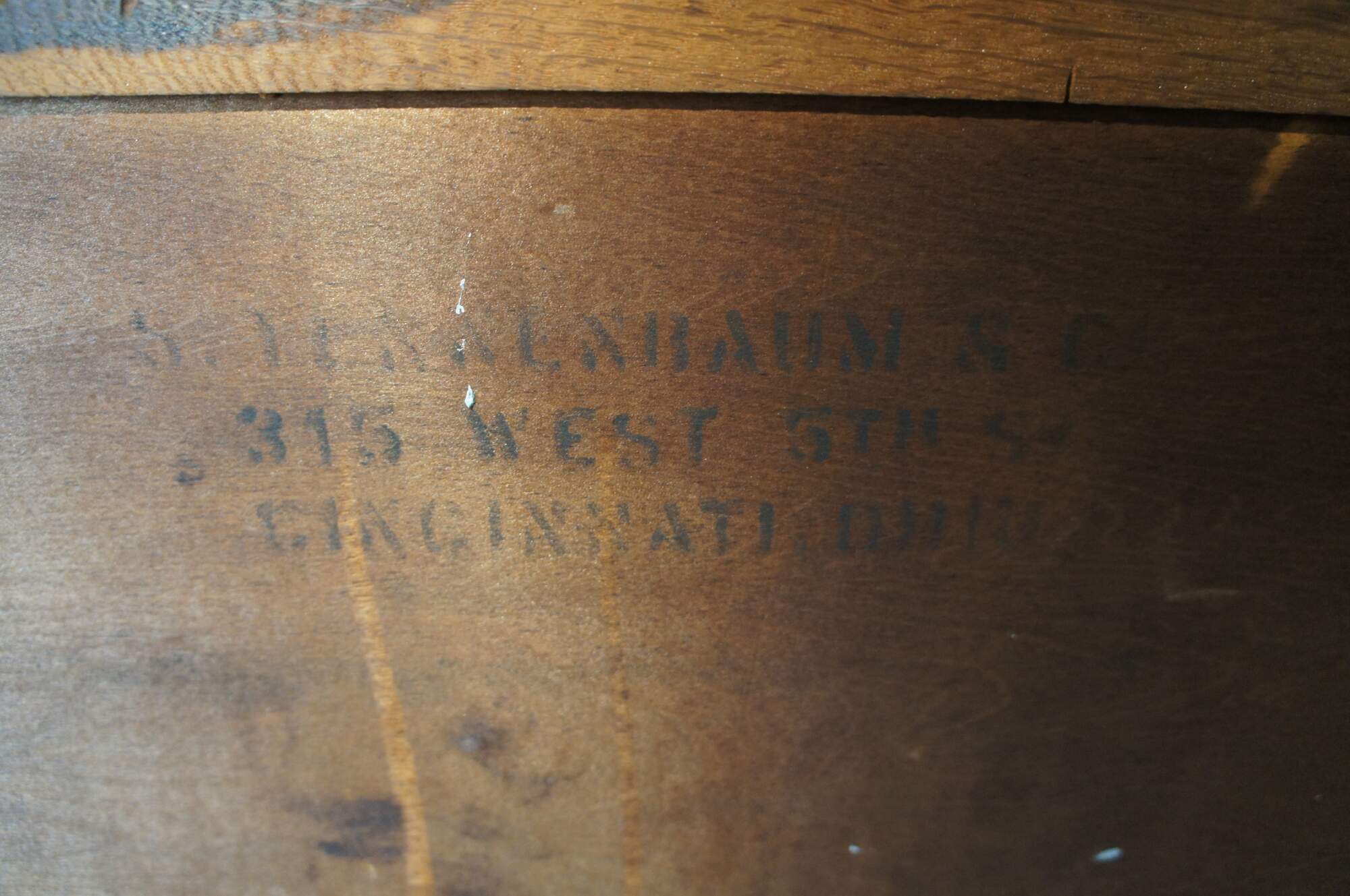 Structurally solid, water stains, fading, scuffing, splitting veneer, chipped drawer pull.