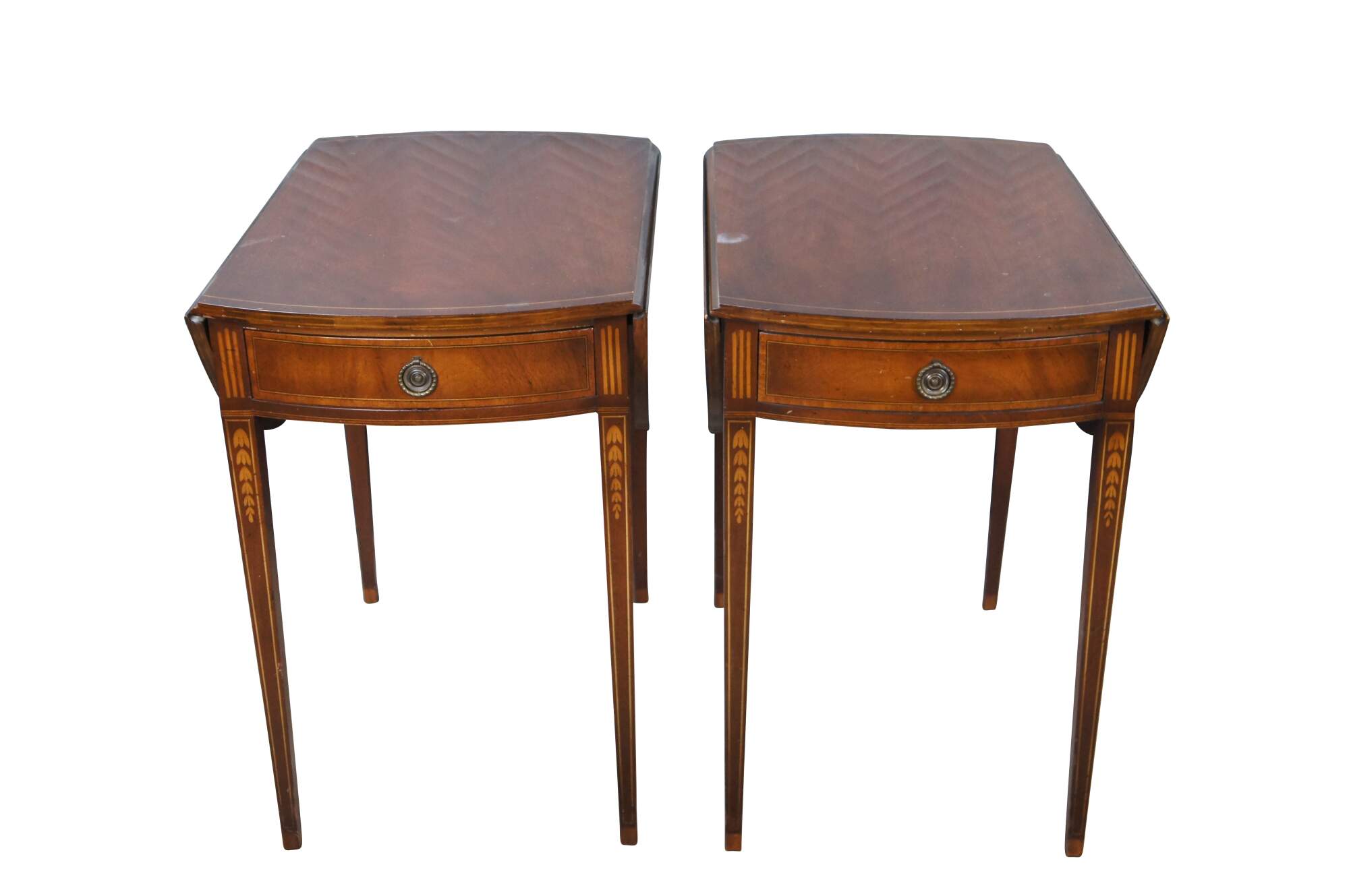 Made from mahogany with drop leaves that open to create an oval surface. Features banding over square tapered legs, inlay, dovetailed drawers and brass hardware. Inspired by Sheraton and Federal styling. Genuine Mahogany, Mahogany Association #184.