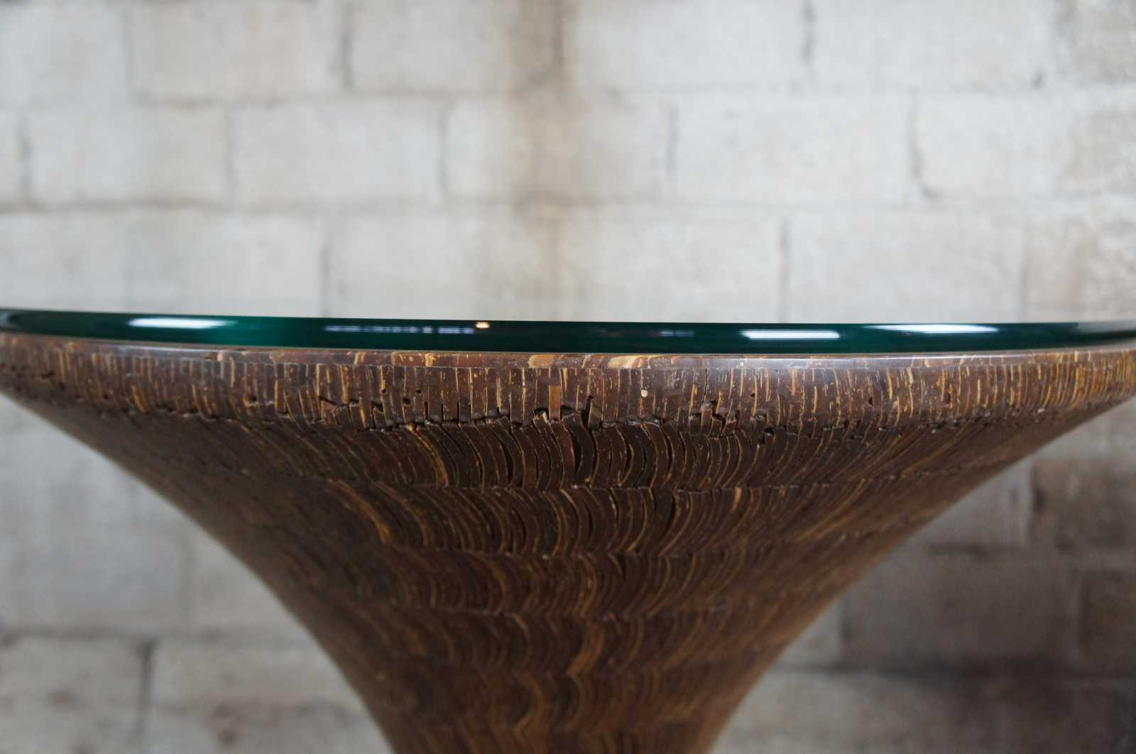 Unique pair of hourglass shaped pedestals or side tables. Each is made from inlaid slivers that are patterned in a swirel shape and lead to a painted top, affixed with glass.