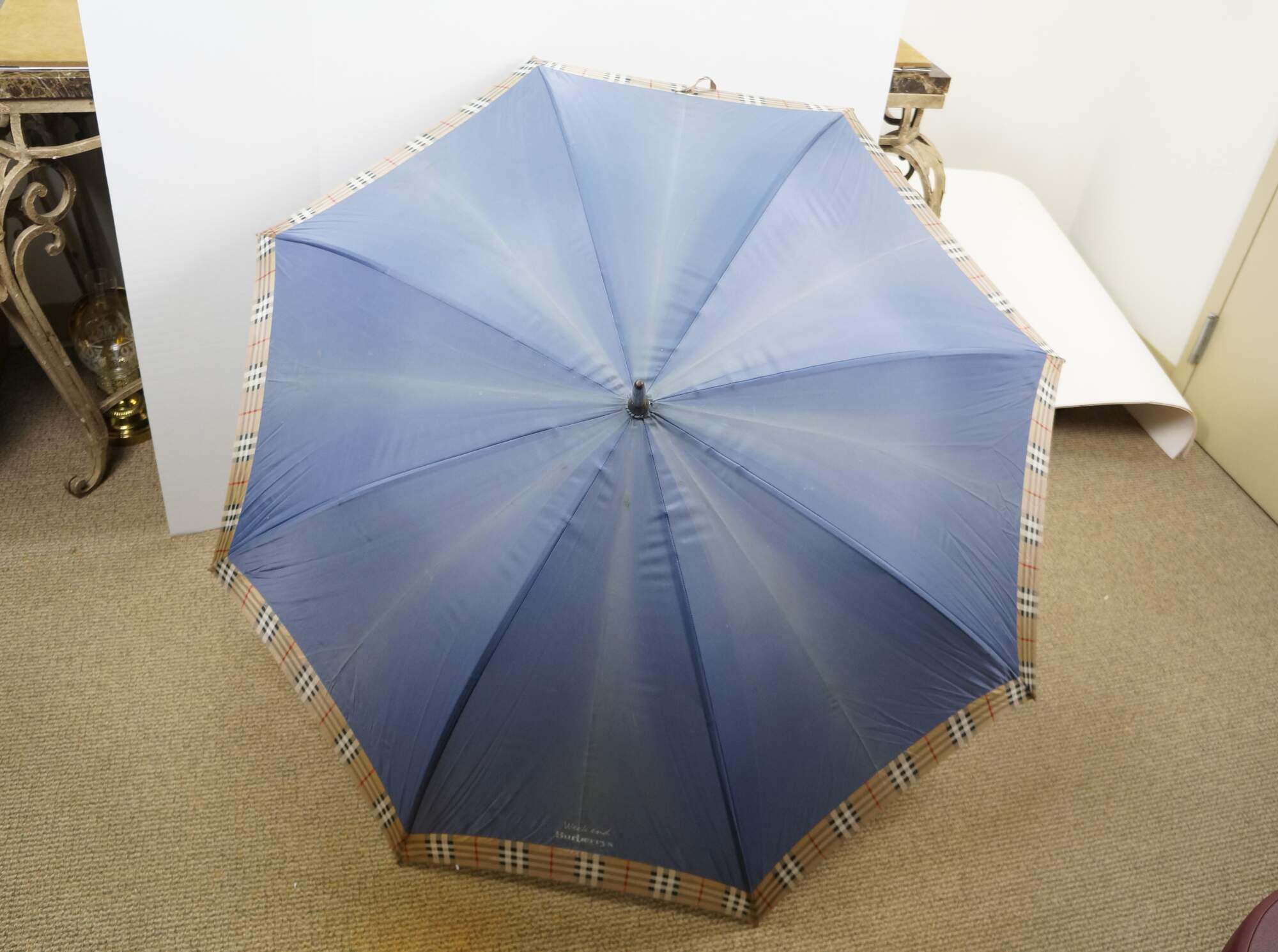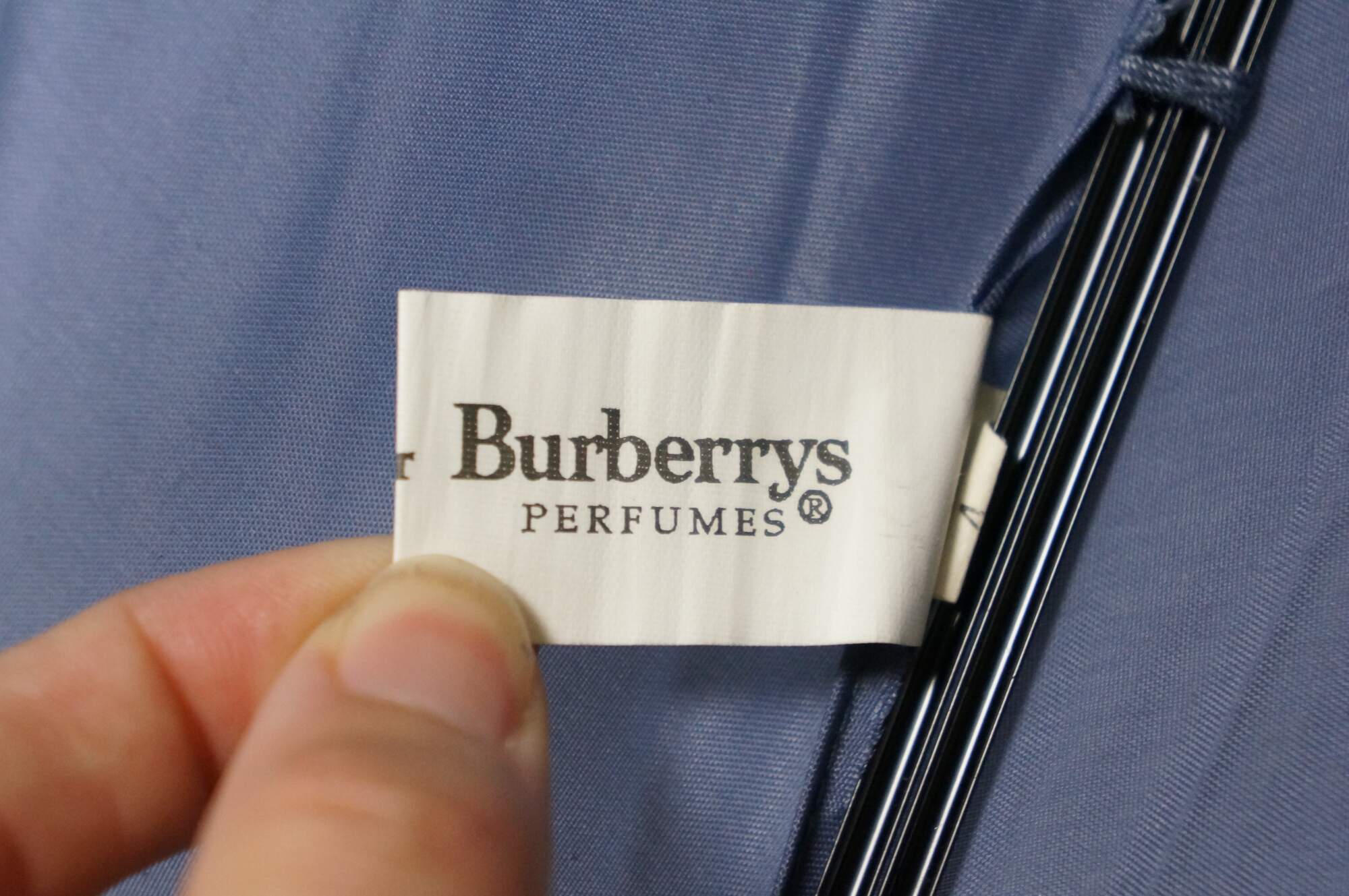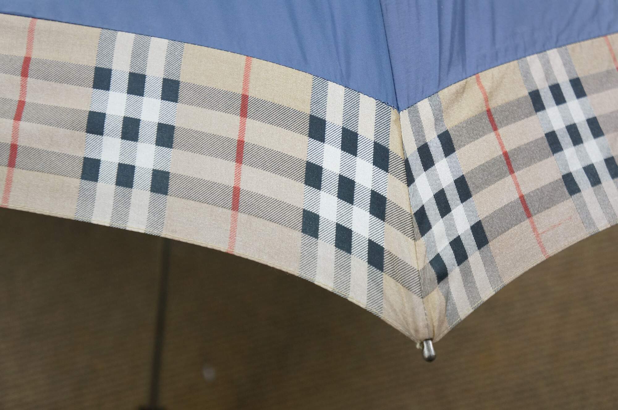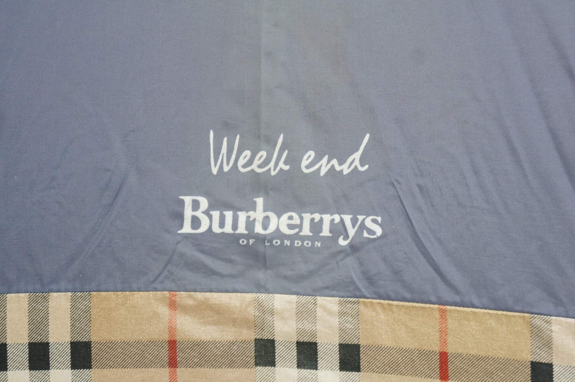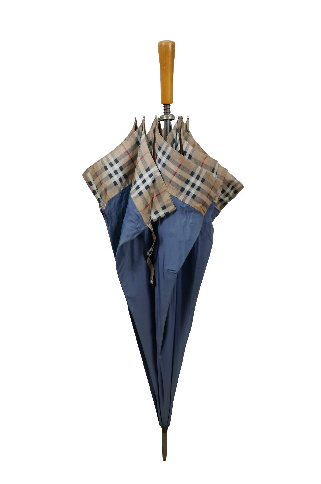 Late 20th century Burberry Week End umbrella. Light blue with tan Nova check plaid edge. Wood Handle. 100% Nylon - K.L. Umbrella - Fidra France for Burberry's Perfumes - 33-1-48 95 00 51 - Made in China.