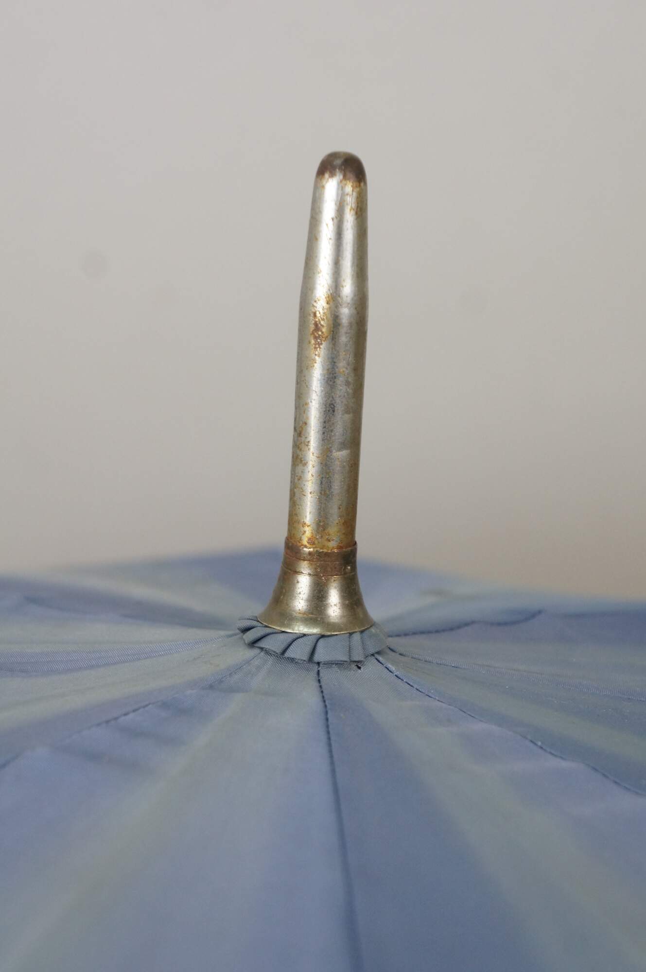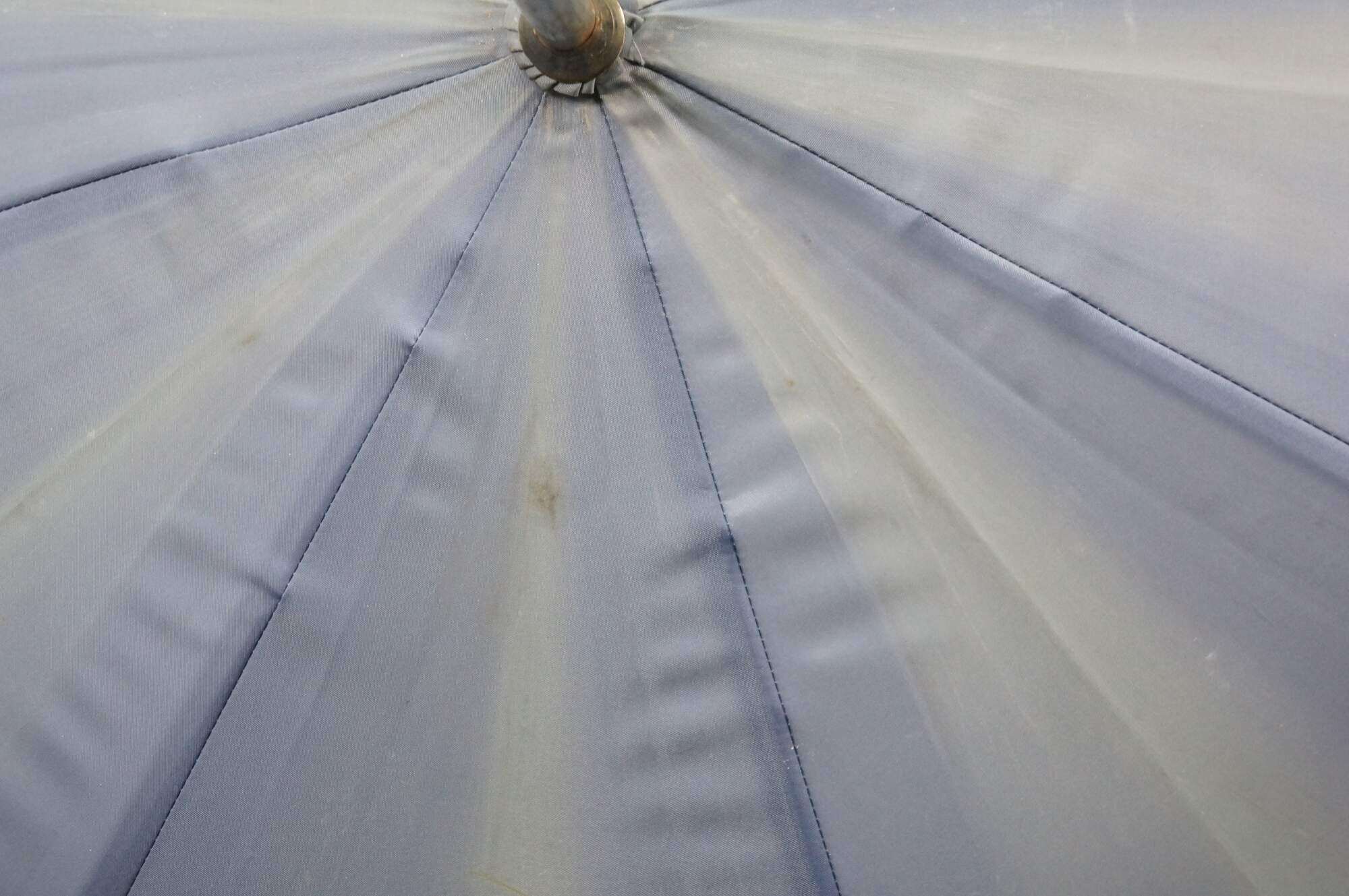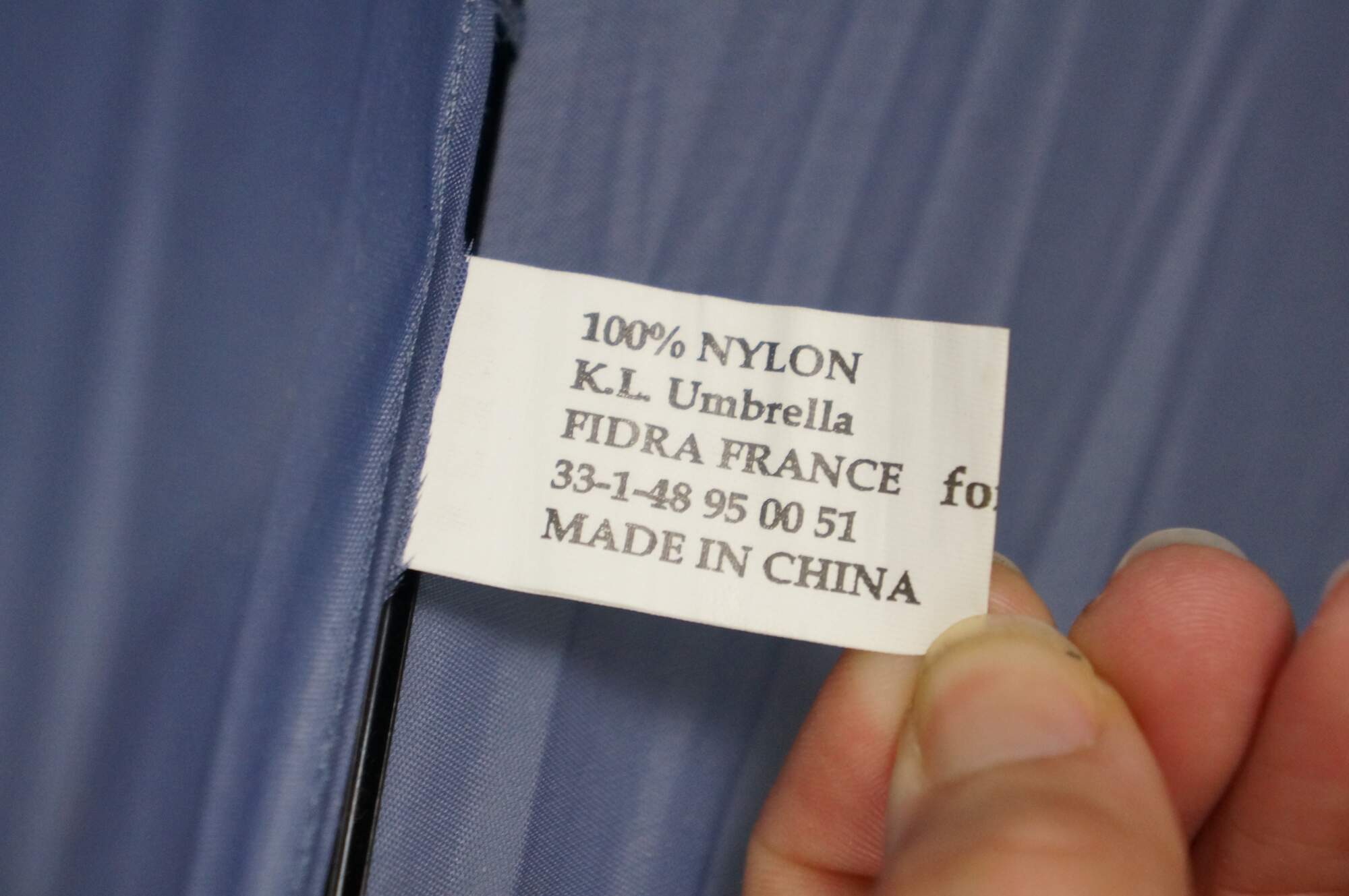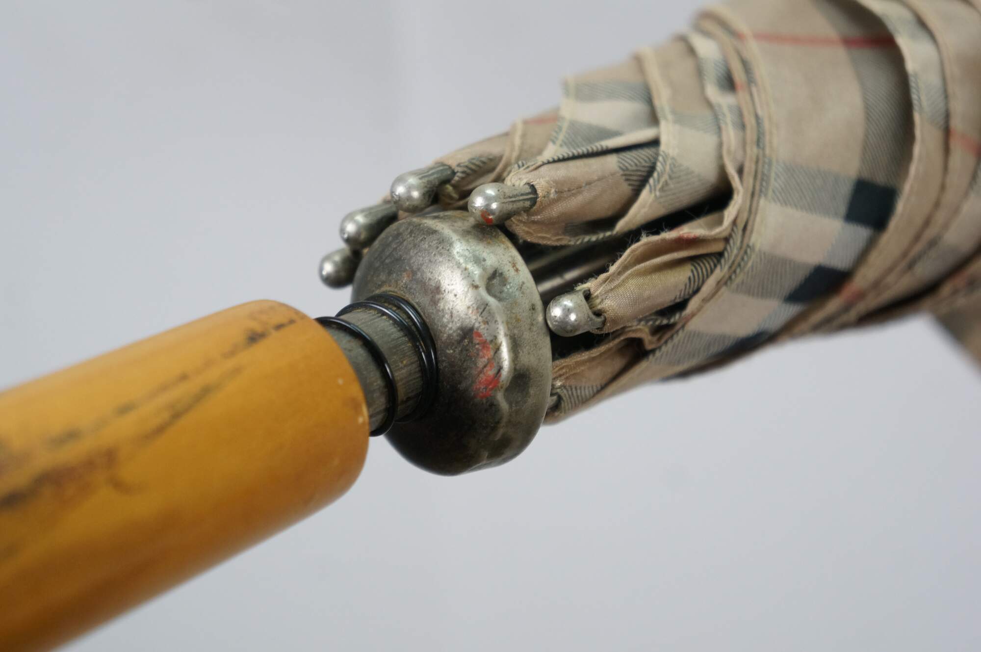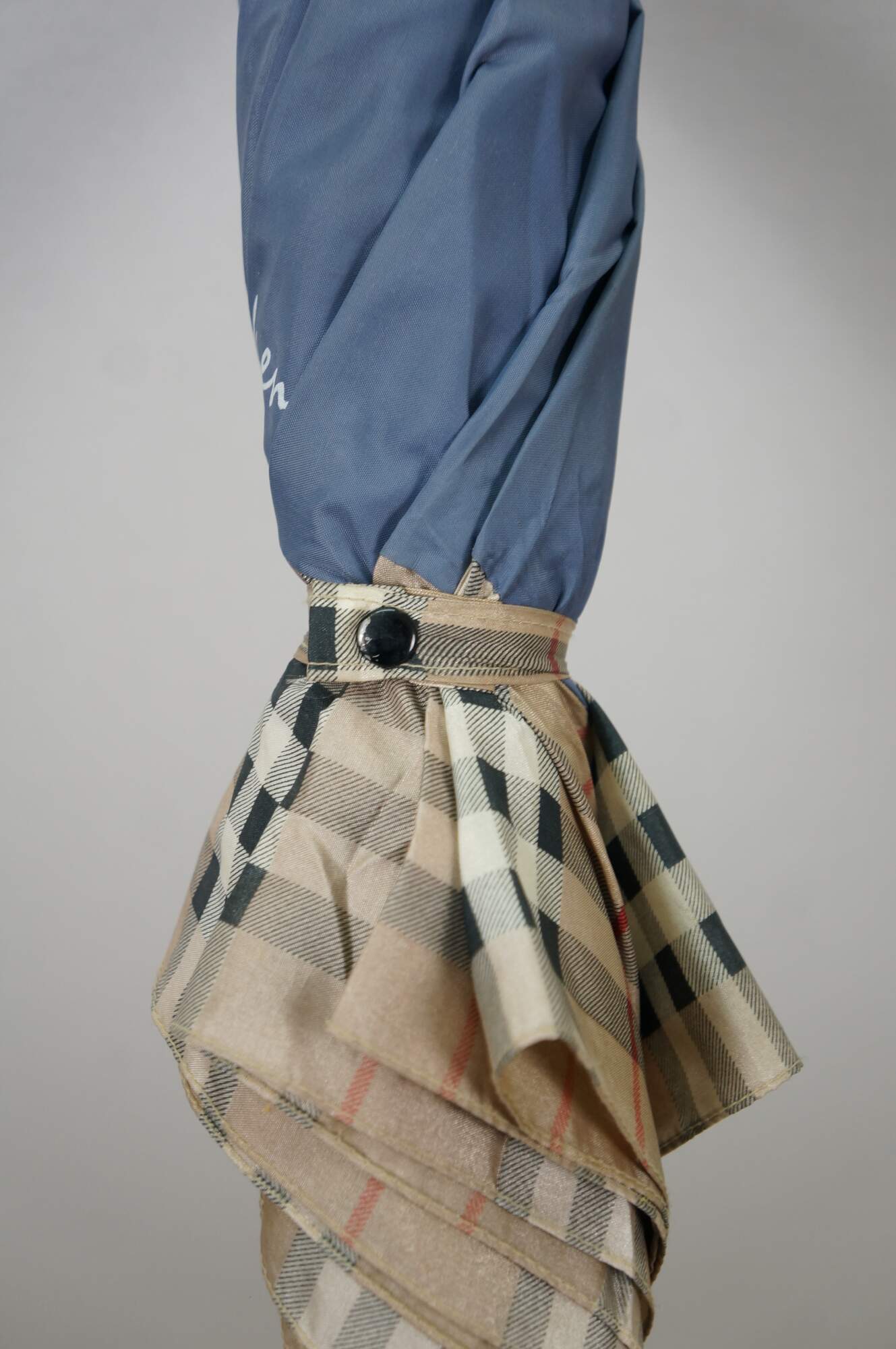 Late 20th century Burberry Week End umbrella. Light blue with tan Nova check plaid edge. Wood Handle. 100% Nylon - K.L. Umbrella - Fidra France for Burberry's Perfumes - 33-1-48 95 00 51 - Made in China.