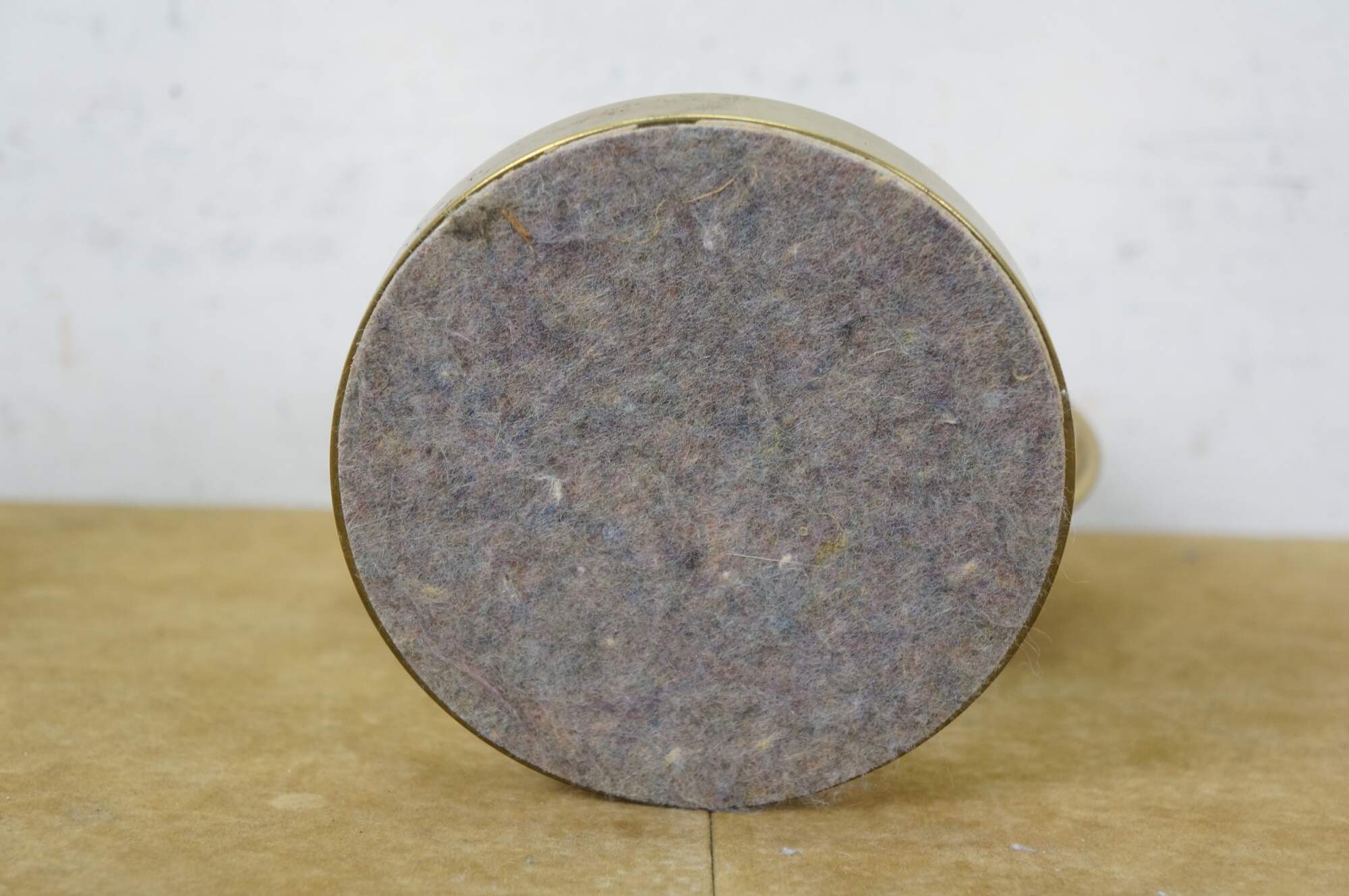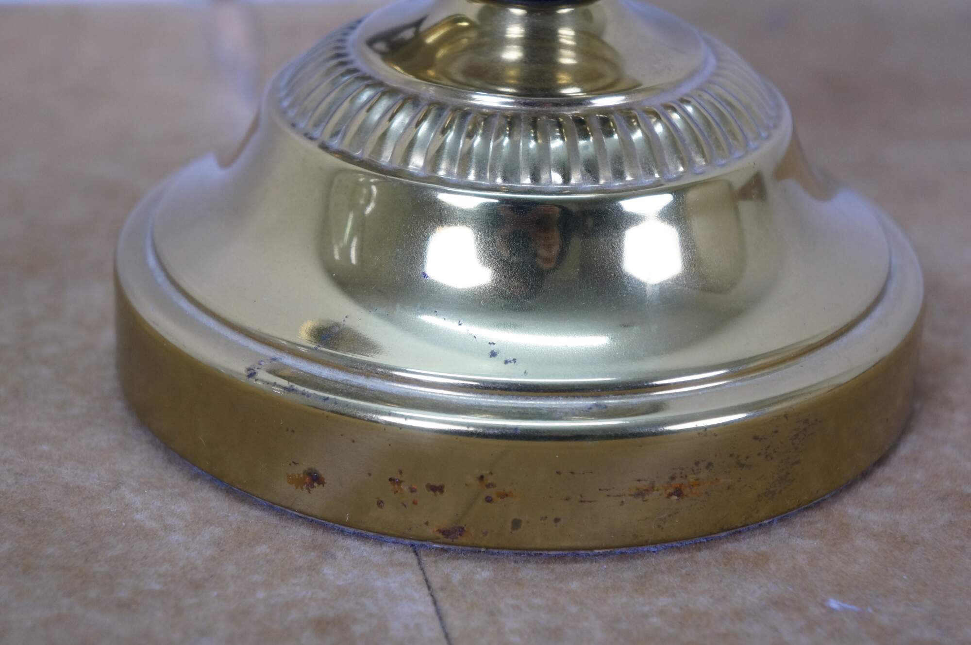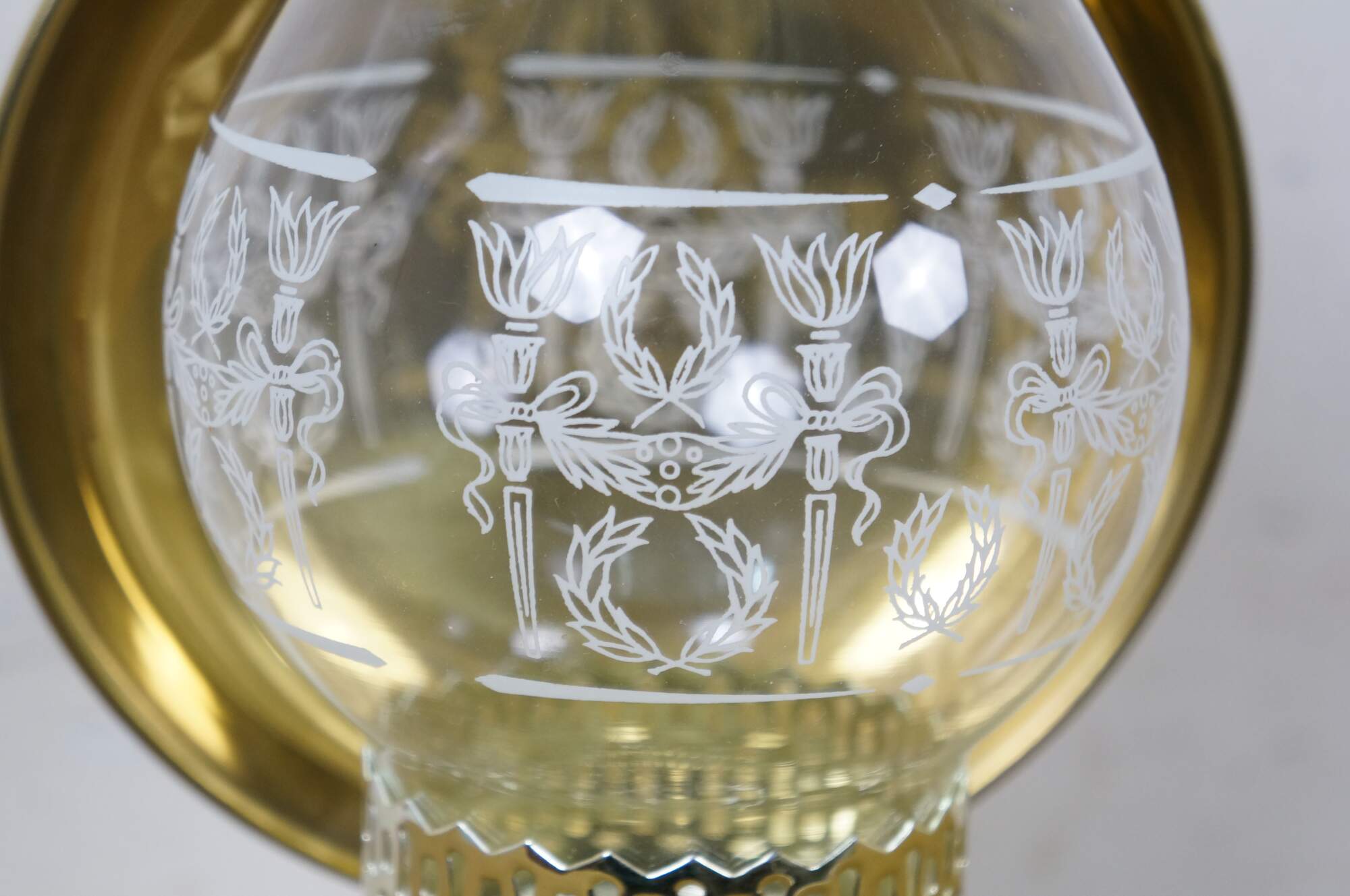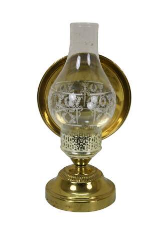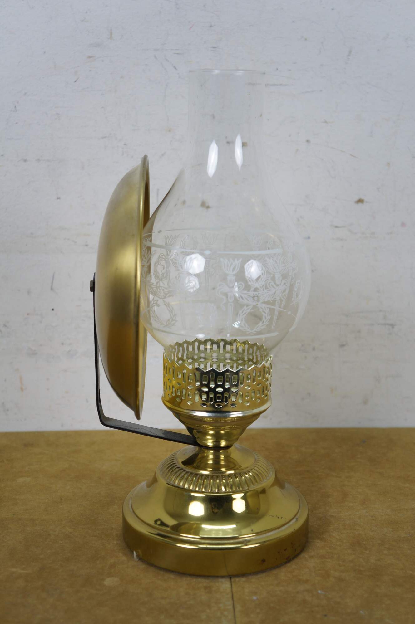 Vintage 20th century lacquered brass tabletop candle holder featuring an oil lamp chamberstick style base, single taper candle cup, attached reflector, and glass hurricane painted with neoclassical torches and wreaths.