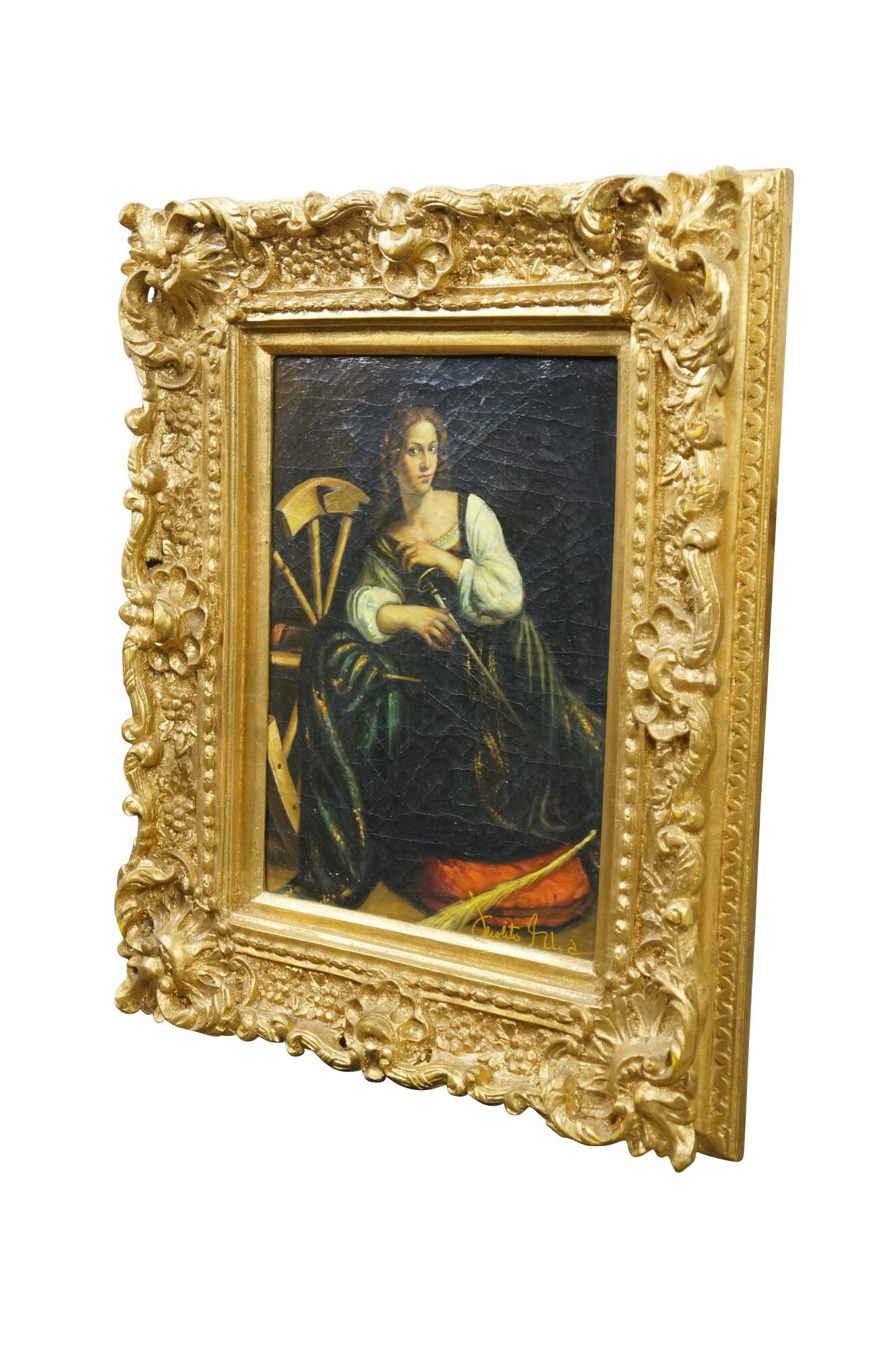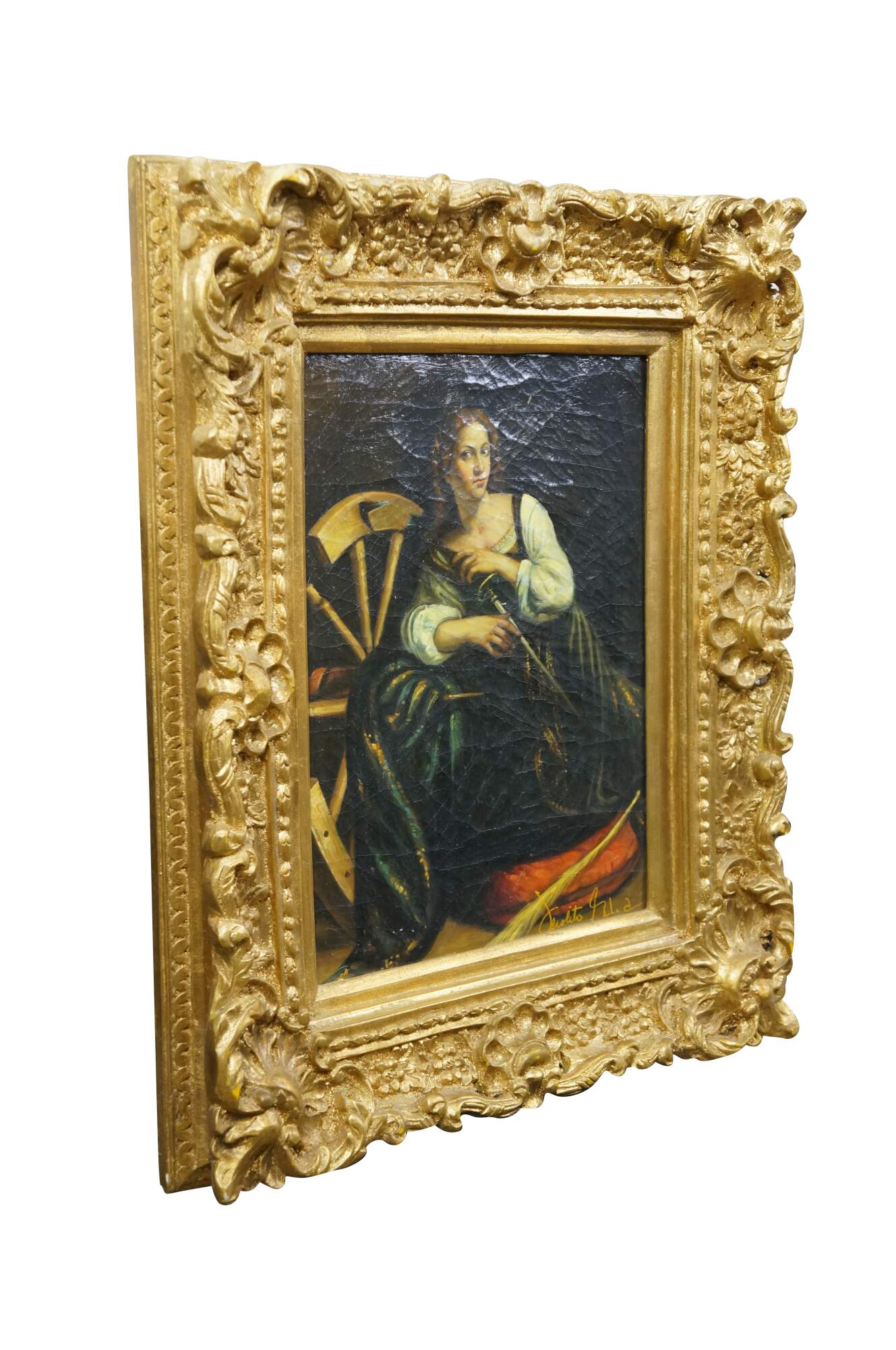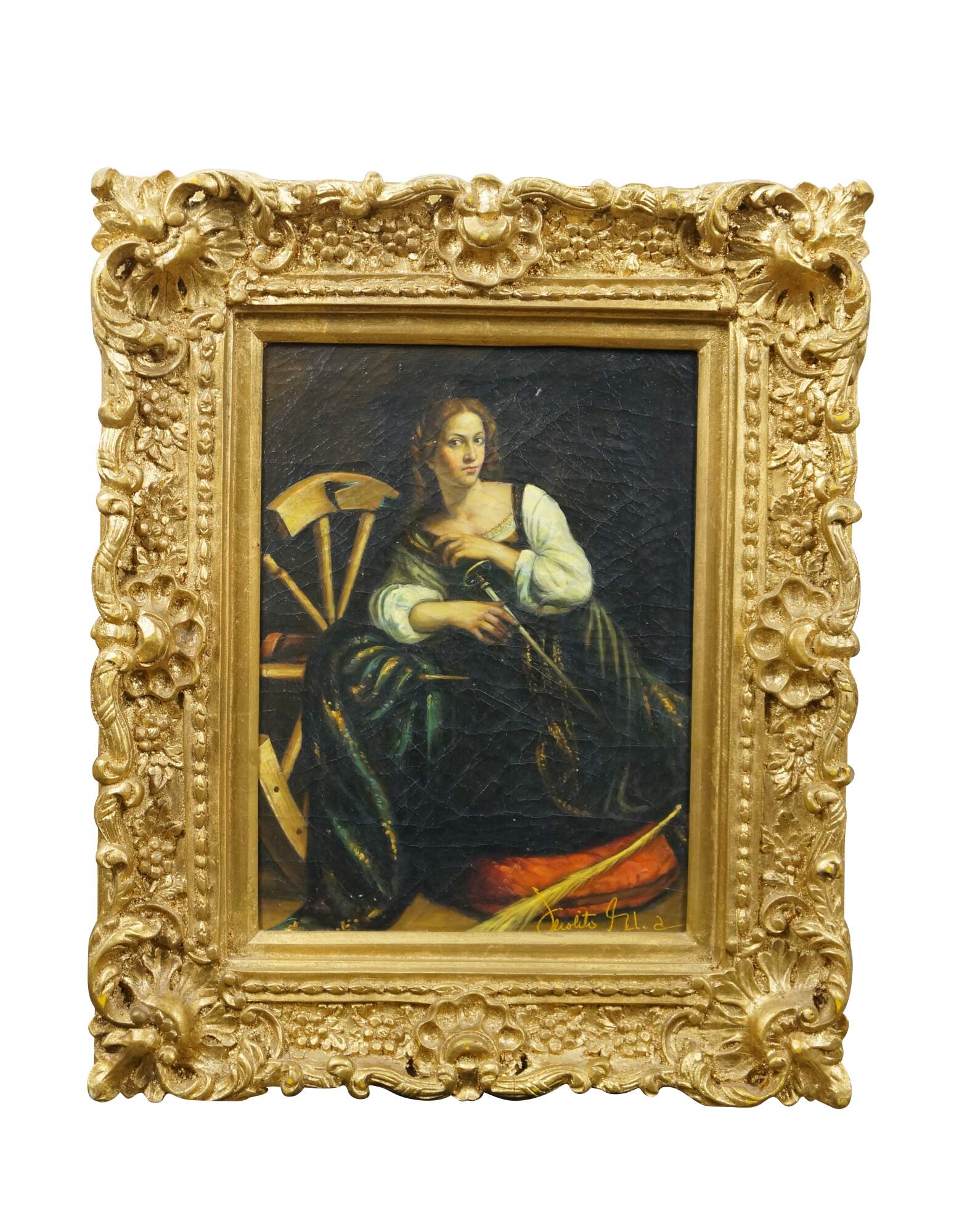 Late 20th century oil painting on linen after a circa 1598-99 portrait of "Saint Catherine of Alexandria" by Caravaggio. Depicts Saint Catherine kneeling on a red cushion by the wheel used to kill her, holding a sword. Ornate gilt composite frame, molded with a dense array of scallop, floral and foliate designs.