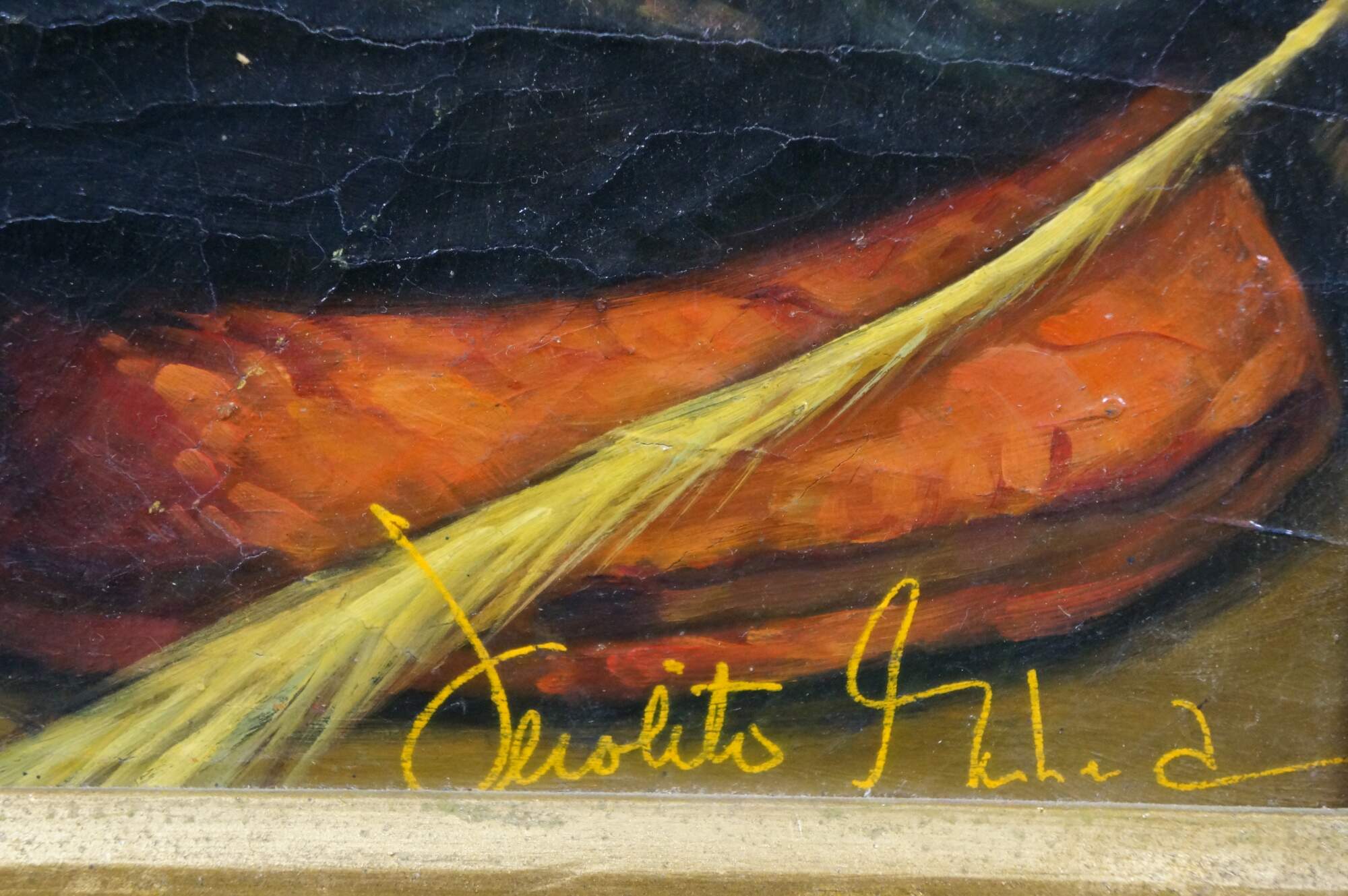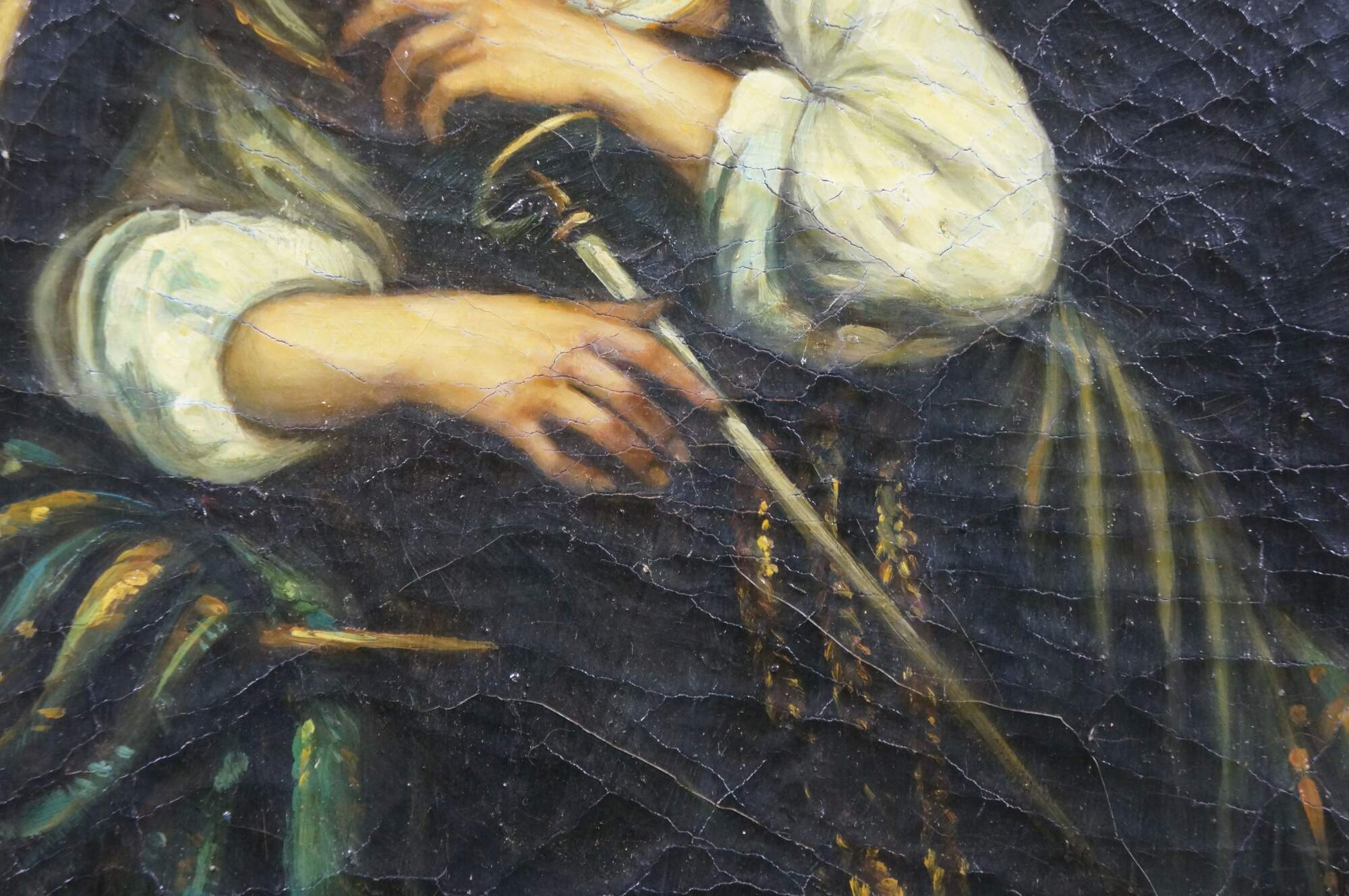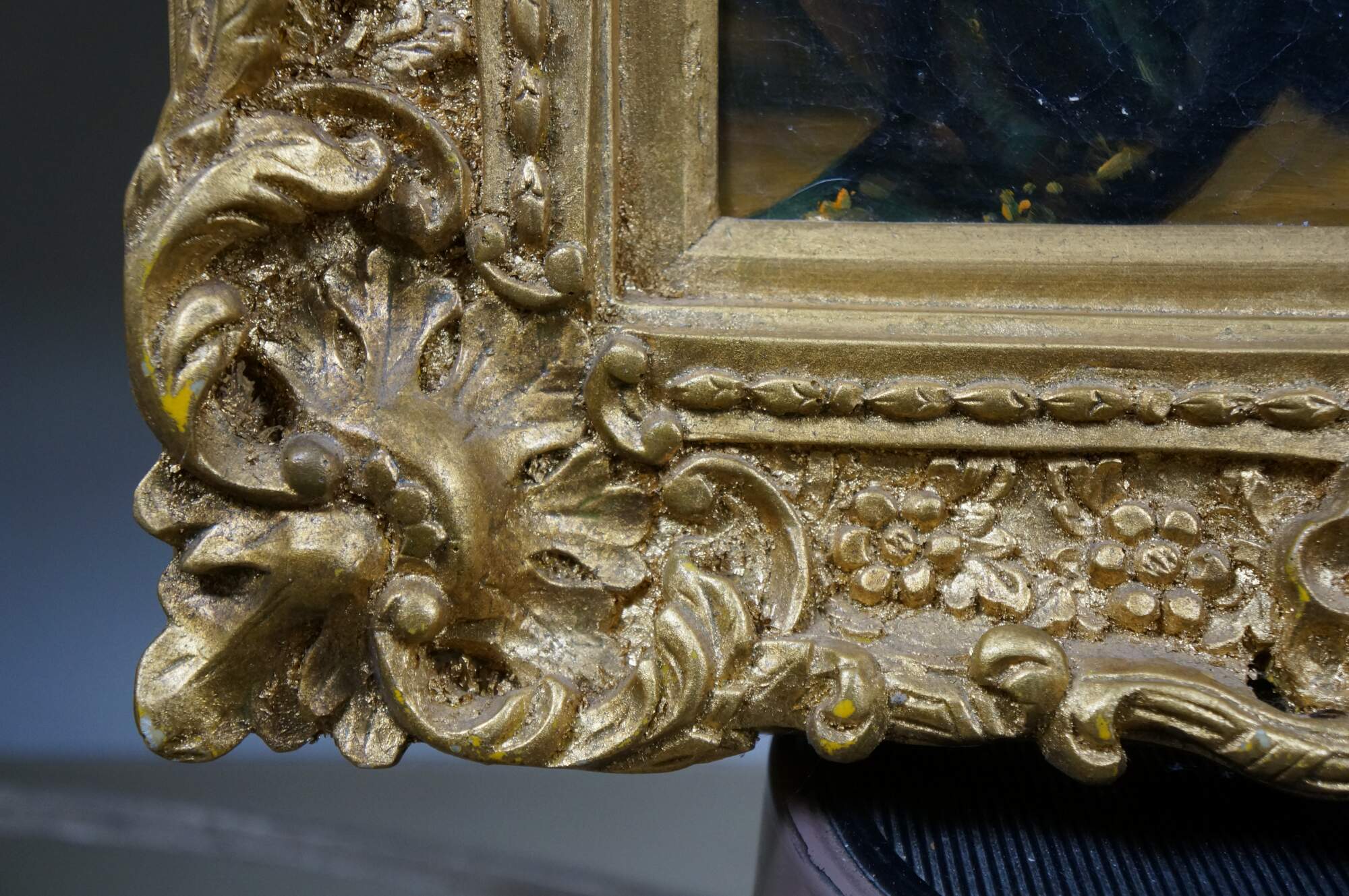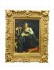 Late 20th century oil painting on linen after a circa 1598-99 portrait of "Saint Catherine of Alexandria" by Caravaggio. Depicts Saint Catherine kneeling on a red cushion by the wheel used to kill her, holding a sword. Ornate gilt composite frame, molded with a dense array of scallop, floral and foliate designs.
