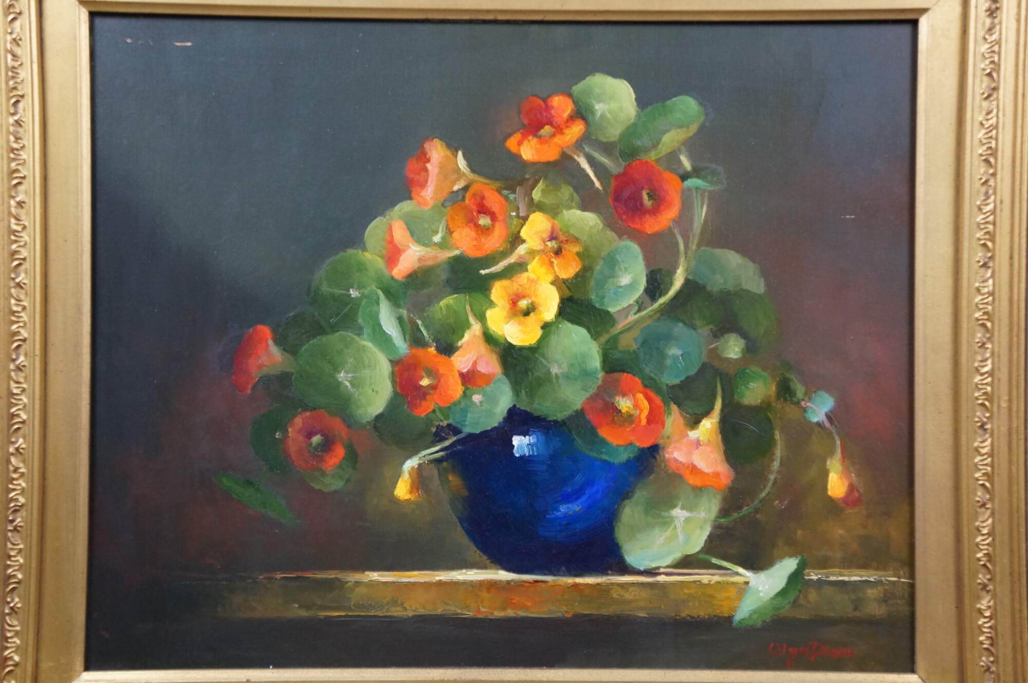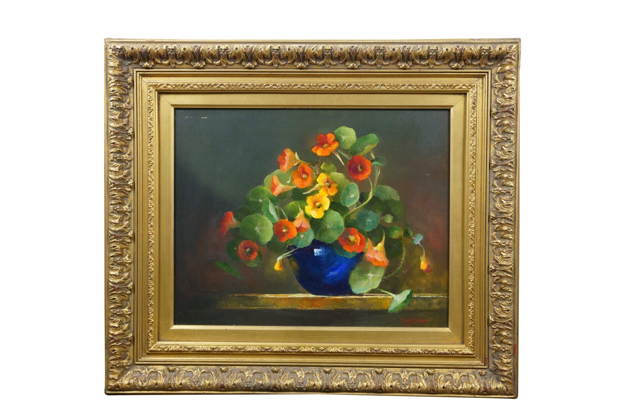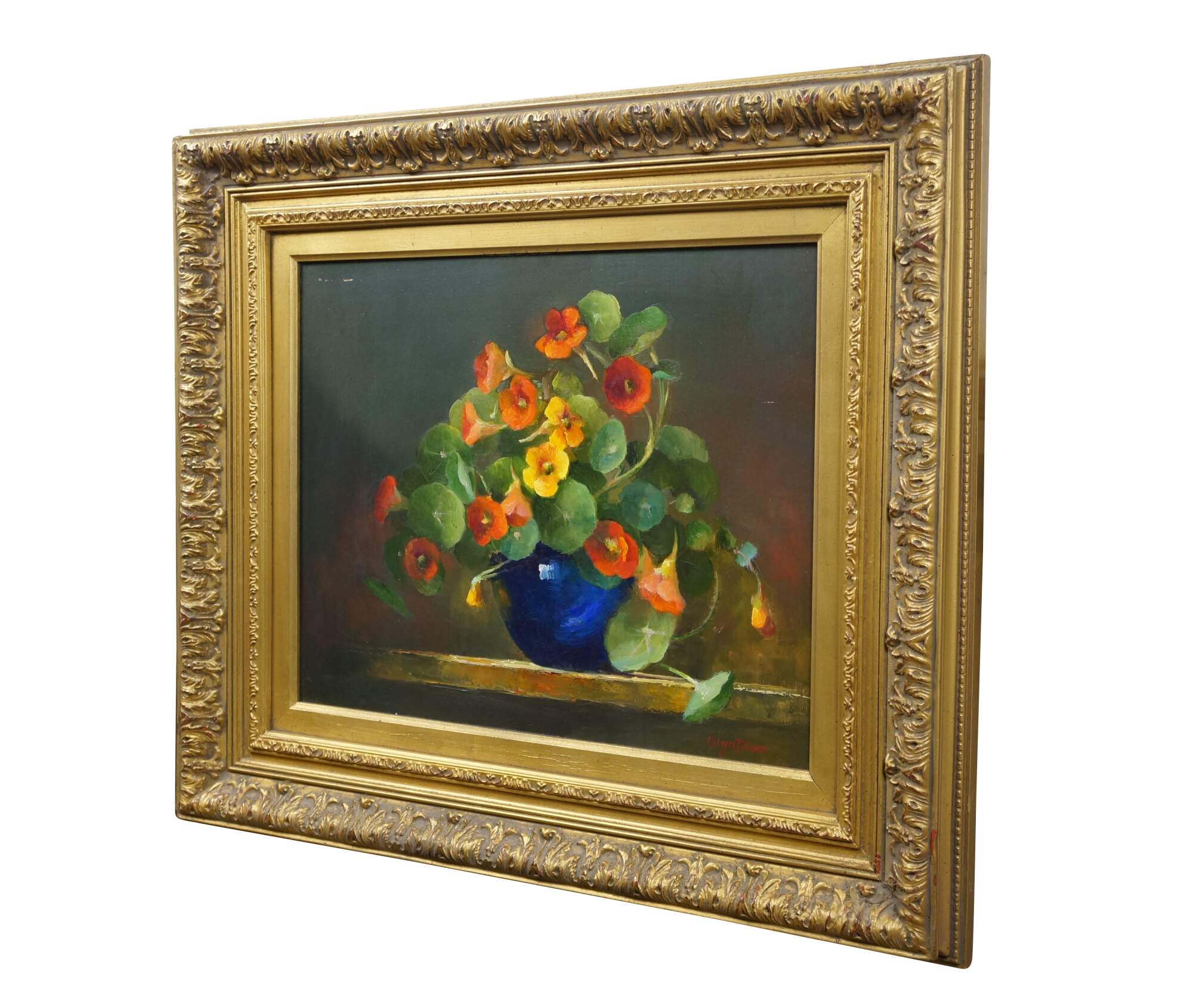Late 20th century oil on board still life painting by Olga Plam, depicting a bouquet of orange and yellow flowers in a blue vase. Signed, lower right. Gilt wood and composite frame with foliate trimmed bevel and acanthus leaf and lily border.