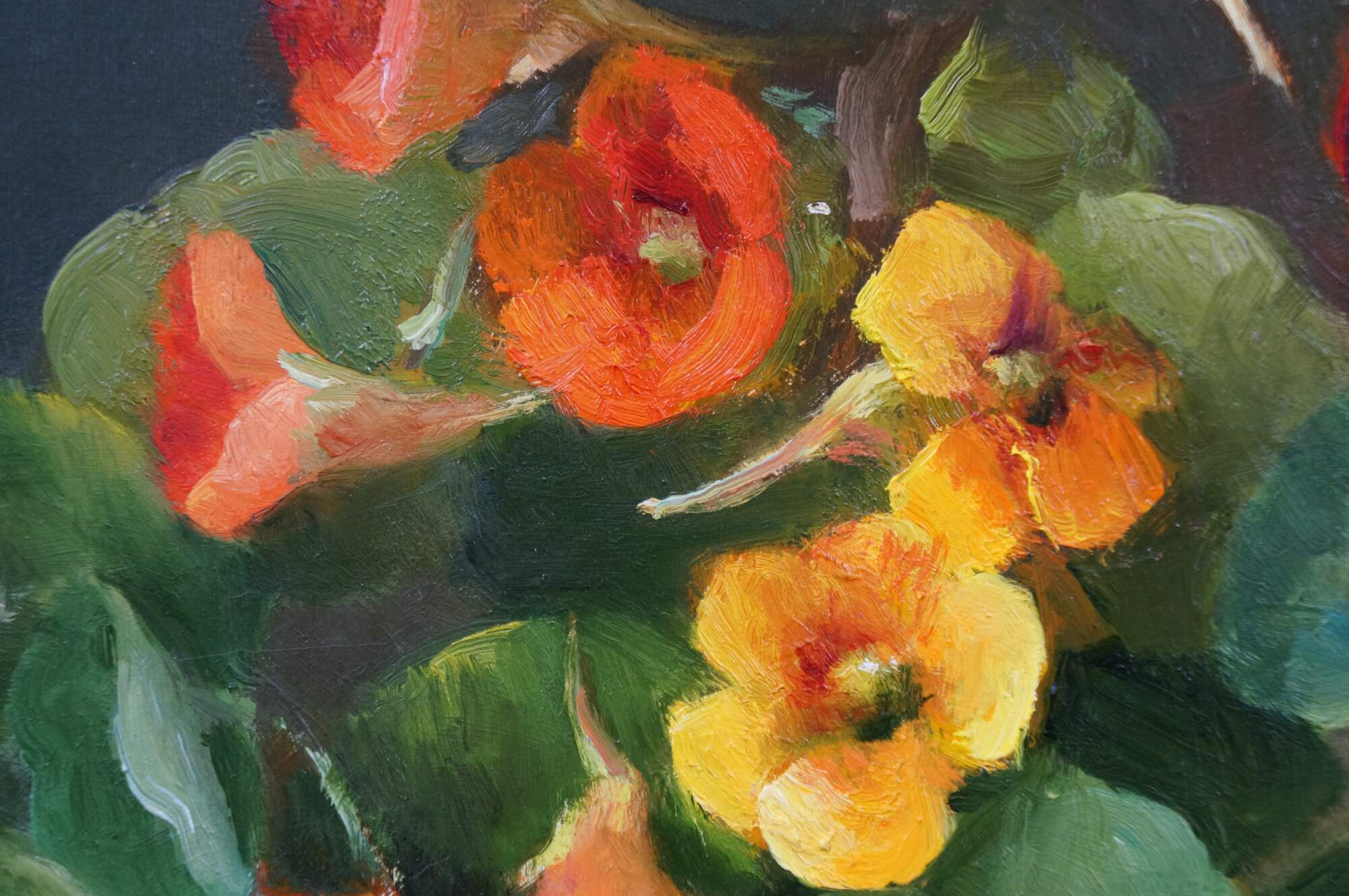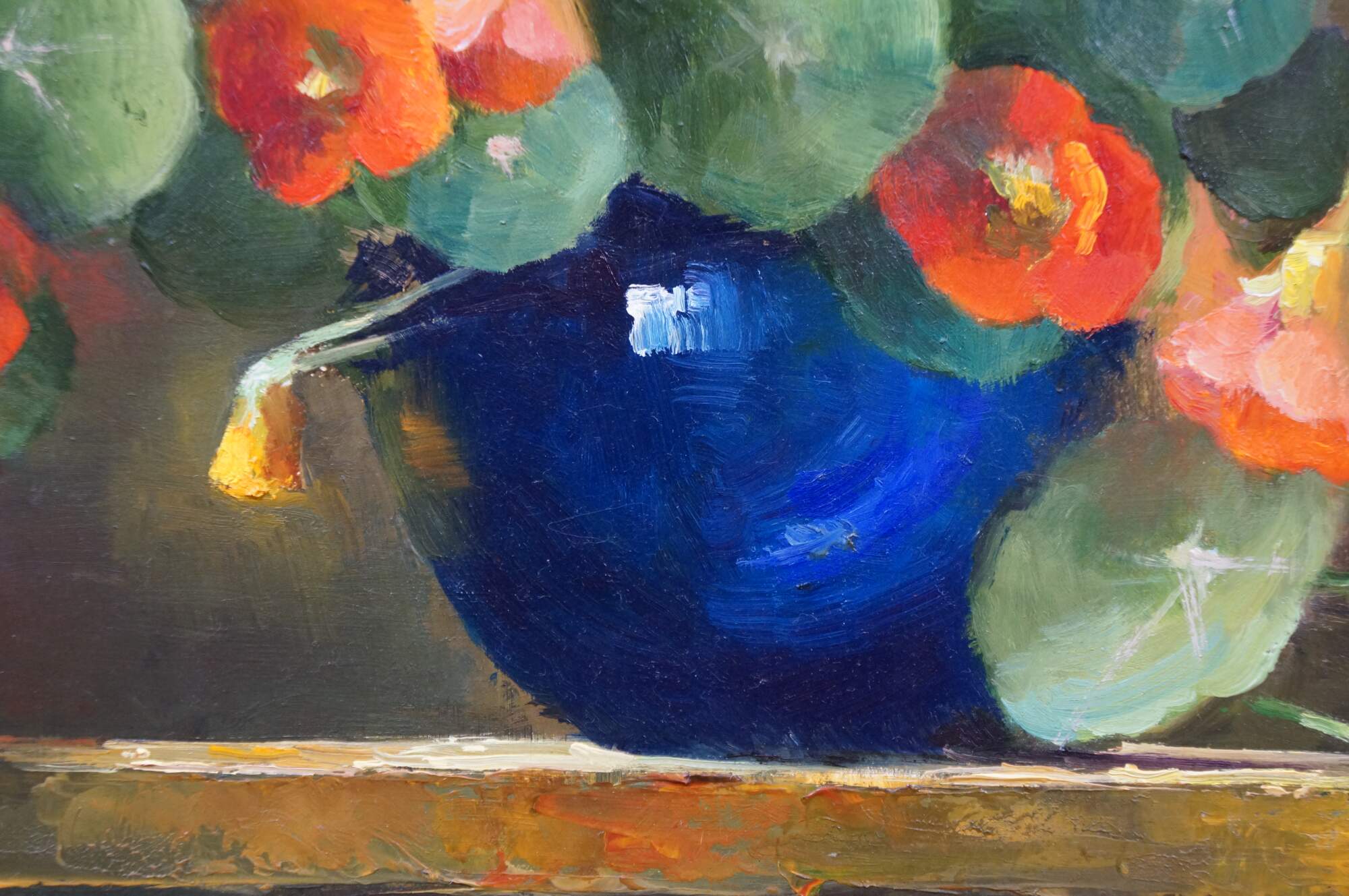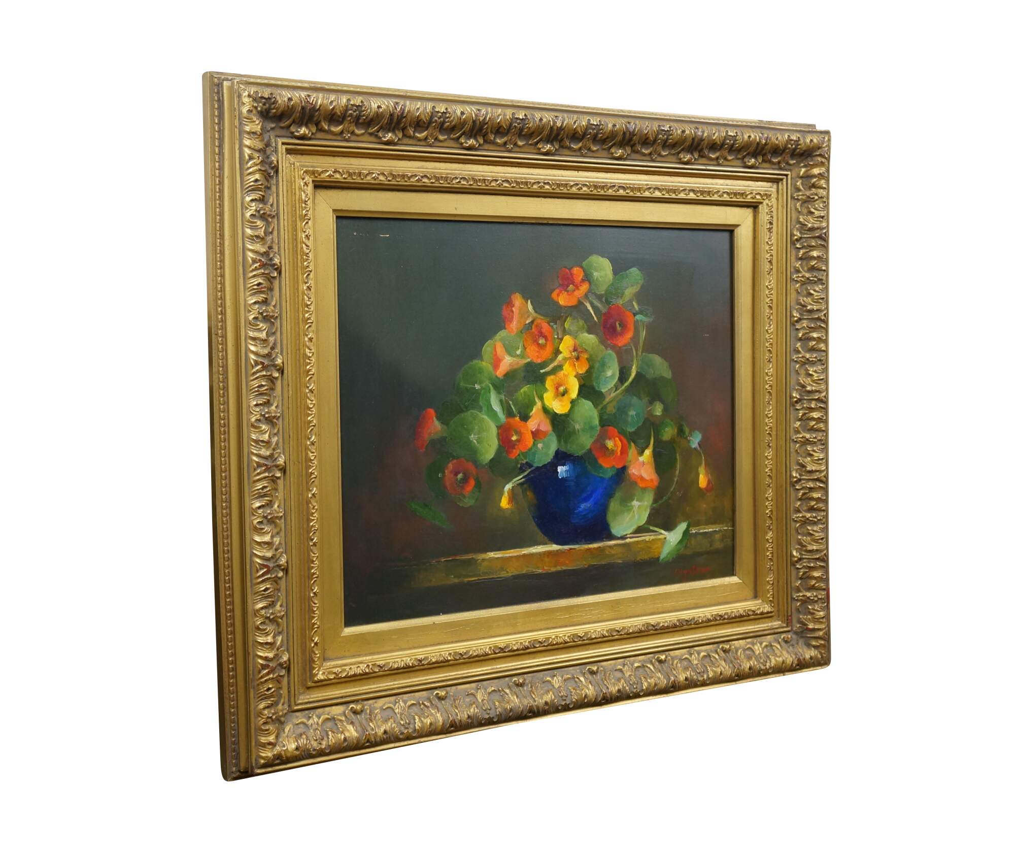 Late 20th century oil on board still life painting by Olga Plam, depicting a bouquet of orange and yellow flowers in a blue vase. Signed, lower right. Gilt wood and composite frame with foliate trimmed bevel and acanthus leaf and lily border.