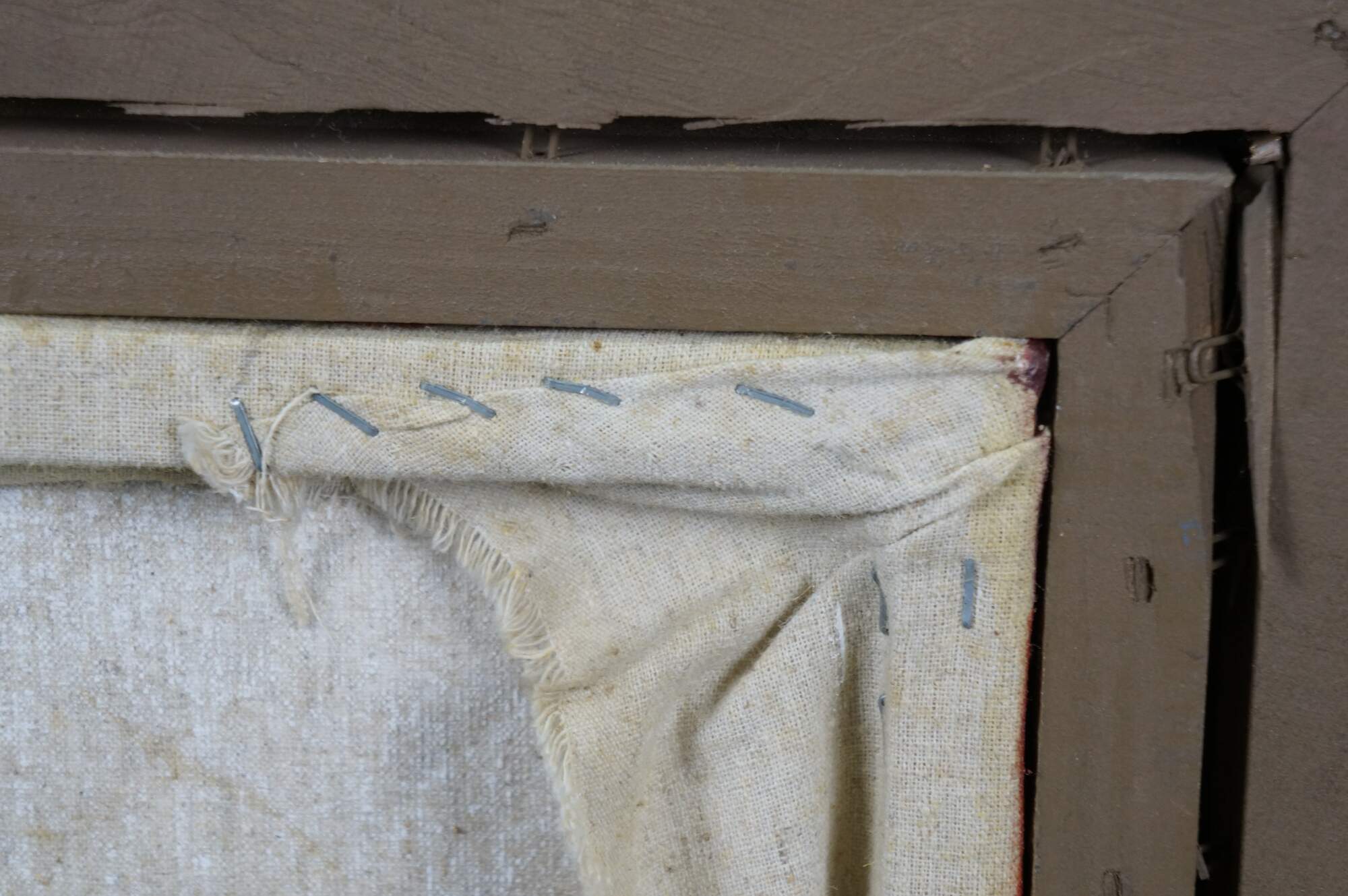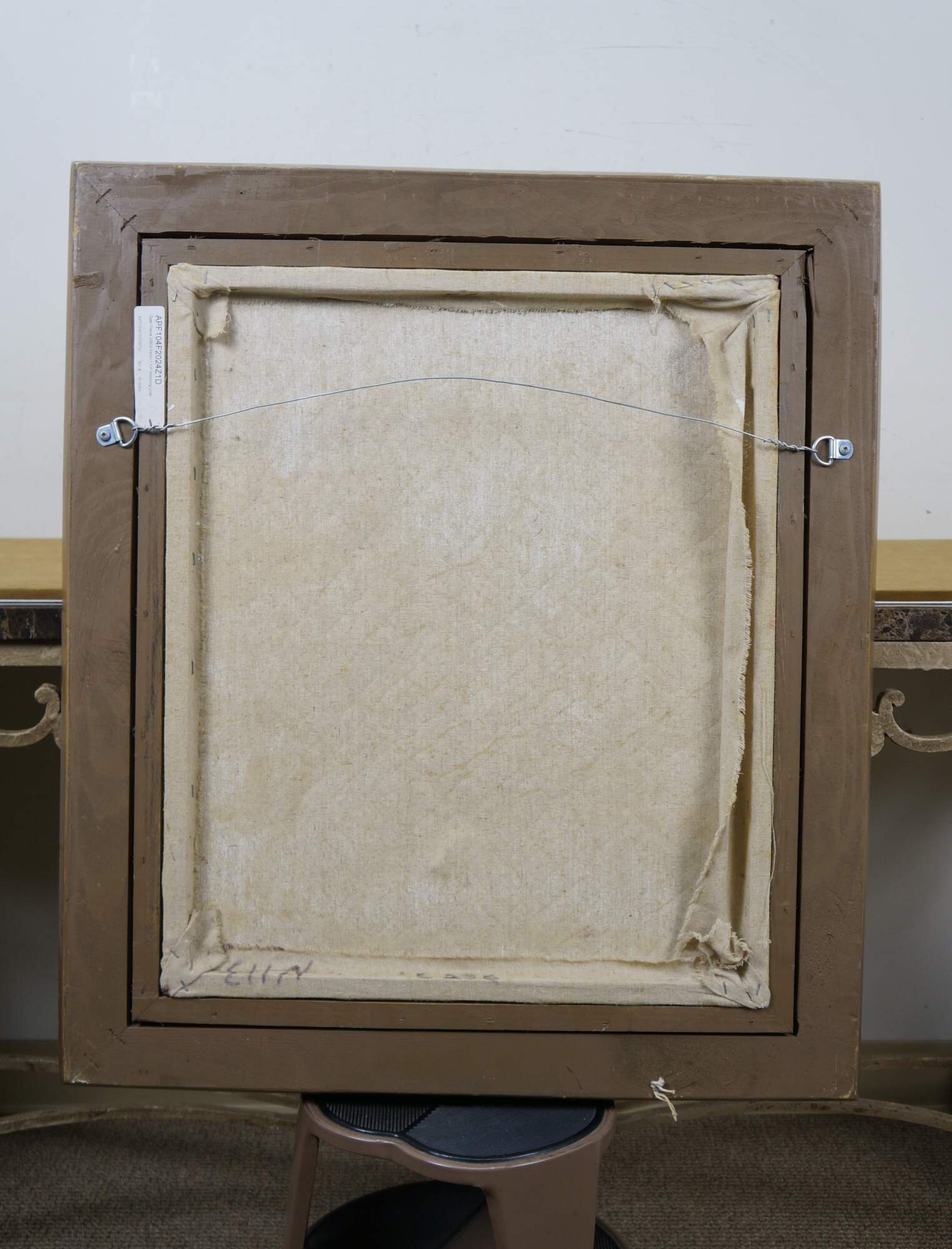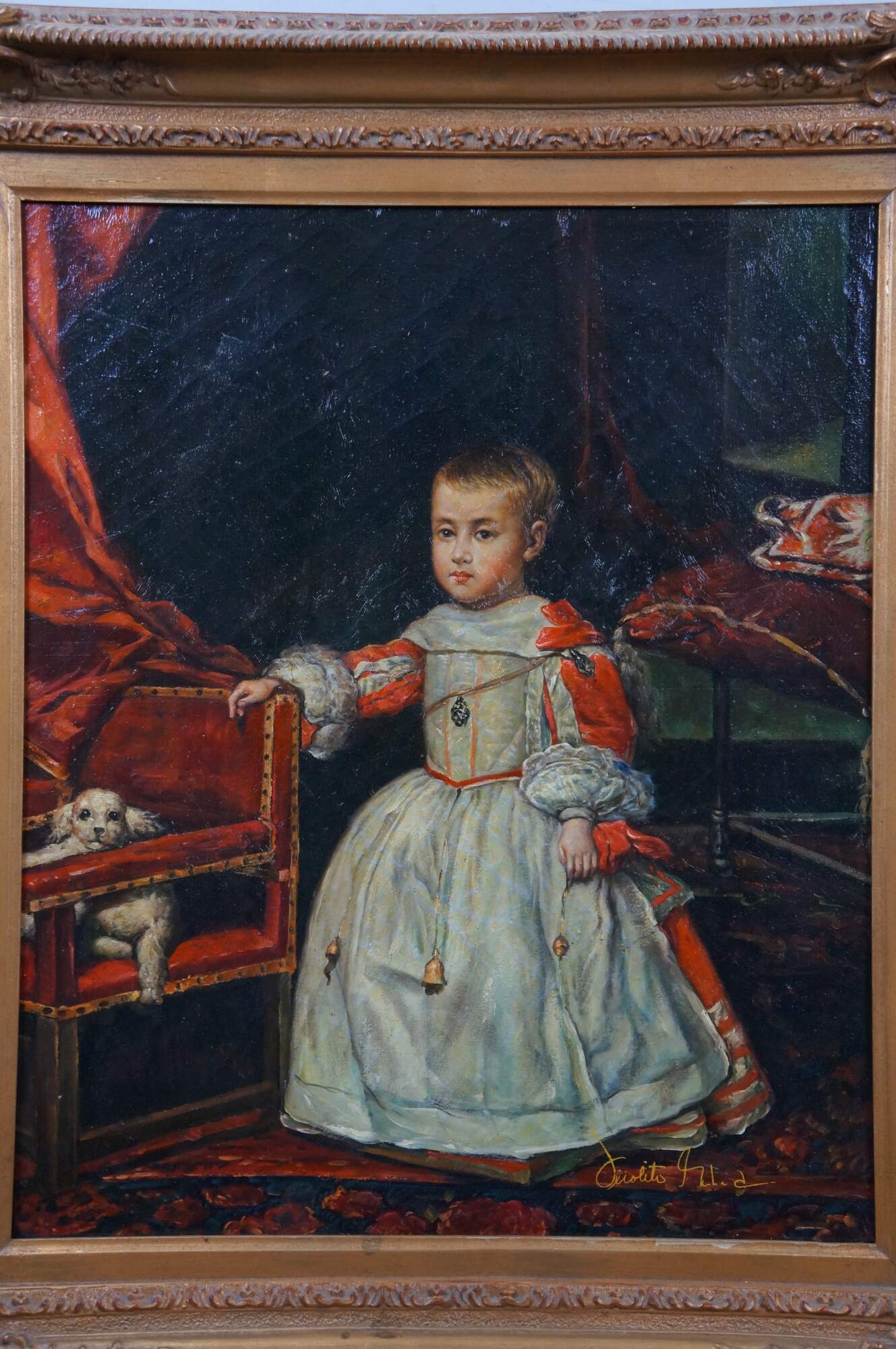 Late 20th century oil on canvas portrait painting after a work depicting the infant Prince Philip Prospero, originally painted in 1659 by Diego Velazquez. "The painting depicts Philip Prospero, Prince of Asturias (Madrid, November 20, 1657 - Madrid, November 1, 1661), the short lived heir to the Spanish crown, who died aged only 3 years old. He was the third son and the first from the marriage of Philip IV of Spain and Mariana of Austria. In this portrait, the child is standing, he wears a dress typical of toddlers, while he rests his right arm on an armchair, which seems to grant him more compassion than majesty, since his health was precarious as evidenced by the amulets that he carries. On the chair, at the left, there is a lapdog, whose watery look accentuates the melancholy of the scene. The subject of the painting is located in a room, and in the background there is an open door through which light enters. To the right there is a stool with a cushion on which a hat is placed. Red tones predominate in the work and the dark tones of the background increase the contrast between the colors." (Wikipedia) Signed, lower right. Gilt composite frame with foliate and rope twist trim, and scallop shell and floral corners.