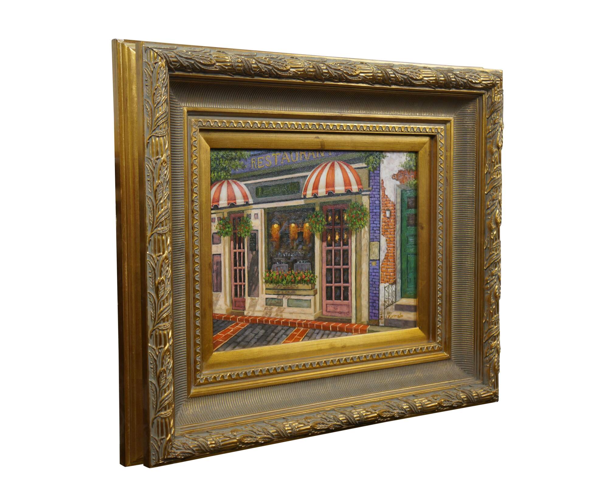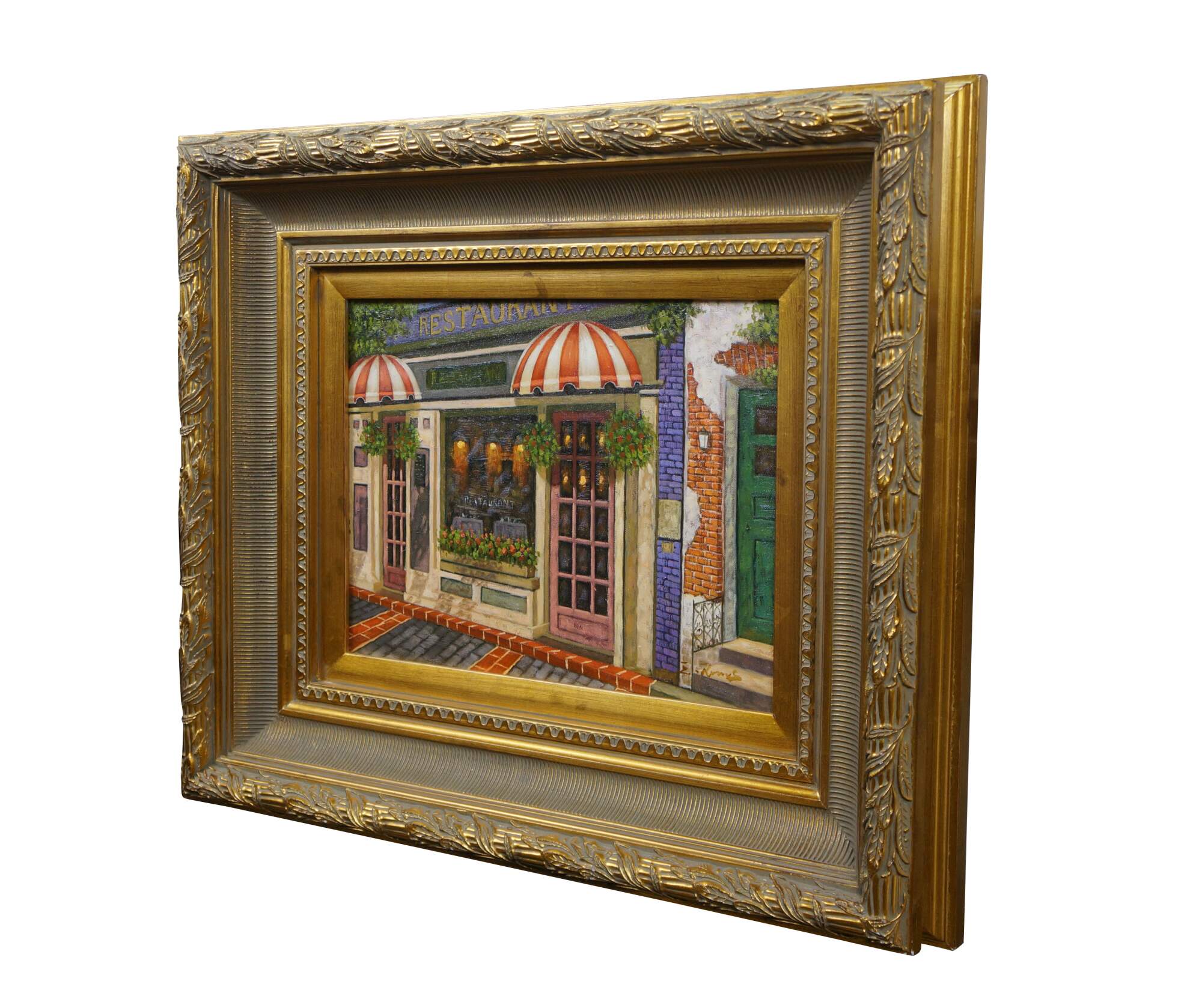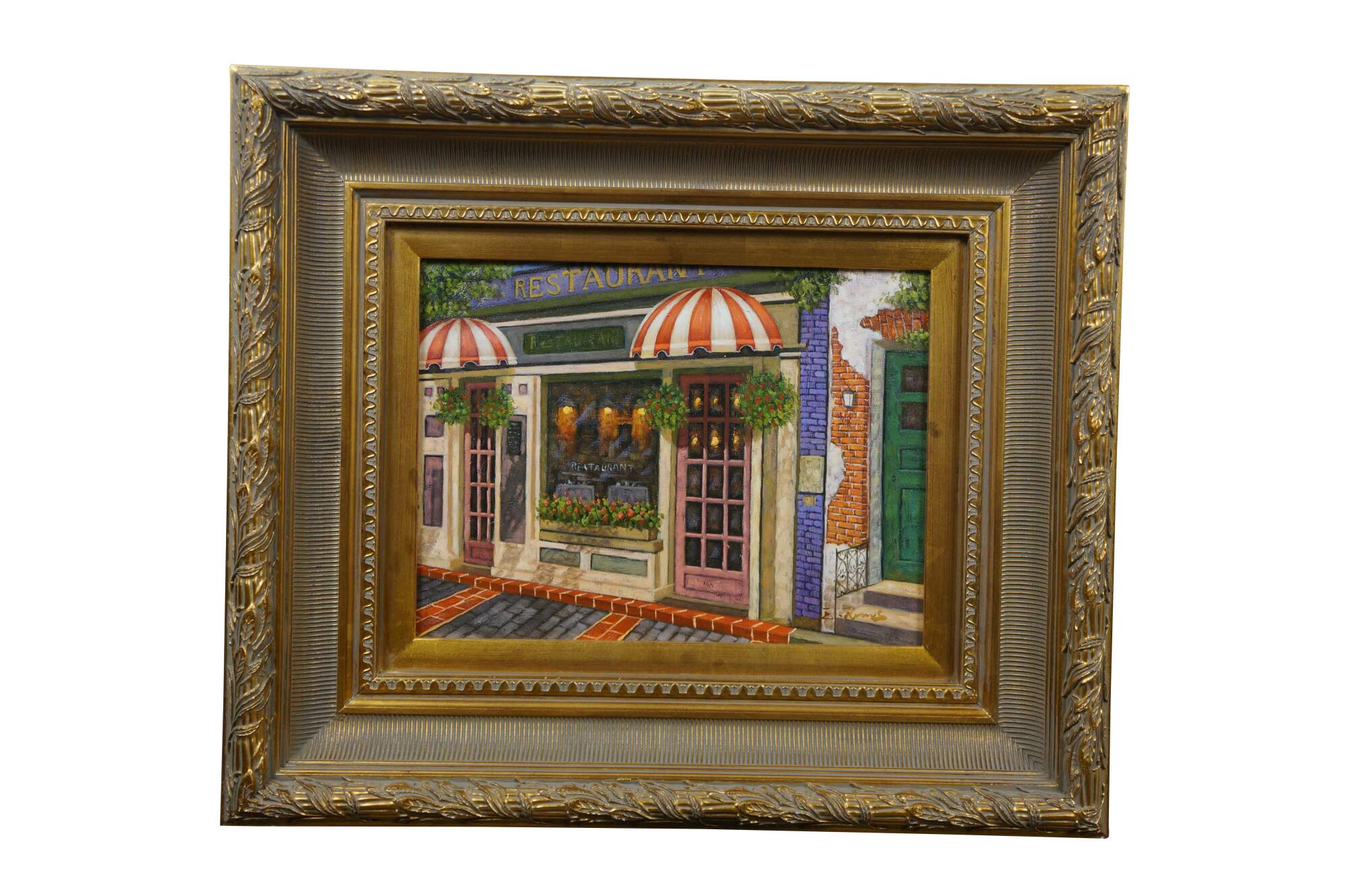 Late 20th century oil on canvas painting depicting a quaint city restaurant fascade with red and white awnings. Produced for Timeless Treasures. Signed, lower right. Gilt wood and gesso frame with a scalloped inner edge, groooved bevel and wrapped vine / foliate border. Certificate of Authenticity Number AFD131531.
