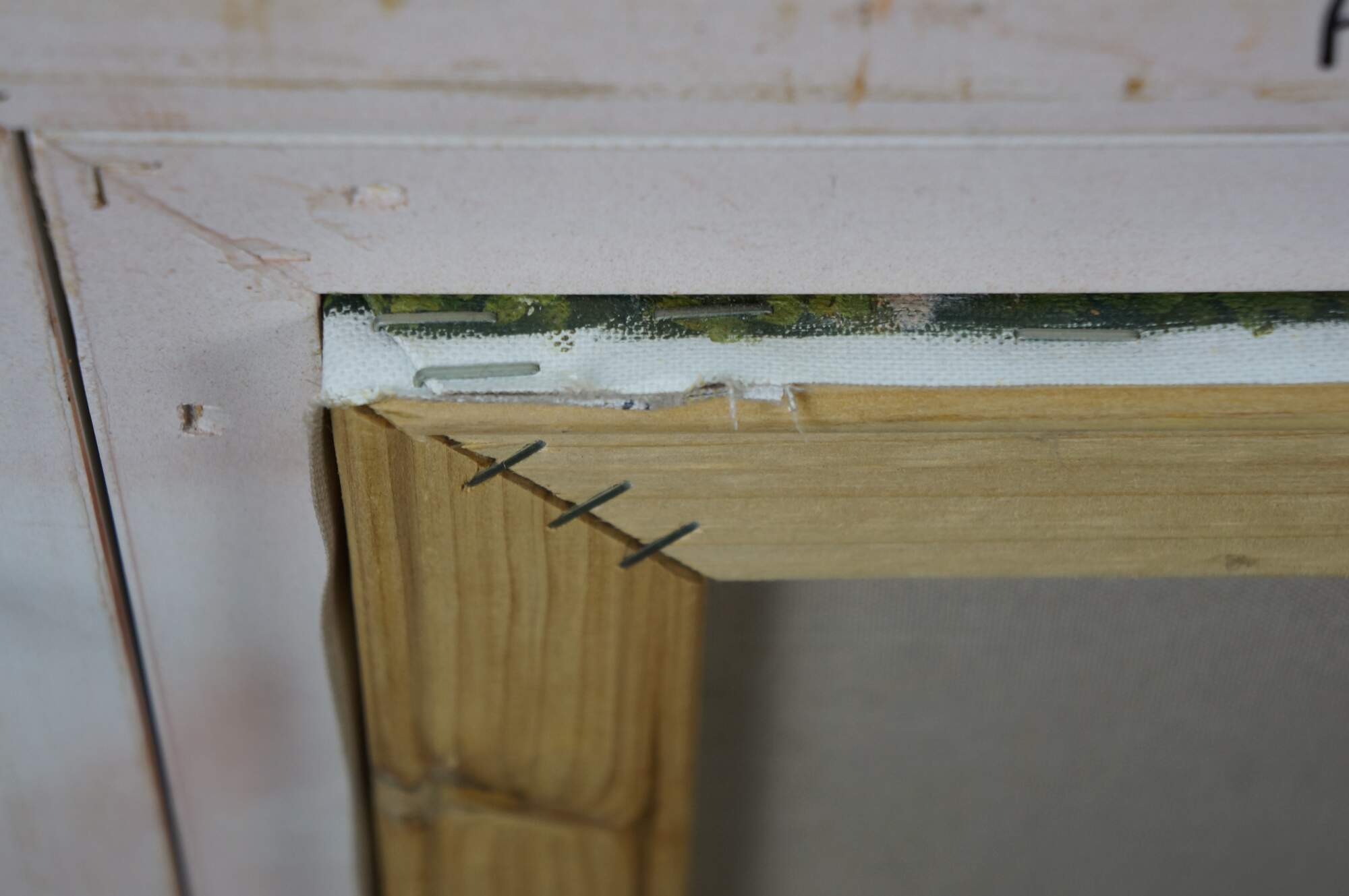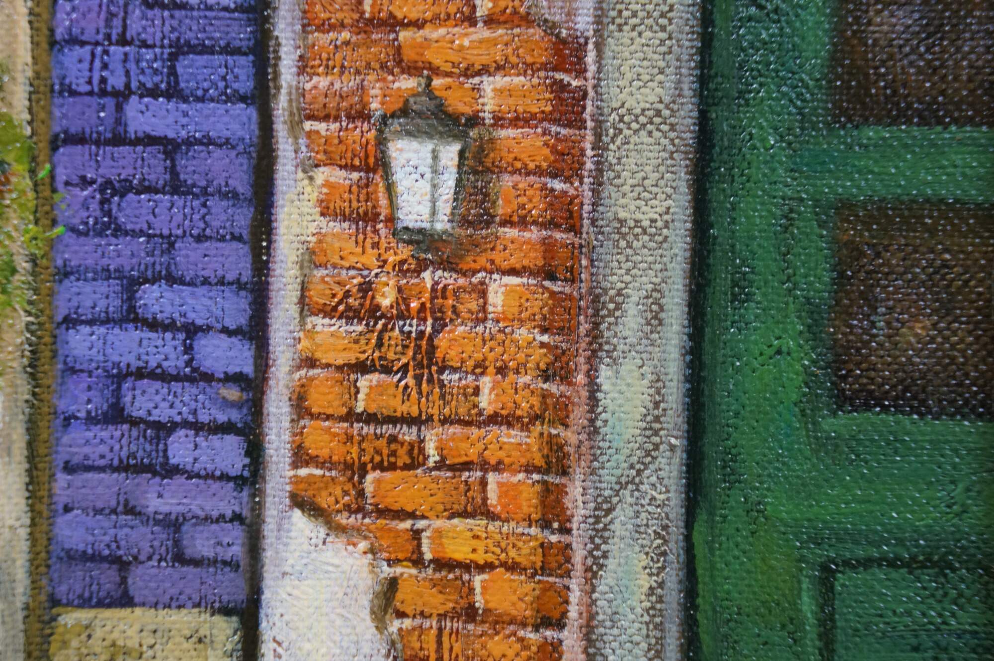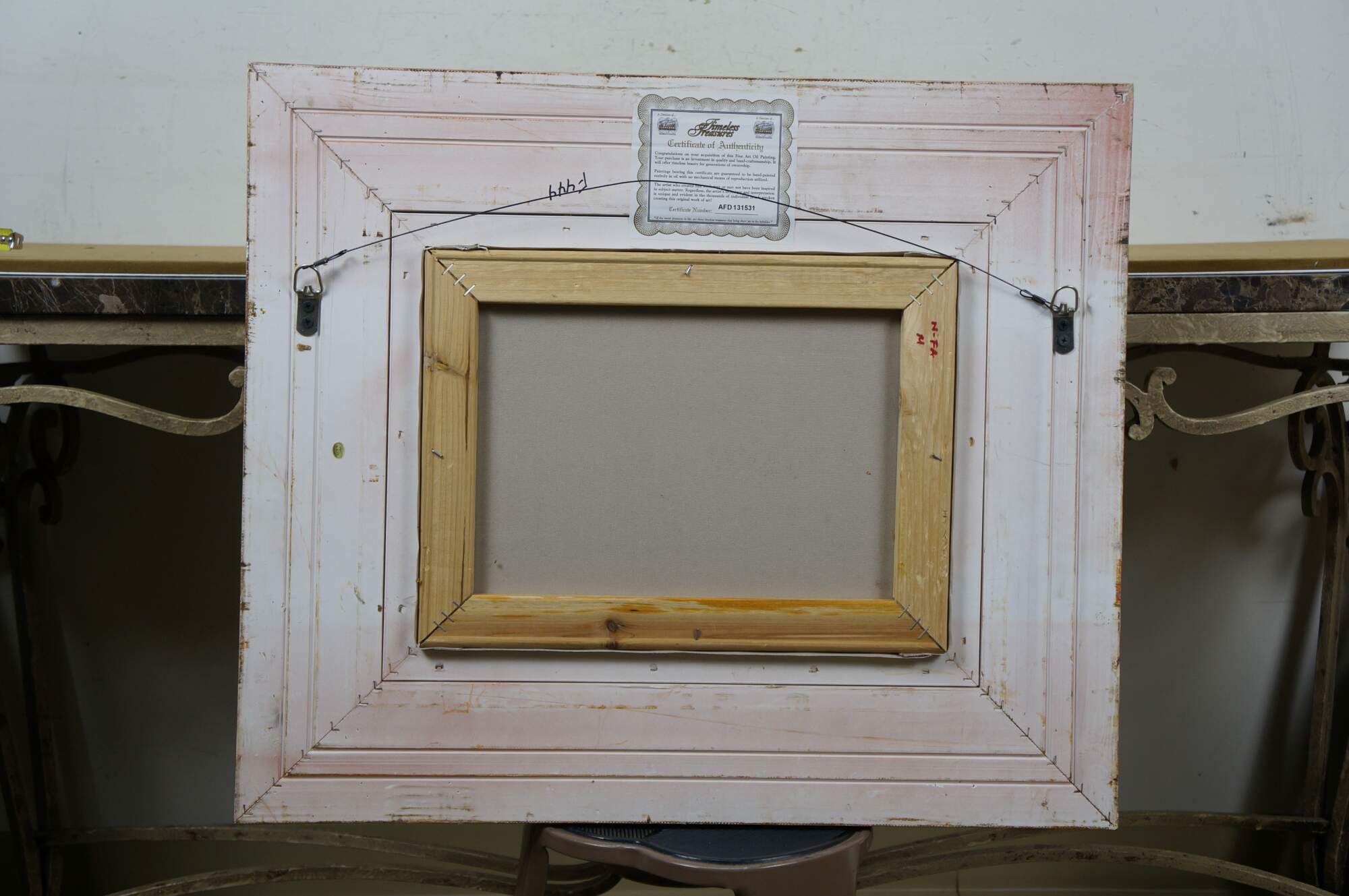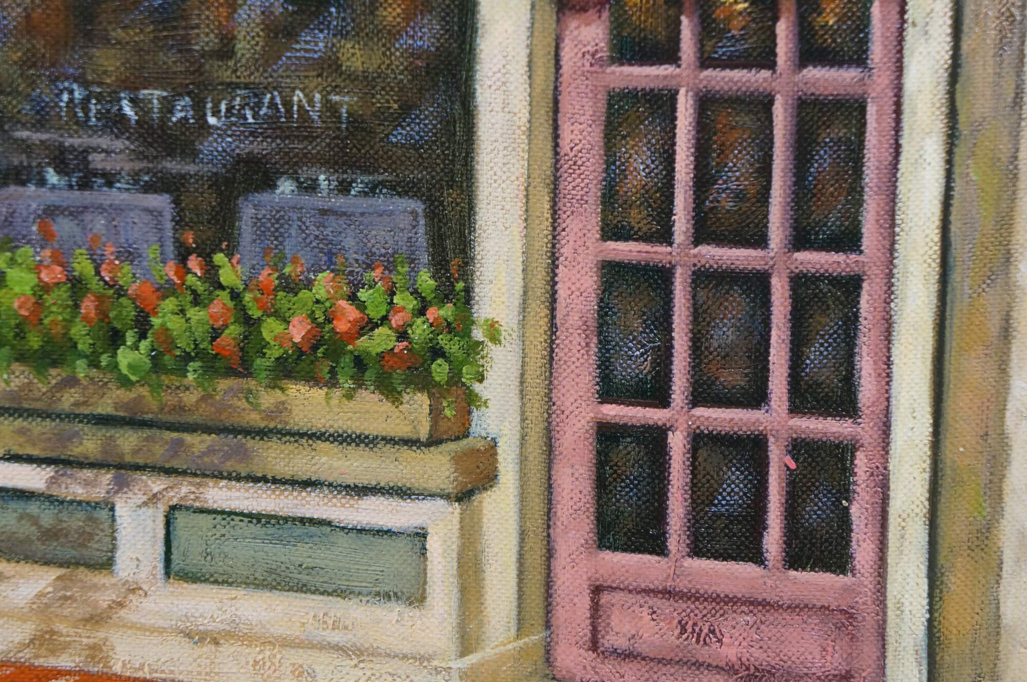 Late 20th century oil on canvas painting depicting a quaint city restaurant fascade with red and white awnings. Produced for Timeless Treasures. Signed, lower right. Gilt wood and gesso frame with a scalloped inner edge, groooved bevel and wrapped vine / foliate border. Certificate of Authenticity Number AFD131531.
