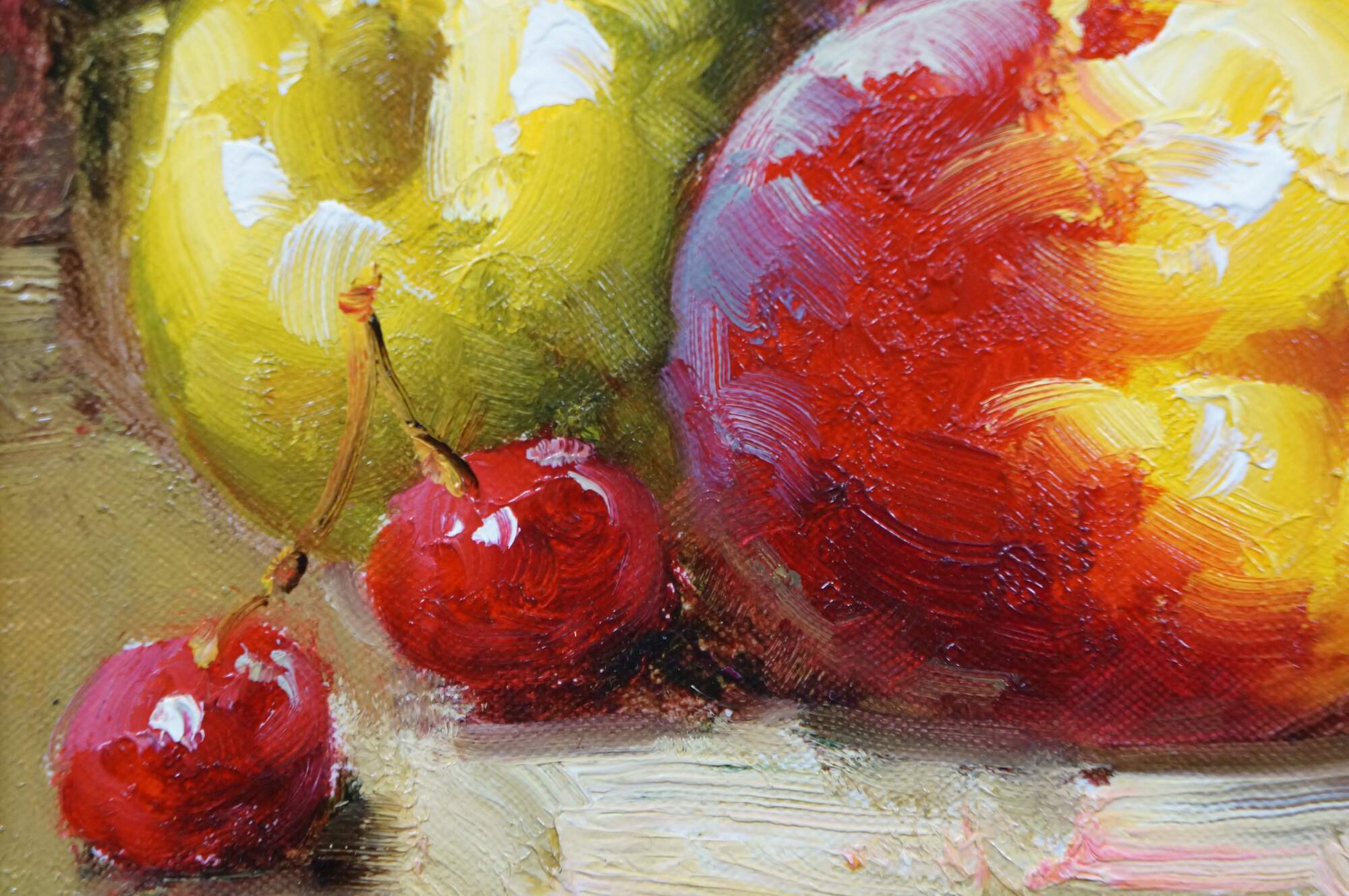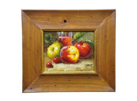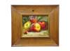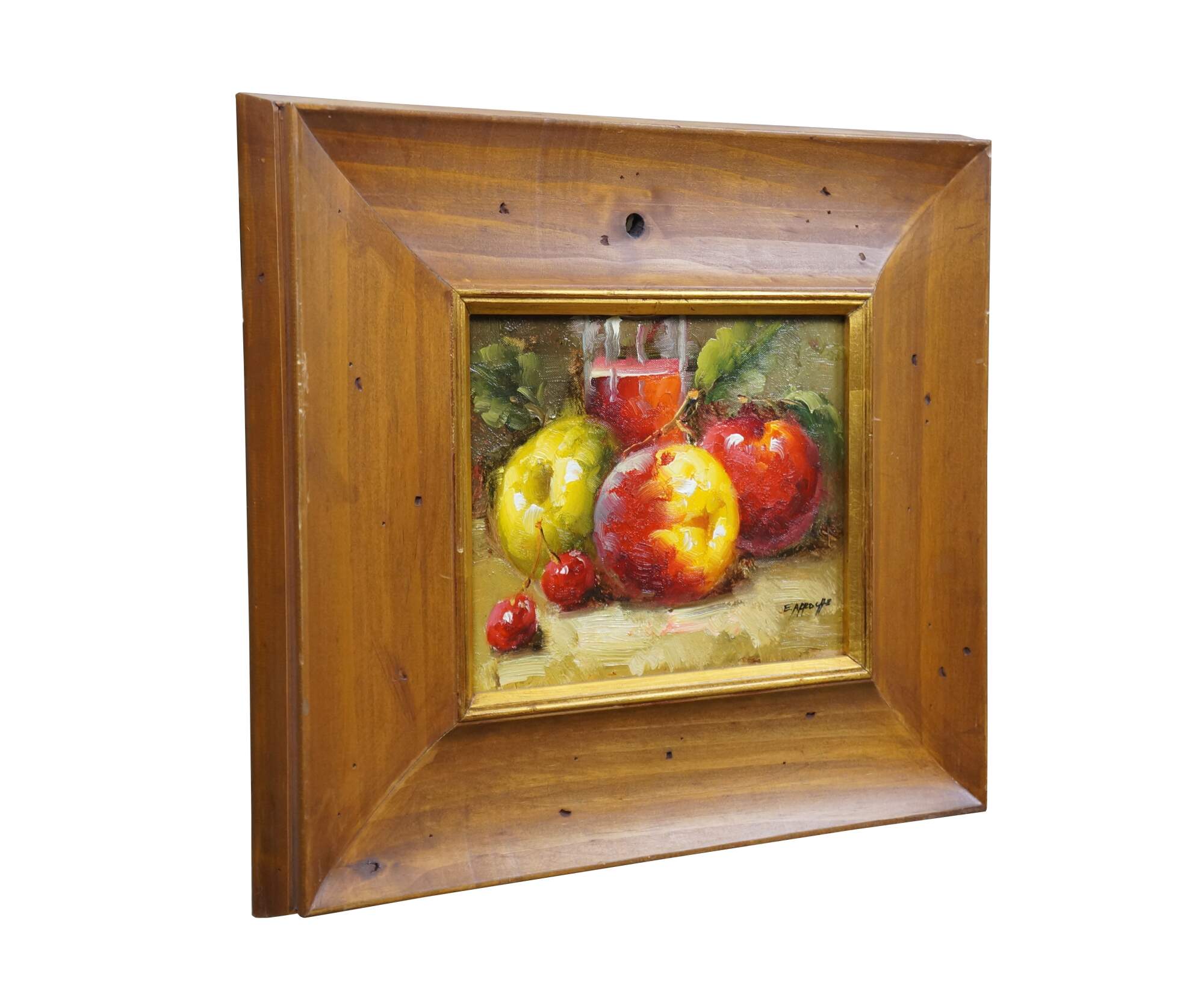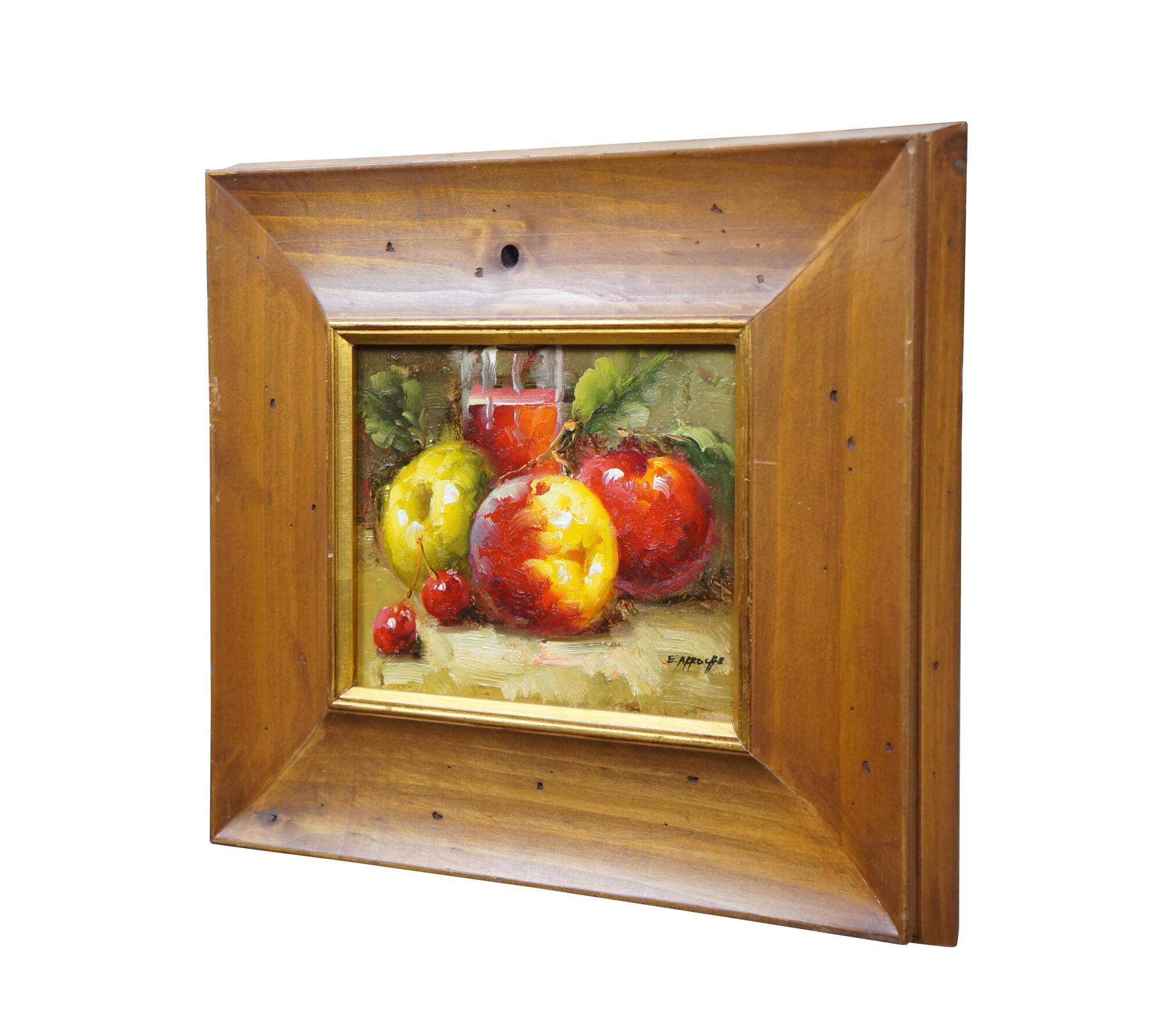 Late 20th century oil on board still life painting despicting a group of red and yellow apples and cherries. Signed lower right. Pine wood frame.
