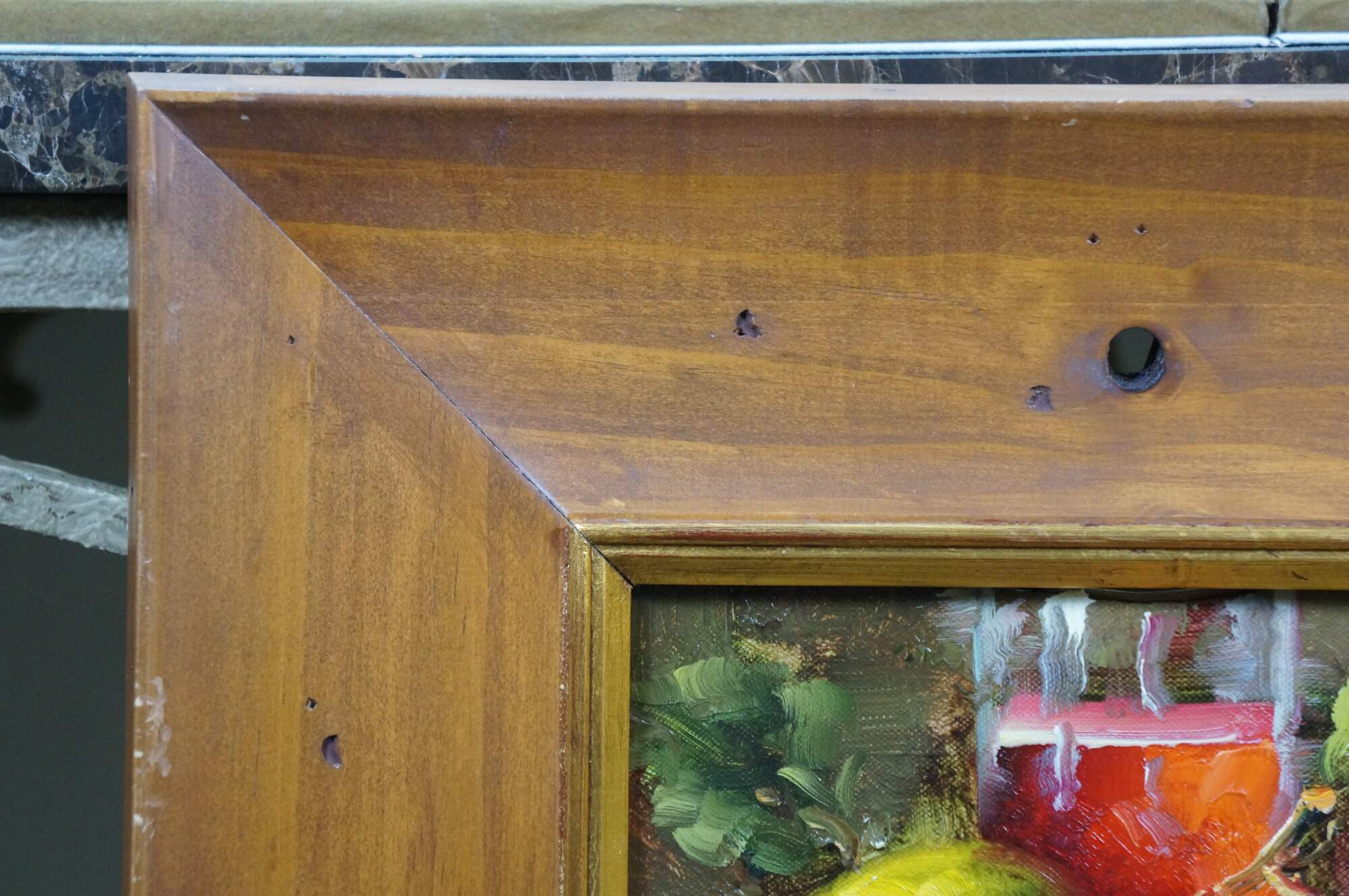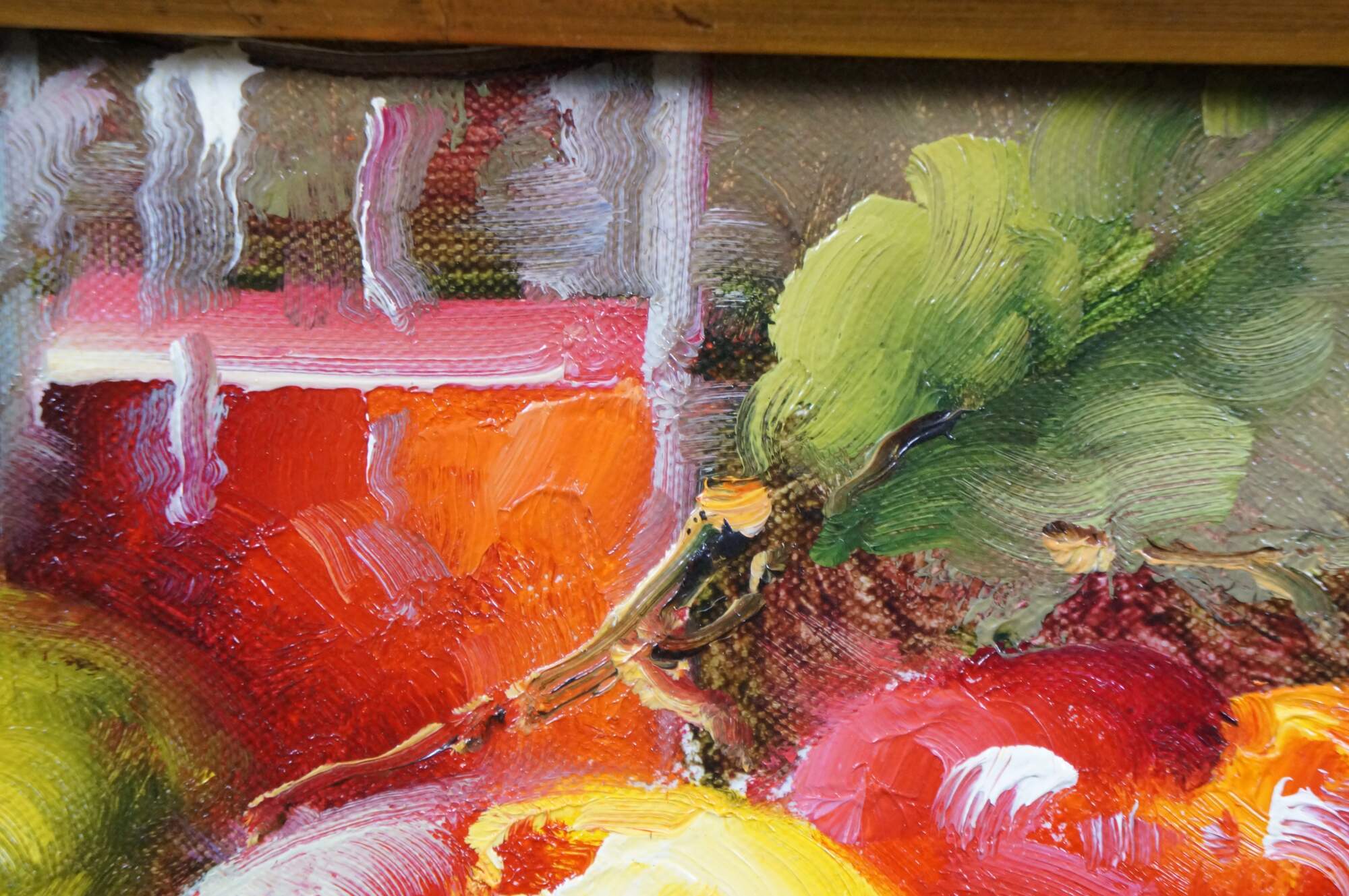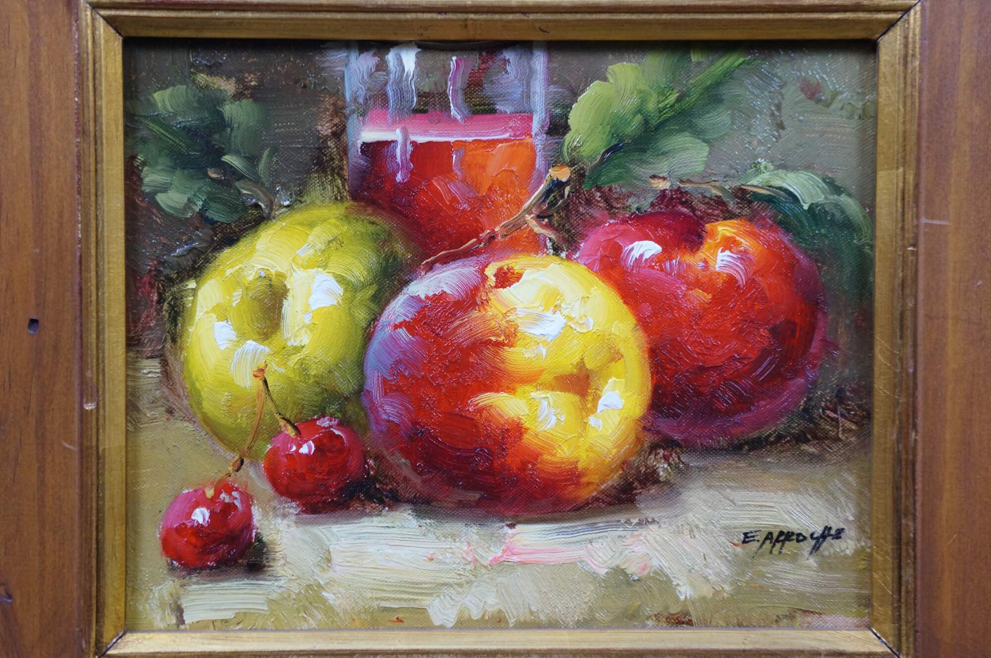 Late 20th century oil on board still life painting despicting a group of red and yellow apples and cherries. Signed lower right. Pine wood frame.