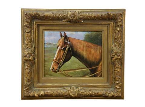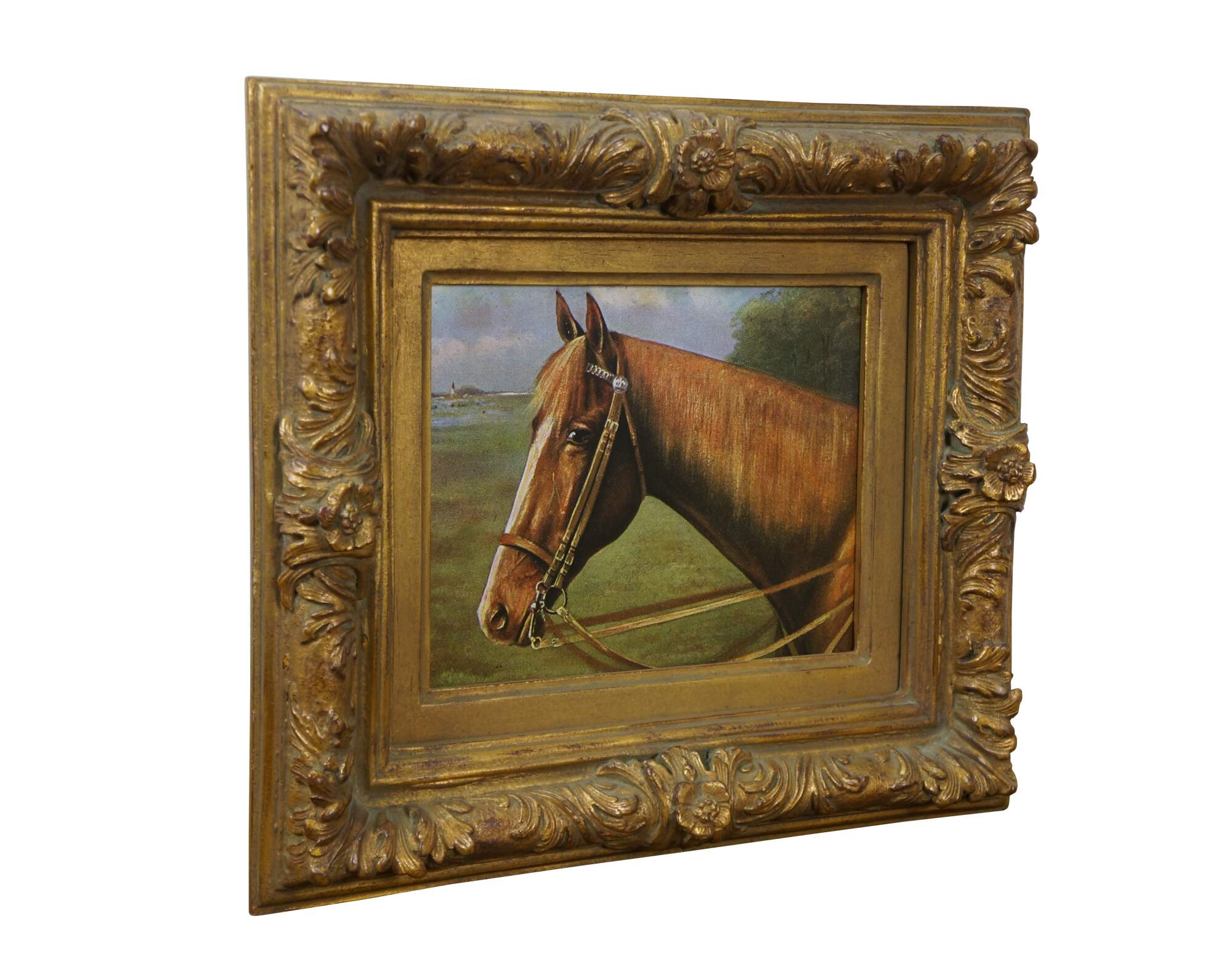 Late 20th century print on board of a brown horse in a landscape with a distant light house. Gilt composite frame with floral and acanthus leaf details.