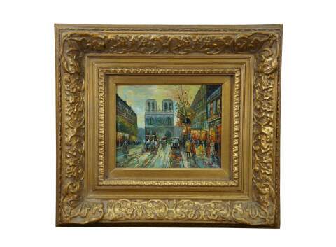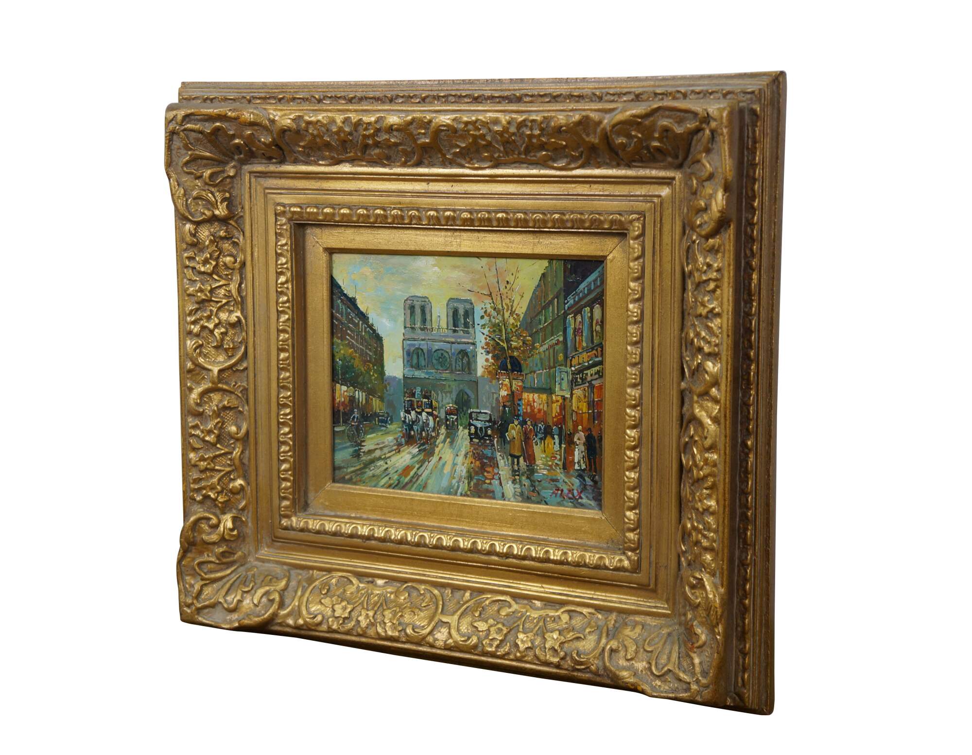 Late 20th century oil on board Parisan impressionist cityscape painting. Show a stree view of Notre Dame, with a horse and carriage, vehicles and walking figures in the rainy looking foreground. Signed Alex in lower right. Wood and gilt composite frame with a foliate and floral design.