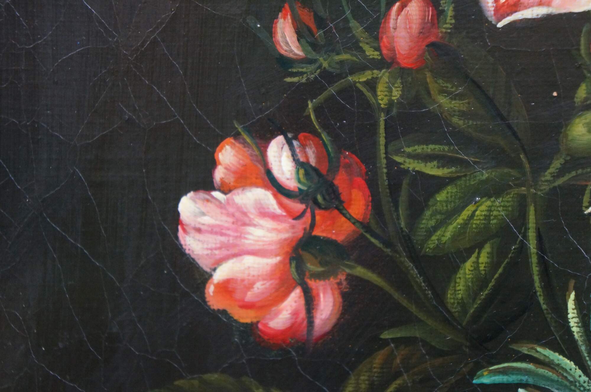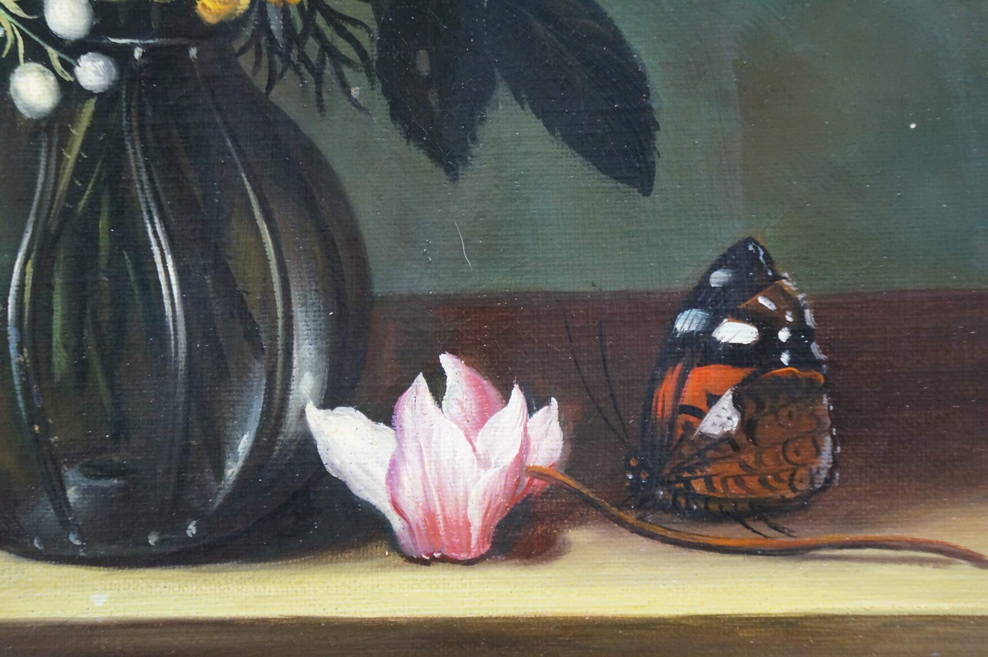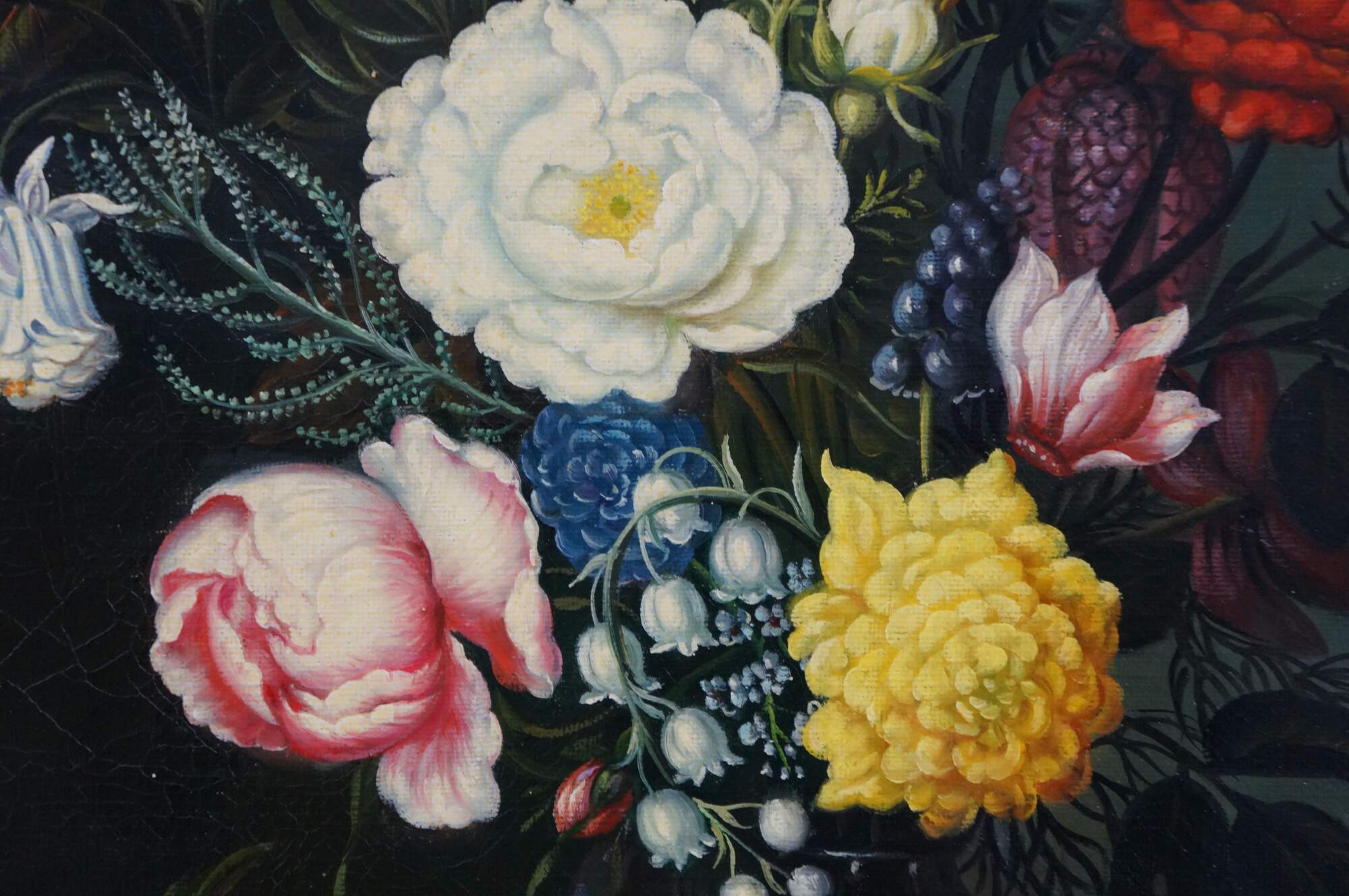 Late 20th Century oil on canvas painting after "Bouquet of Flowers in a Glass Vase" by Ambrosius Bosschaert, originally painted in 1621. "Here, two spectacular blossoms, a yellow iris and a red-and-white striped tulip, surmount a bouquet composed of numerous species, among them roses, a blue-and-white columbine, fritillaria, grape hyacinth, lily of the valley, and a sprig of rosemary. A damselfly alighting on the iris and a butterfly on the cyclamen blossom that rests on the wooden tabletop further enliven the composition." (National Gallery of Art) Beveled gilt wood & gesso frame.