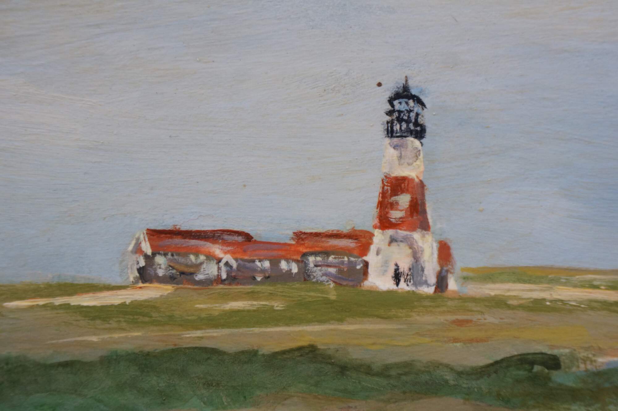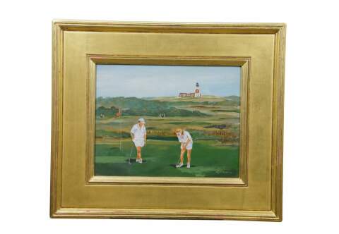 Late 20th century oil on board painting titled "Sankaty Golf Course Nantucket, MA" by Bettie J. Sarantos. Landscape from a putting green with two figures in white, with a view of a distant lighthouse. Signed, lower right. Beveled giltwood frame.